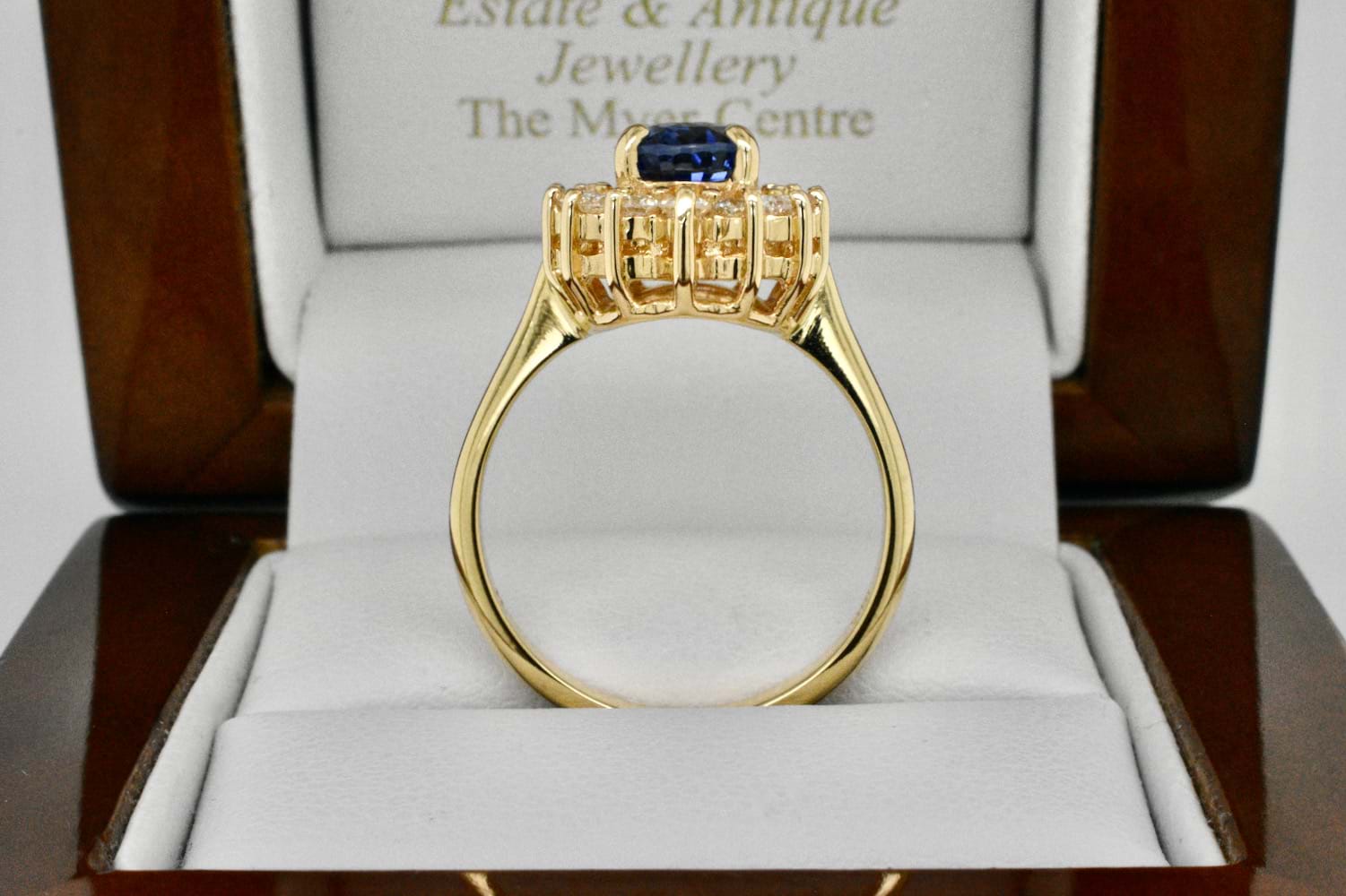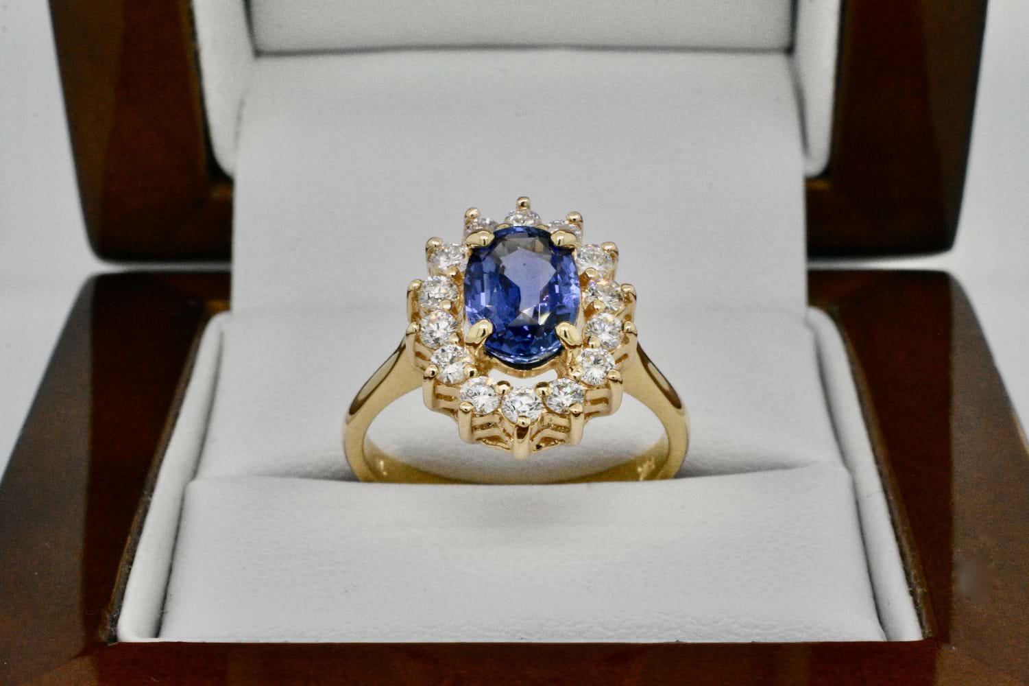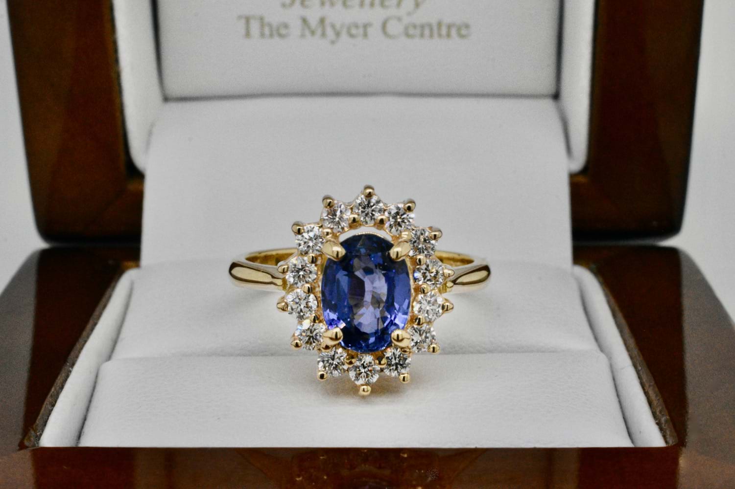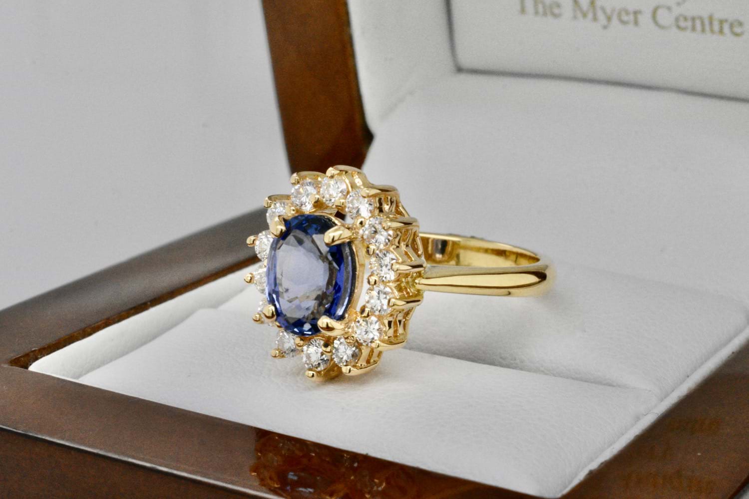 Classic and timeless design crafted in 18ct yellow gold featuring an oval 2.06ct Ceylon sapphire four claw set and surrounded by petals of 14 round brilliant cut diamonds totalling 0.56cts GVS. An elegant and striking ring that would make a stunning dress or anniversary ring. Finger size O+ Independent Valuation Supplied