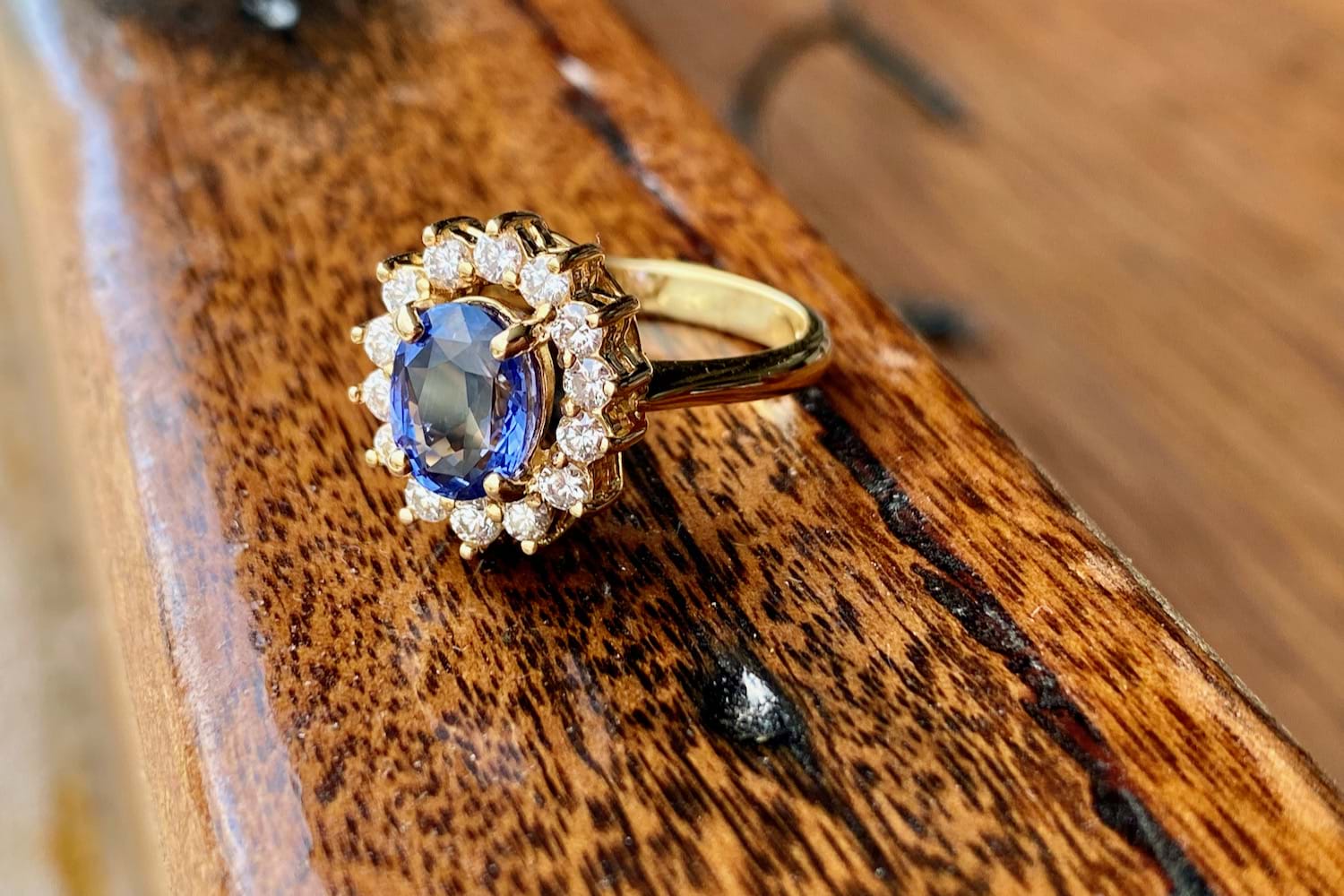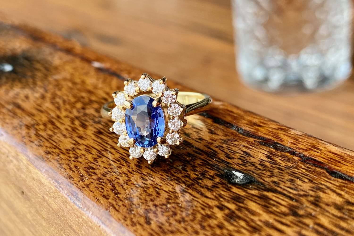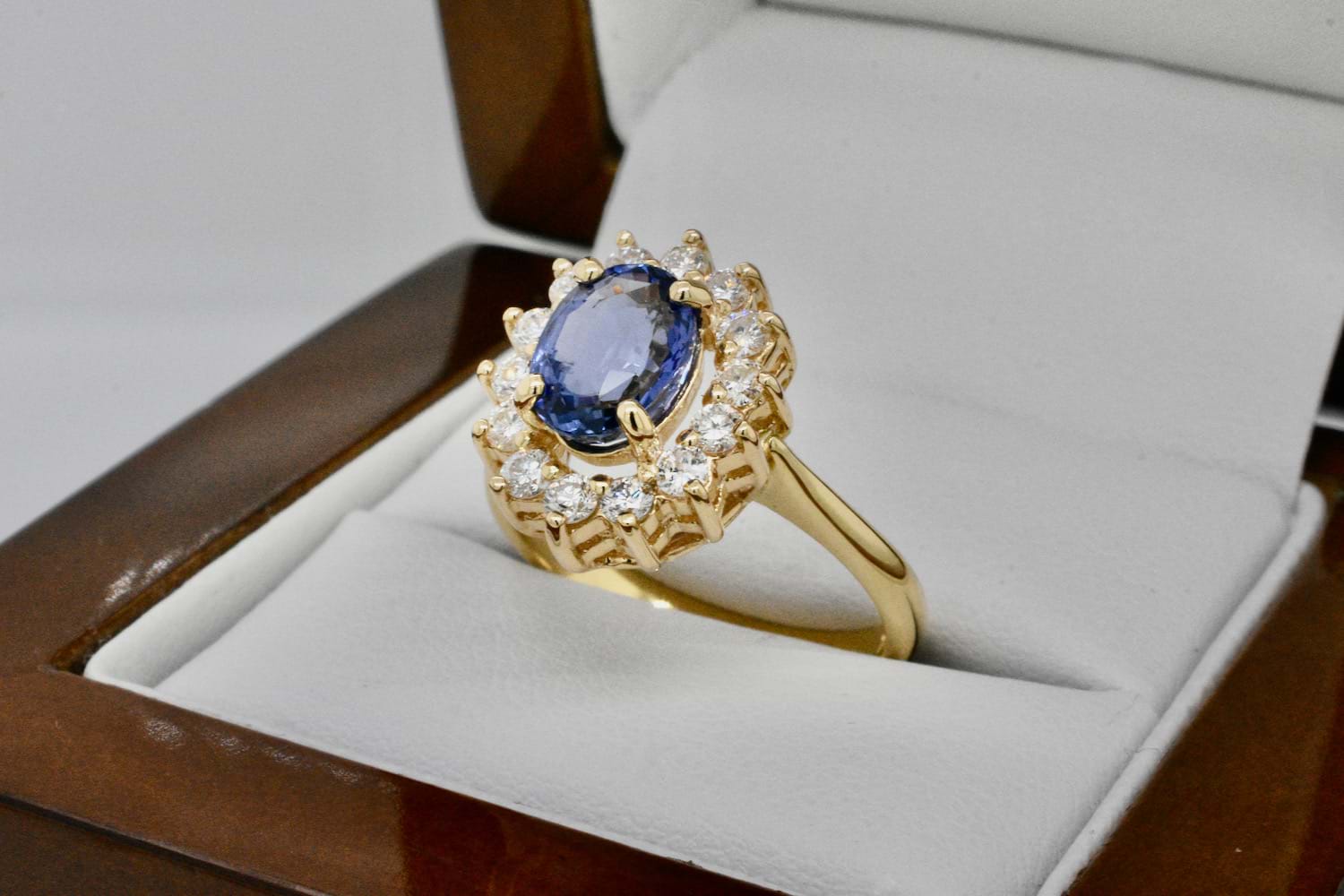 Classic and timeless design crafted in 18ct yellow gold featuring an oval 2.06ct Ceylon sapphire four claw set and surrounded by petals of 14 round brilliant cut diamonds totalling 0.56cts GVS. An elegant and striking ring that would make a stunning dress or anniversary ring. Finger size O+ Independent Valuation Supplied