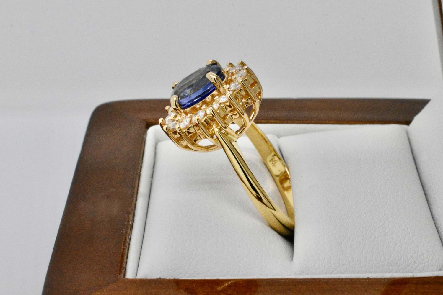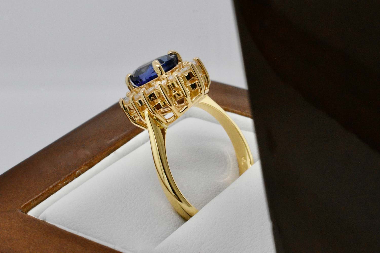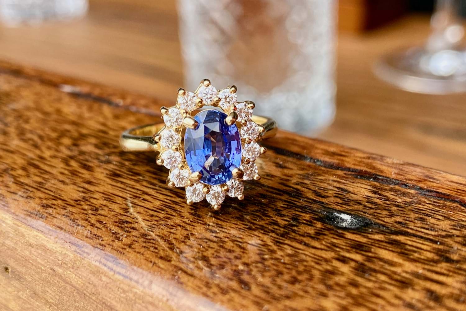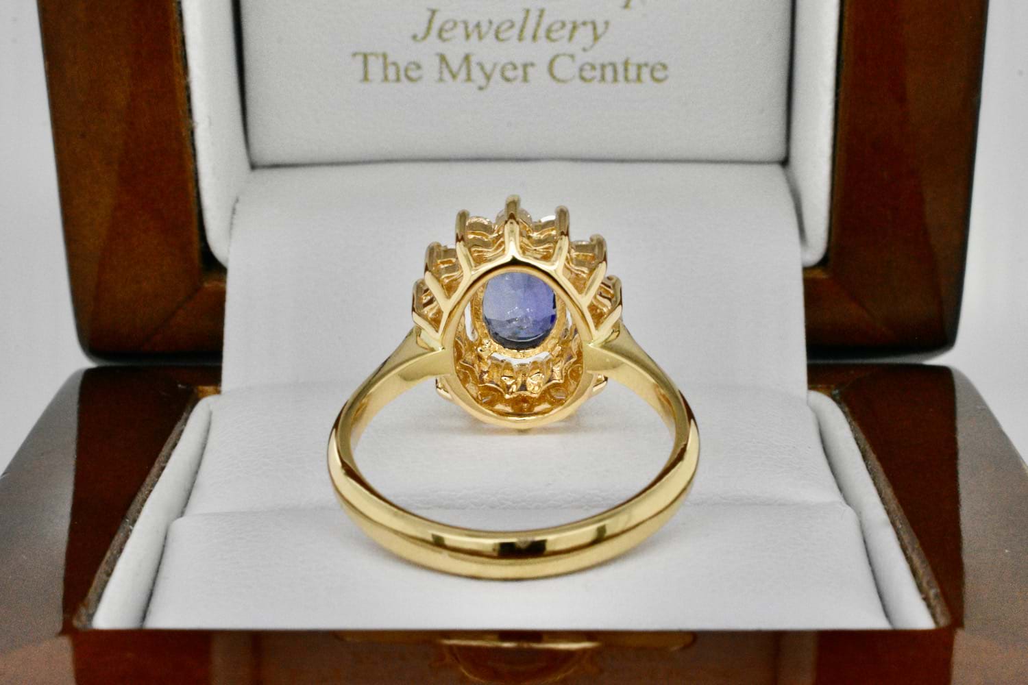 Classic and timeless design crafted in 18ct yellow gold featuring an oval 2.06ct Ceylon sapphire four claw set and surrounded by petals of 14 round brilliant cut diamonds totalling 0.56cts GVS. An elegant and striking ring that would make a stunning dress or anniversary ring. Finger size O+ Independent Valuation Supplied