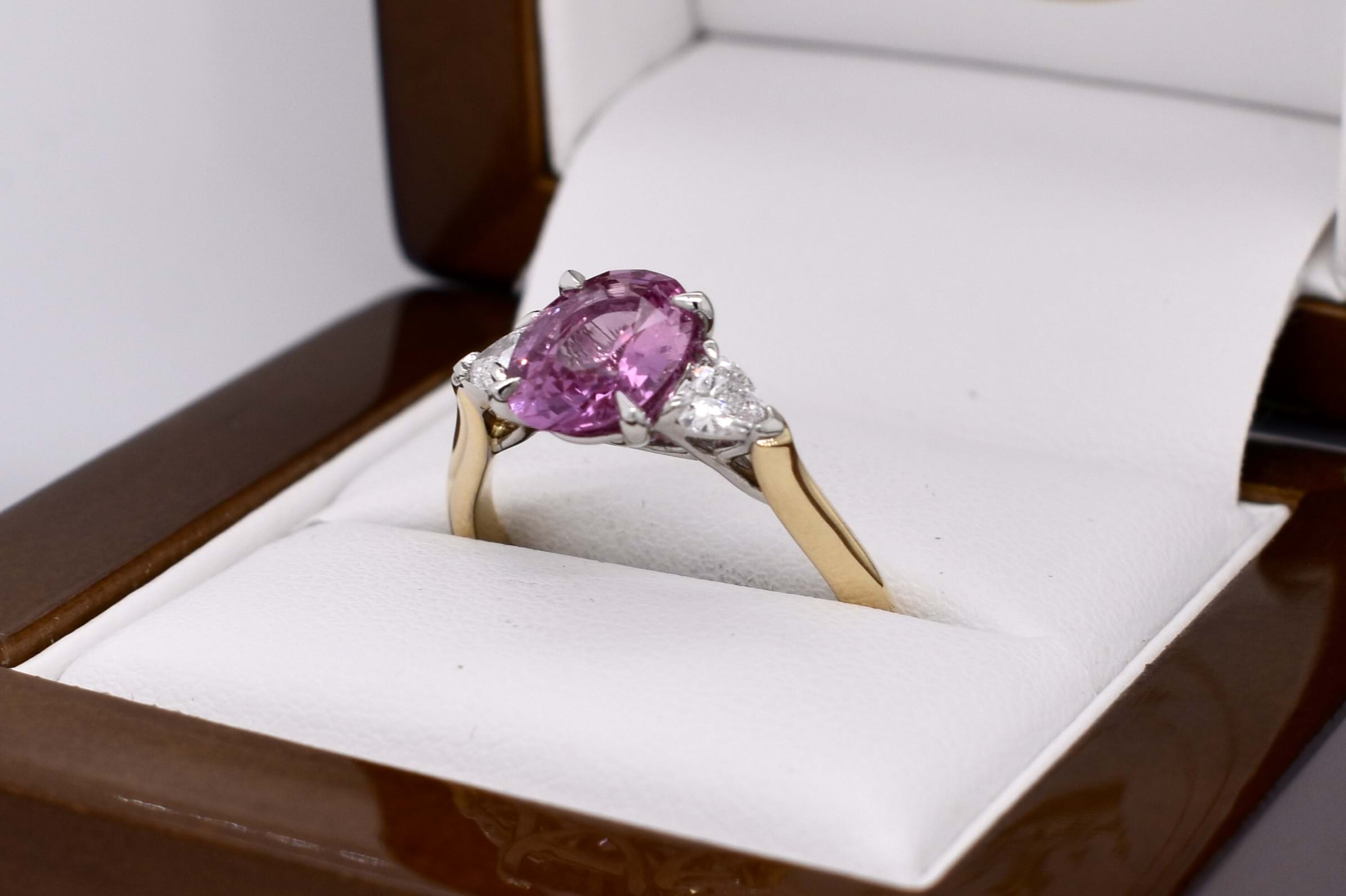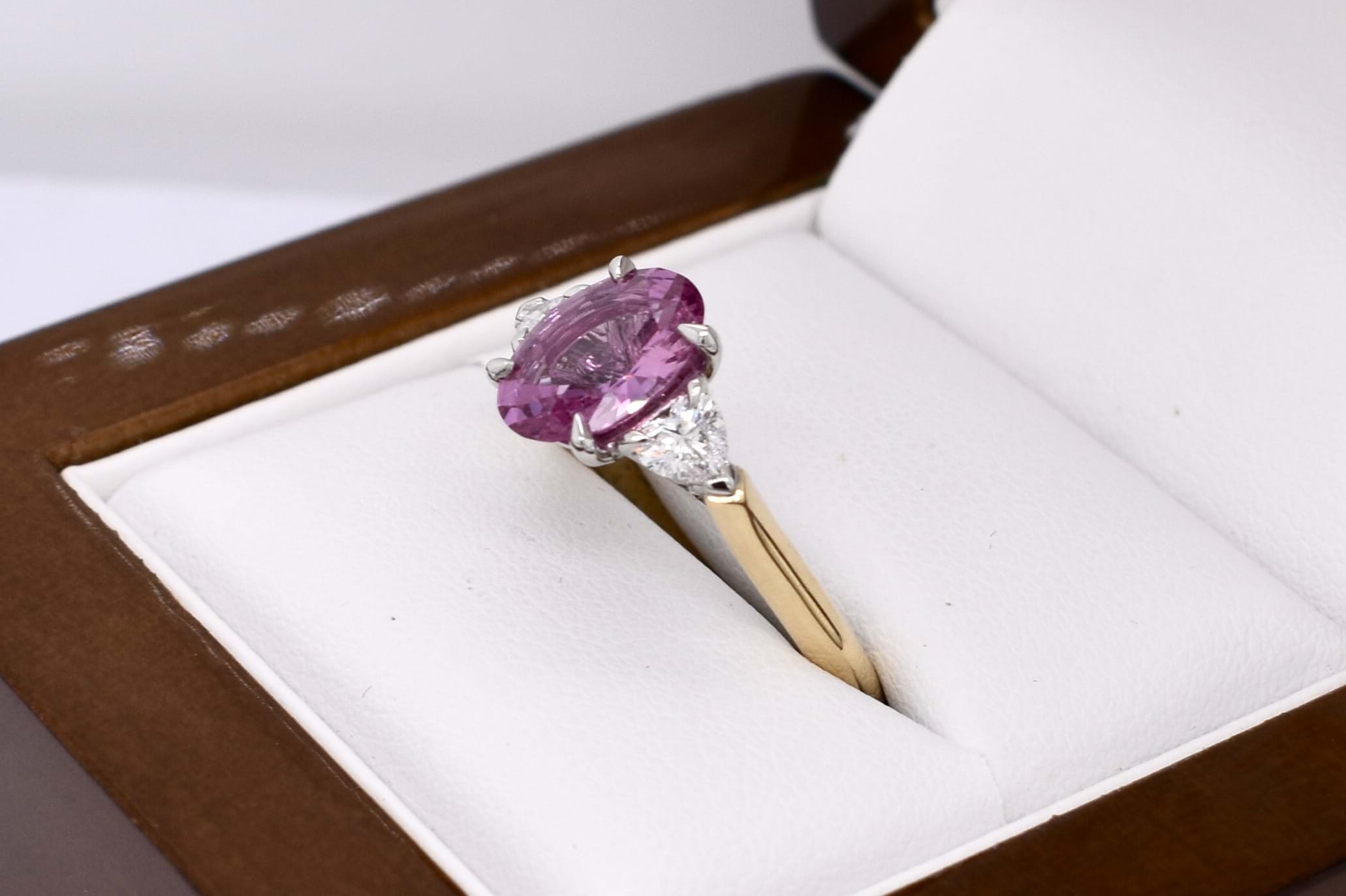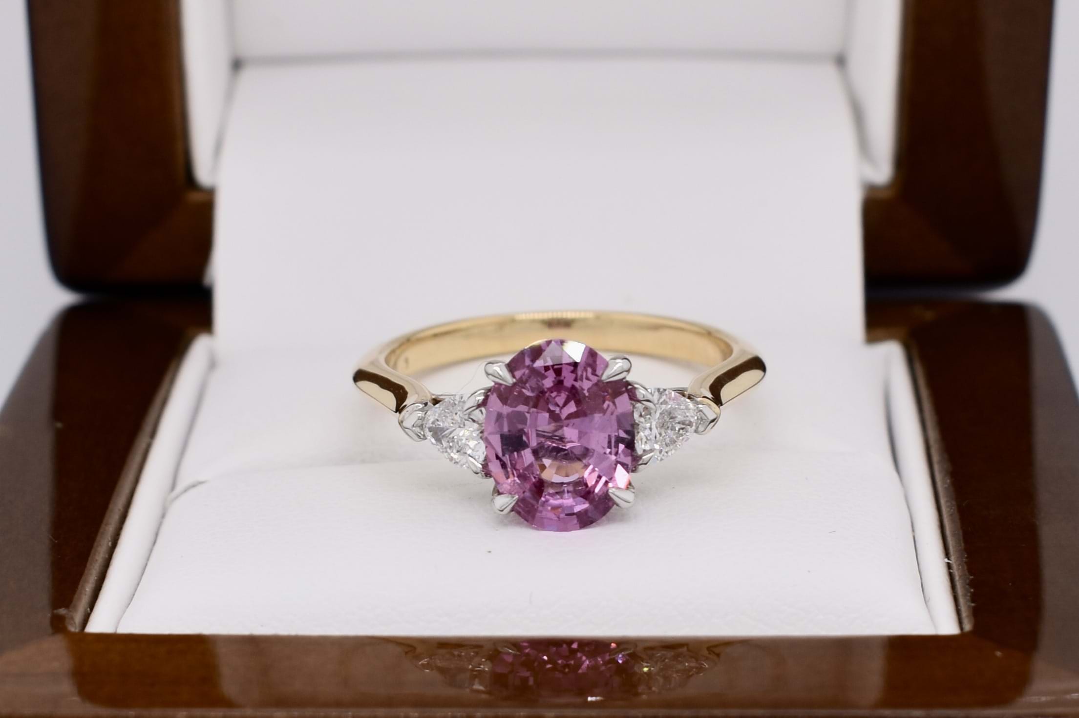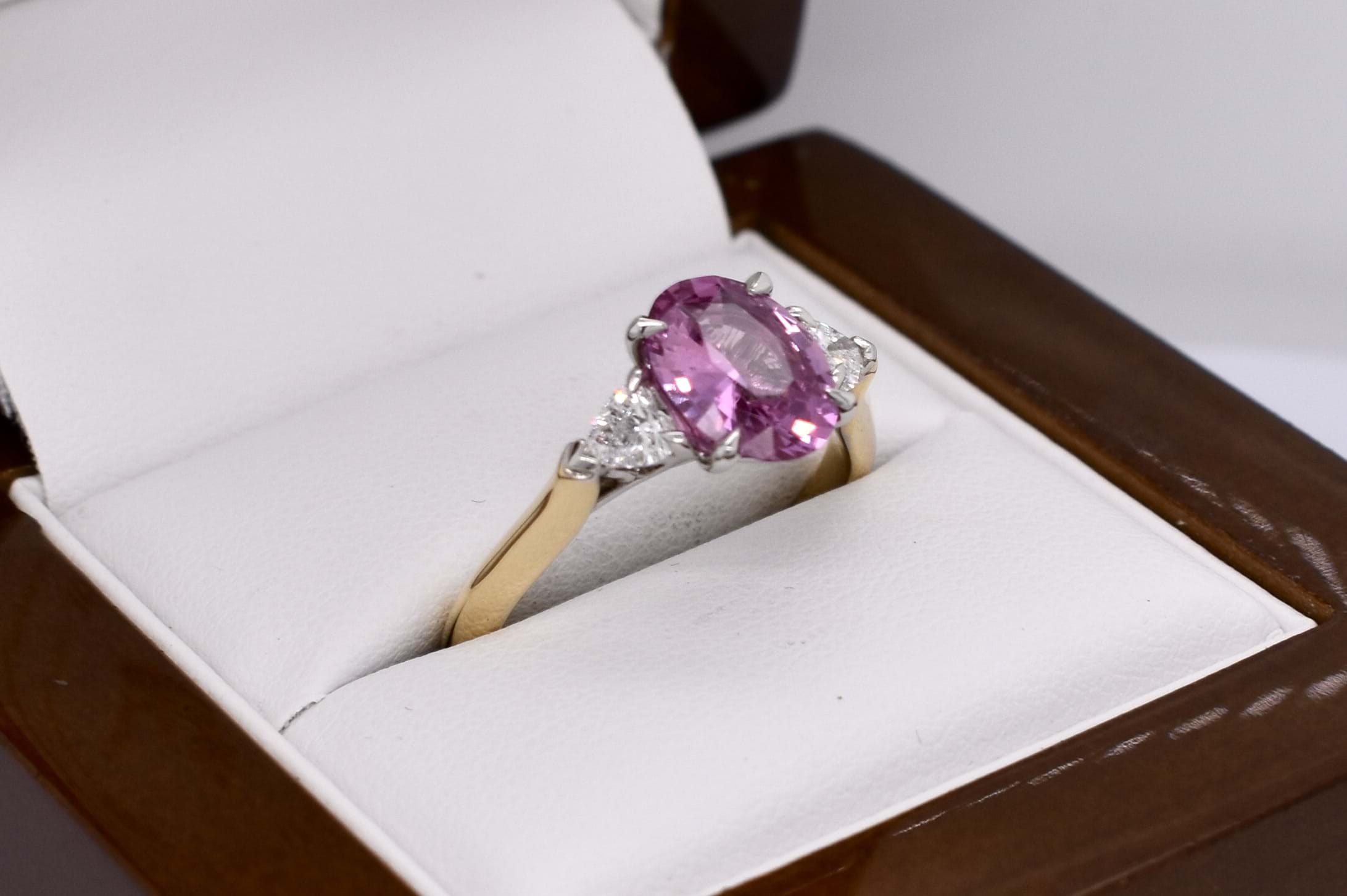 The most stunning 18ct yellow gold ring, featuring a four claw set centre pretty pink oval Madagascan sapphire of 2.07ct, measuring 9.77x7.39x3.79mm. Complimented with a beautiful 3.80-3.70mm heart shaped diamond either side, totalling 0.38ct F VS1, two claw and cap set. Ring has white gold claws and gallery and is completed on a yellow gold band. Finger size P+. Independent Valuation Supplied.