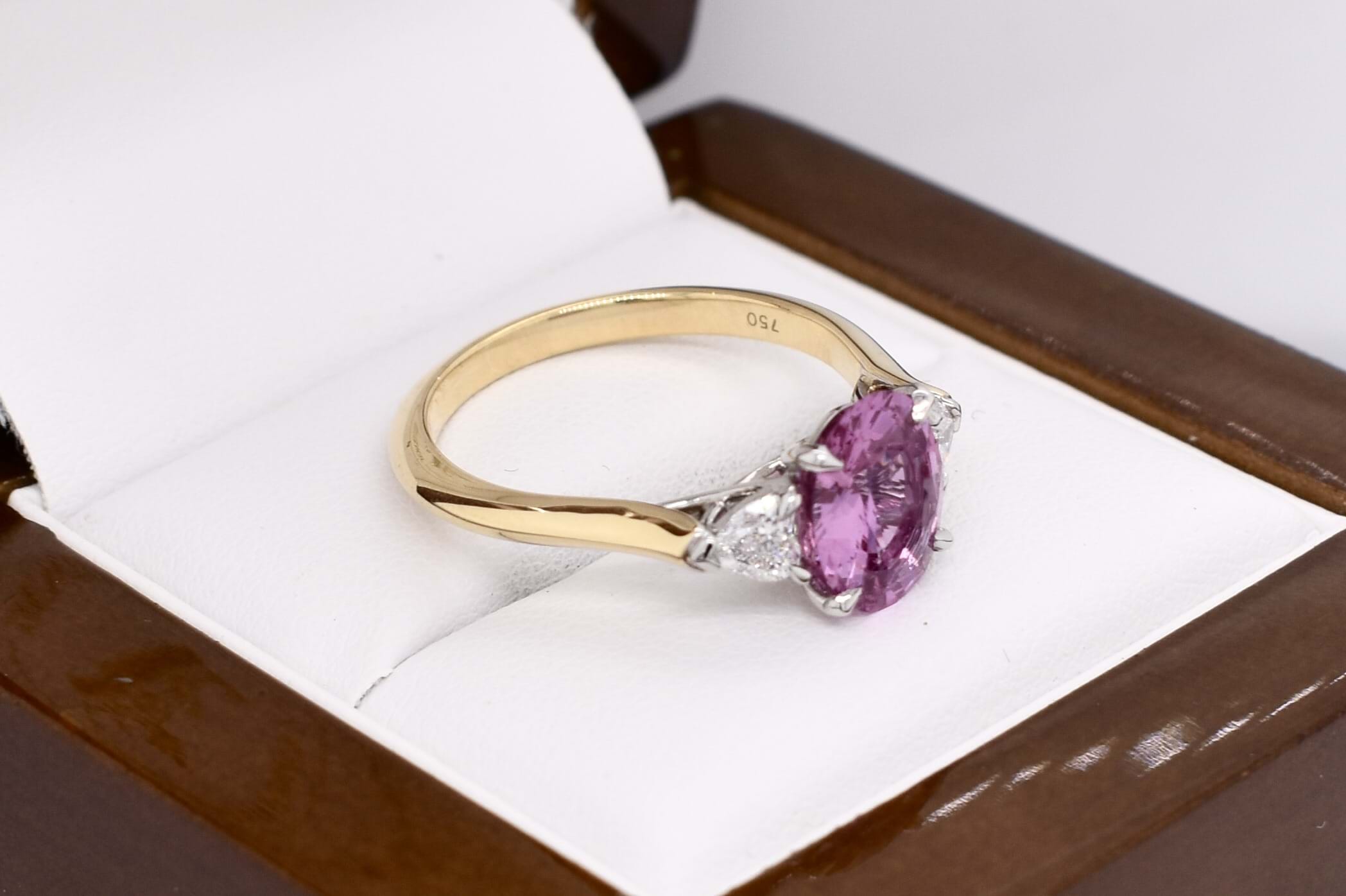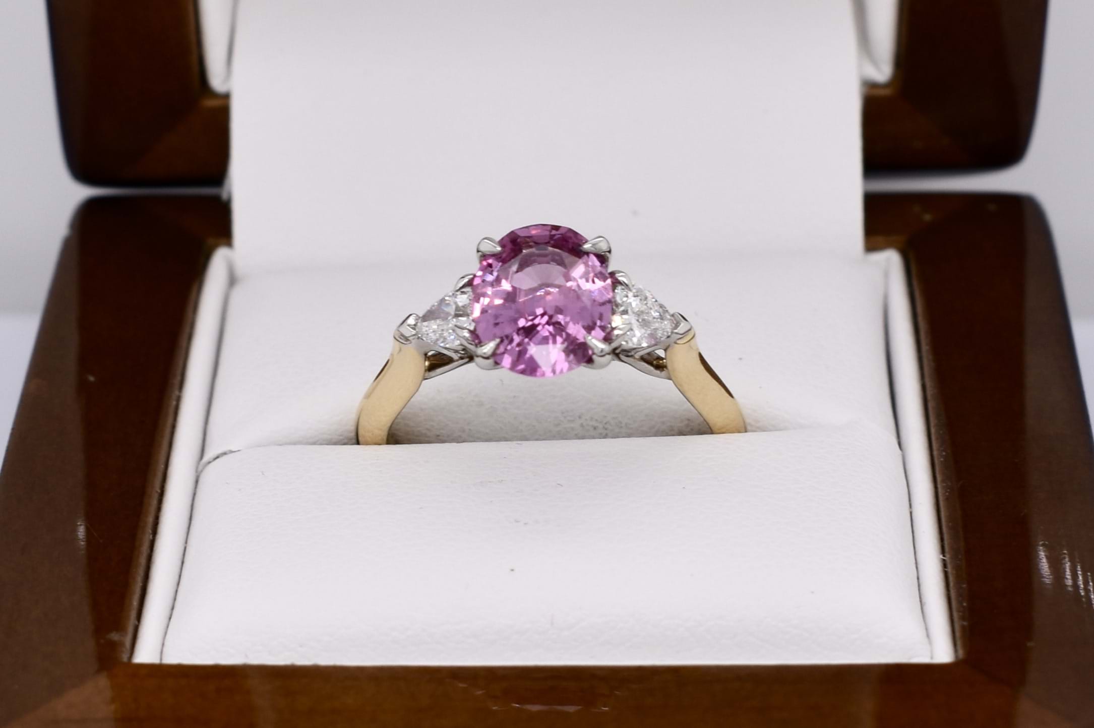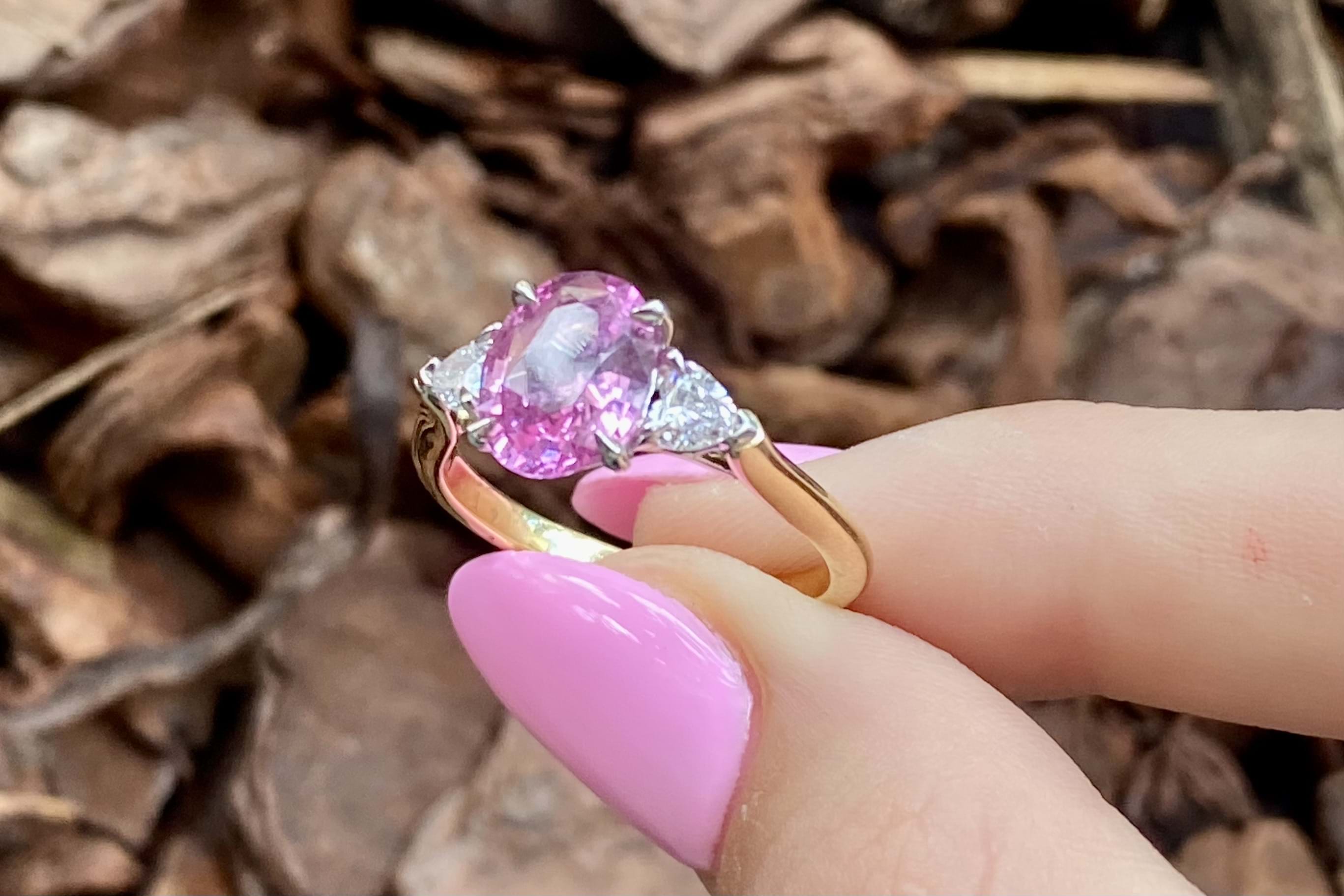 The most stunning 18ct yellow gold ring, featuring a four claw set centre pretty pink oval Madagascan sapphire of 2.07ct, measuring 9.77x7.39x3.79mm. Complimented with a beautiful 3.80-3.70mm heart shaped diamond either side, totalling 0.38ct F VS1, two claw and cap set. Ring has white gold claws and gallery and is completed on a yellow gold band. Finger size P+. Independent Valuation Supplied.