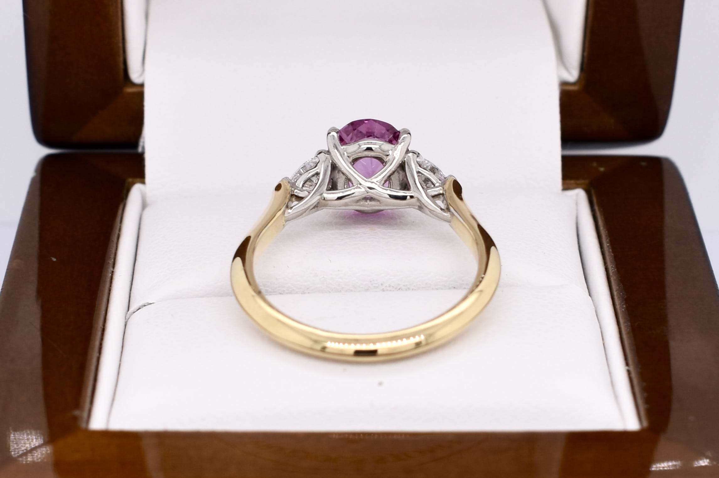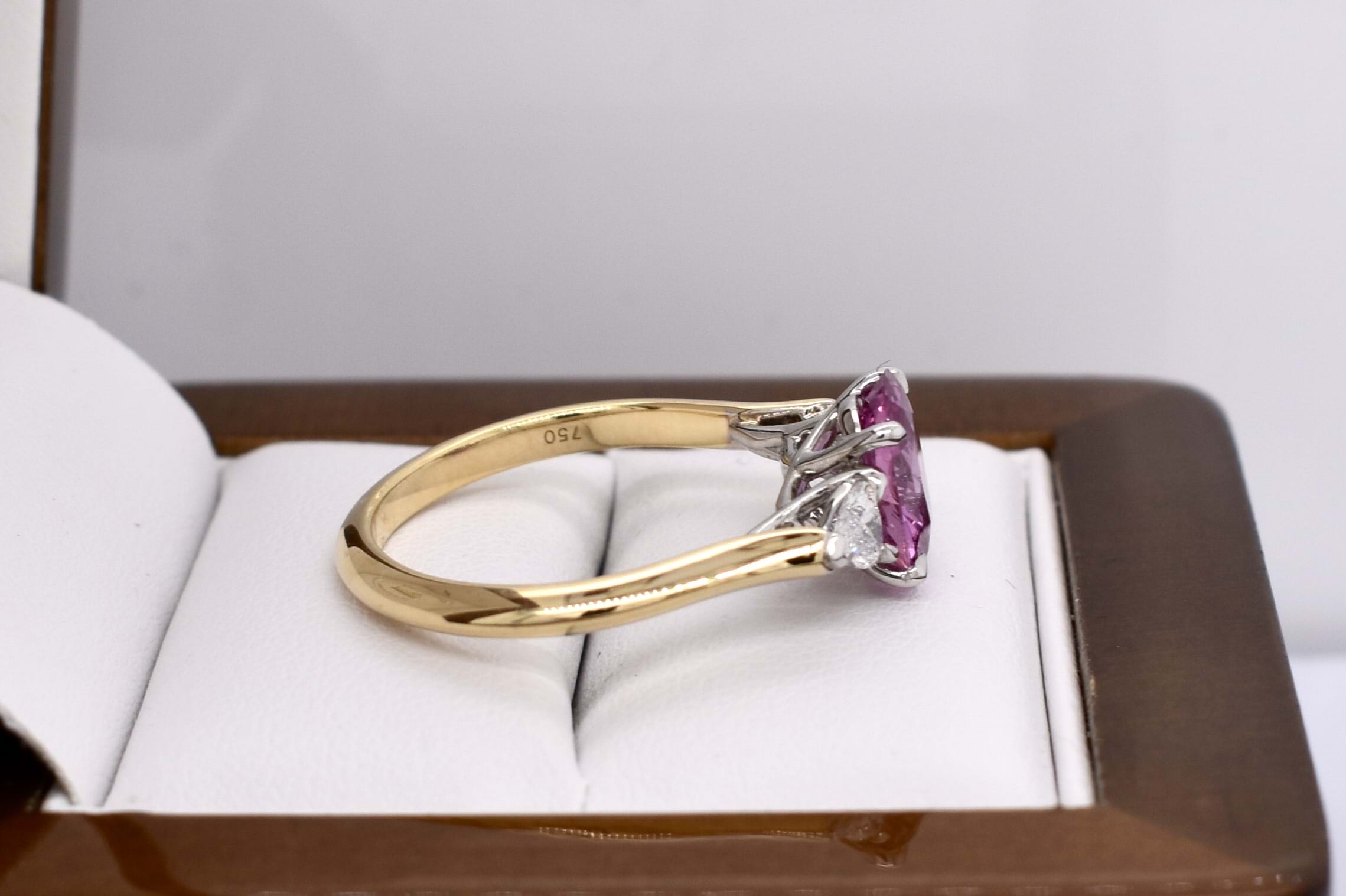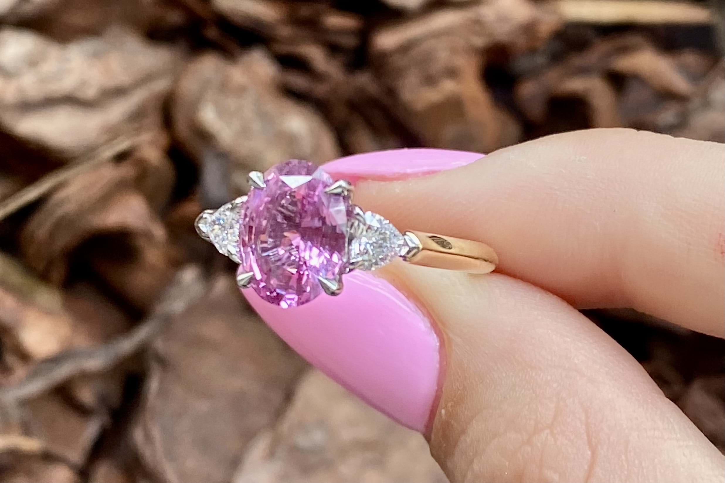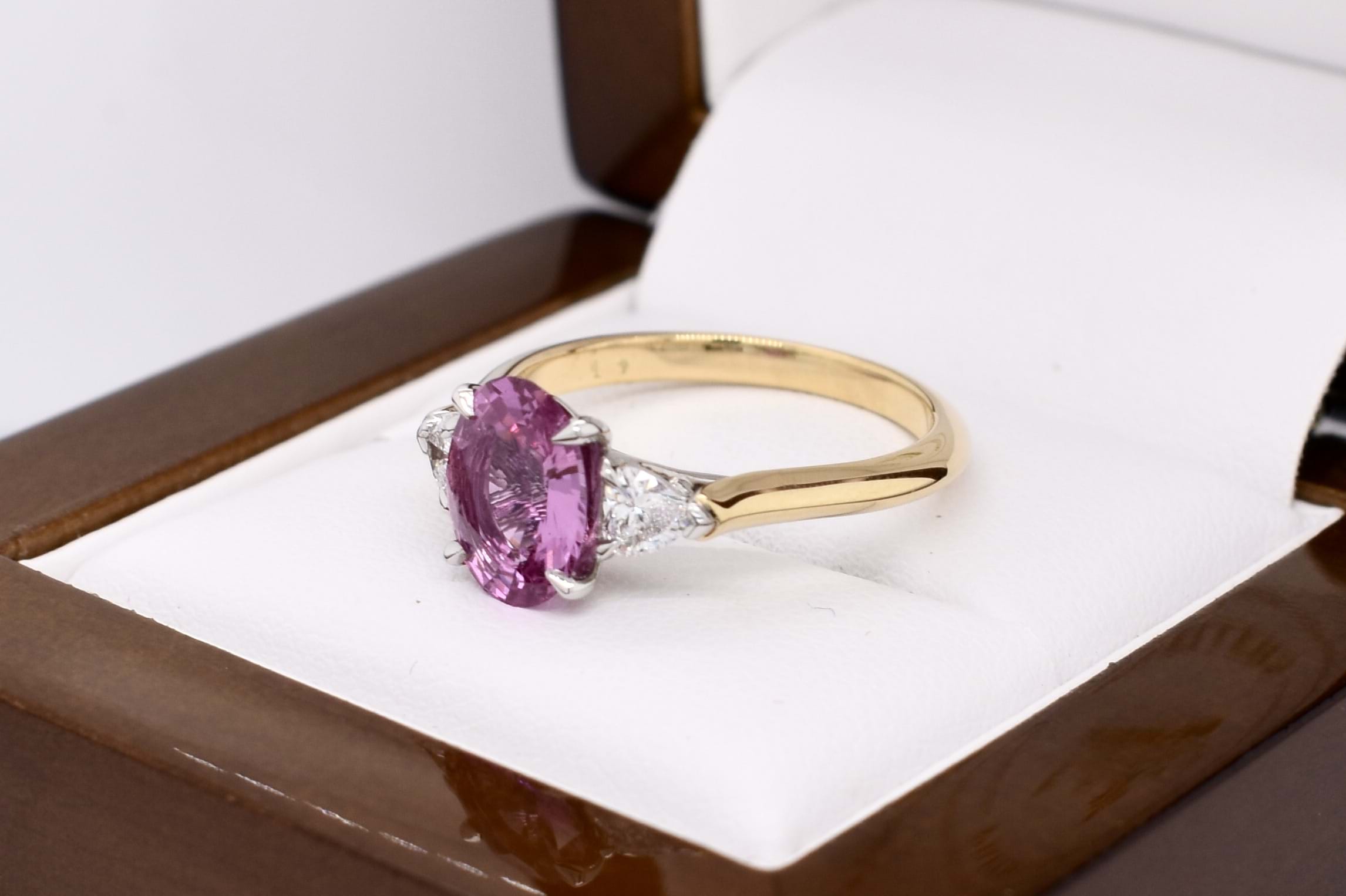 The most stunning 18ct yellow gold ring, featuring a four claw set centre pretty pink oval Madagascan sapphire of 2.07ct, measuring 9.77x7.39x3.79mm. Complimented with a beautiful 3.80-3.70mm heart shaped diamond either side, totalling 0.38ct F VS1, two claw and cap set. Ring has white gold claws and gallery and is completed on a yellow gold band. Finger size P+. Independent Valuation Supplied.