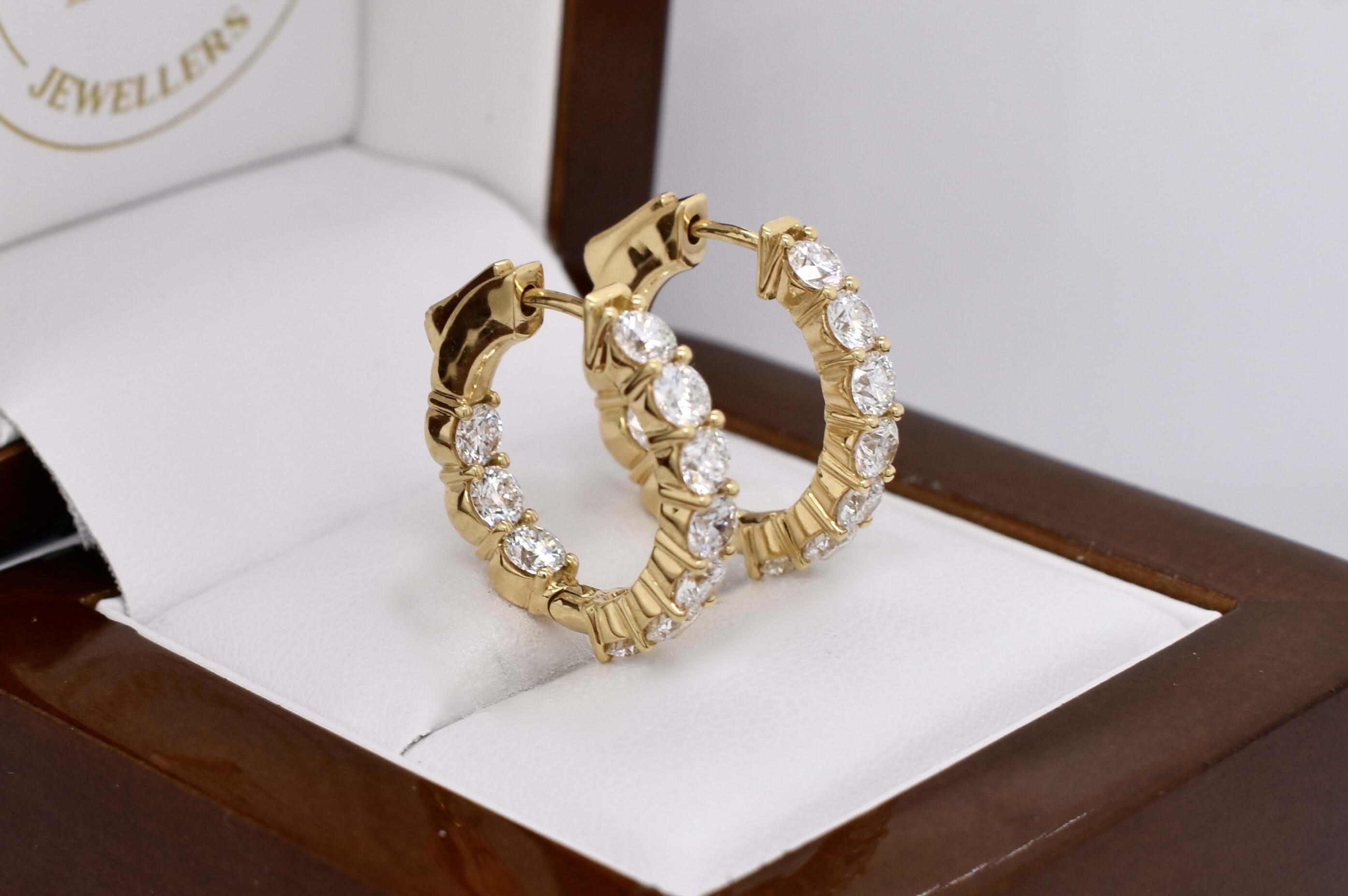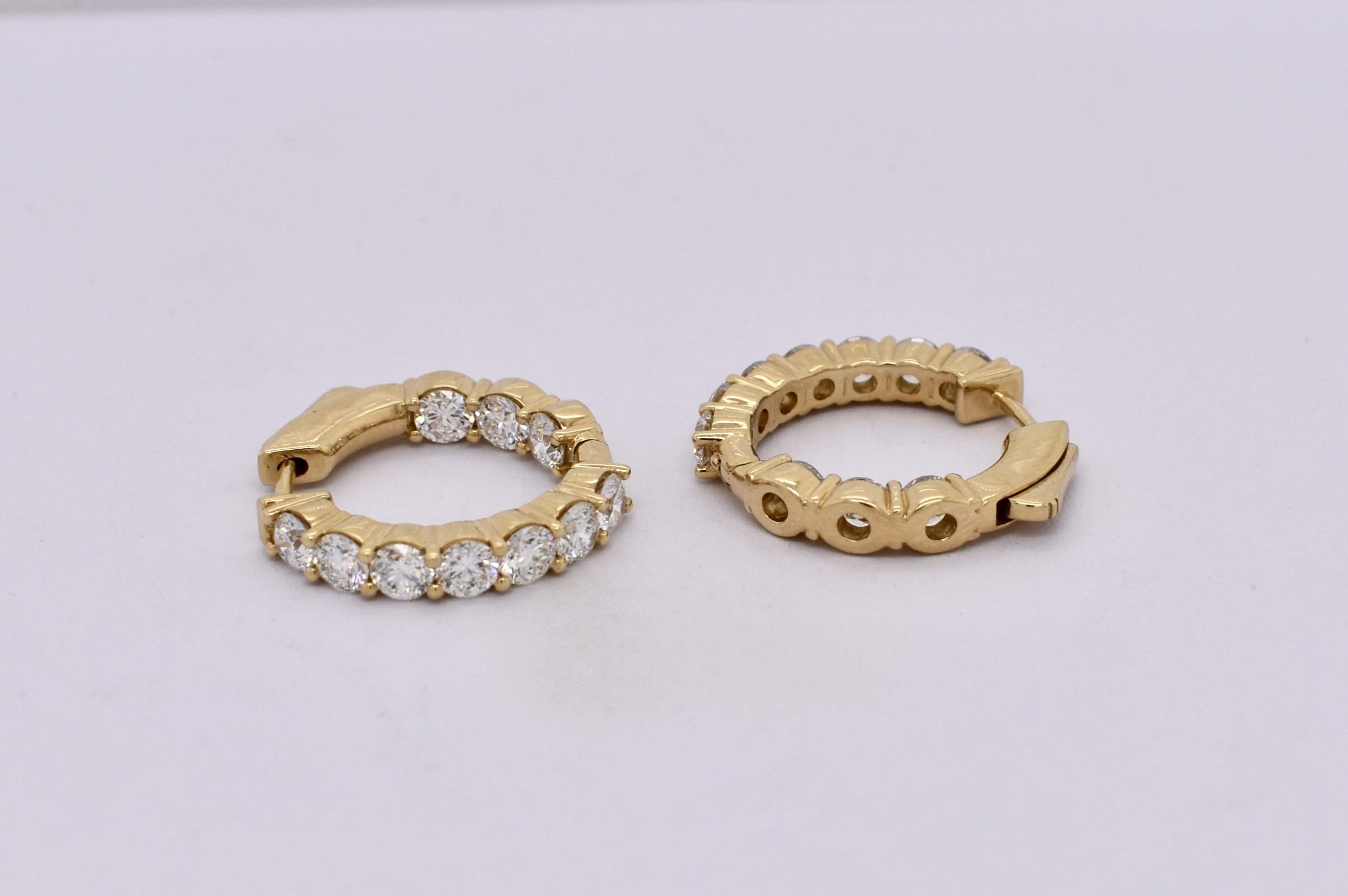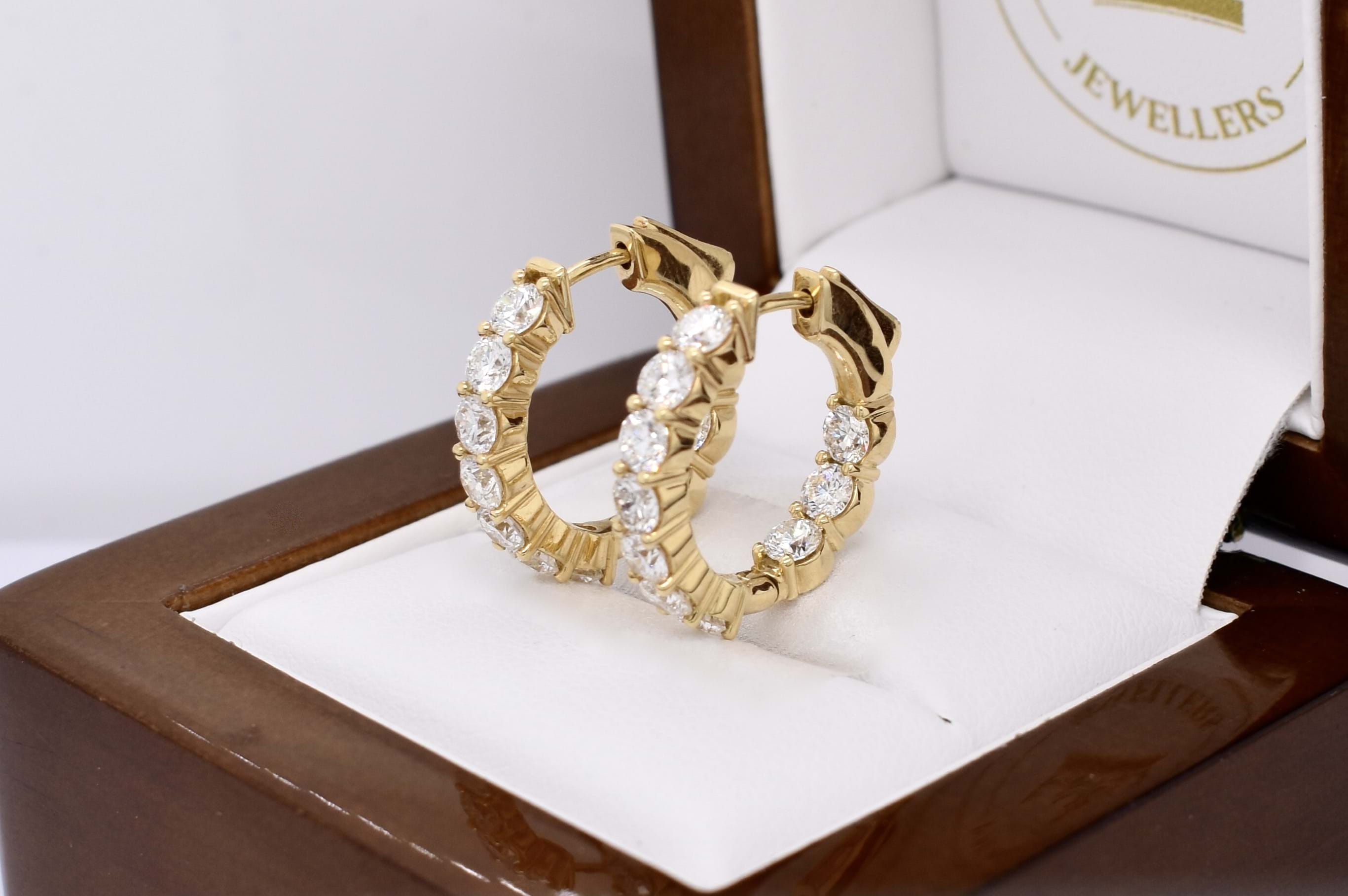 The perfect everyday pair of huggies, consisting of 20 white round brilliant cut diamonds, totalling 2.84ct GH SI. Beautifully set in 18ct yellow gold, the diamonds are shared claw set with hinged push button fittings. Independent valuation available upon purchase.
