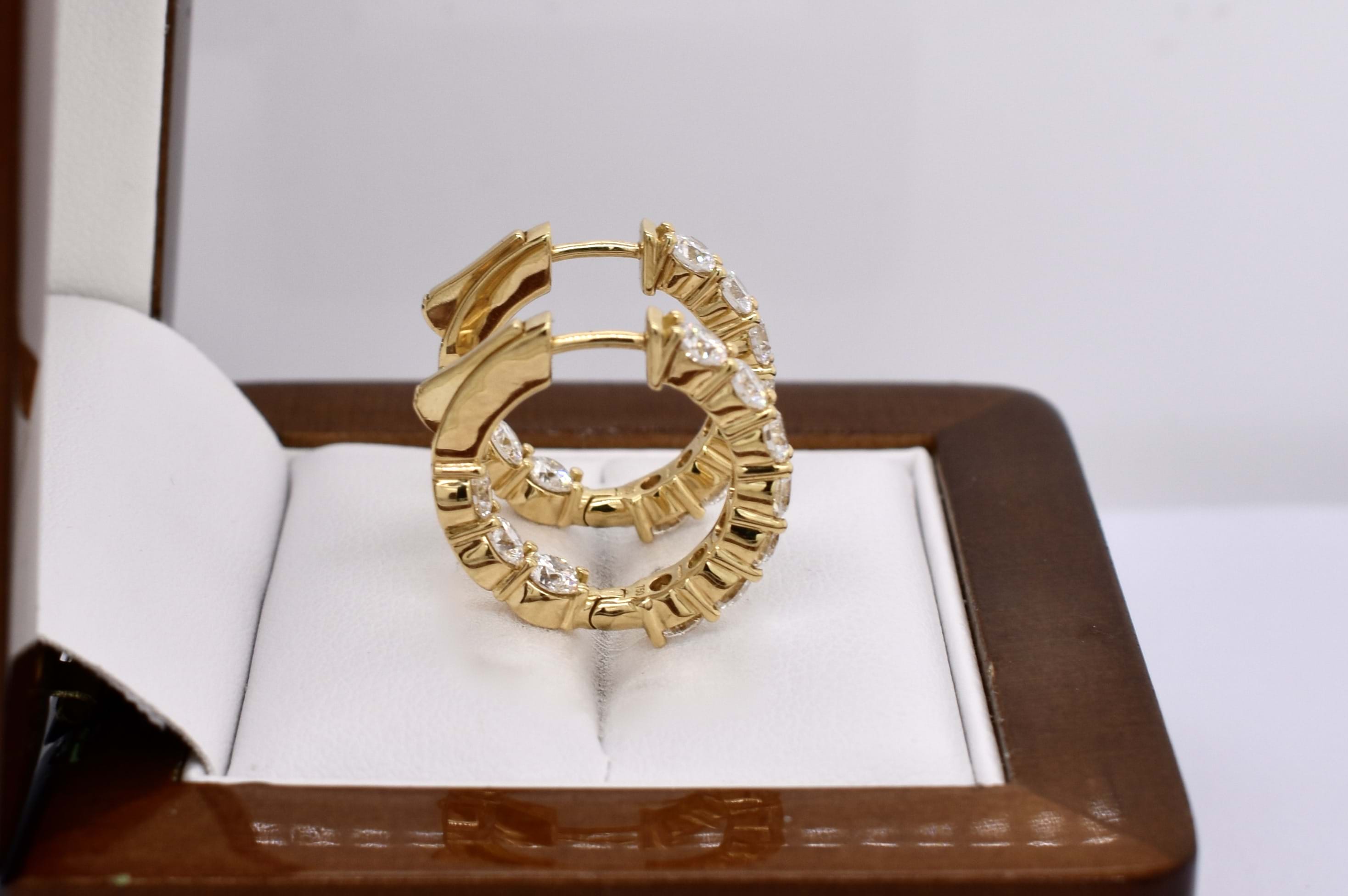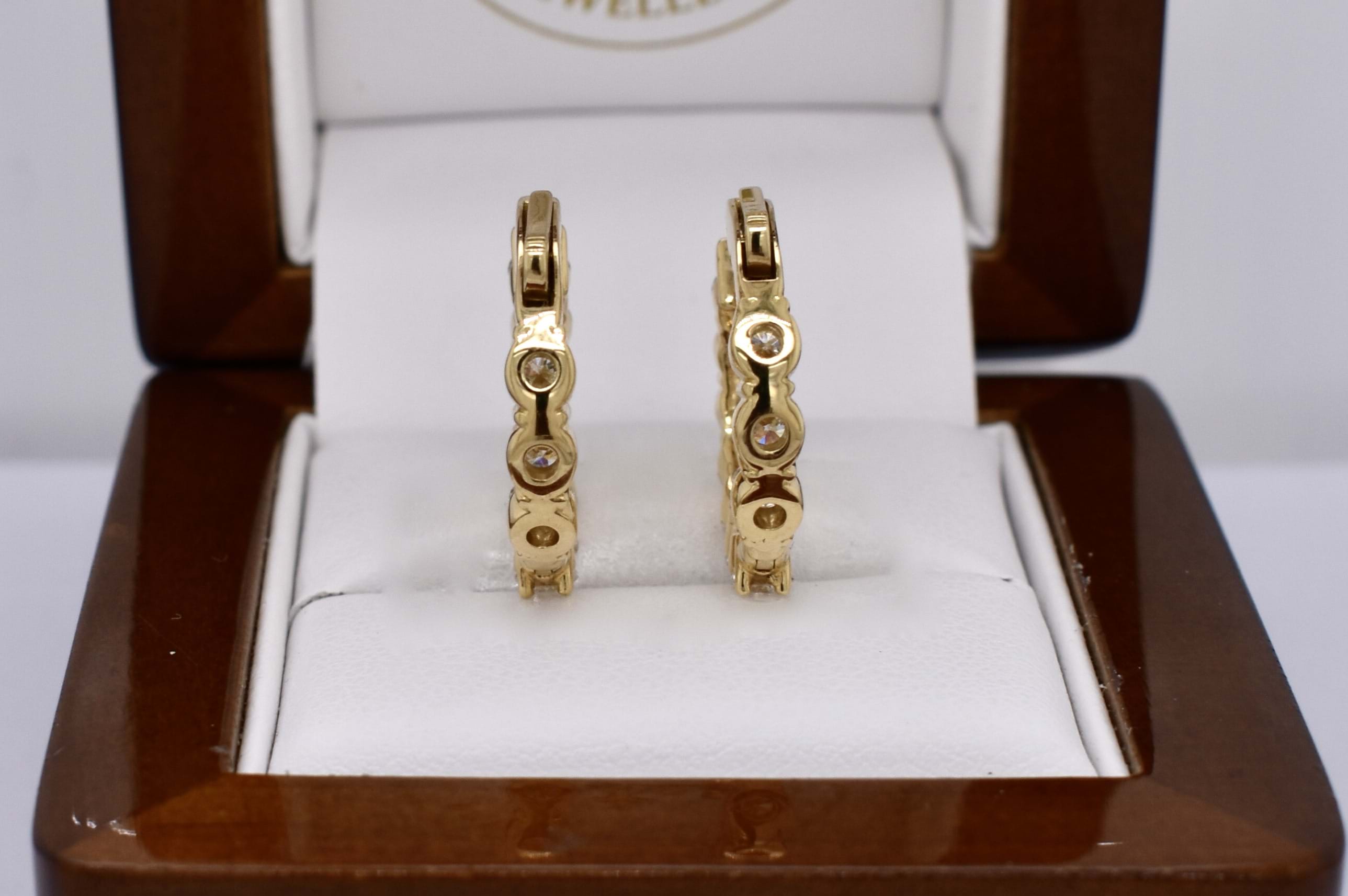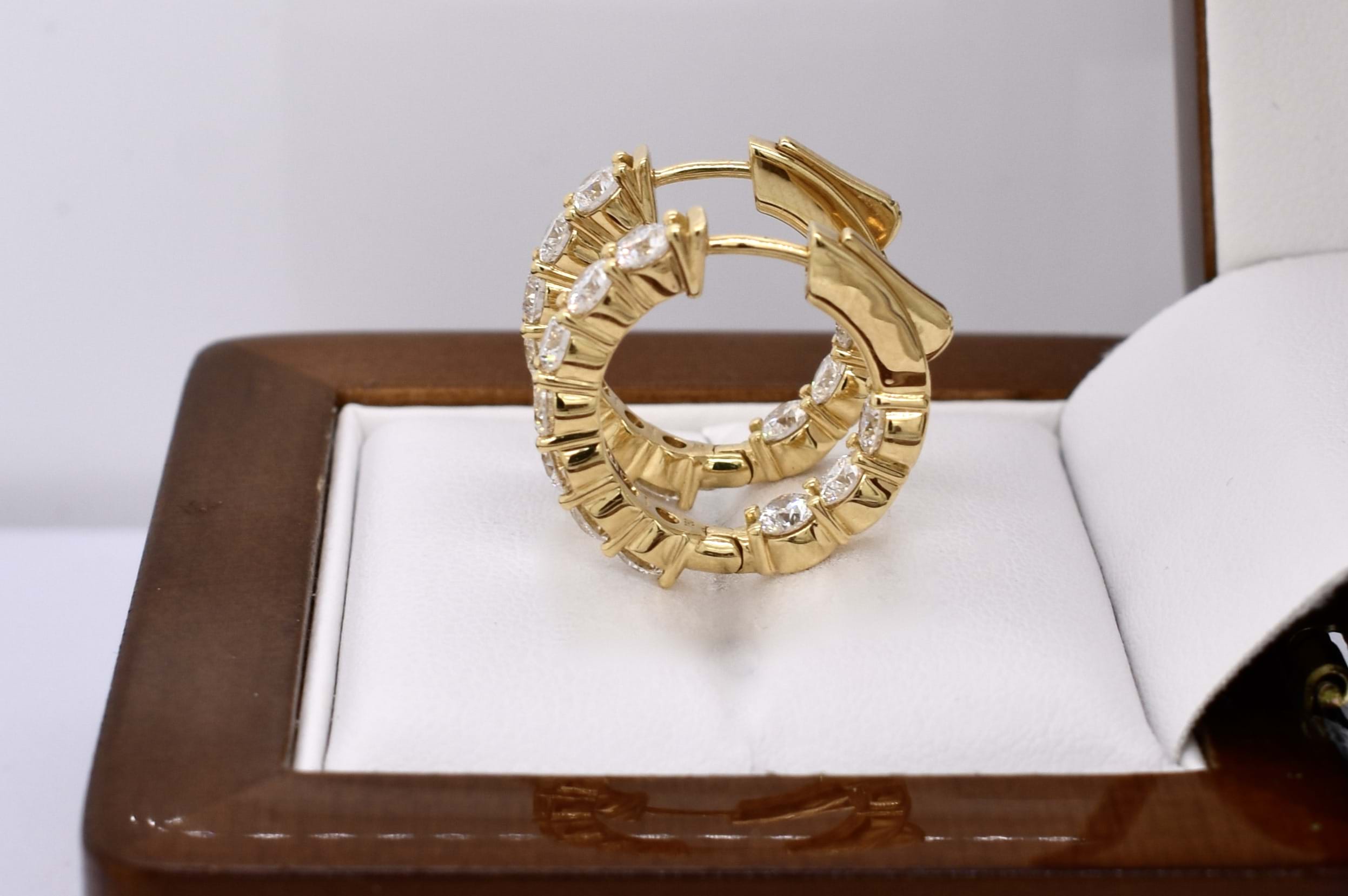 The perfect everyday pair of huggies, consisting of 20 white round brilliant cut diamonds, totalling 2.84ct GH SI. Beautifully set in 18ct yellow gold, the diamonds are shared claw set with hinged push button fittings. Independent valuation available upon purchase.