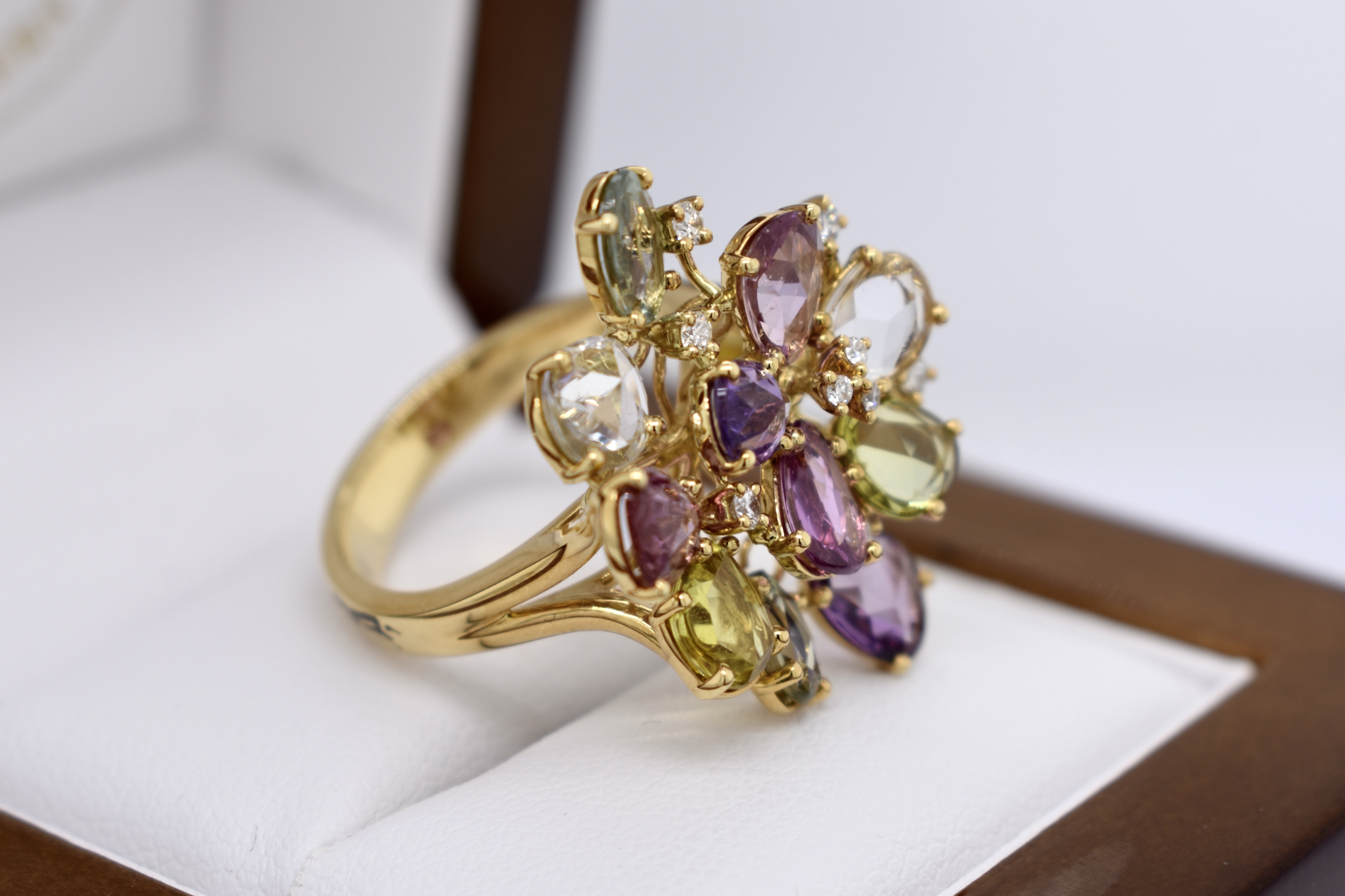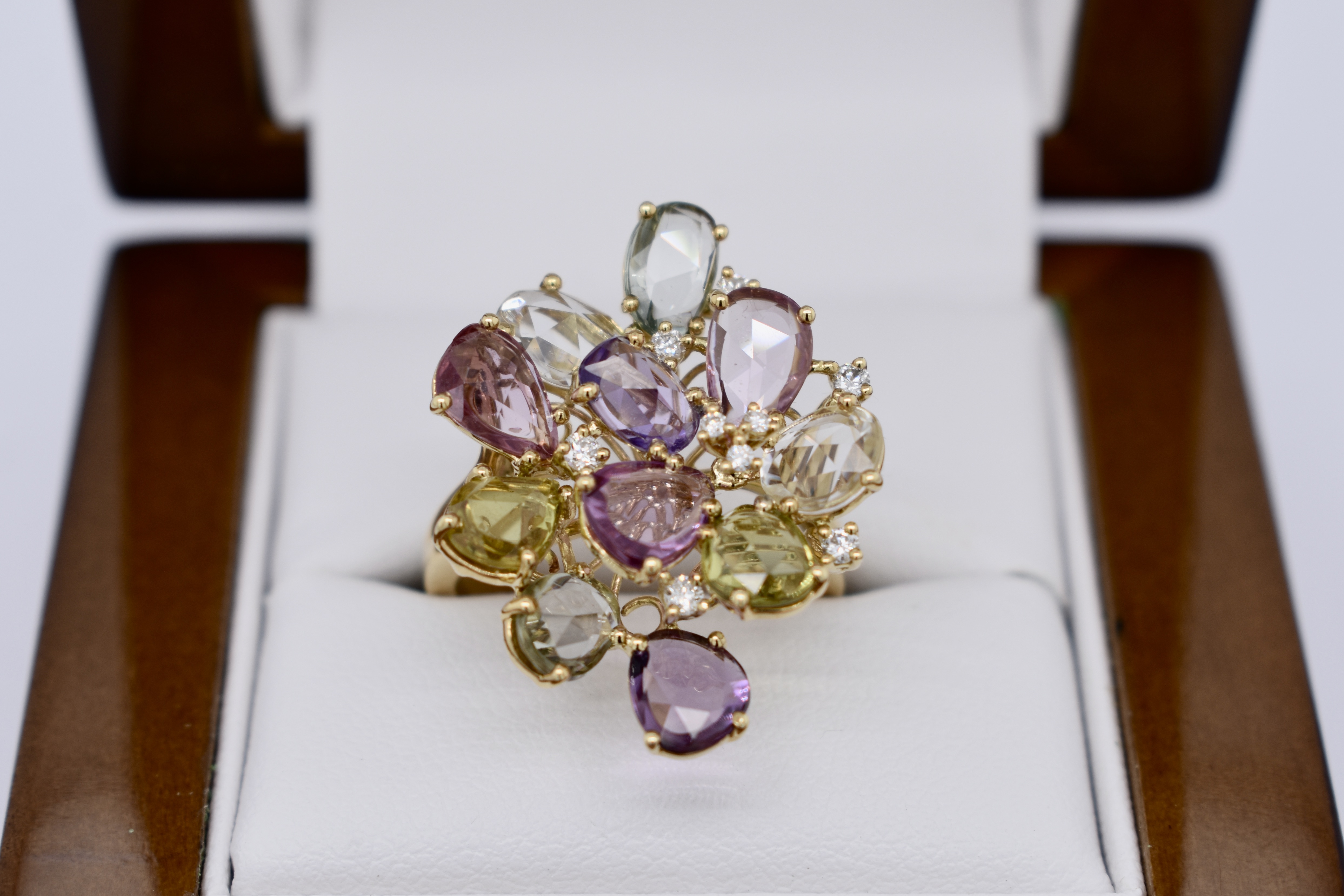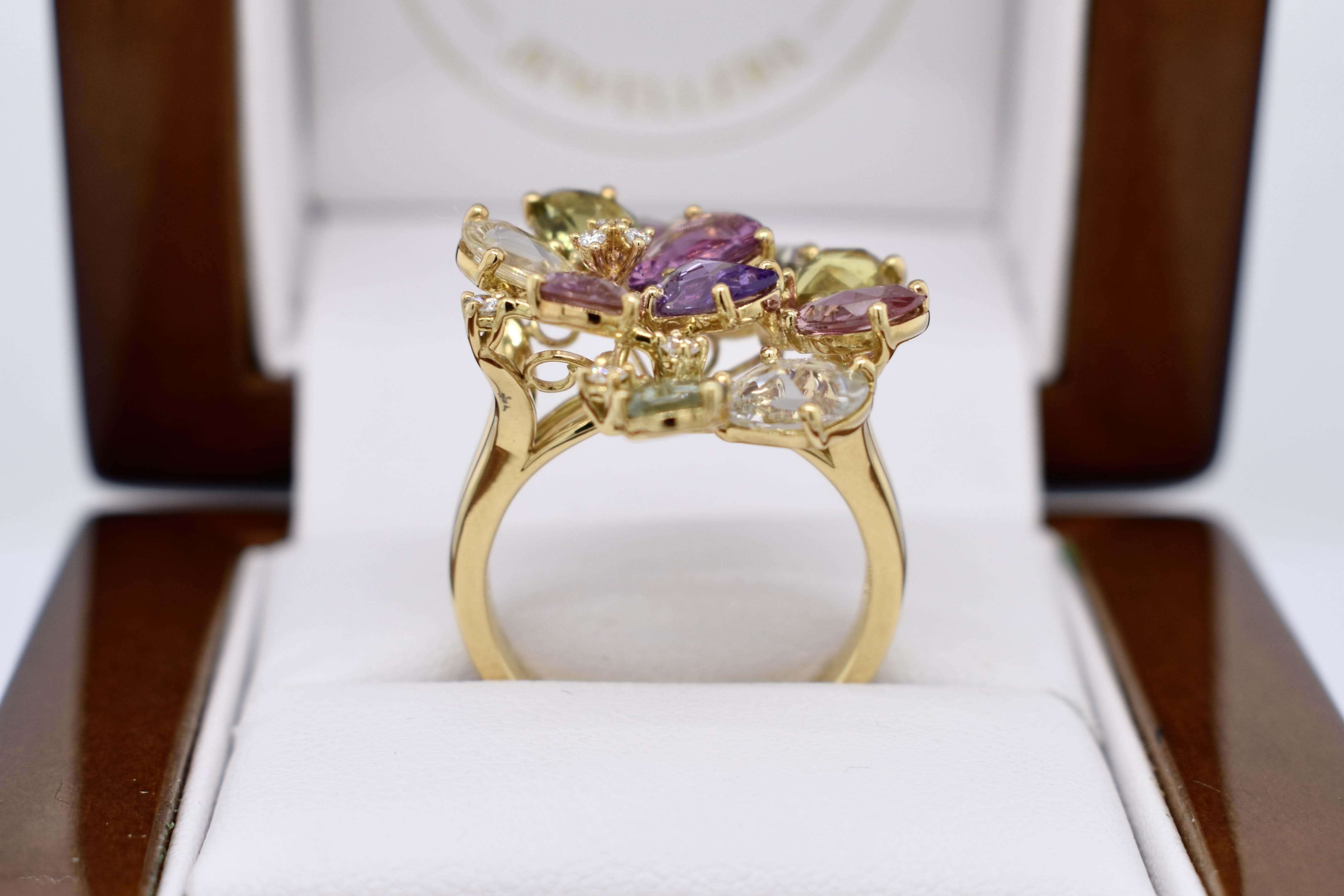 Colourful and unique, this ring is crafted in 18ct yellow gold and features various pastel/soft tones of pear shaped rose cut sapphires, a total of twelve equalling 5.78ct, claw set. The colours range from blue, green, pink and purple and are set in a random cluster with nine round brilliant cut diamonds claw set throughout. Total diamond weight of 0.16ct FG VS-SI. Finger size M. Approx. valuation of $13,500. Independent valuation provided upon purchase.