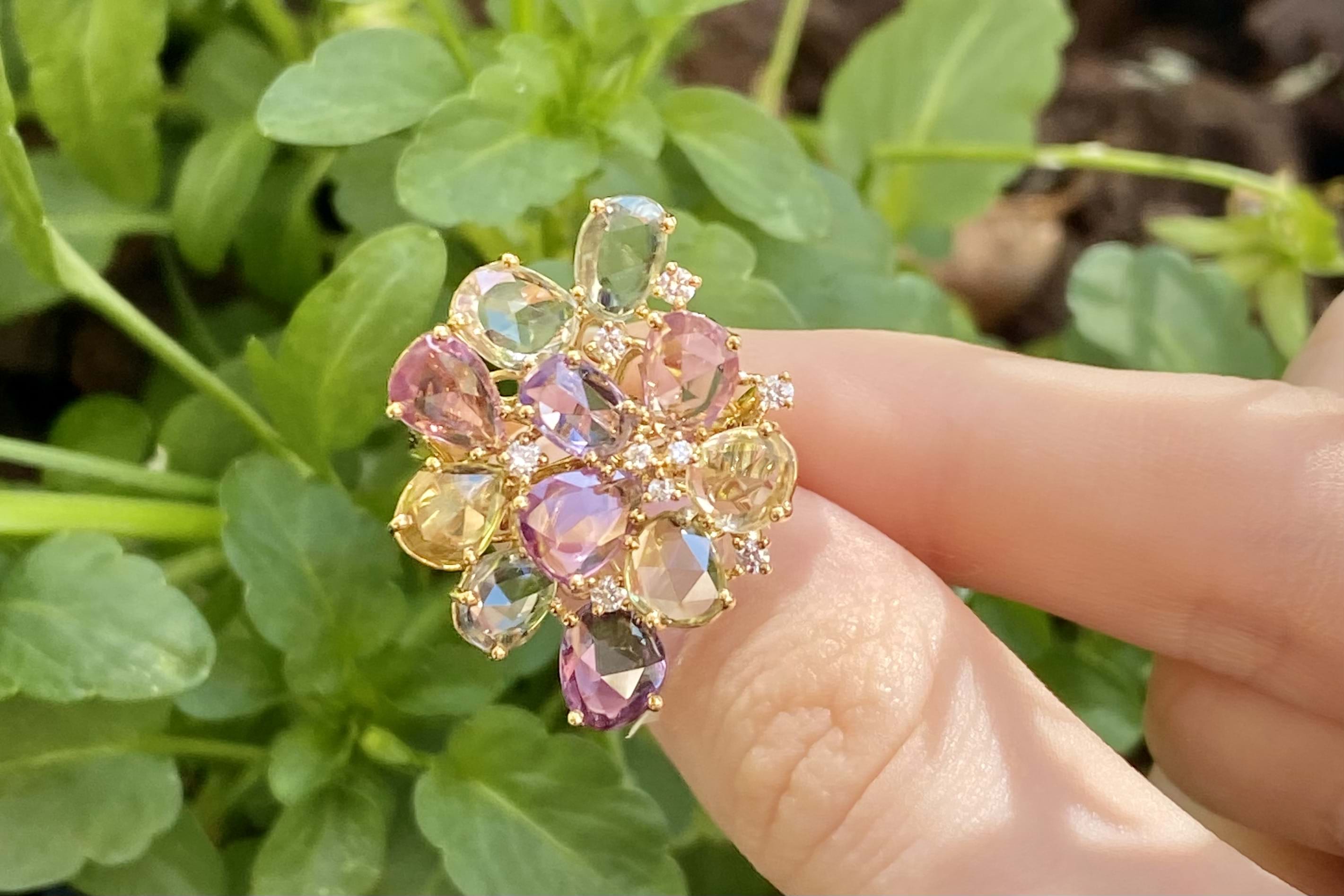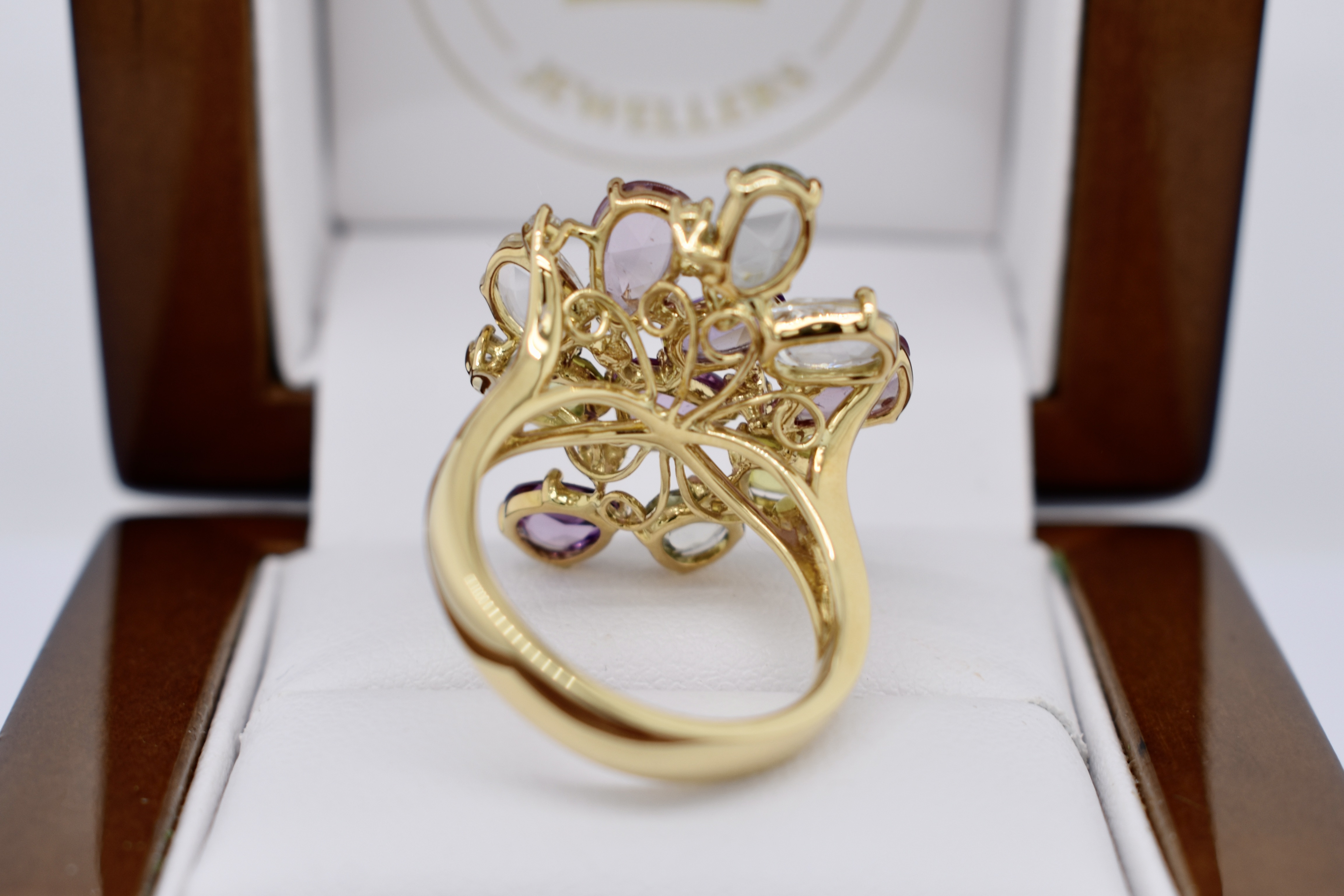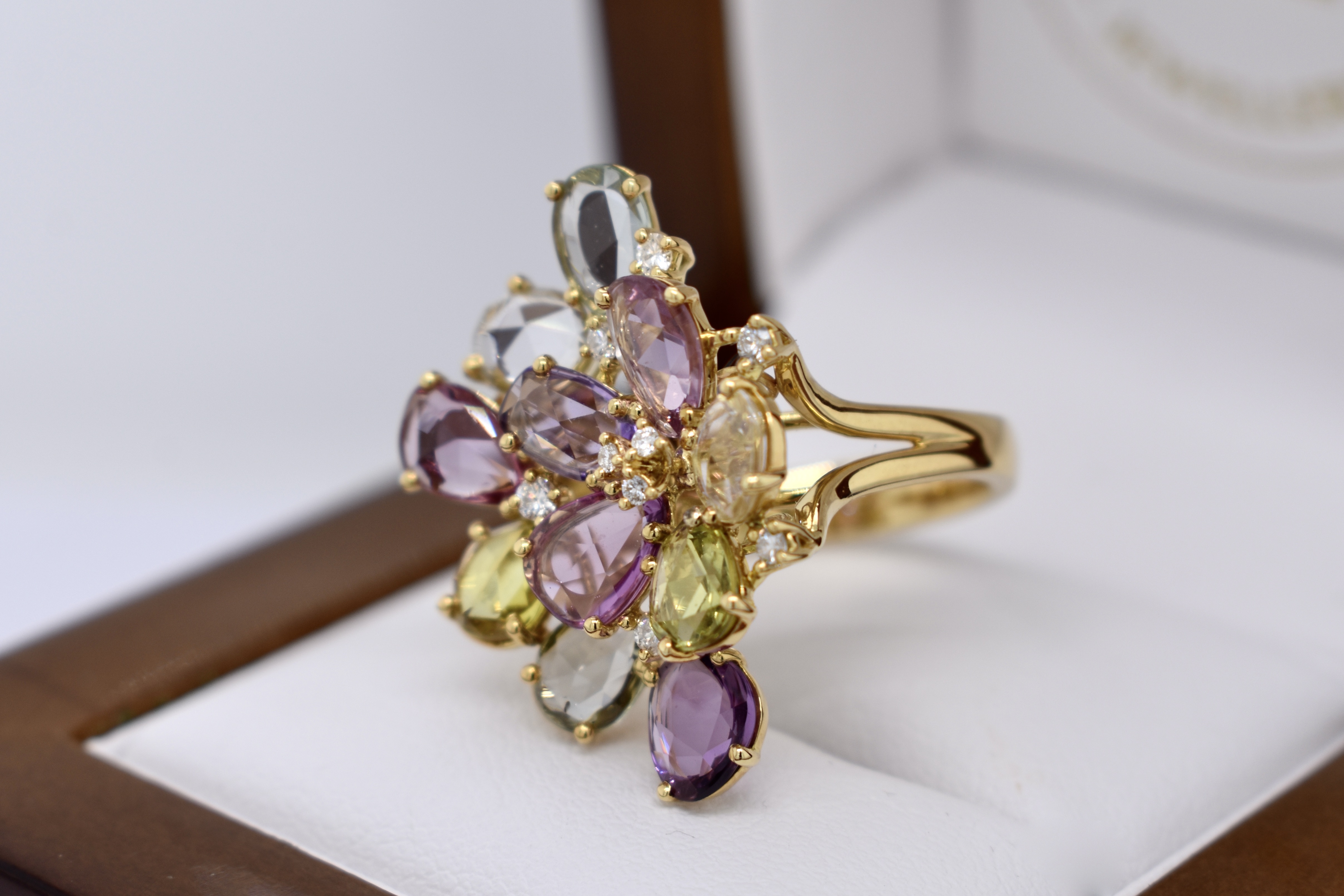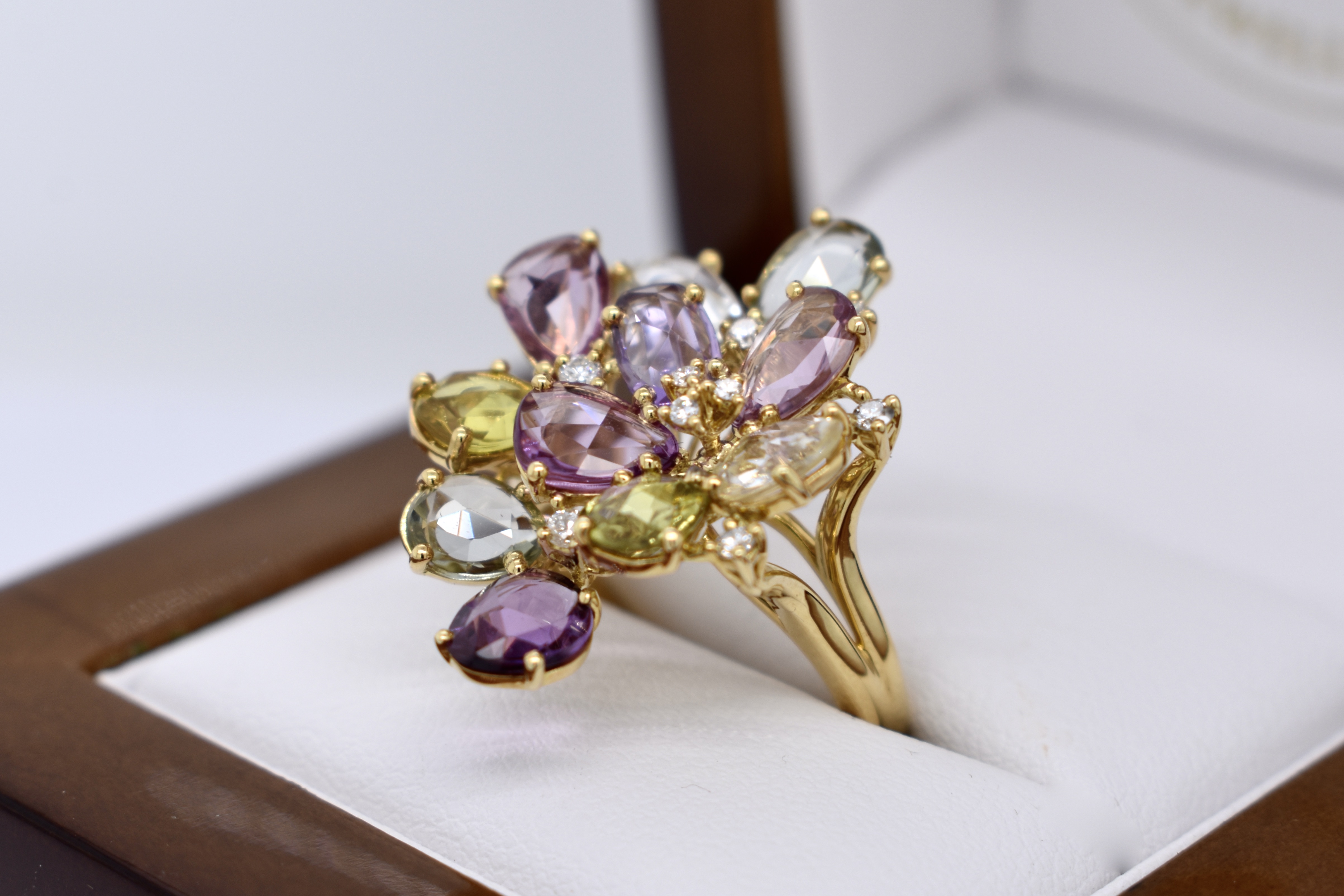 Colourful and unique, this ring is crafted in 18ct yellow gold and features various pastel/soft tones of pear shaped rose cut sapphires, a total of twelve equalling 5.78ct, claw set. The colours range from blue, green, pink and purple and are set in a random cluster with nine round brilliant cut diamonds claw set throughout. Total diamond weight of 0.16ct FG VS-SI. Finger size M. Approx. valuation of $13,500. Independent valuation provided upon purchase.