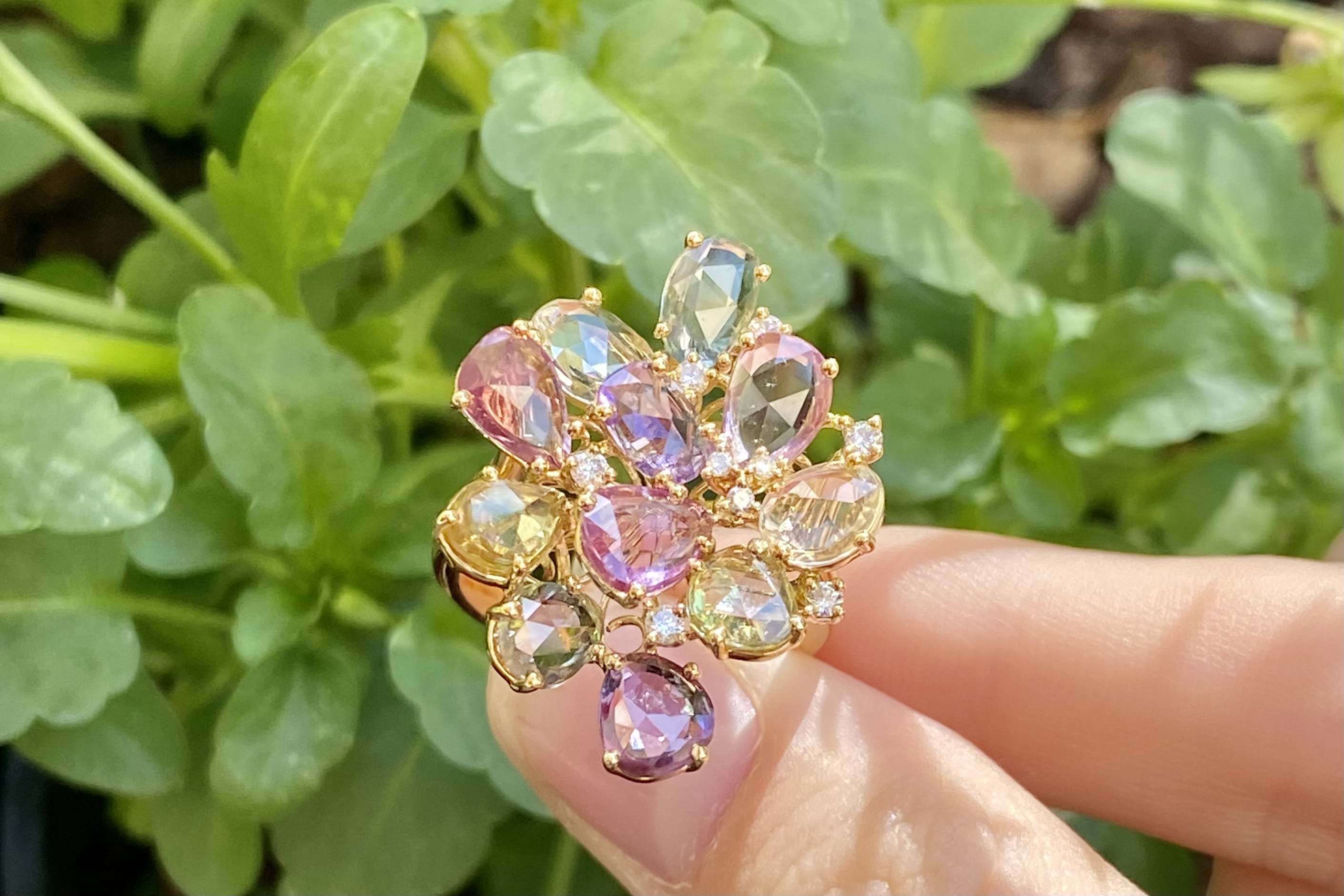 SOLD 18ct Yellow Gold 5.78ct Multi-Coloured Rose Cut Sapphires & 0.16ct Diamond Cluster Ring (M)