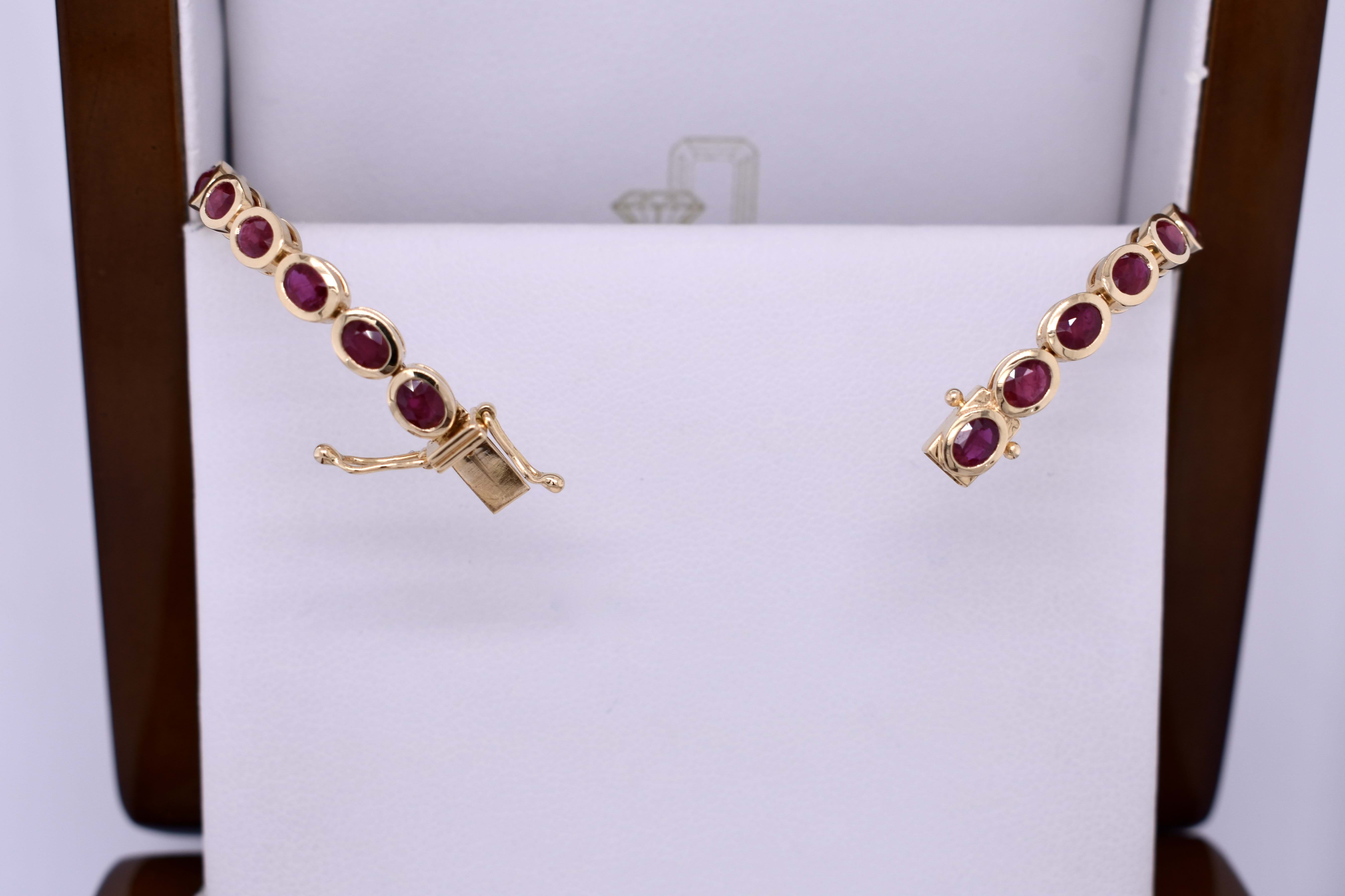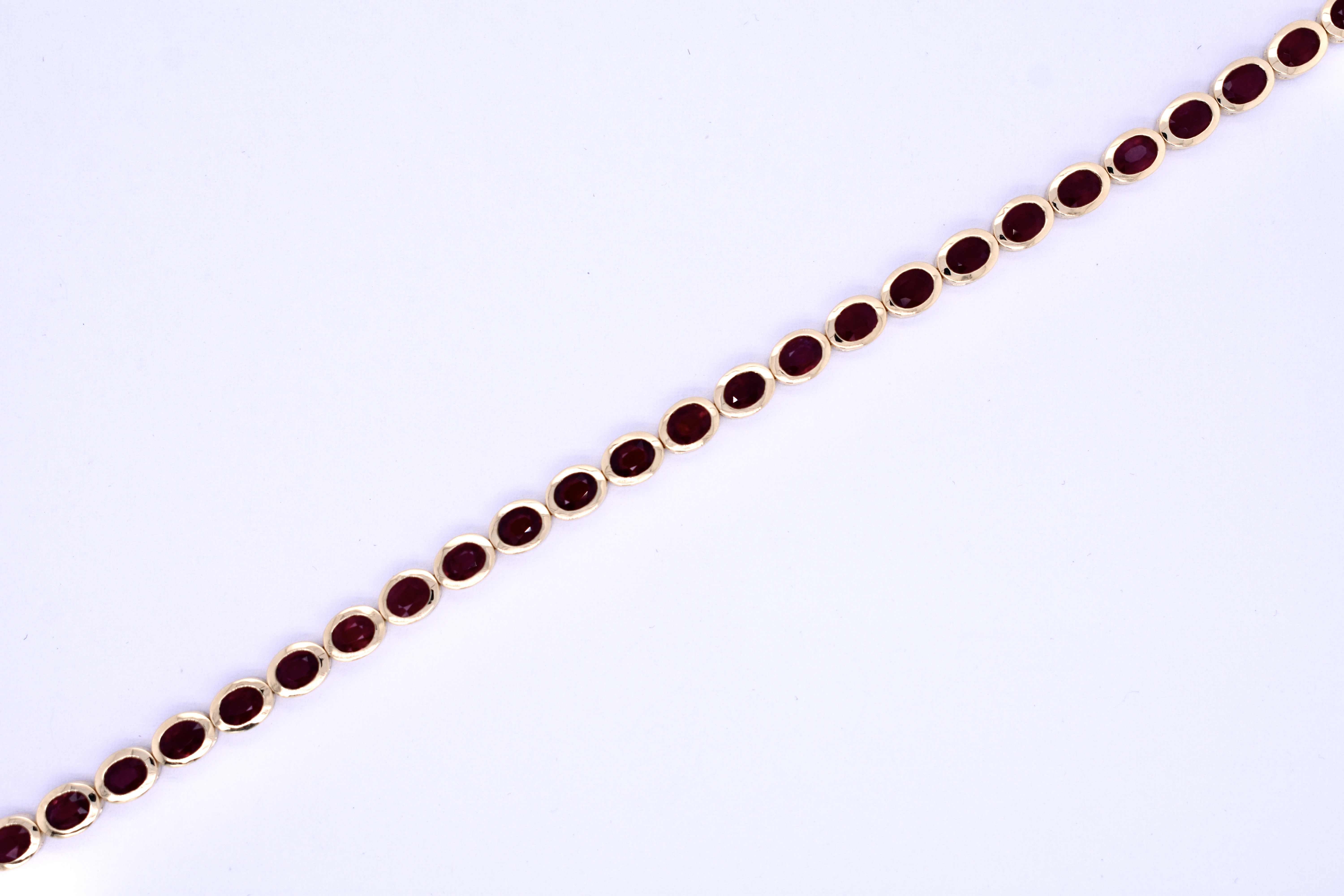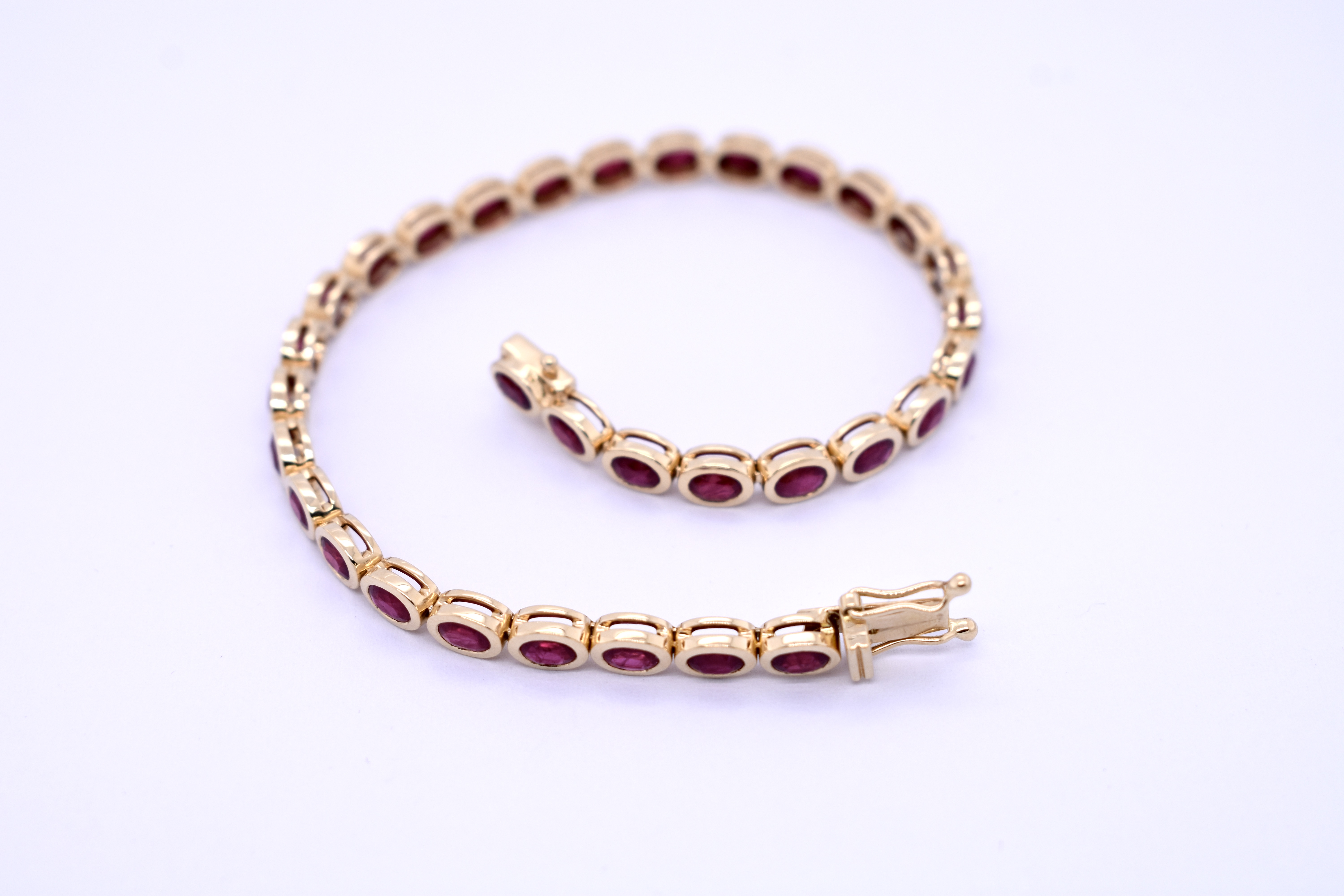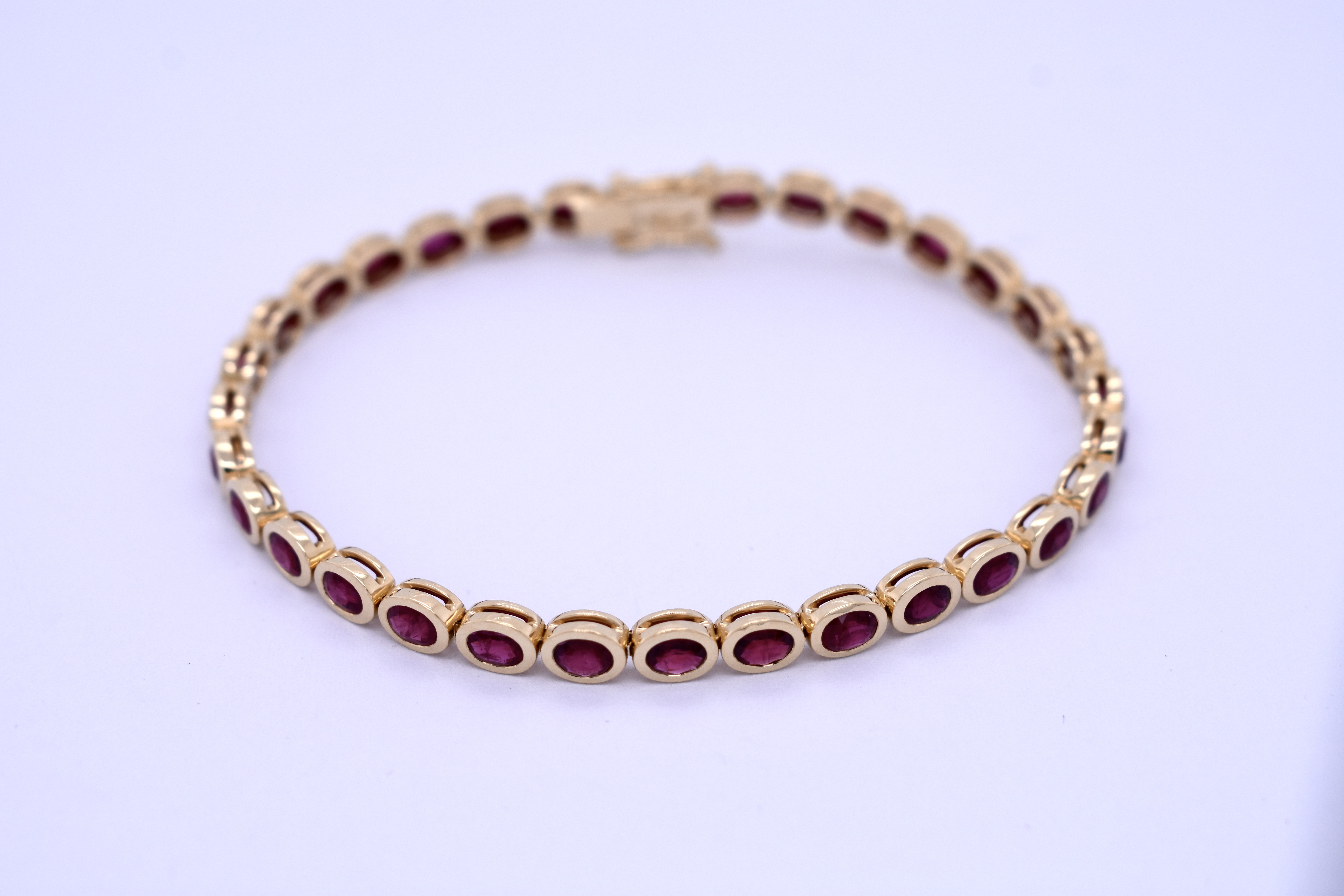 This lovely red tennis bracelet is crafted in 18ct yellow gold, east/west bezel set with 32 oval Mozambique rubies totalling 5.79ct. Measures 19cm long with a concealed clasp and two figure of 8 safety catches.
