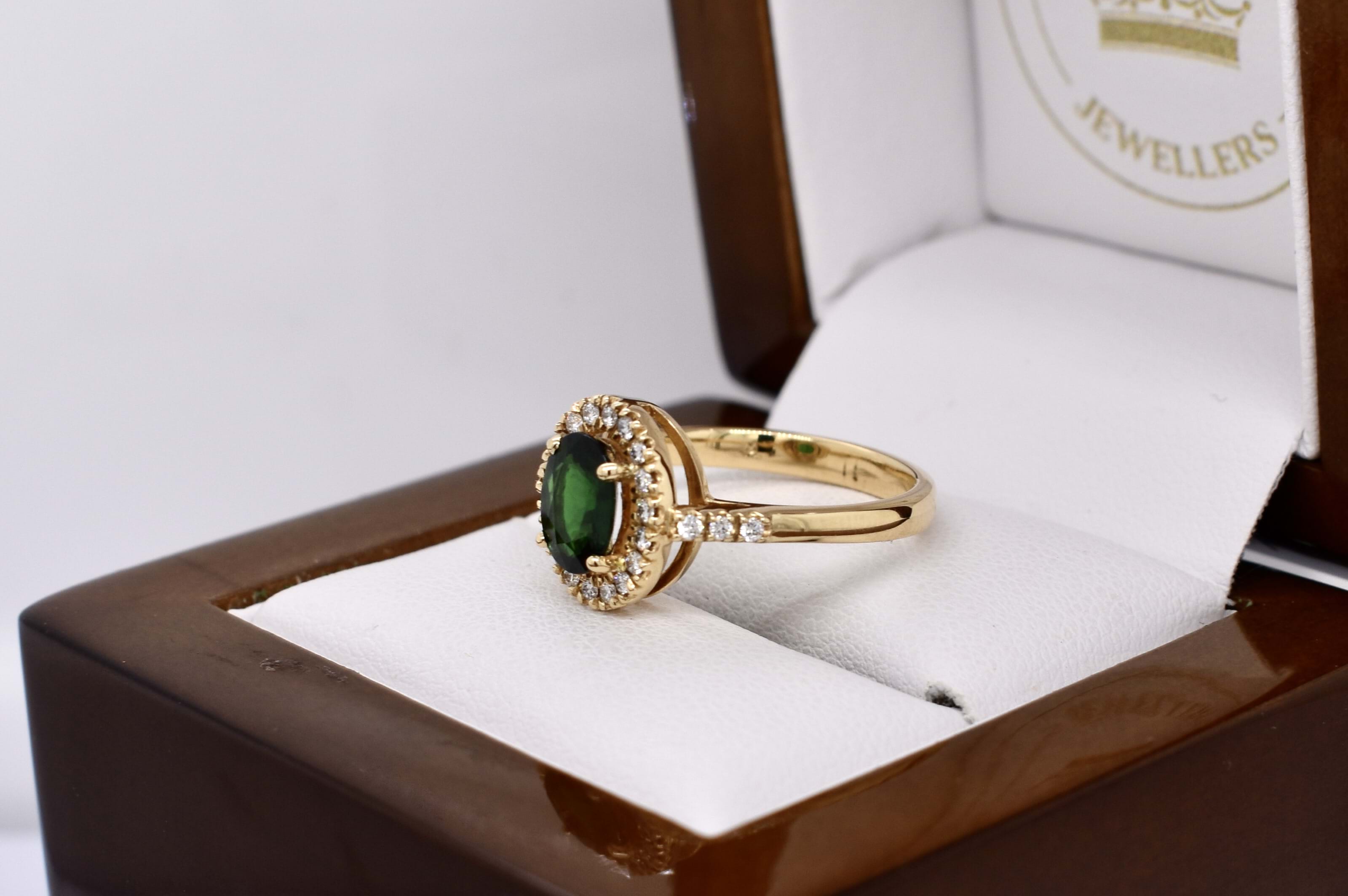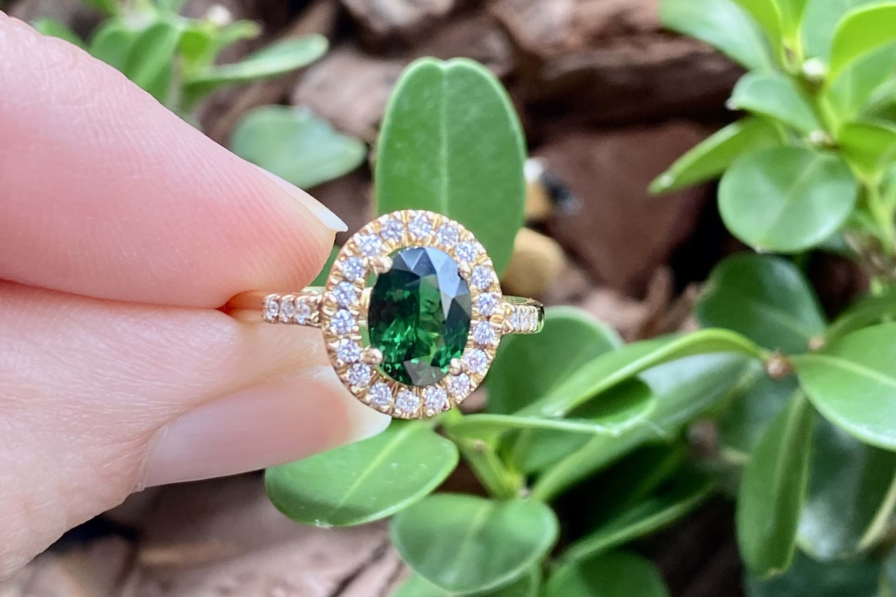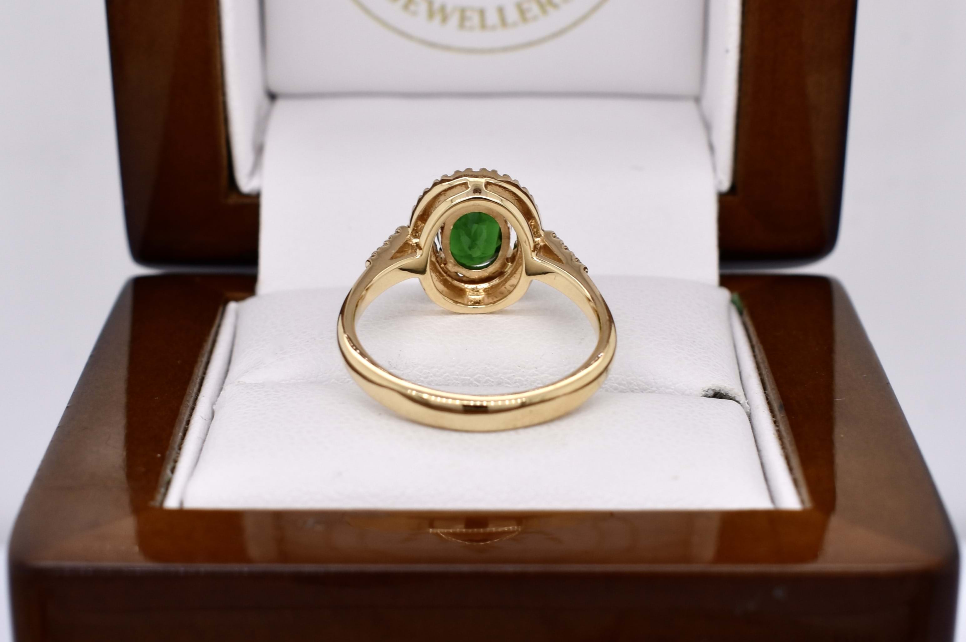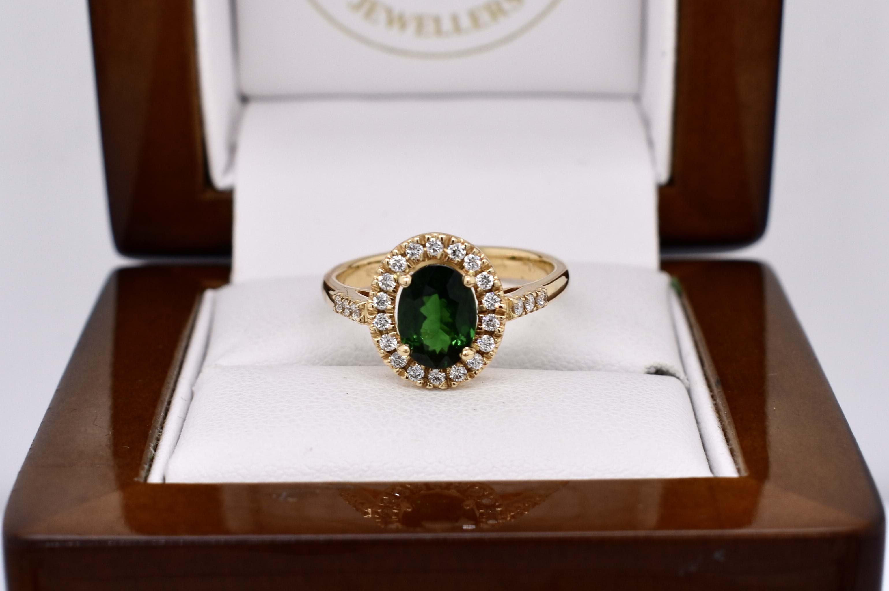 This striking tsavorite garnet and diamond oval halo ring is crafted in 18ct yellow gold and features a stunning bright deep green tsavorite garnet of 1.17ct, measuring 7.83x5.84x3.18mm. Surrounded by a halo of twenty-four round brilliant cut 1.30mm diamonds totalling 0.22ct G SI, cut down claw set, with a couple continuing down the swept up shoulders of the half round 2.70mm band. Finger size N. Independent Valuation Supplied.