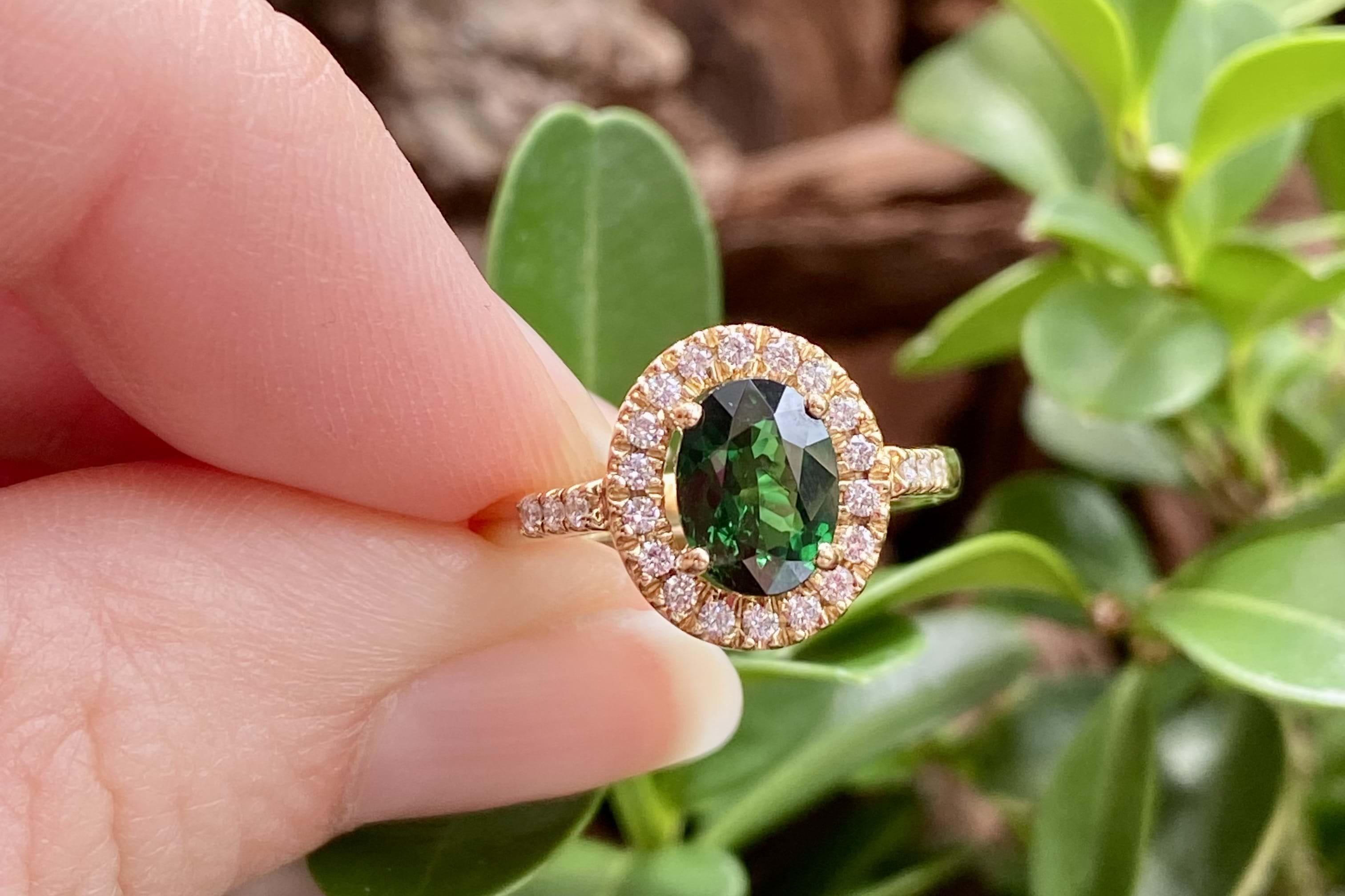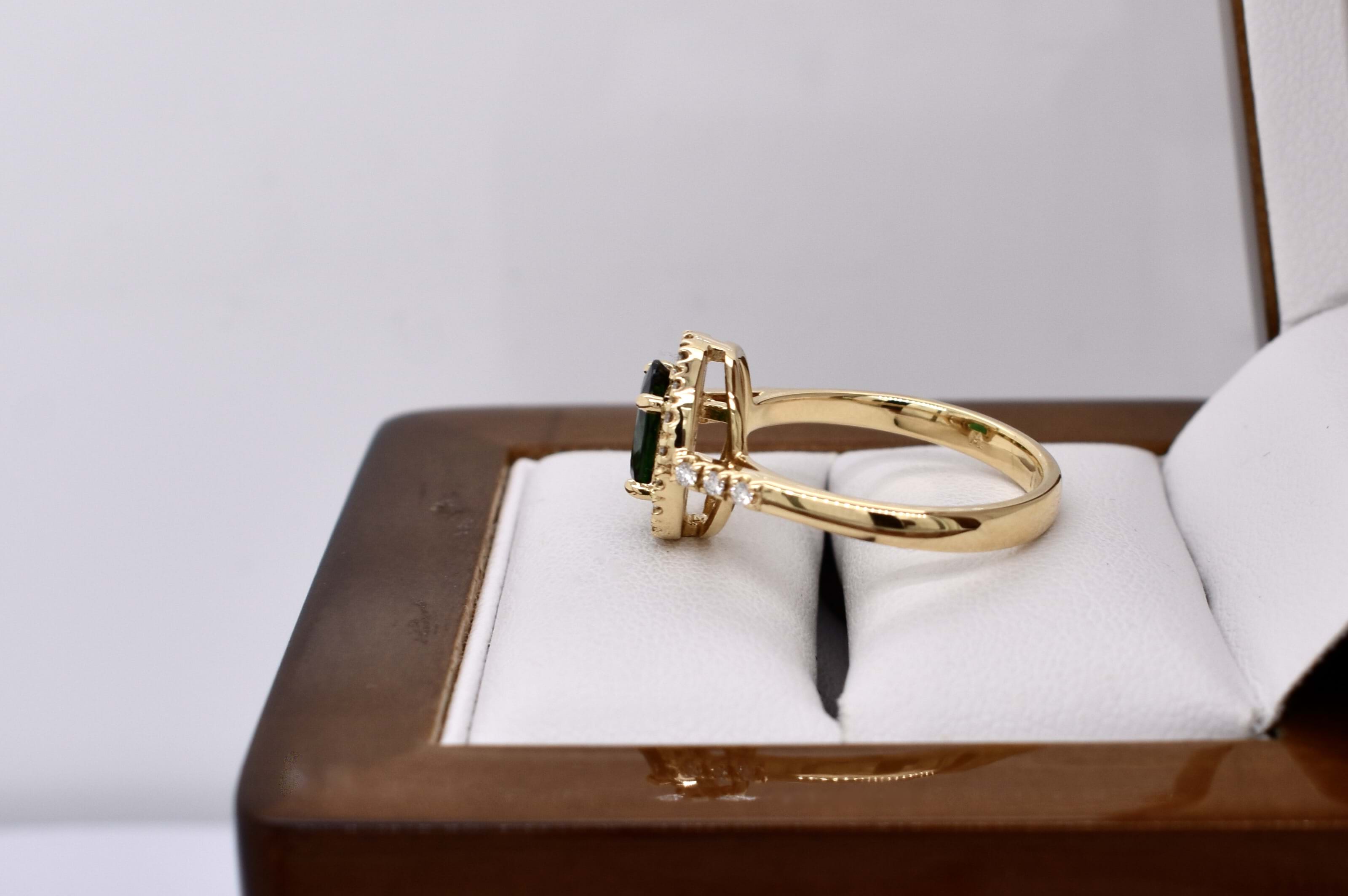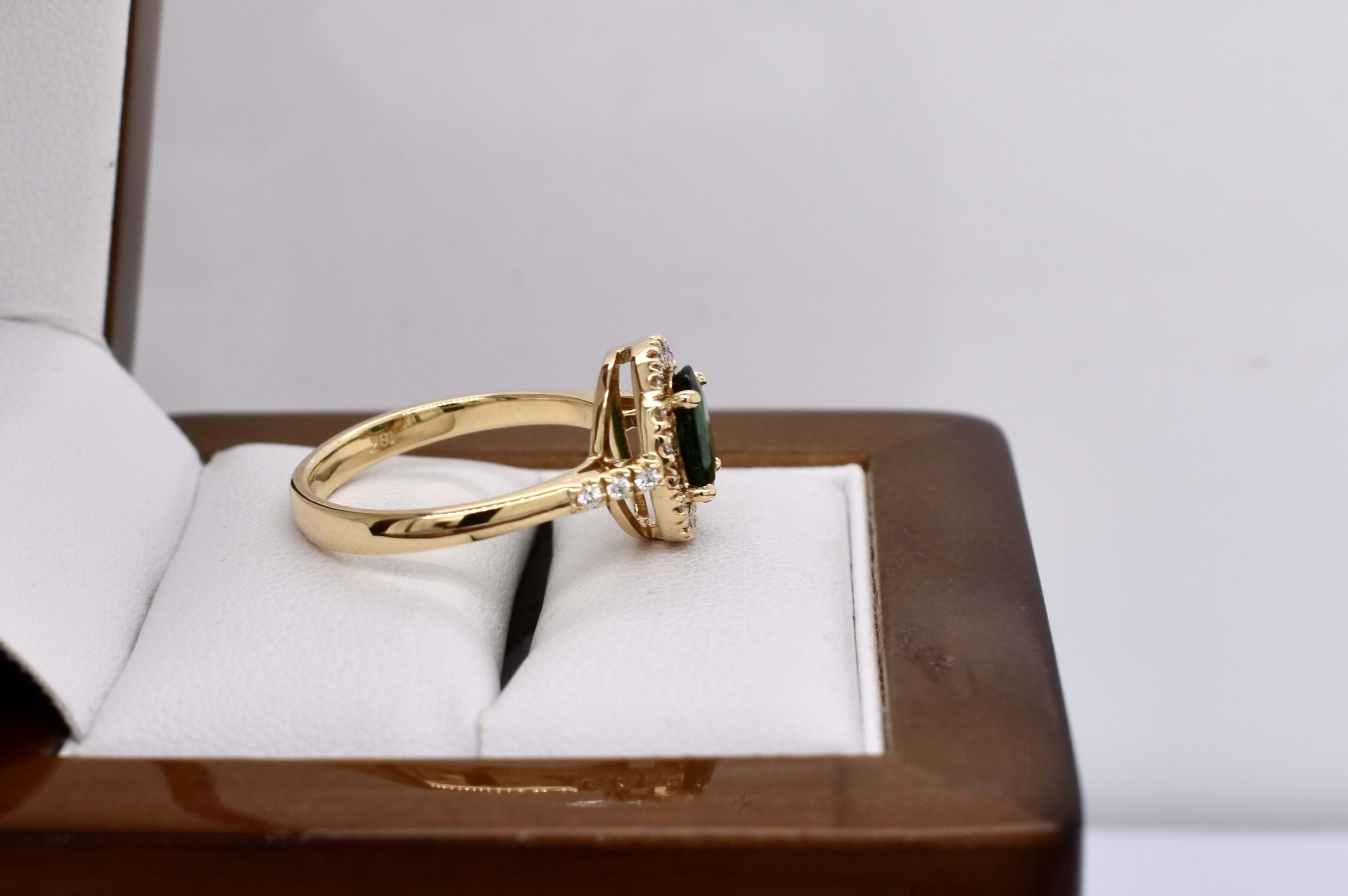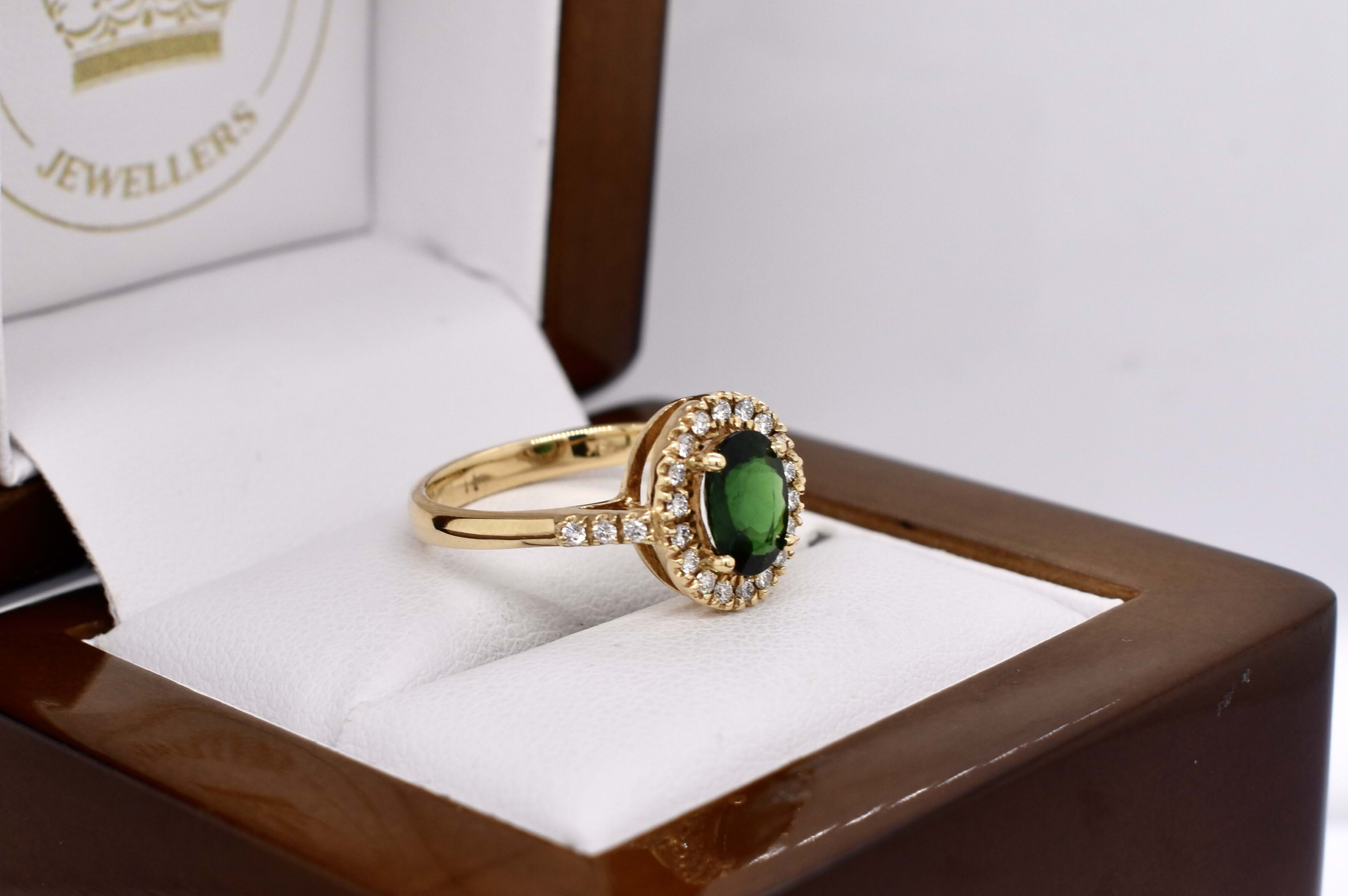 This striking tsavorite garnet and diamond oval halo ring is crafted in 18ct yellow gold and features a stunning bright deep green tsavorite garnet of 1.17ct, measuring 7.83x5.84x3.18mm. Surrounded by a halo of twenty-four round brilliant cut 1.30mm diamonds totalling 0.22ct G SI, cut down claw set, with a couple continuing down the swept up shoulders of the half round 2.70mm band. Finger size N. Independent Valuation Supplied.
