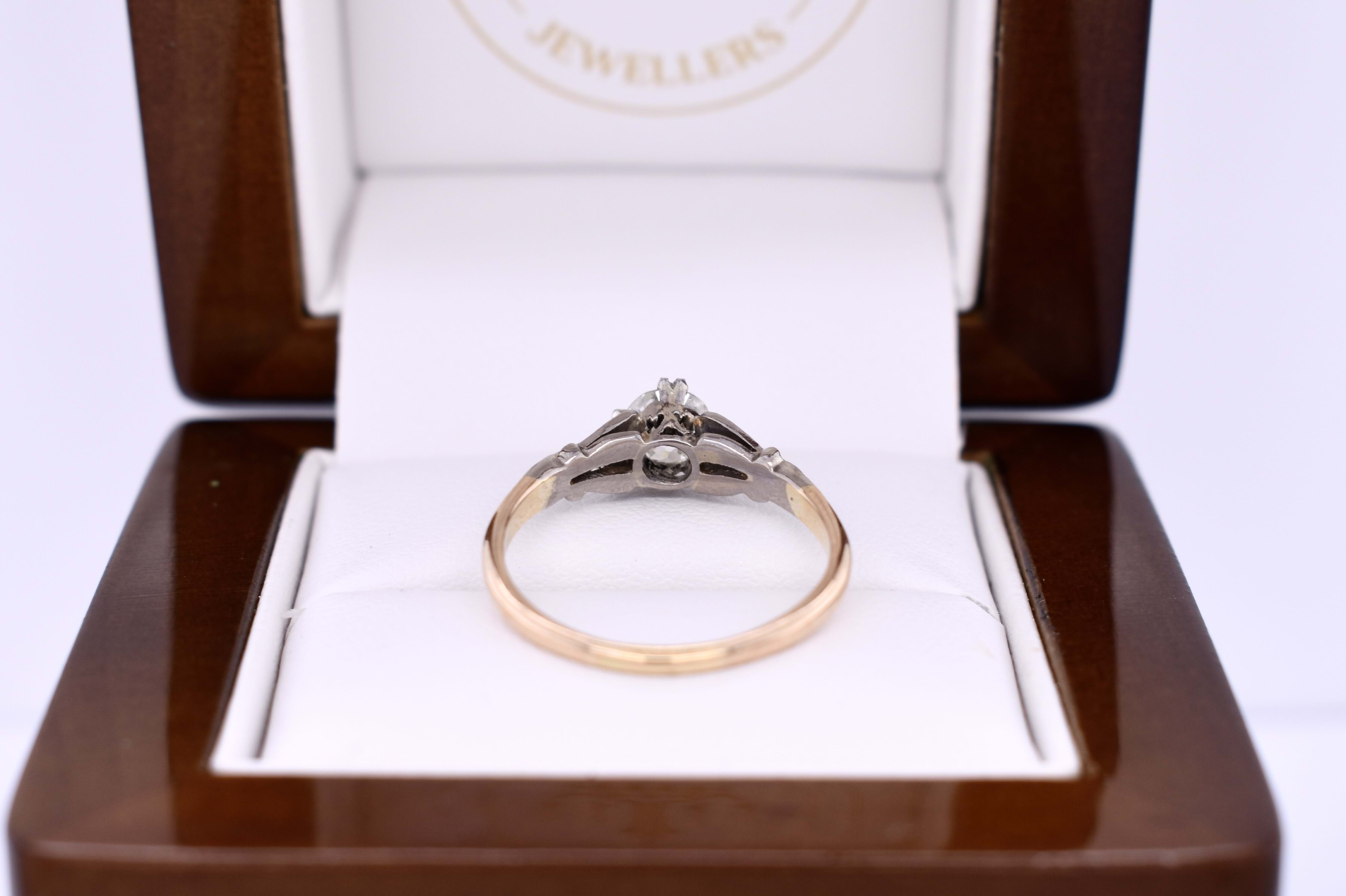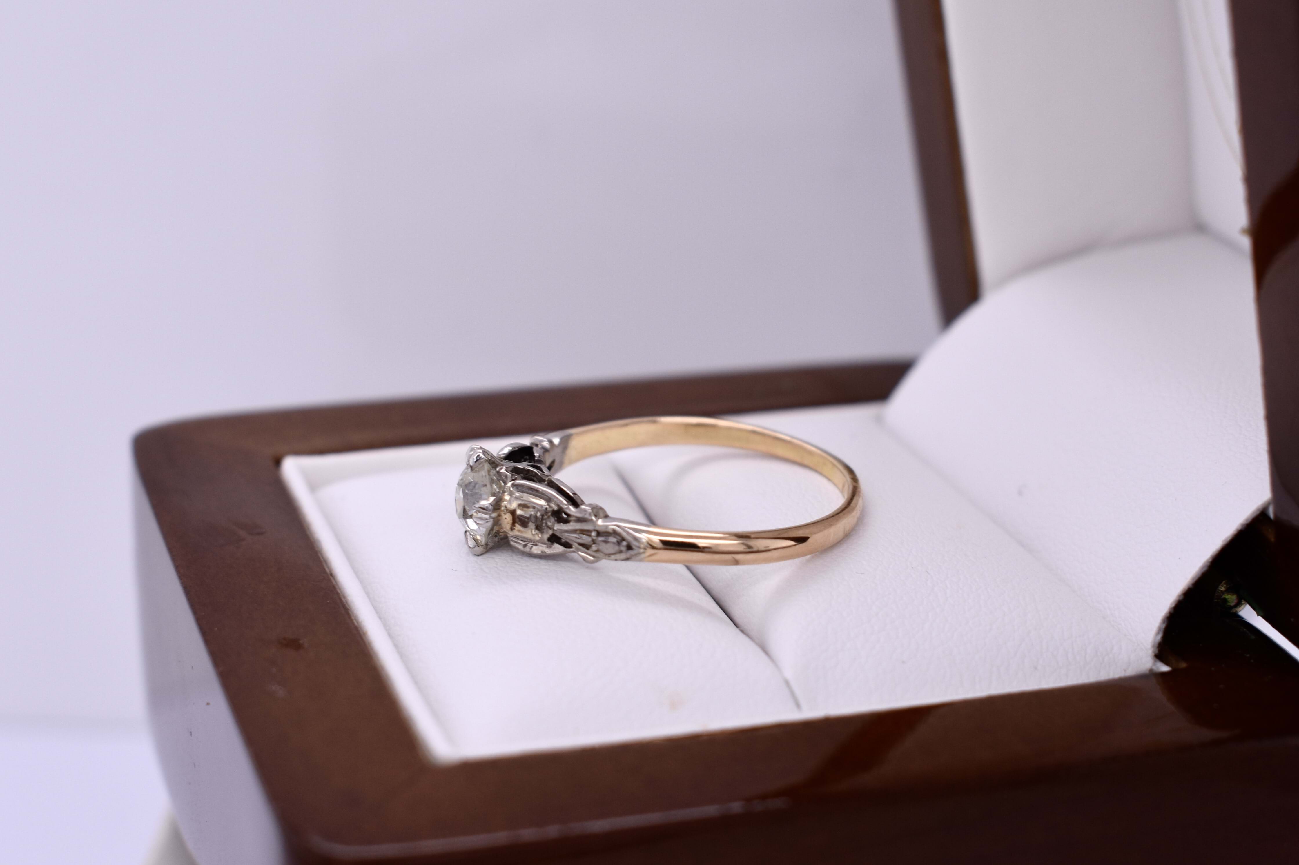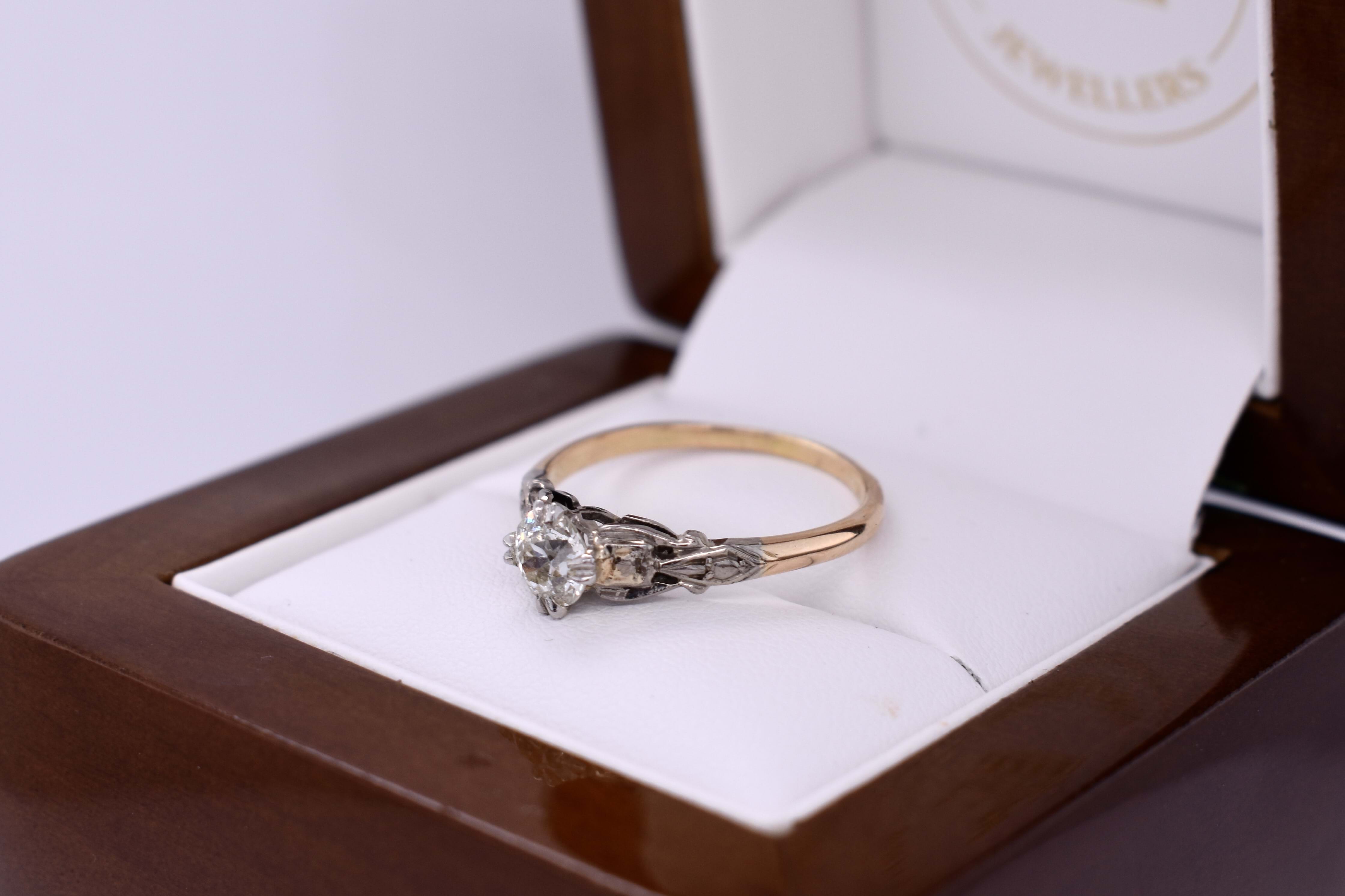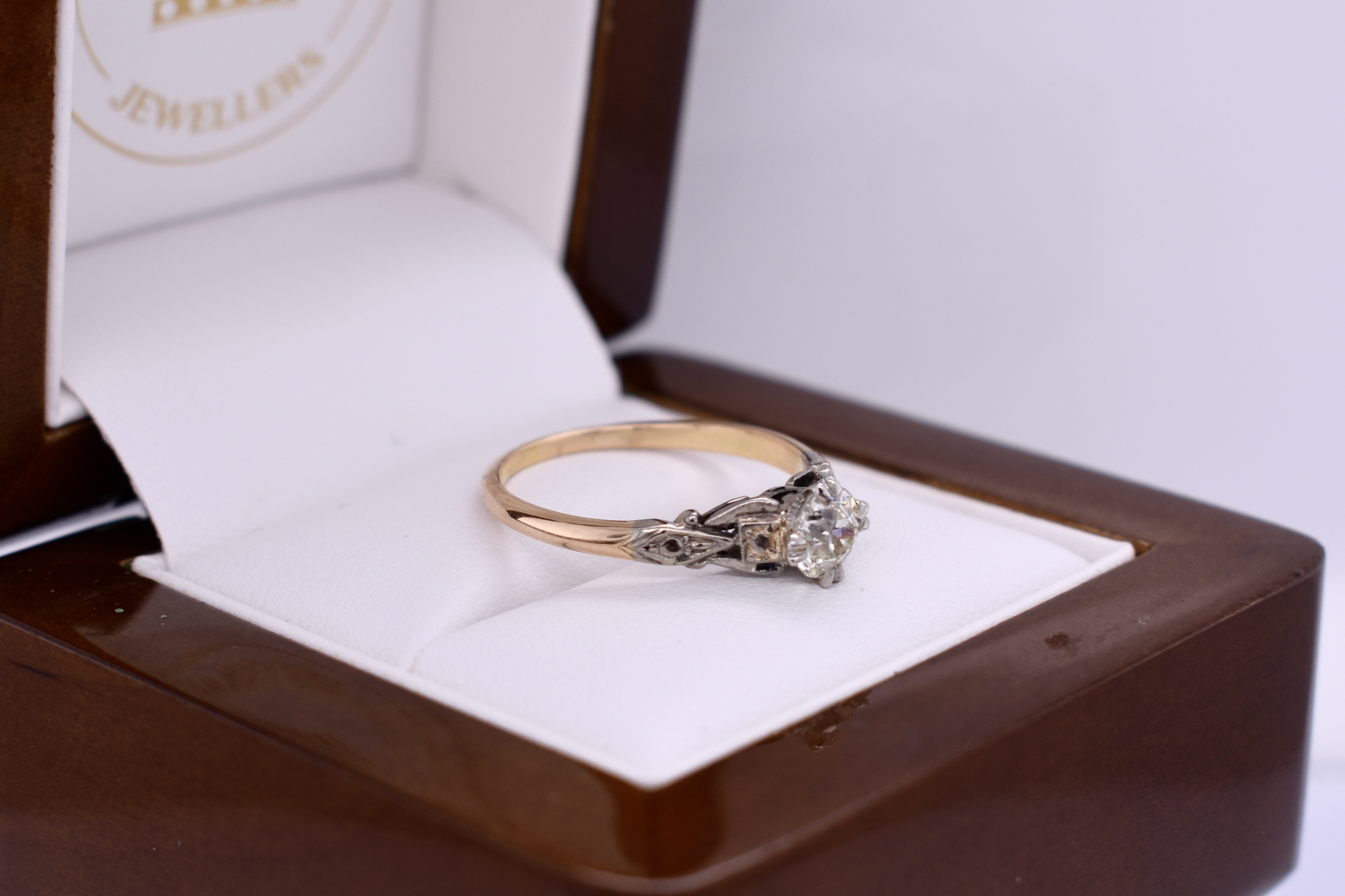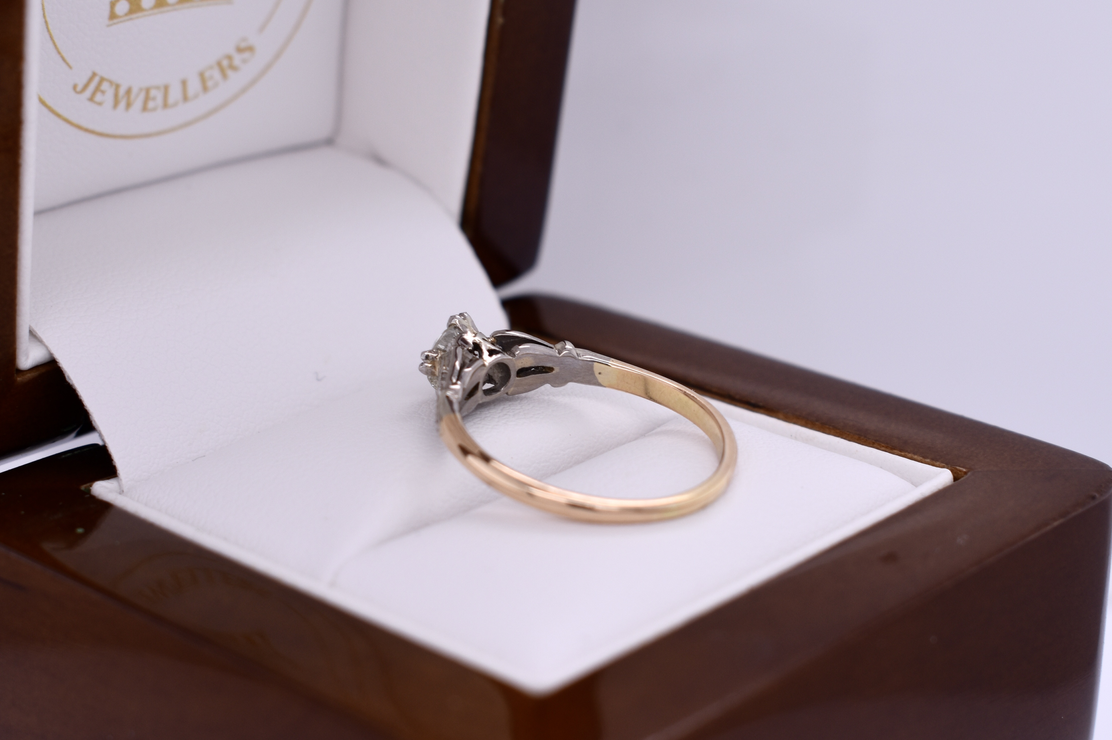 This dreamlike single stone diamond ring is entirely handcrafted and features a beautiful 0.60ct old European cut diamond, set with four grooved claws in platinum on intricately engraved swept up shoulders, finished with a 1.46mm 18ct yellow gold band. Total ring weight is 2.41 grams, diamond is L/M SI2. Finger size O. Independent valuation supplied.