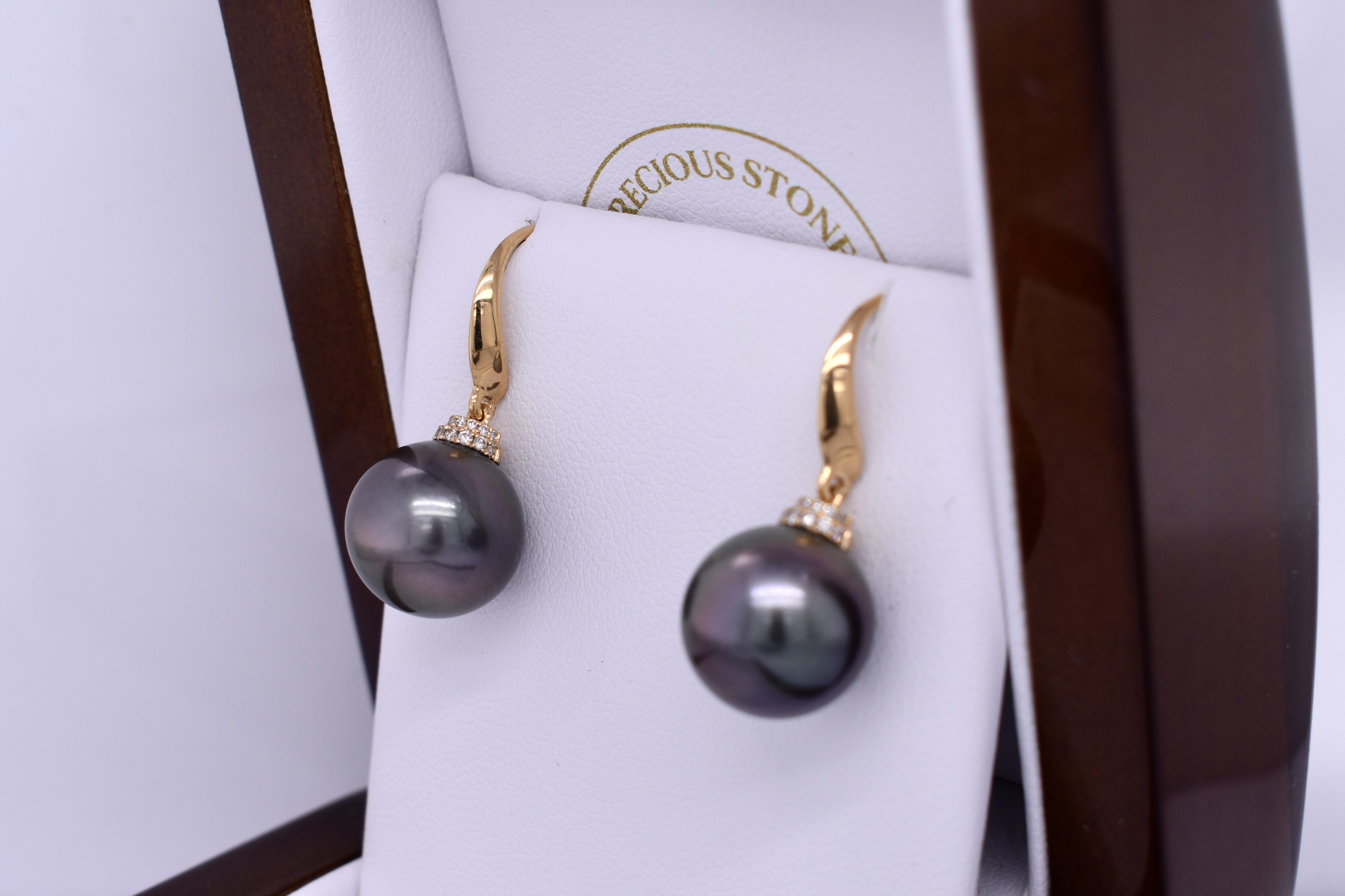 The loveliest pair of Tahitian semi round 12.7-12.5mm pearls, suspended from an 18ct yellow gold pearl cap studded with 14 round brilliant cut diamonds each. A total of 28 diamonds measuring 1.05-0.95mm, totalling 0.14ct H SI. Completed with tapered hook fittings. Independent Valuation Supplied.