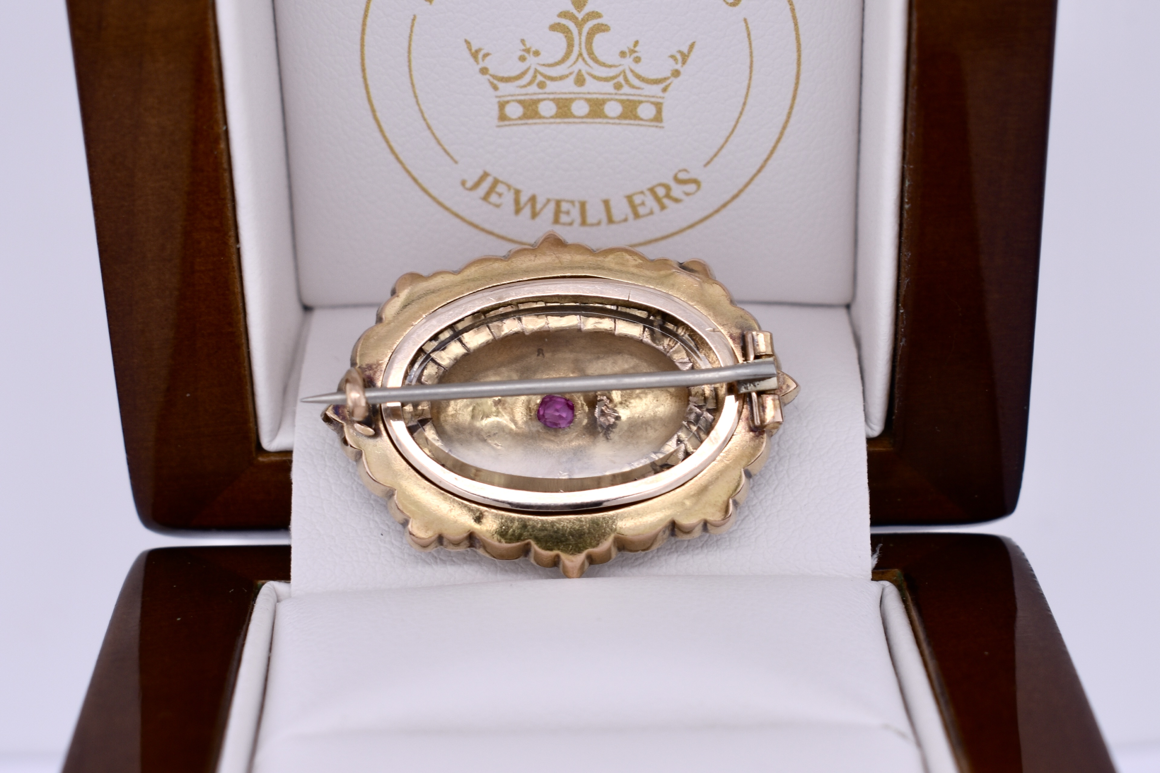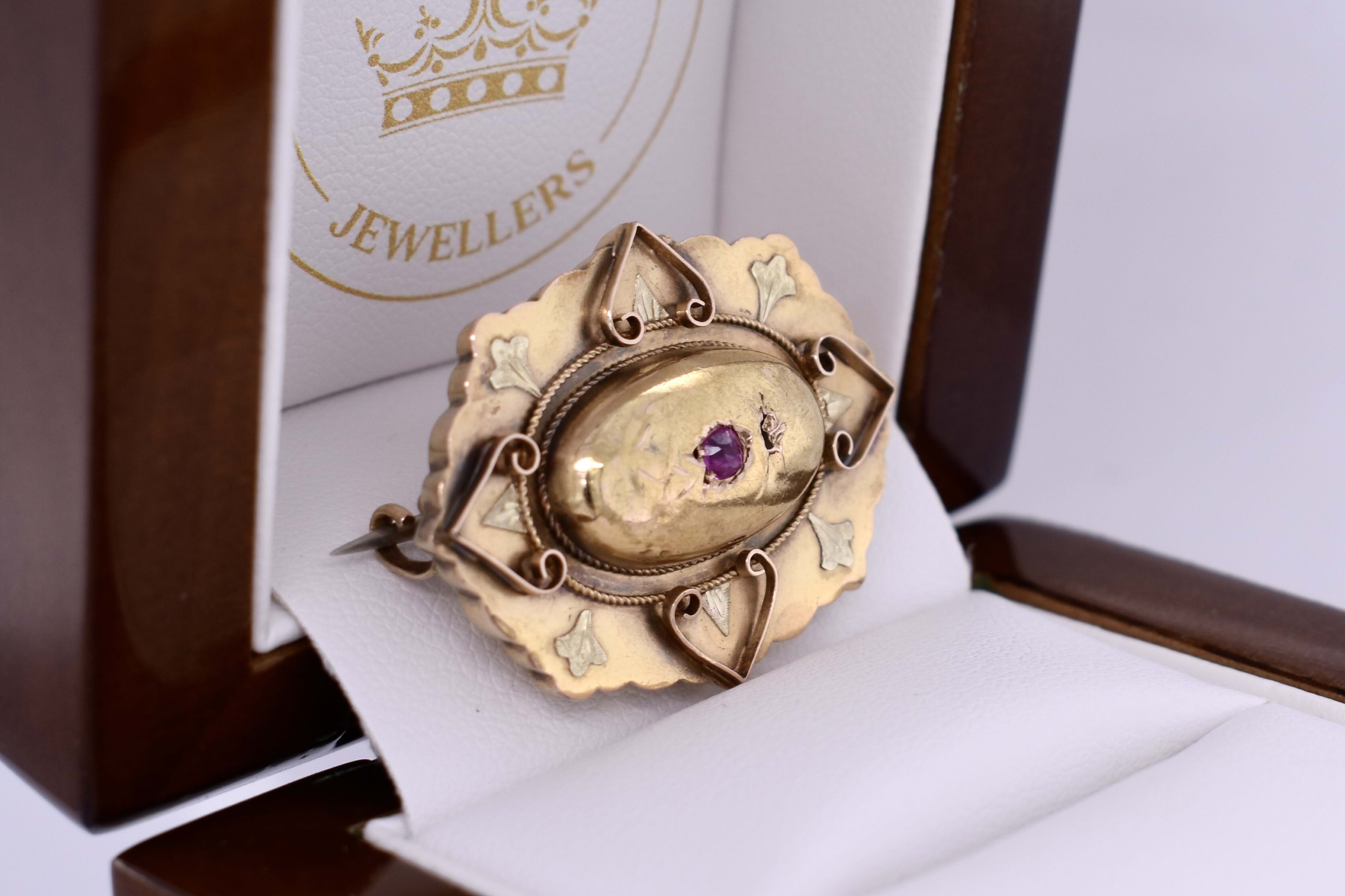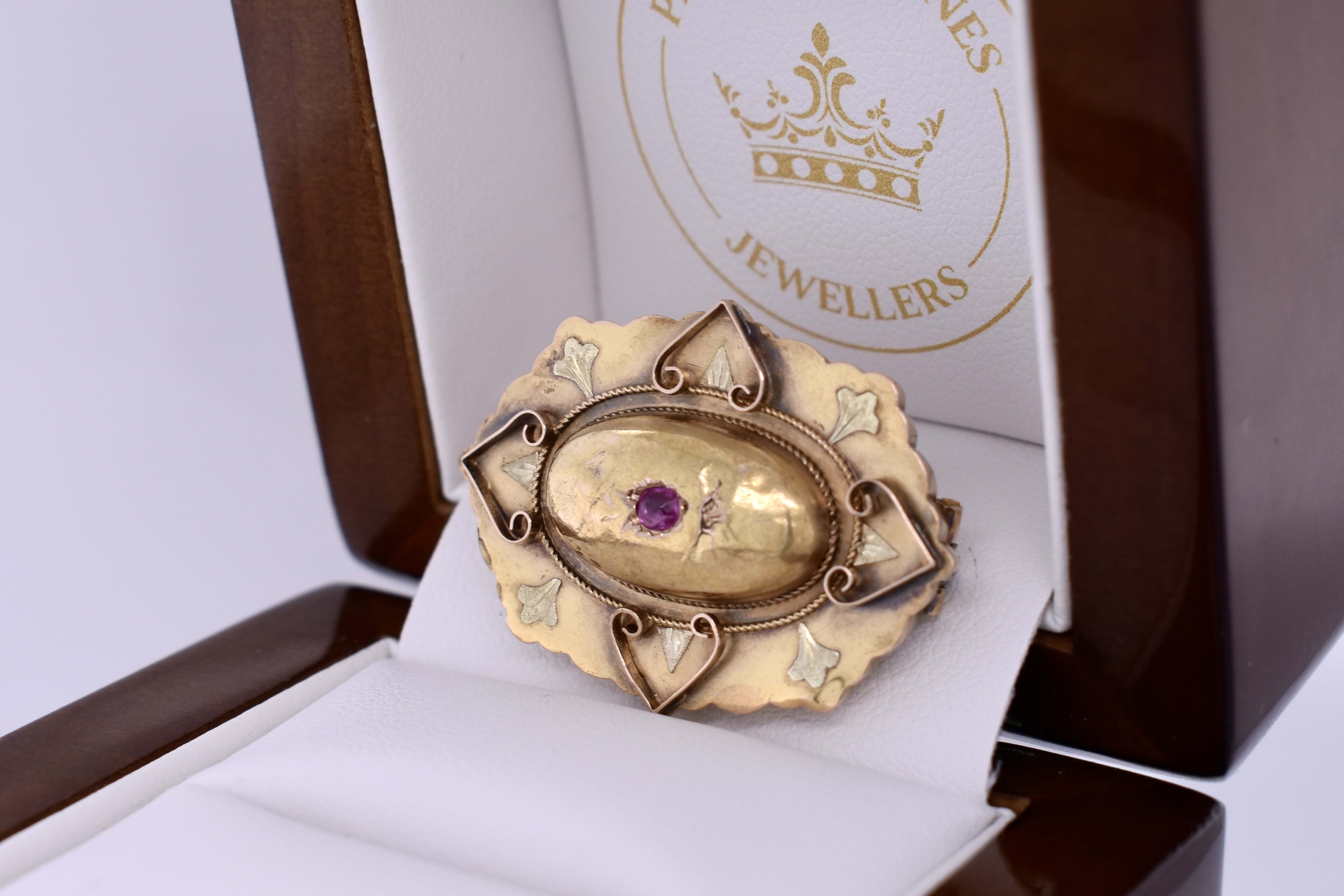 This gorgeous Victorian brooch is made in 18ct yellow gold and features a red paste in the centre. It is complimented with rose gold heart scrolls & green gold leaf motifs. Finished with a glass locket back, the total brooch weight is 4.65 grams. It is to be noted that there is damage on the front as this is an estate piece.