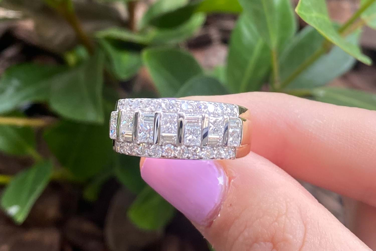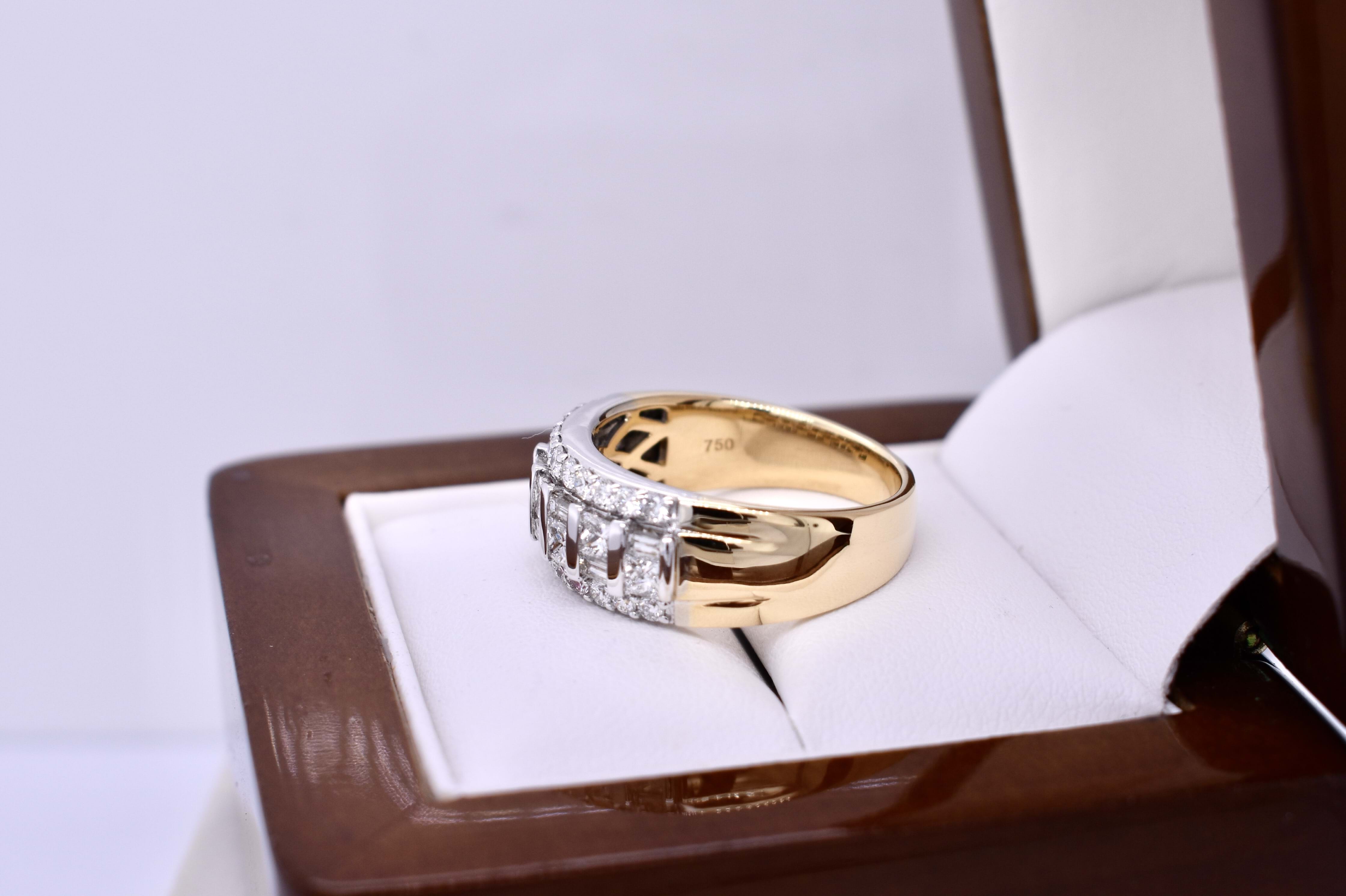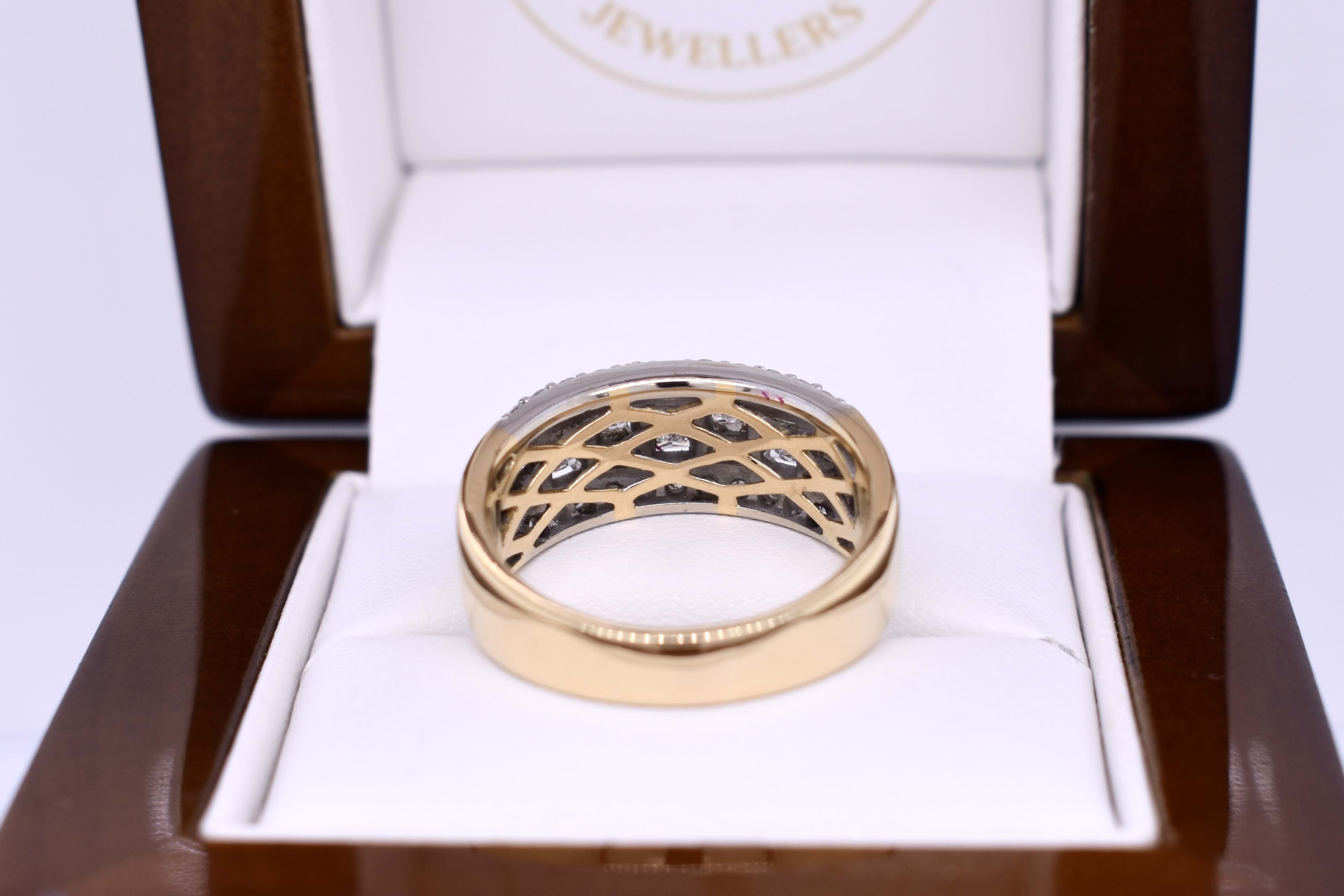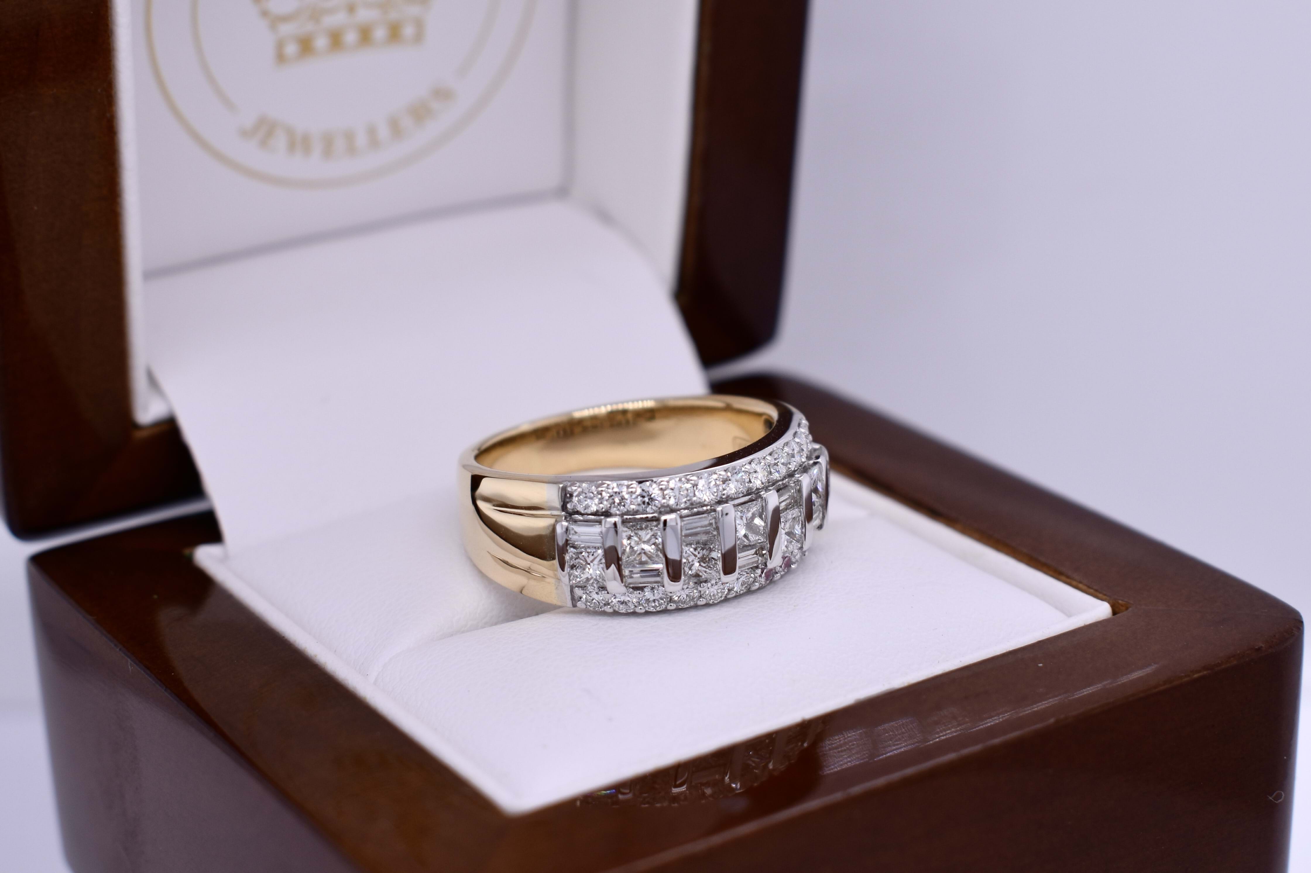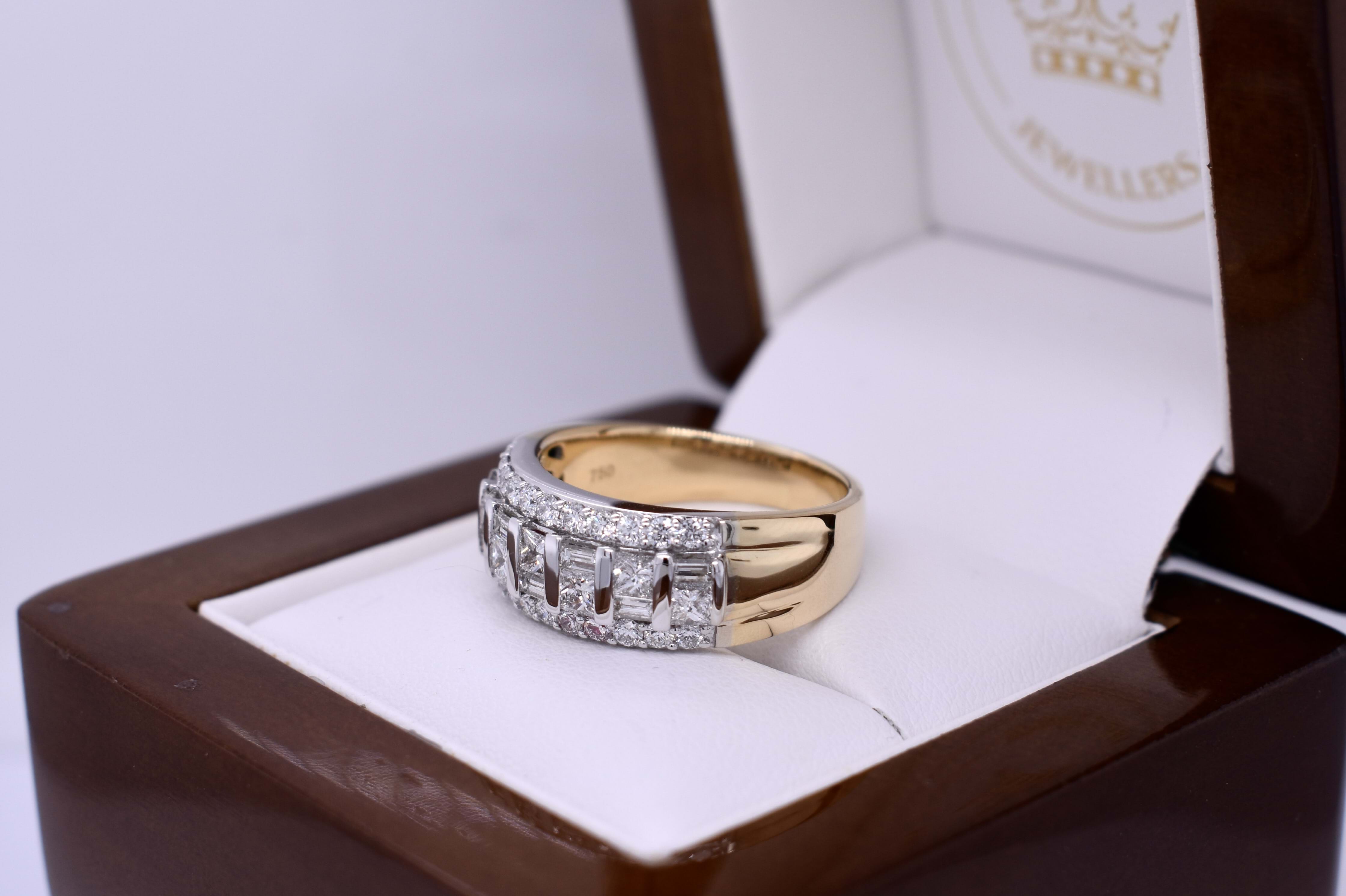 This sparkling and eye-catching wide band diamond ring features three rows with a total of 36 diamonds. At the centre, seven baguette cut diamonds and seven princess cut diamonds are channel set in pairs between 18ct white gold bars. The baguette diamonds have a combined weight of 0.35ct, white the princess cut diamonds total 0.84ct. The centre row is flanked on each side by eleven round brilliant cut diamonds, horizontally claw set in white gold with 22 stones in total weighing 0.55ct. The design is finished with a tapered 18ct yellow gold band. Total diamond weight is 1.74ct, independently graded GH colour and VS-SI clarity. Finger size Q. Independent valuation supplied.