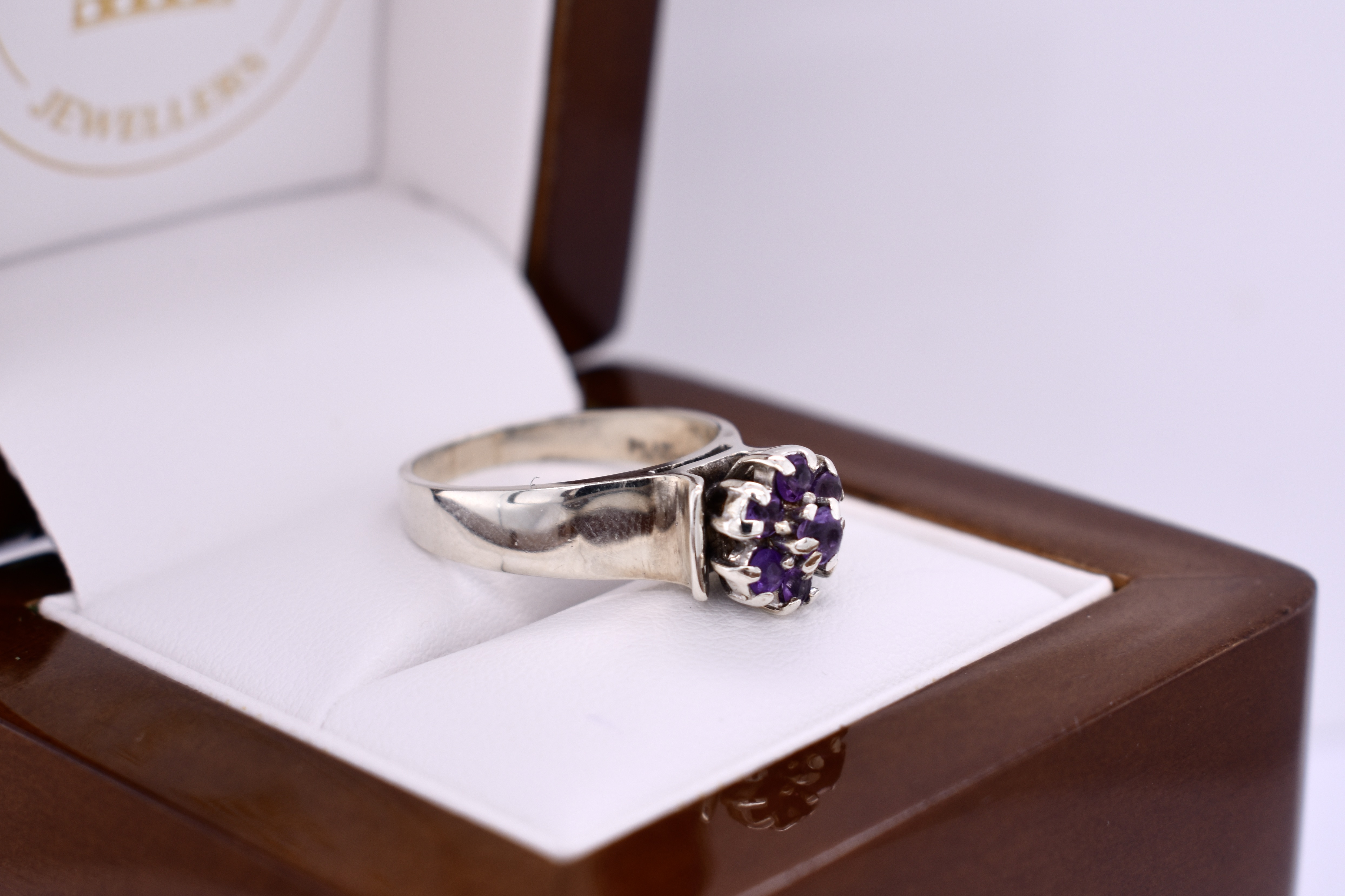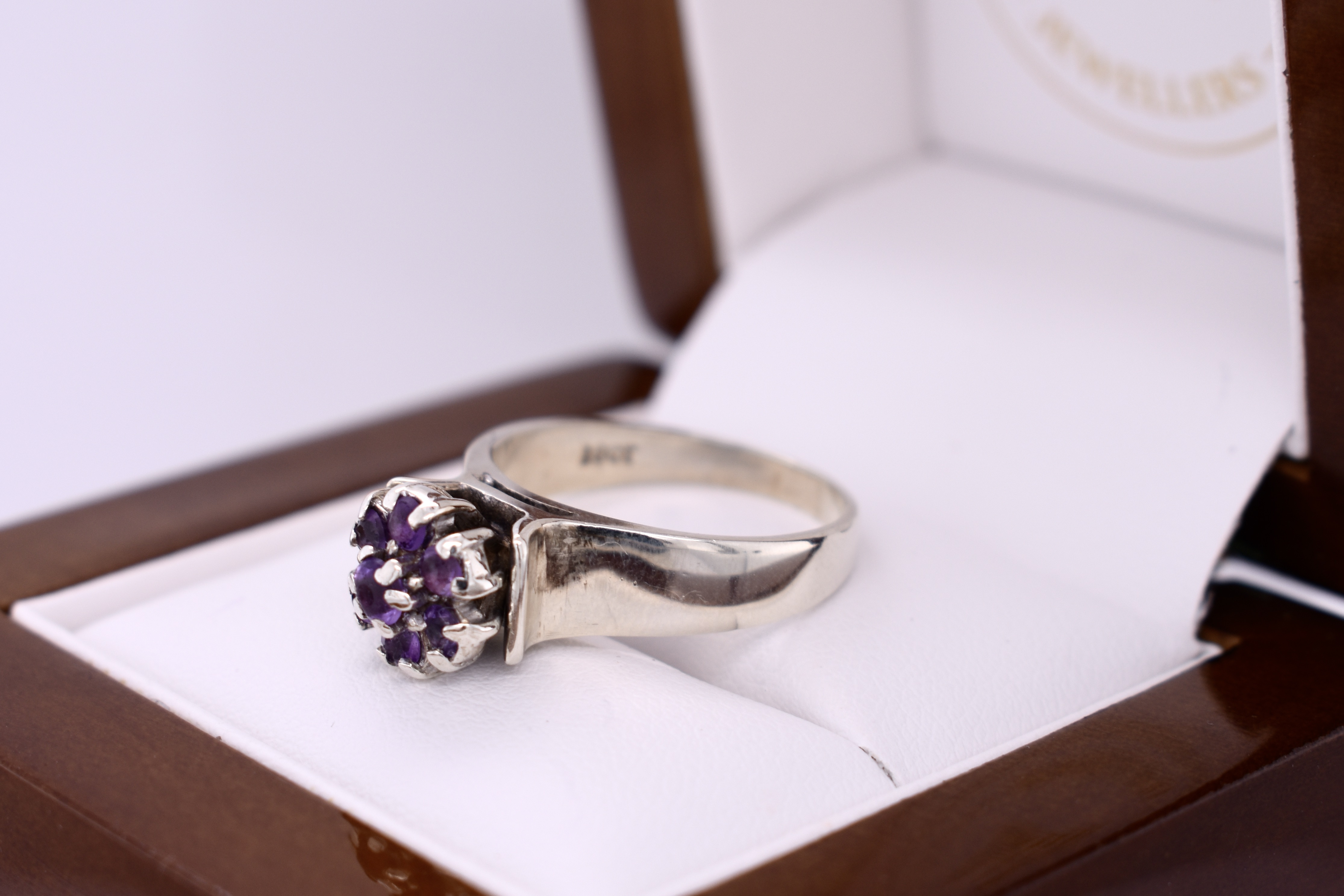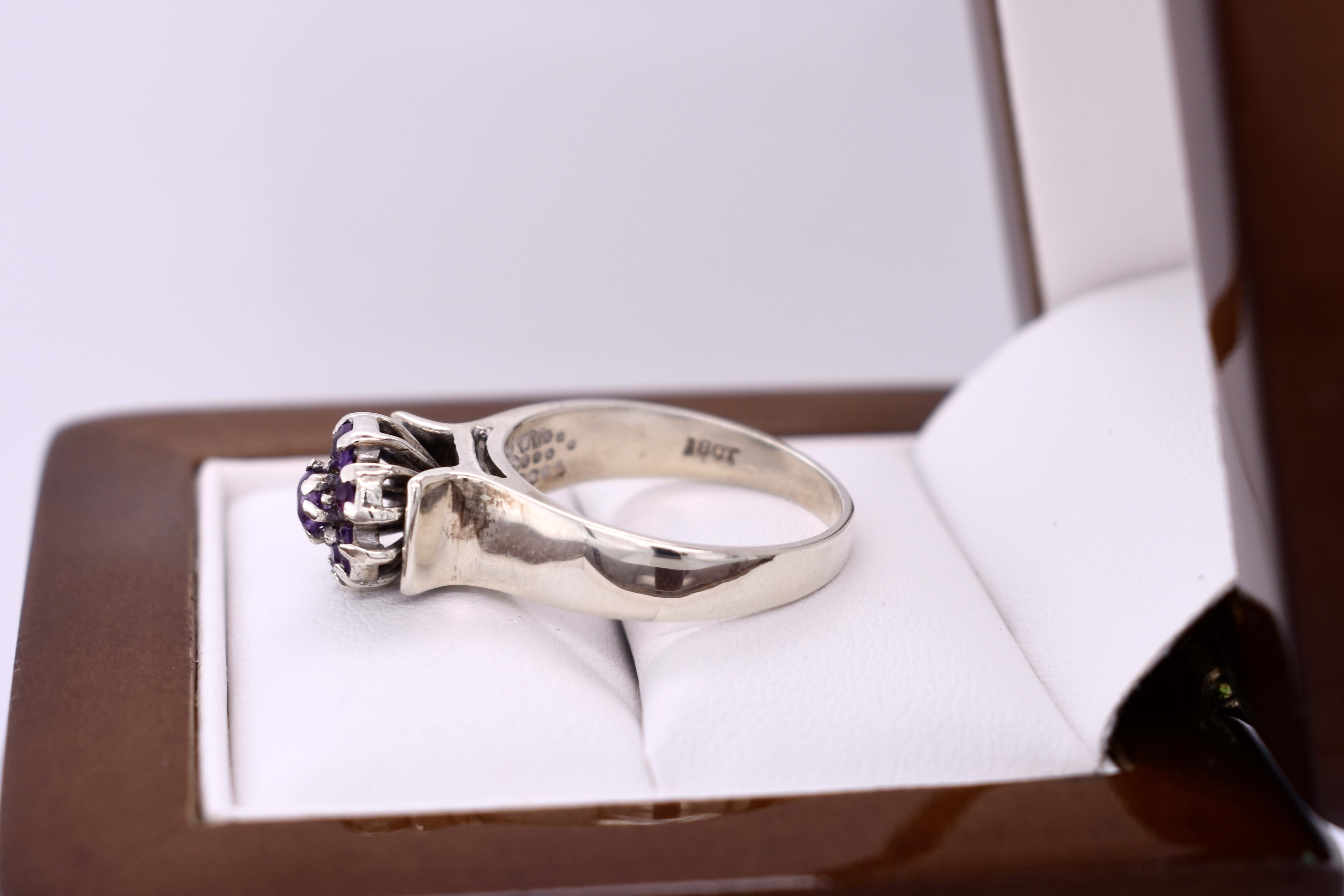 This ring is crafted in 8ct white gold and has a wide, flat band. It features a vintage amethyst cluster with a wire basket, comprising of seven claw set stones. It is to be noted that there is wear on gemstones and claws and it is sold as is condition. Finger size N. Total ring weight 4.9 grams. Independent valuation supplied.