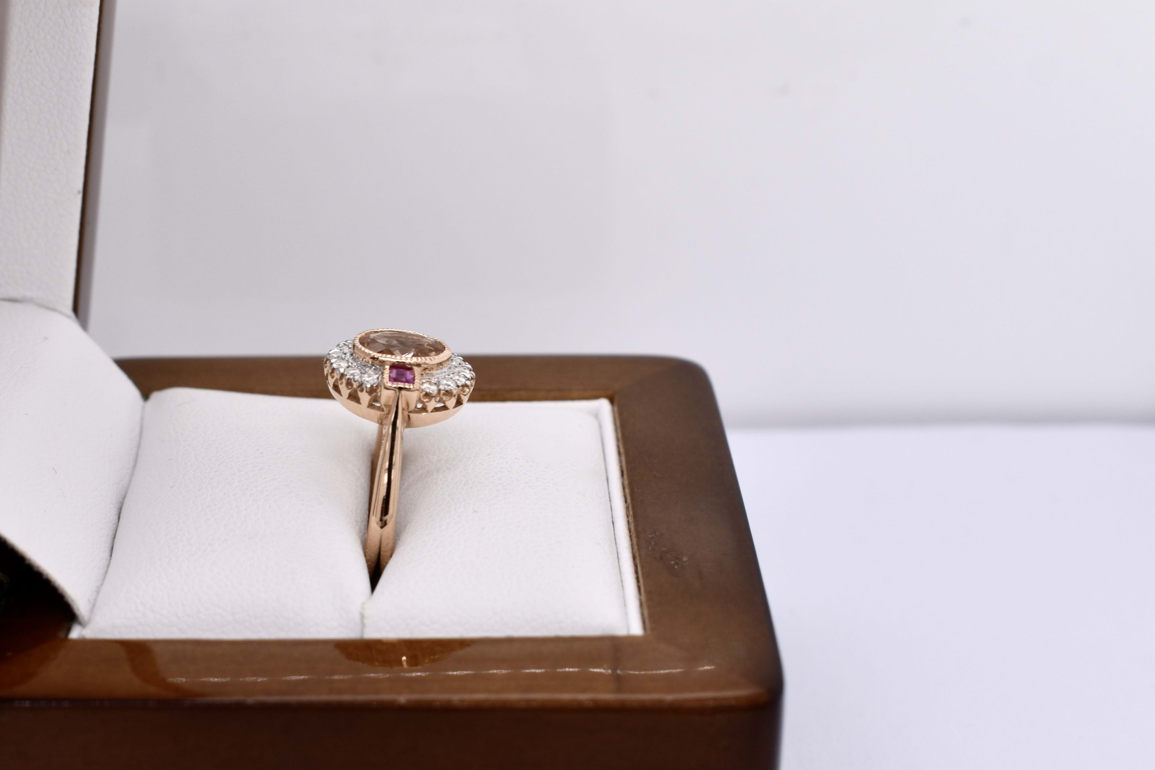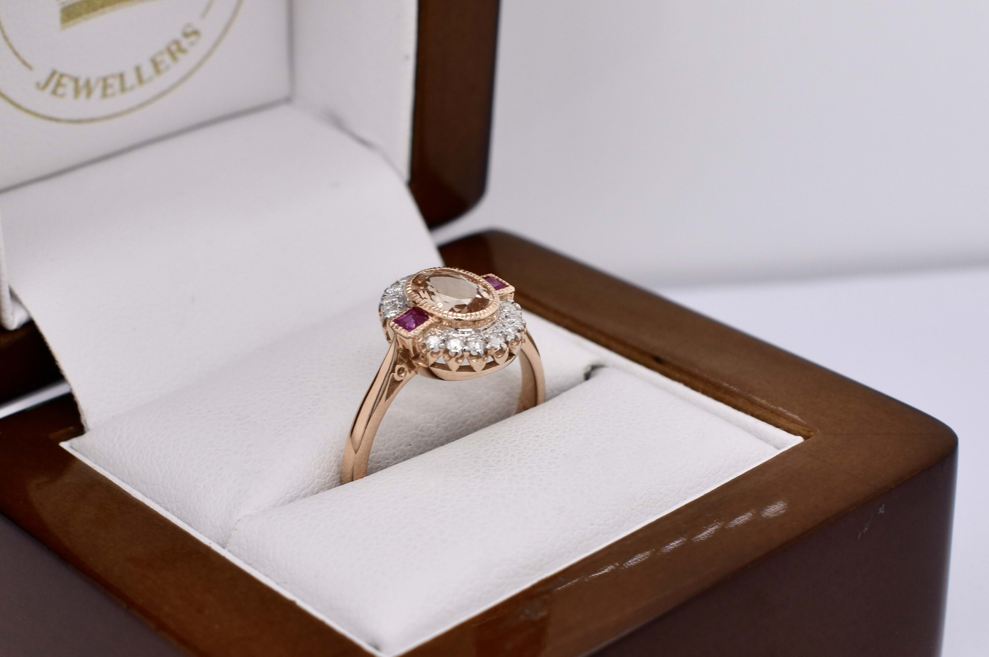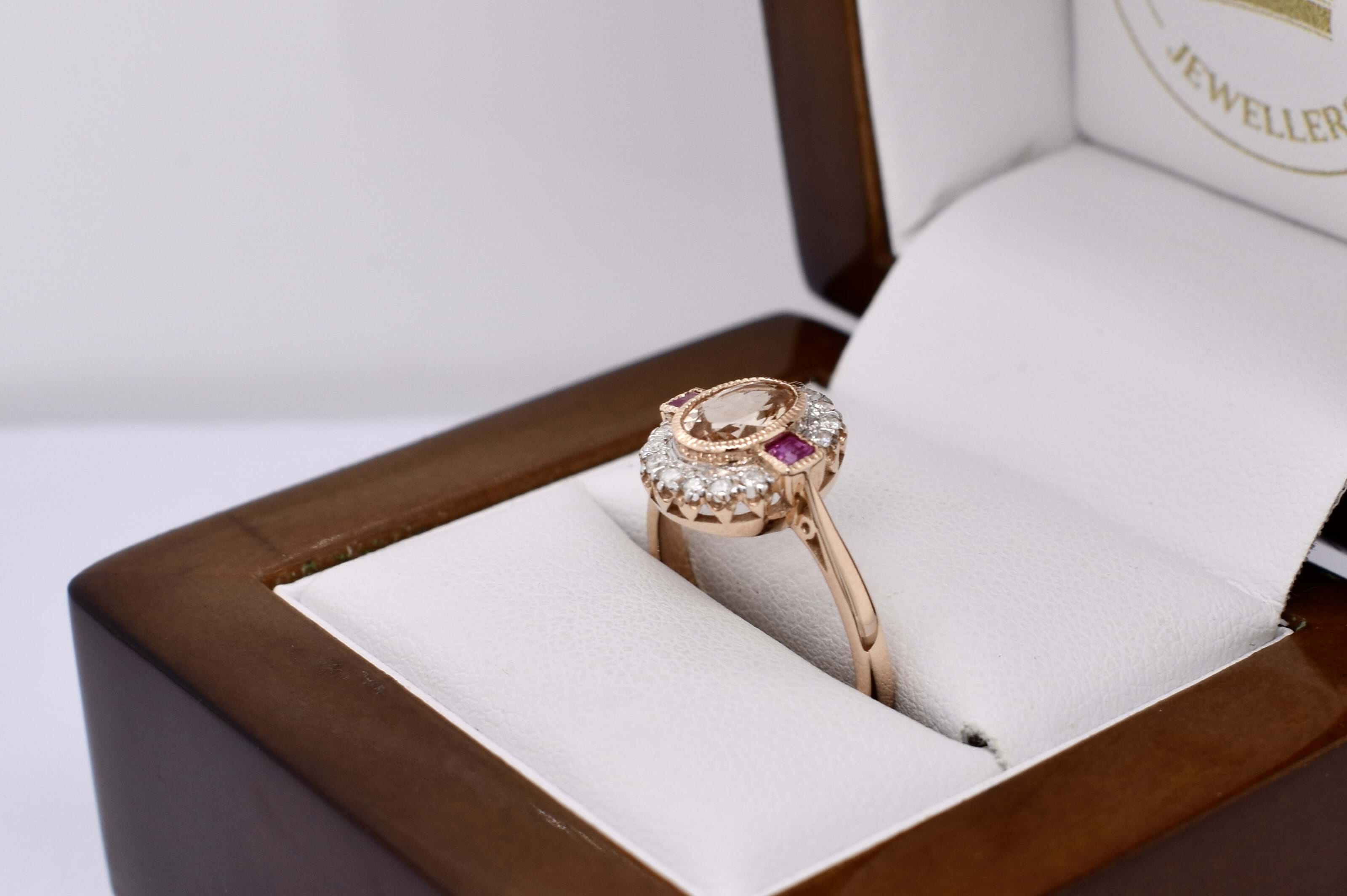 A beautiful and elegant piece, this ring has been crafted in 9ct rose gold and is set with a stunning centre oval 0.70ct orangey pink morganite, measuring 7.20x5.10x3.17mm, mill edge bezel set with one square 2.15mm ruby on each side, totalling 0.14ct. The ring is then surrounded by fourteen round brilliant cut 1.40mm diamonds with a total weight of 0.14ct H P2-3. Completed with pointed swept up shoulders on a 1/4 round 2.35mm band. Finger size N+. Independent Valuation Supplied.