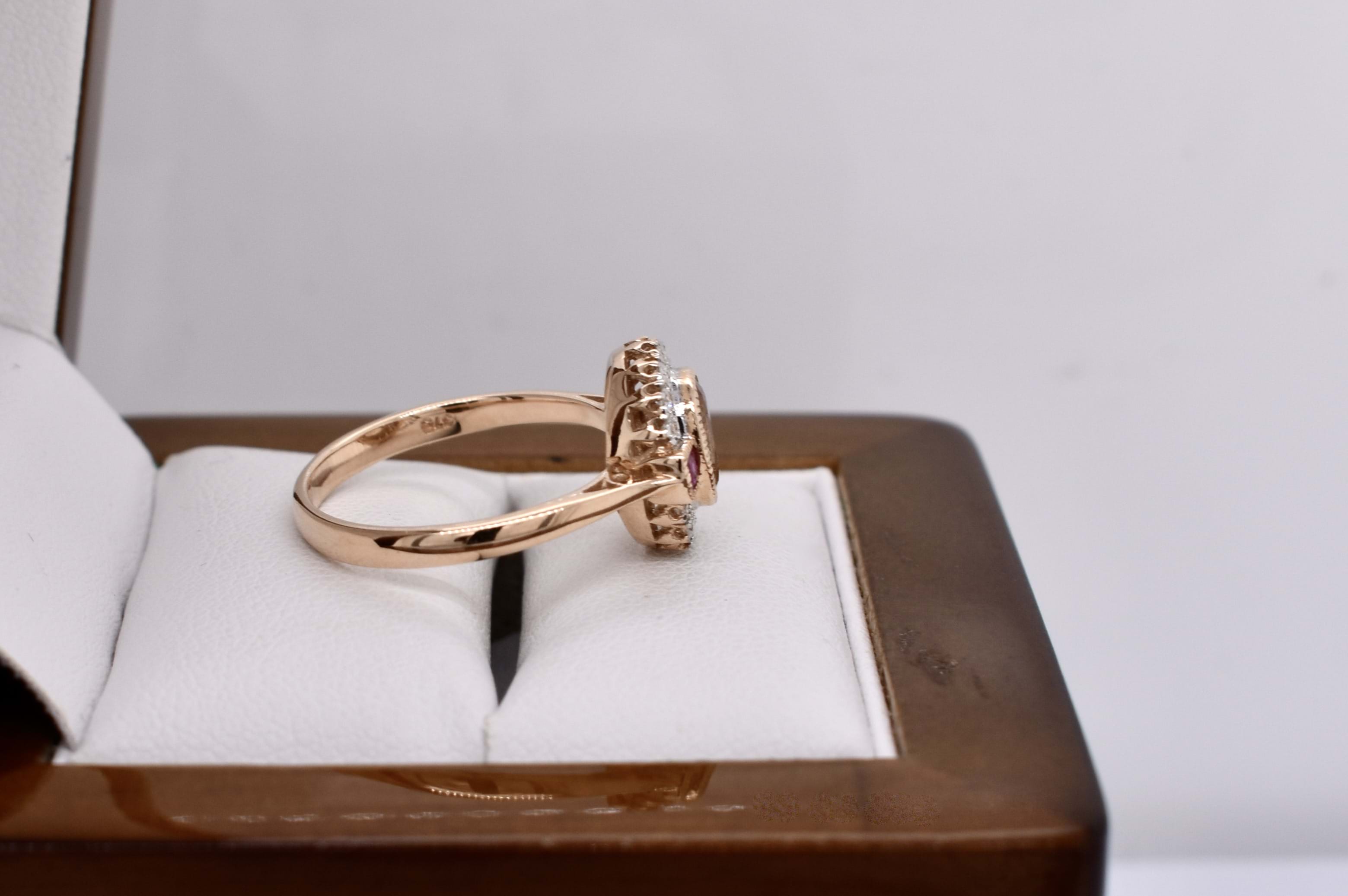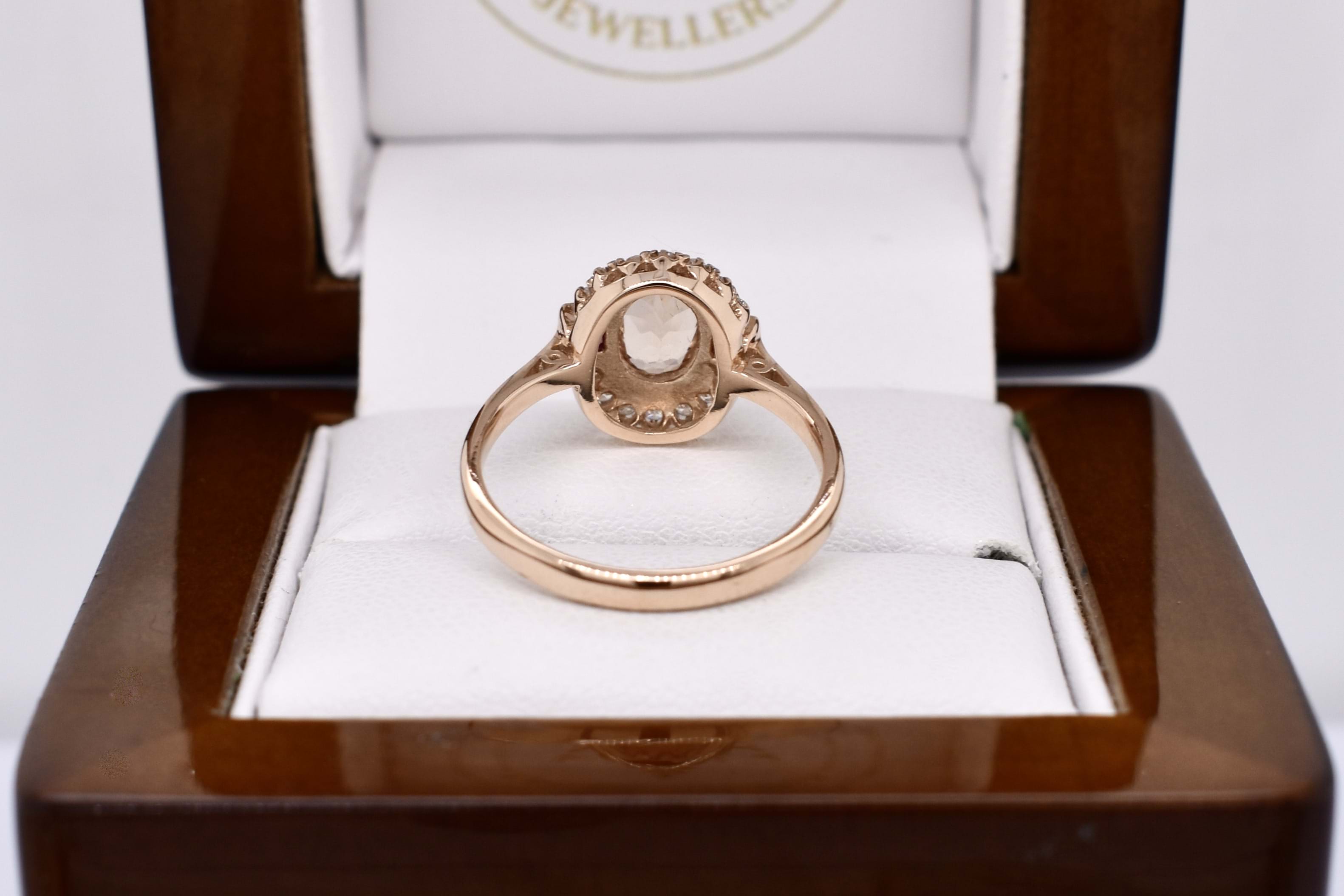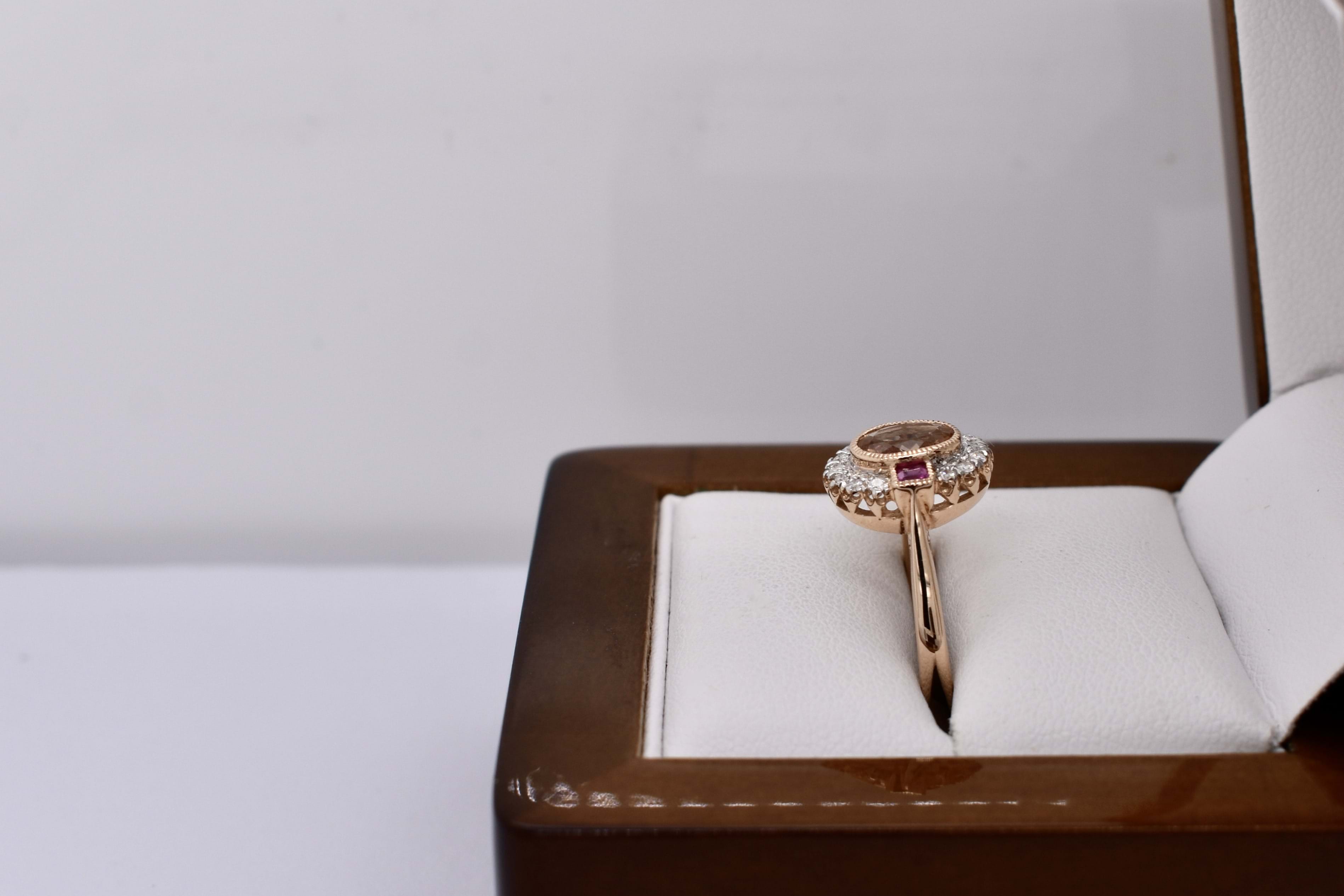 A beautiful and elegant piece, this ring has been crafted in 9ct rose gold and is set with a stunning centre oval 0.70ct orangey pink morganite, measuring 7.20x5.10x3.17mm, mill edge bezel set with one square 2.15mm ruby on each side, totalling 0.14ct. The ring is then surrounded by fourteen round brilliant cut 1.40mm diamonds with a total weight of 0.14ct H P2-3. Completed with pointed swept up shoulders on a 1/4 round 2.35mm band. Finger size N+. Independent Valuation Supplied.