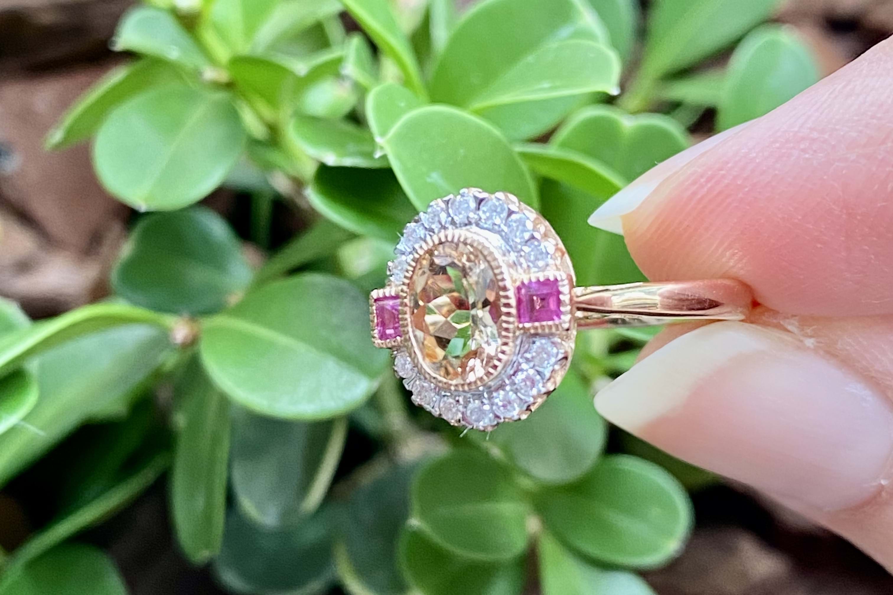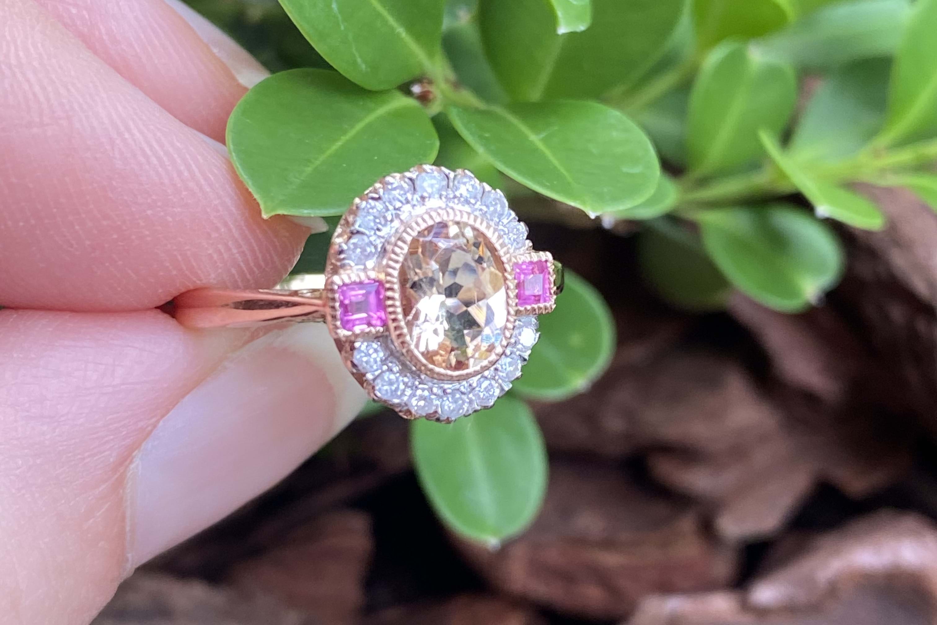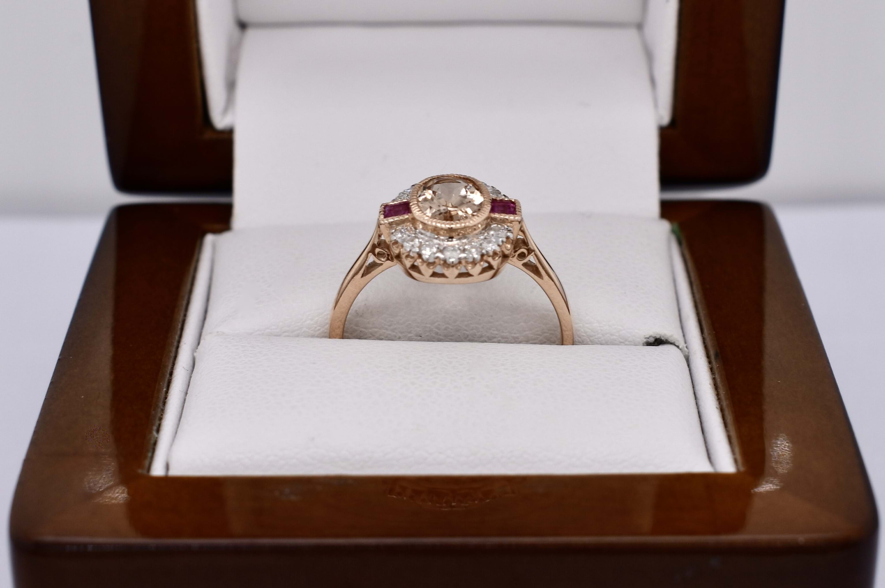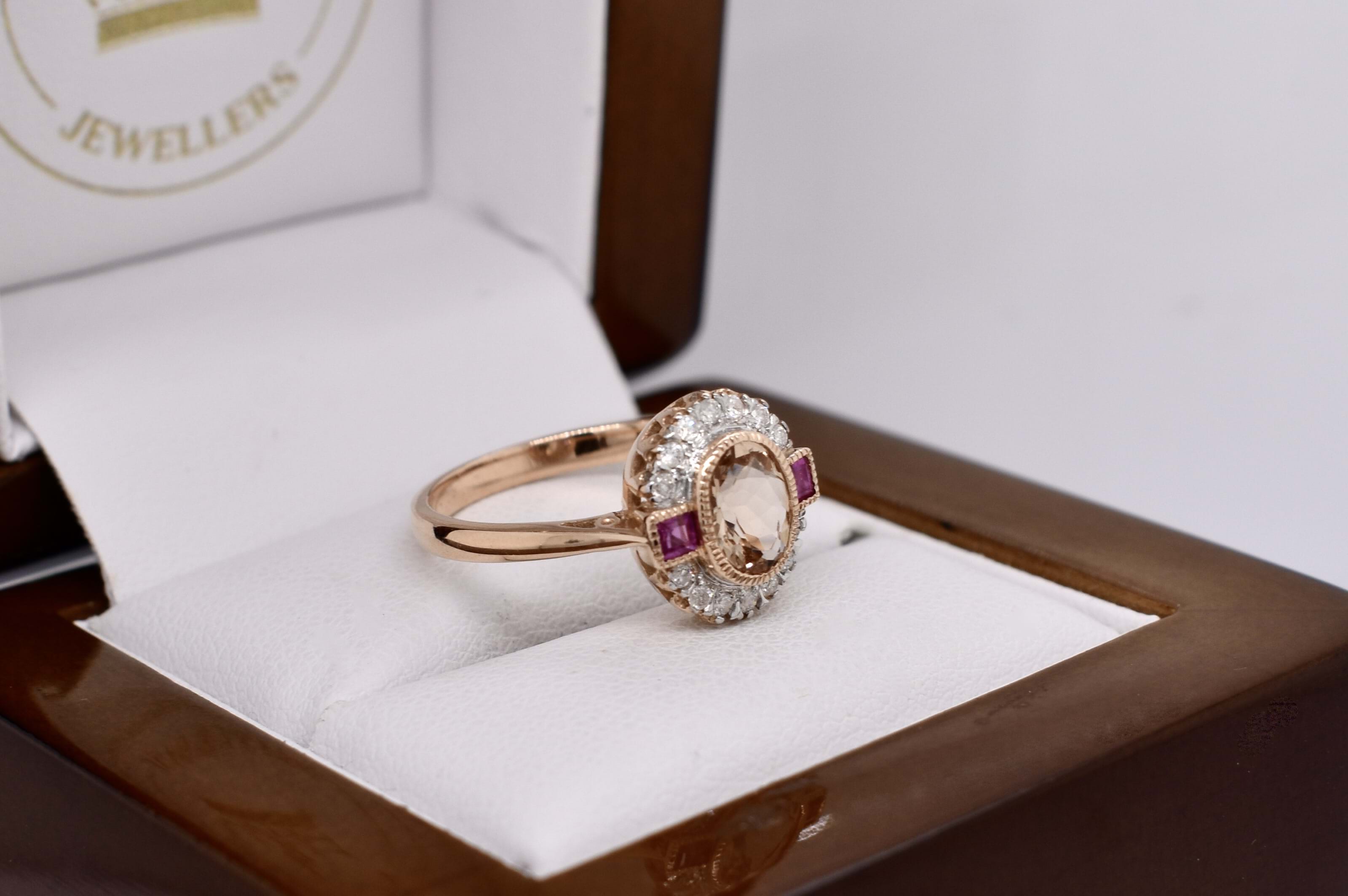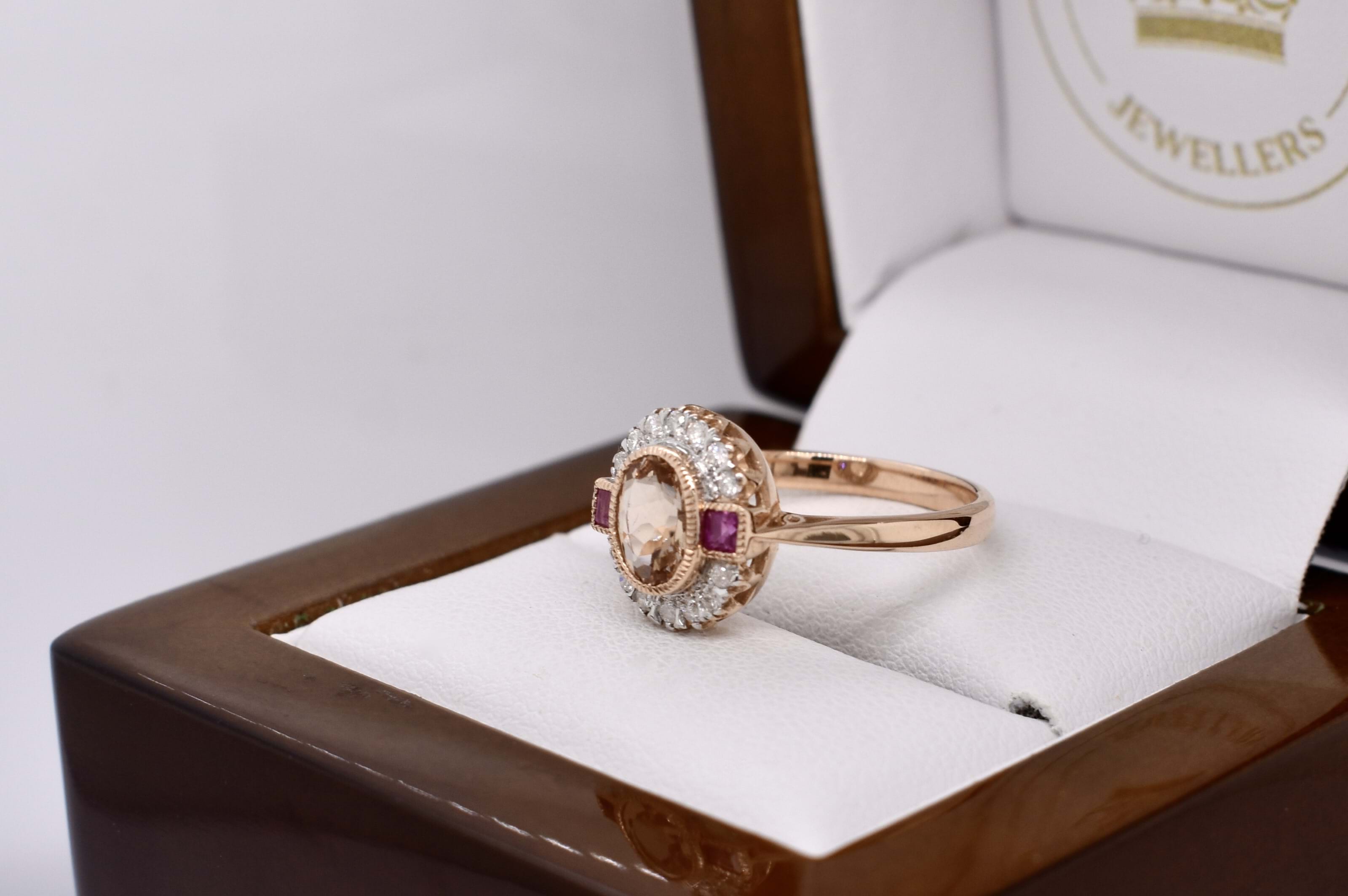 SOLD 9ct Rose Gold 0.70ct Morganite, 0.14ct Ruby & 0.14ct Diamond Ring (N+)