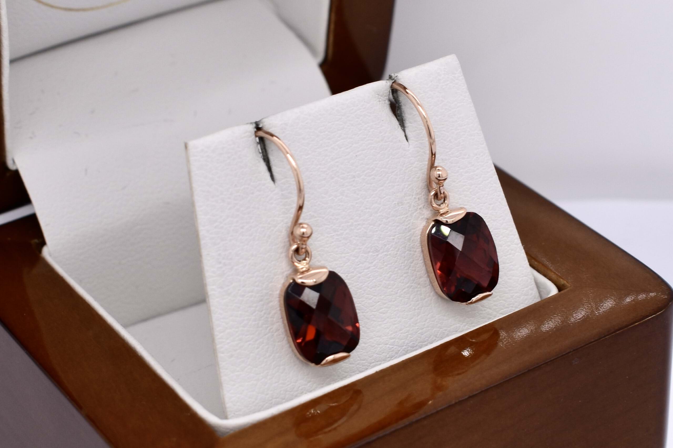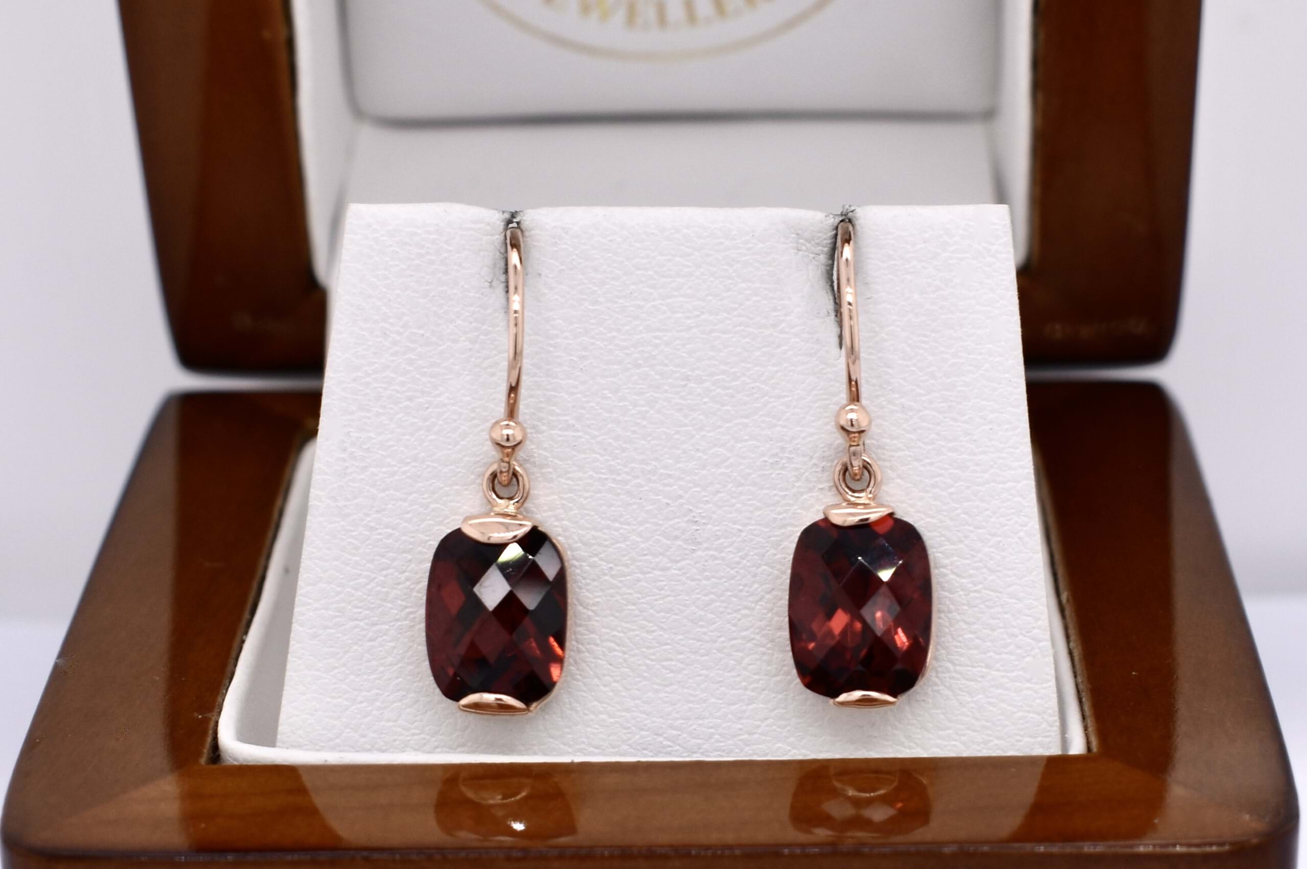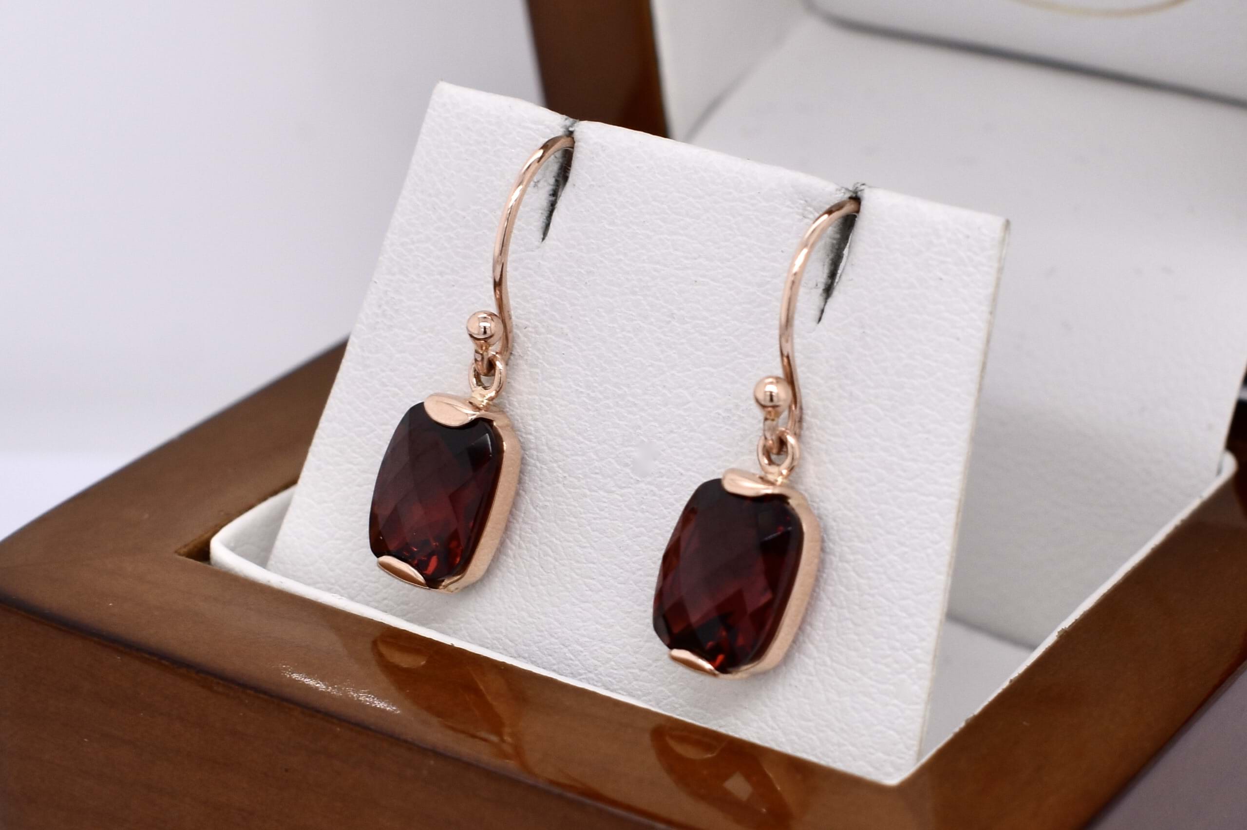 Crafted in 9ct rose gold, these stunning cushion shaped garnet drops measure 10x4mm and are semi bezel set with a checkerboard finish. Completed with shepherd hook fittings