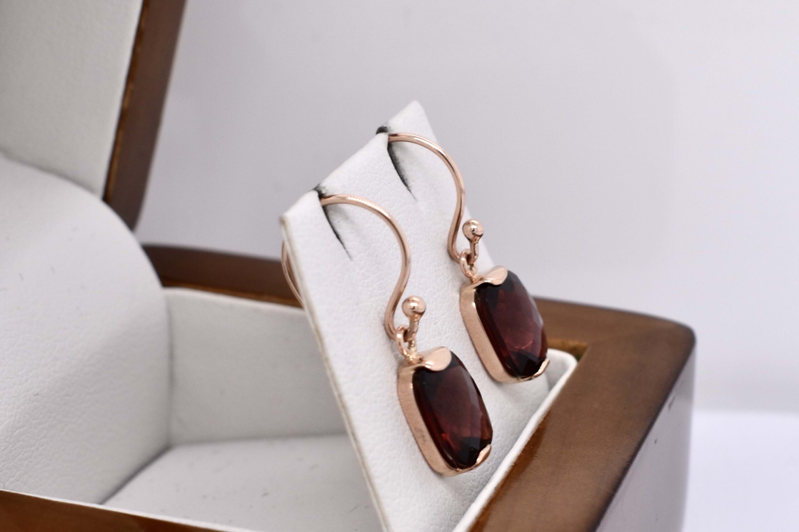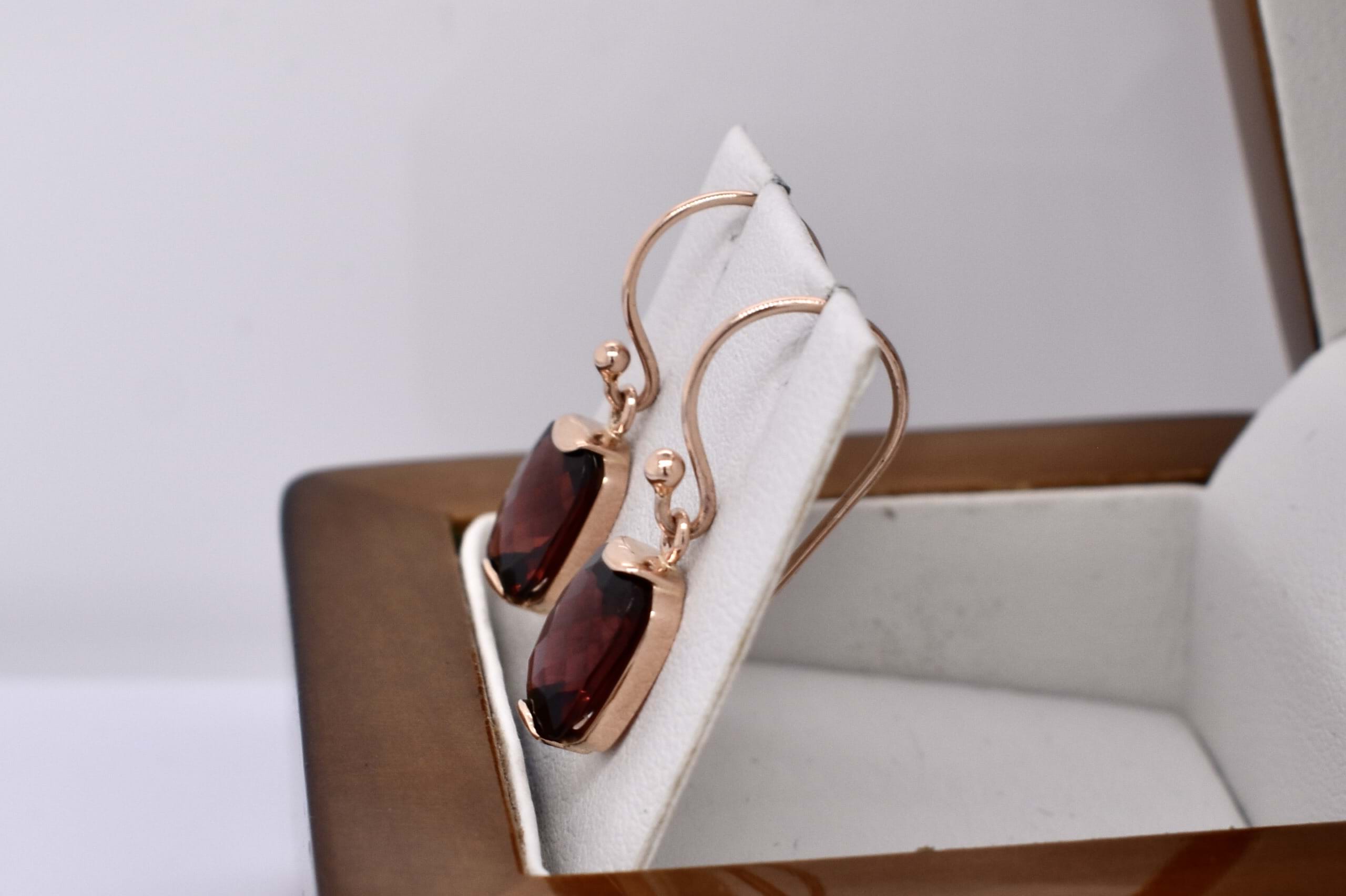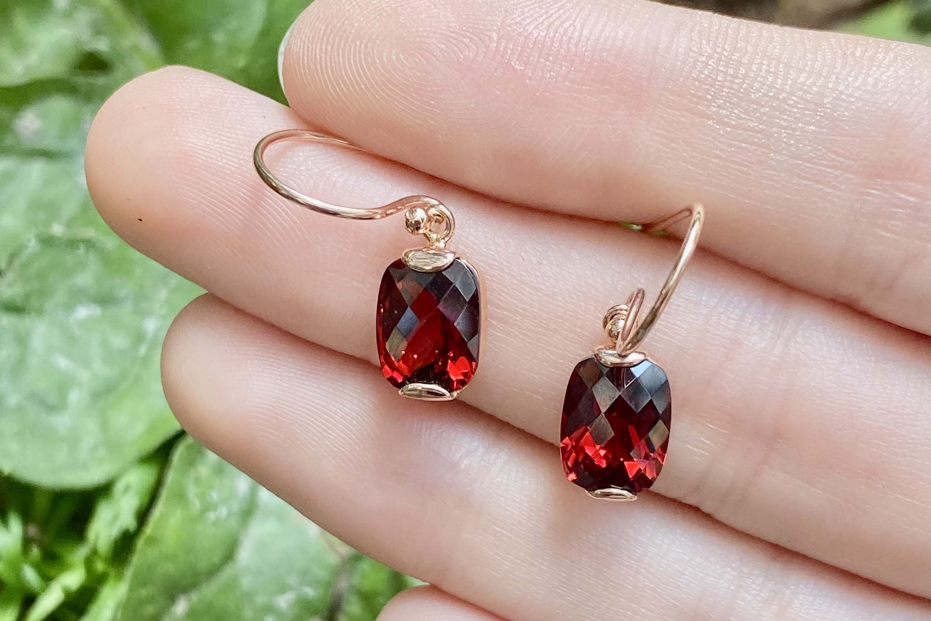 Crafted in 9ct rose gold, these stunning cushion shaped garnet drops measure 10x4mm and are semi bezel set with a checkerboard finish. Completed with shepherd hook fittings