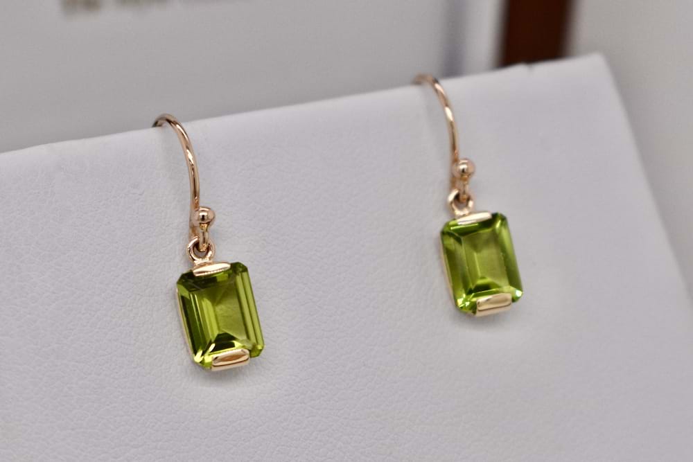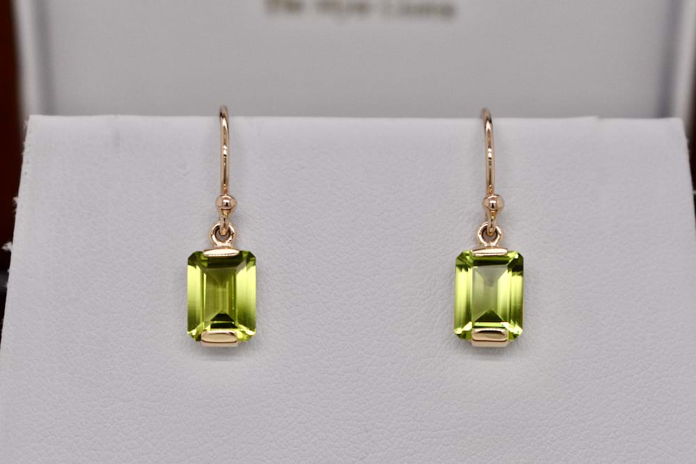 Handmade 9ct yellow gold semi-bezel set drop earrings with shepherd hook fittings featuring emerald cut peridots measuring 9x6mm