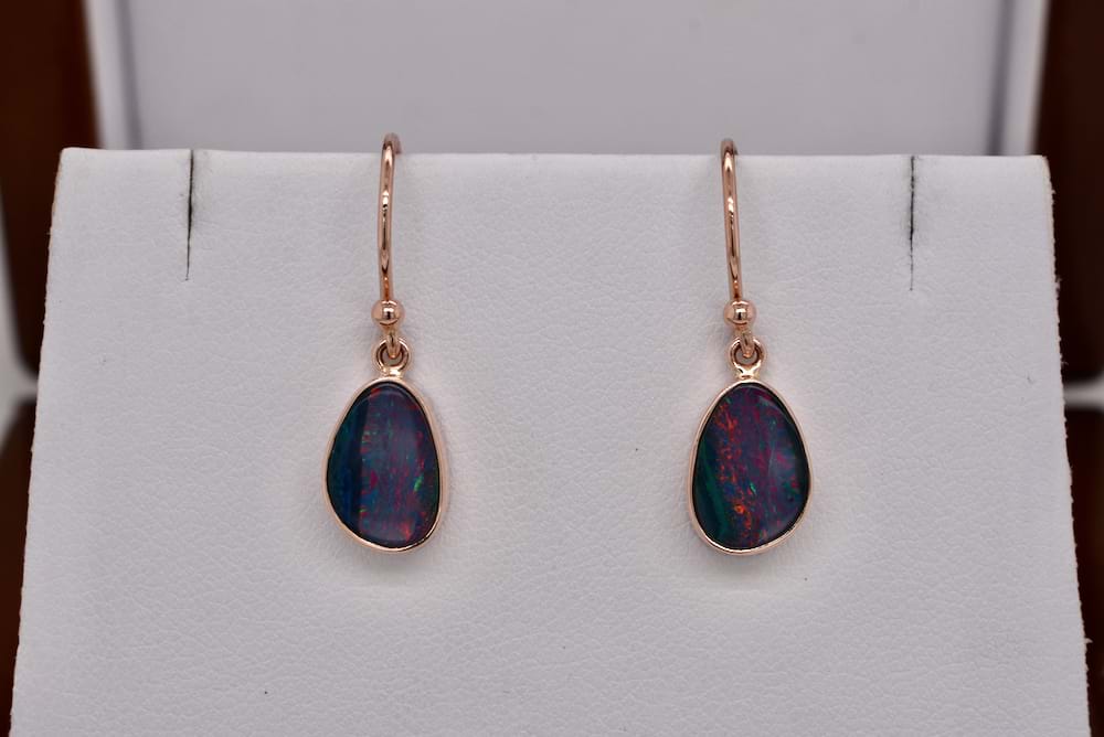 9ct rose gold handmade bezel set shepard hook drop earrings set with 9x8mm freehorm teardrop black opal doublets. The doublets consist of Coober Pedy opal crystal on a boulder opal and display orange, green and muted red flashes