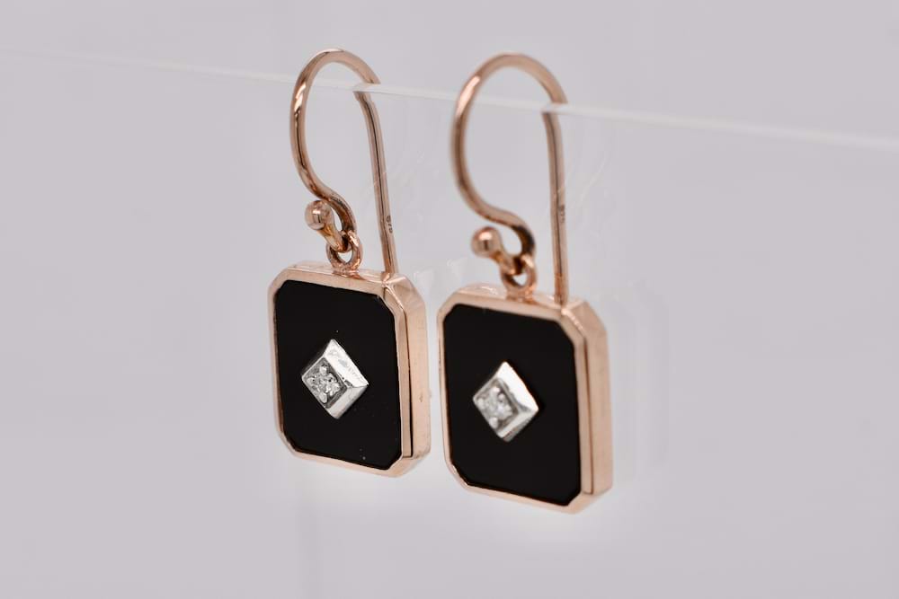 SOLD 9ct Rose Gold Onyx & Diamond Emerald Cut Earrings