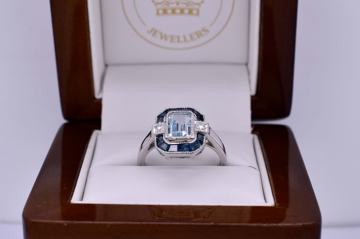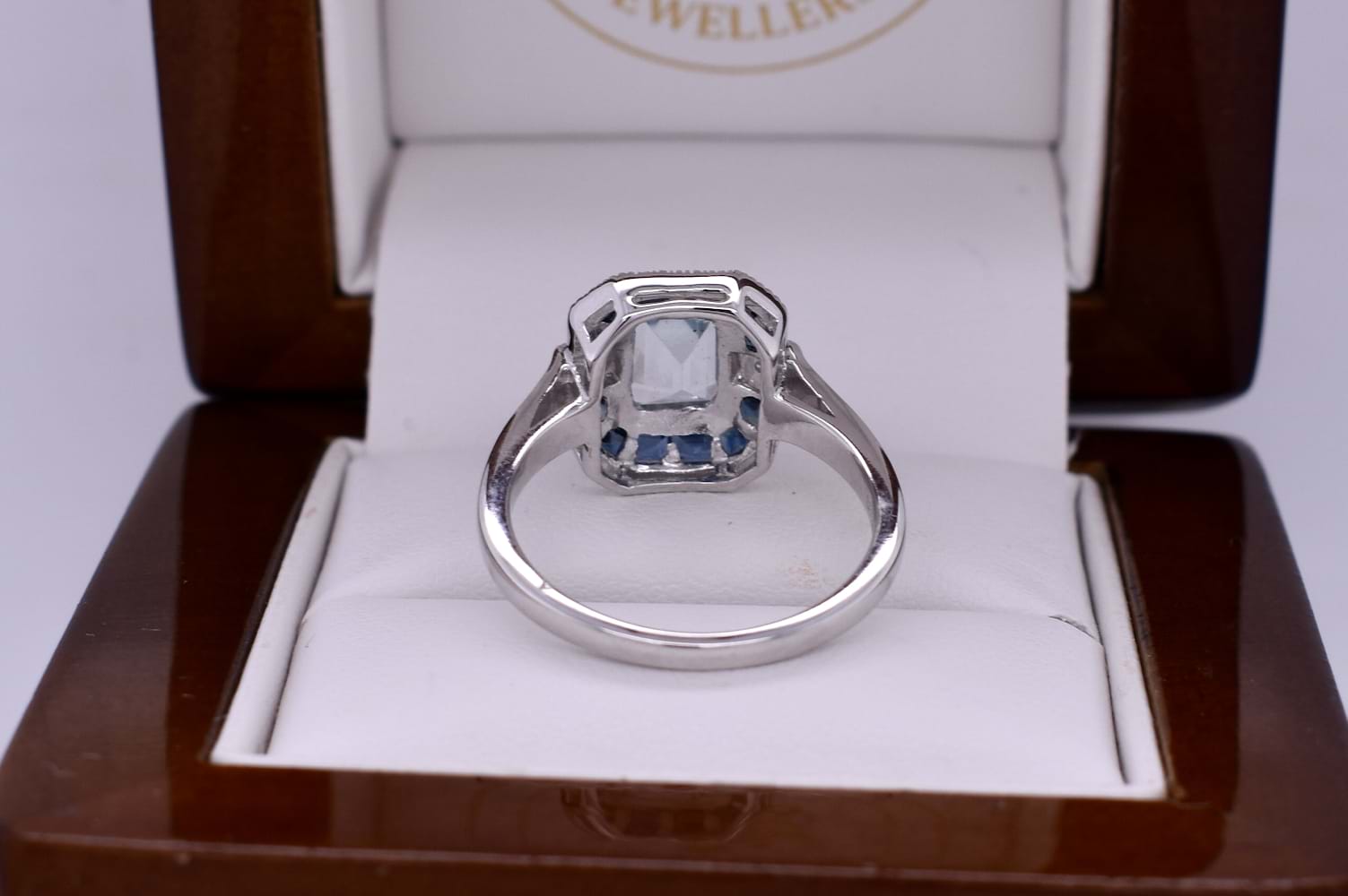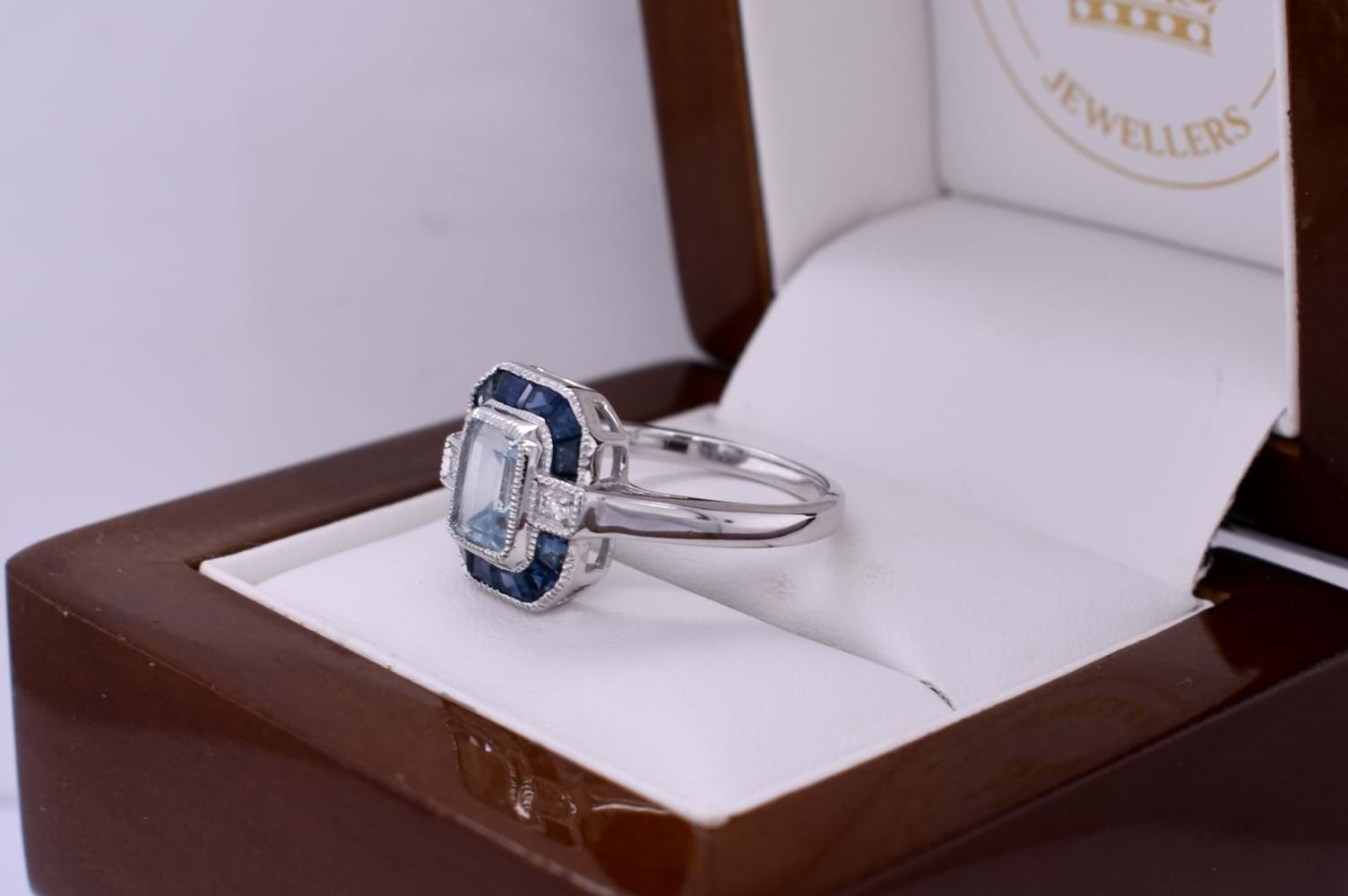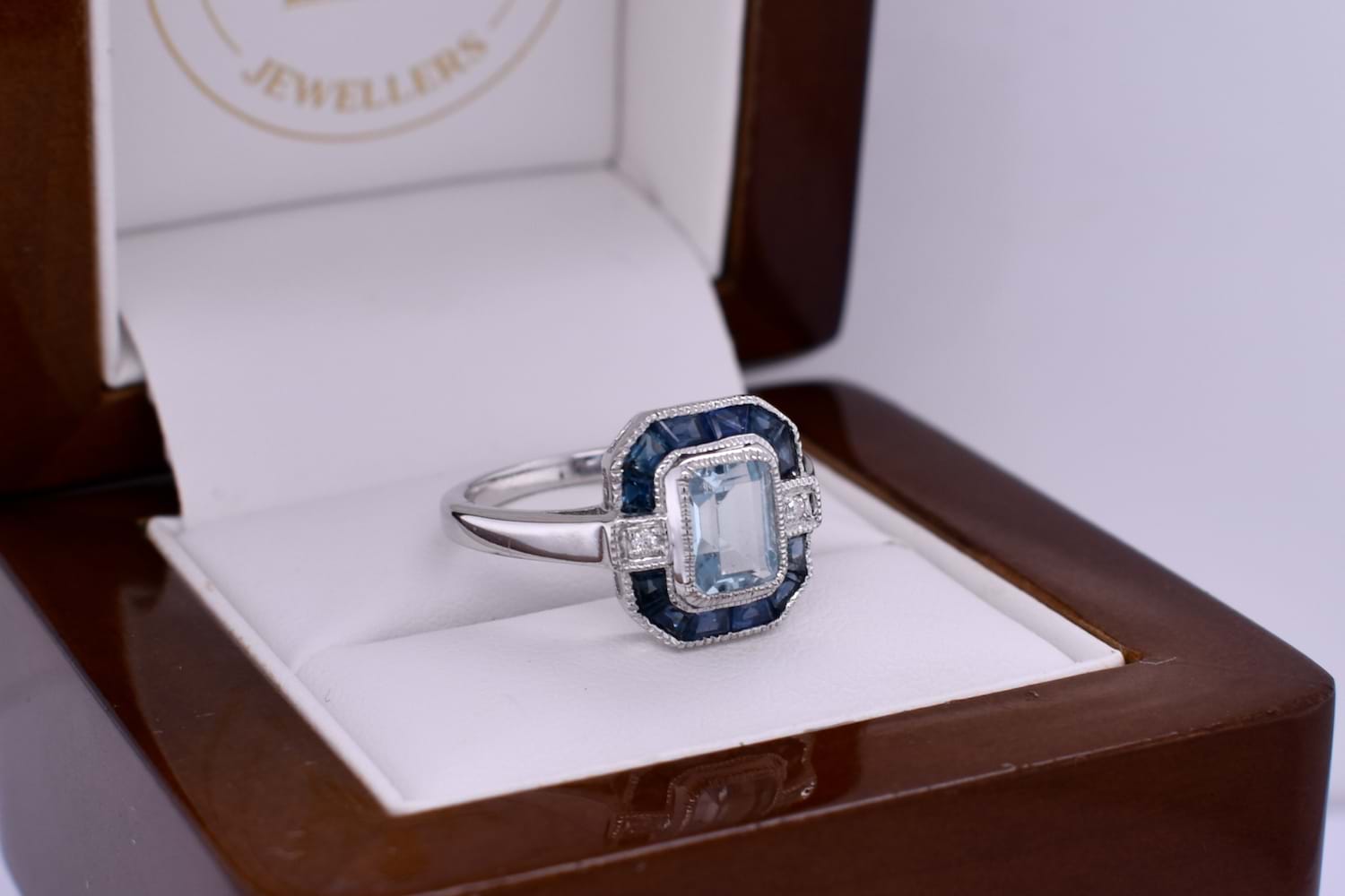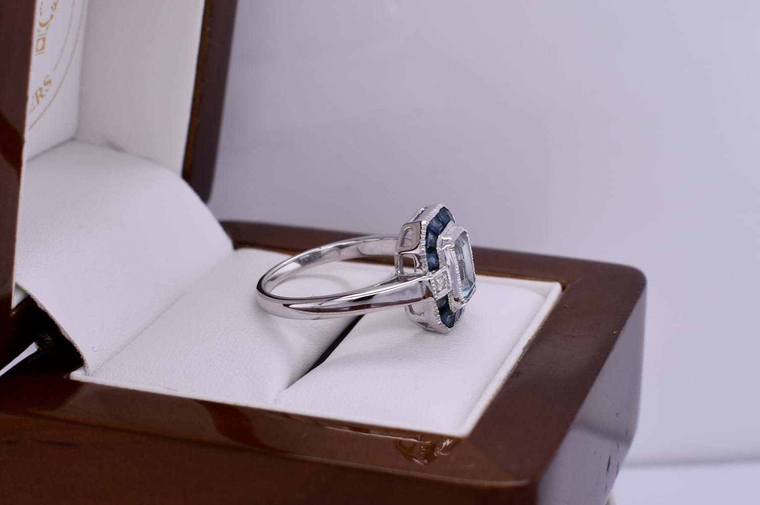 This ring is crafted in 9ct white gold and features a light blue emerald cut topaz weighing approx. 1.15ct. The topaz is bright, eye clean and bezel set, surrounded by a spaced geometric halo that consists of 12 dark blue baguette sapphires. Either side of the topaz sits a 1.50mm diamond, square grain set on the band shoulders. Finished on a plain 1.91mm band. Total diamond weight 0.03ct HSI. Finger size N+. Independent valuation supplied.