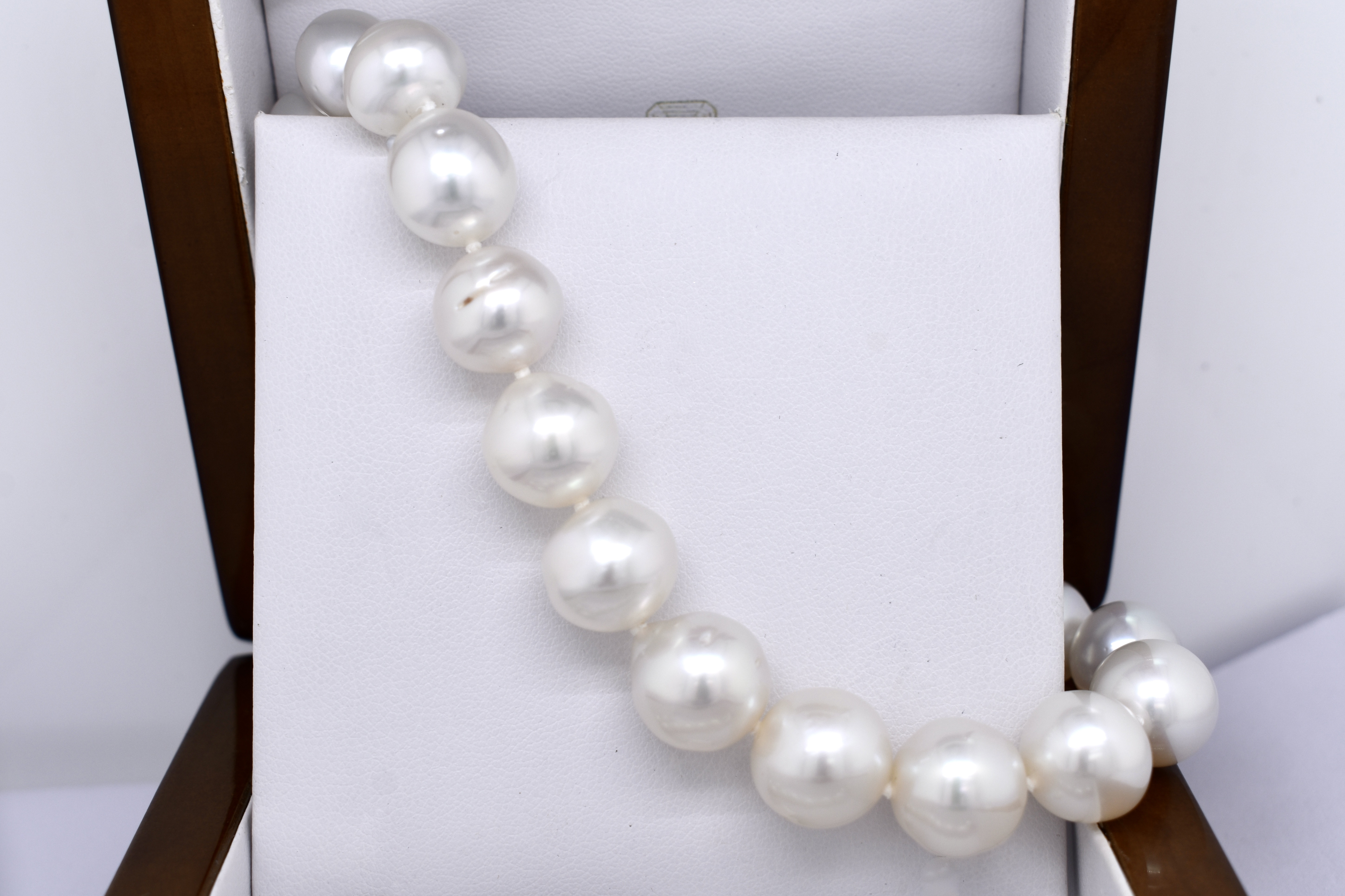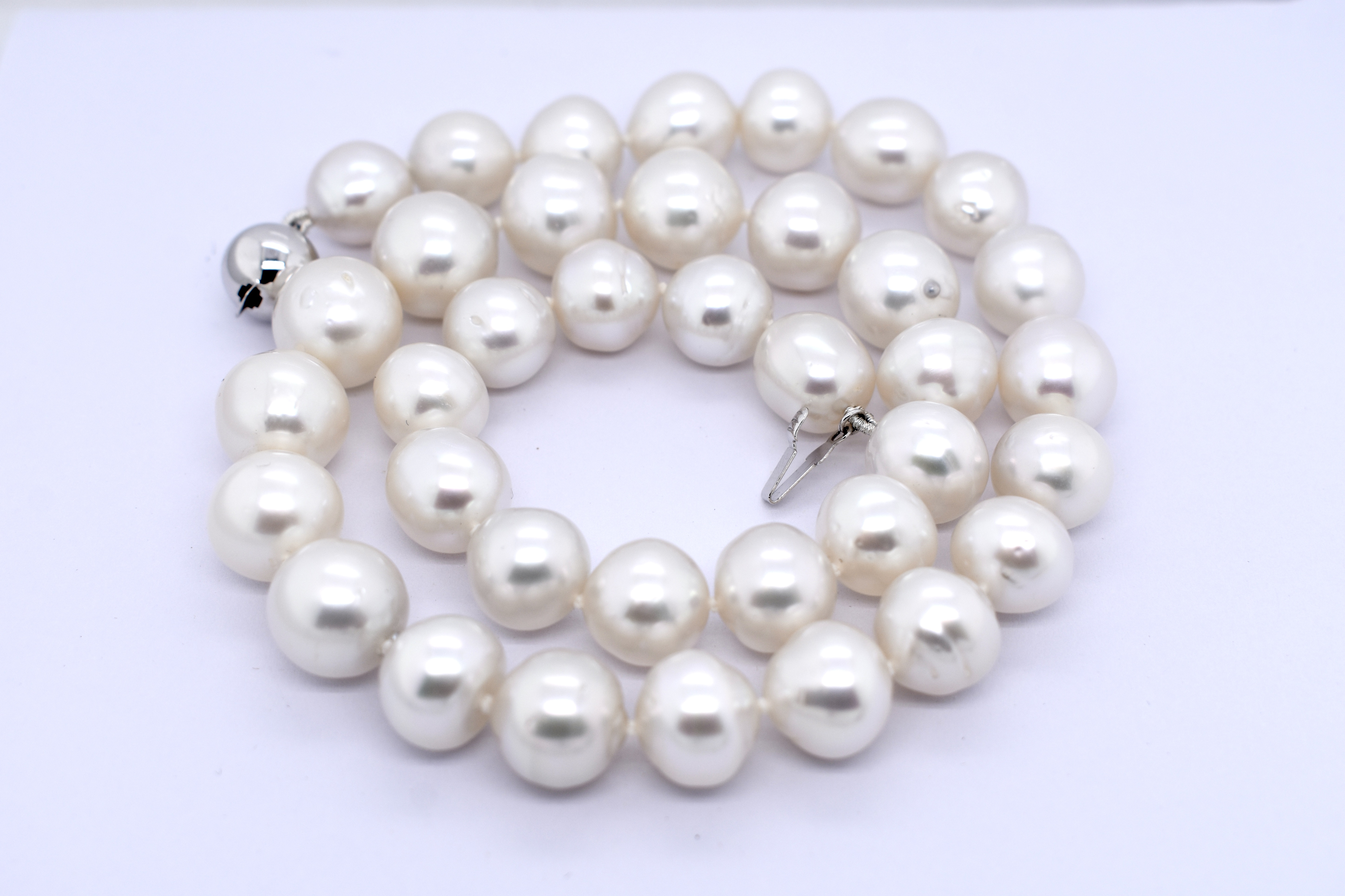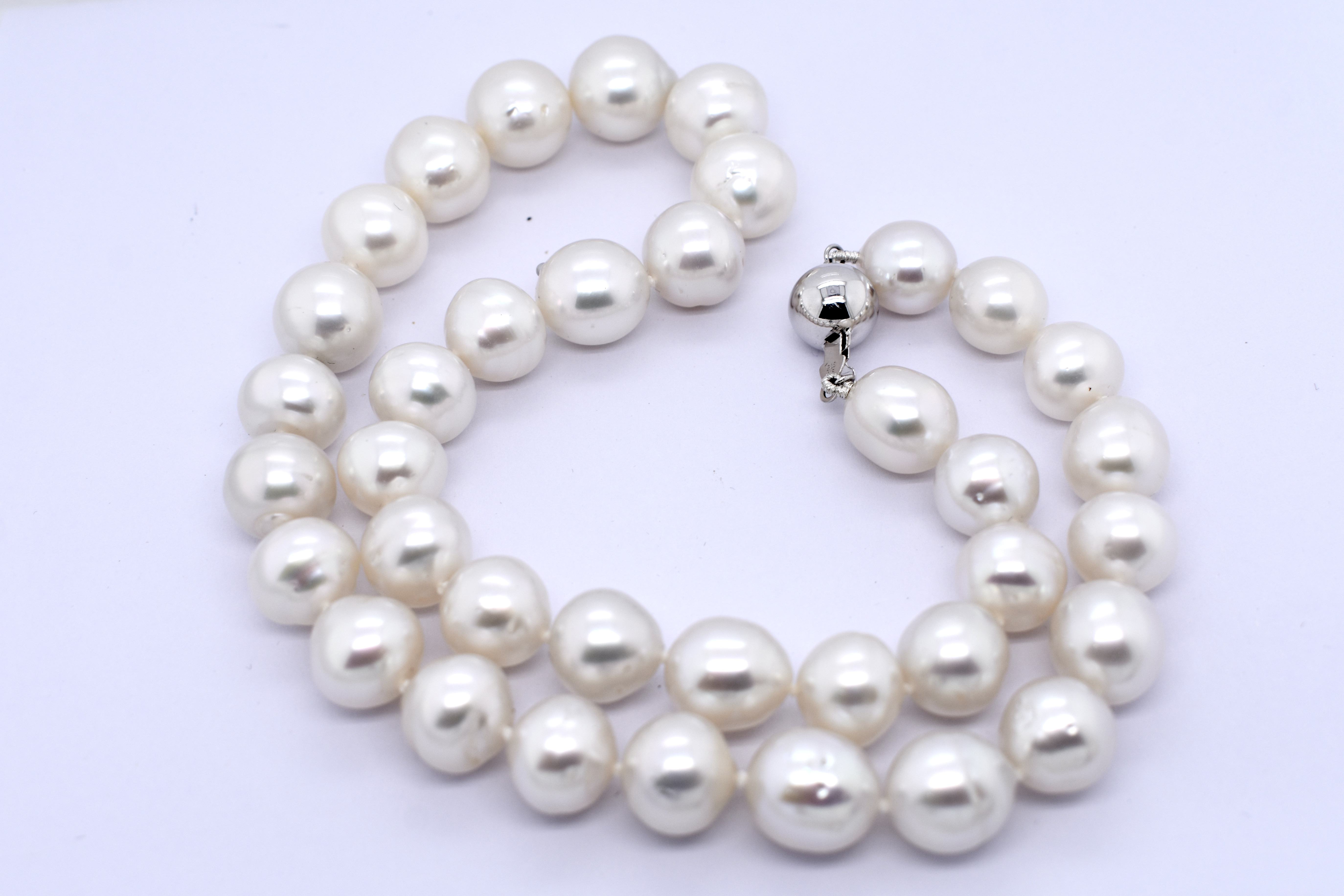 A pretty strand of white South Sea pearls, measuring 10.7-12.9mm semi round. These high lustre pearls have been hand strung on silk and individually knotted with a 9ct white gold ball clasp. Strand length 47cm.