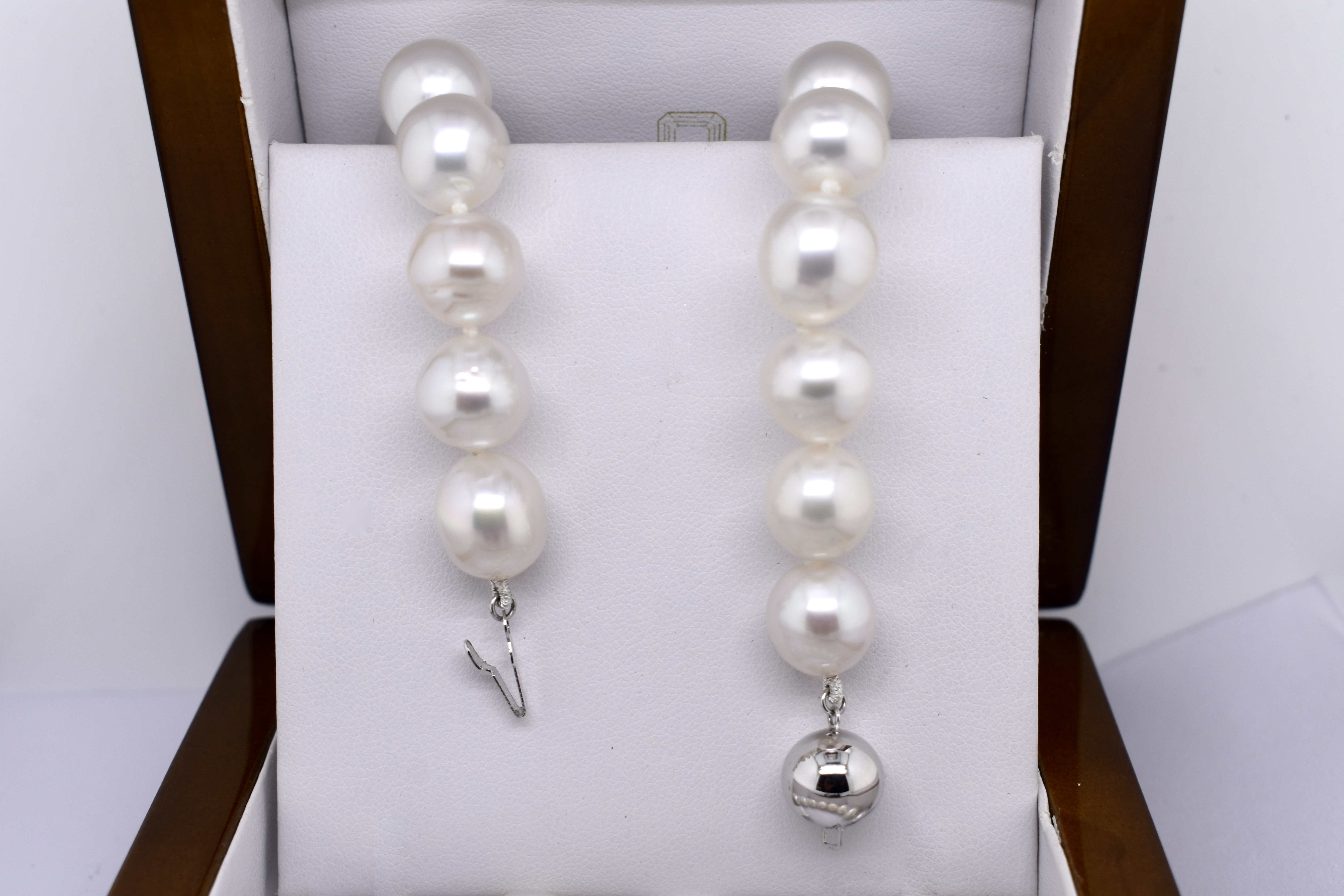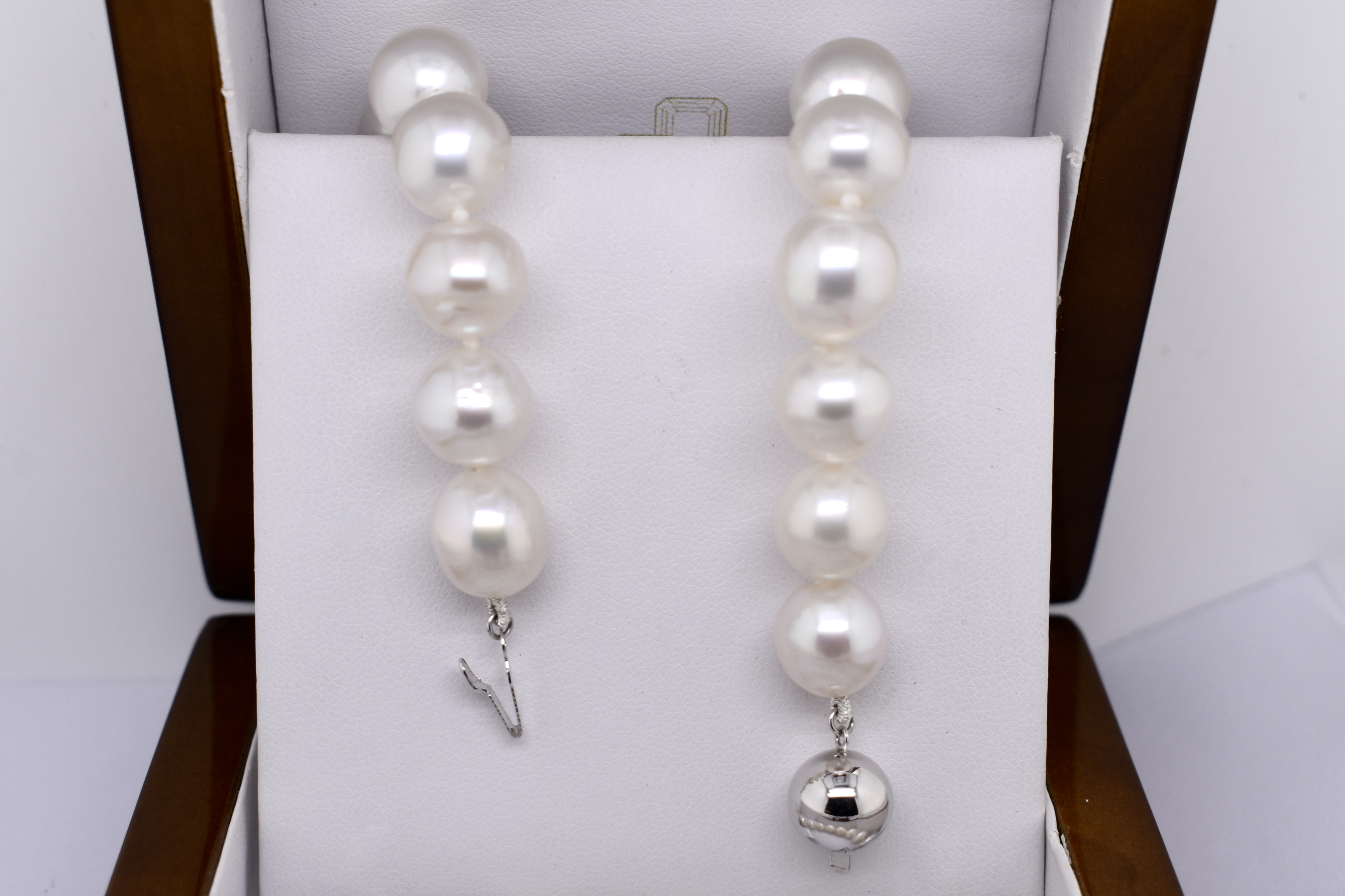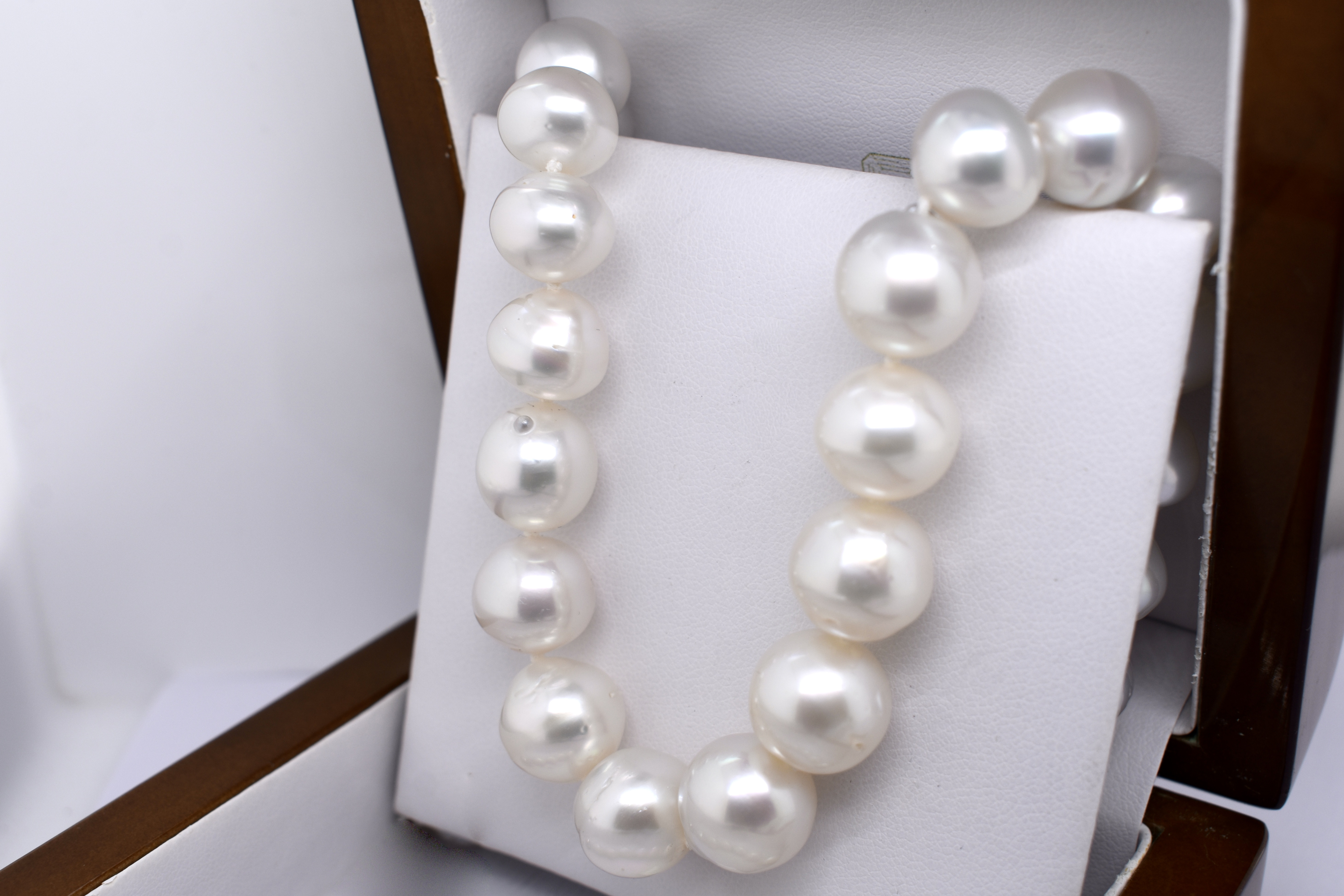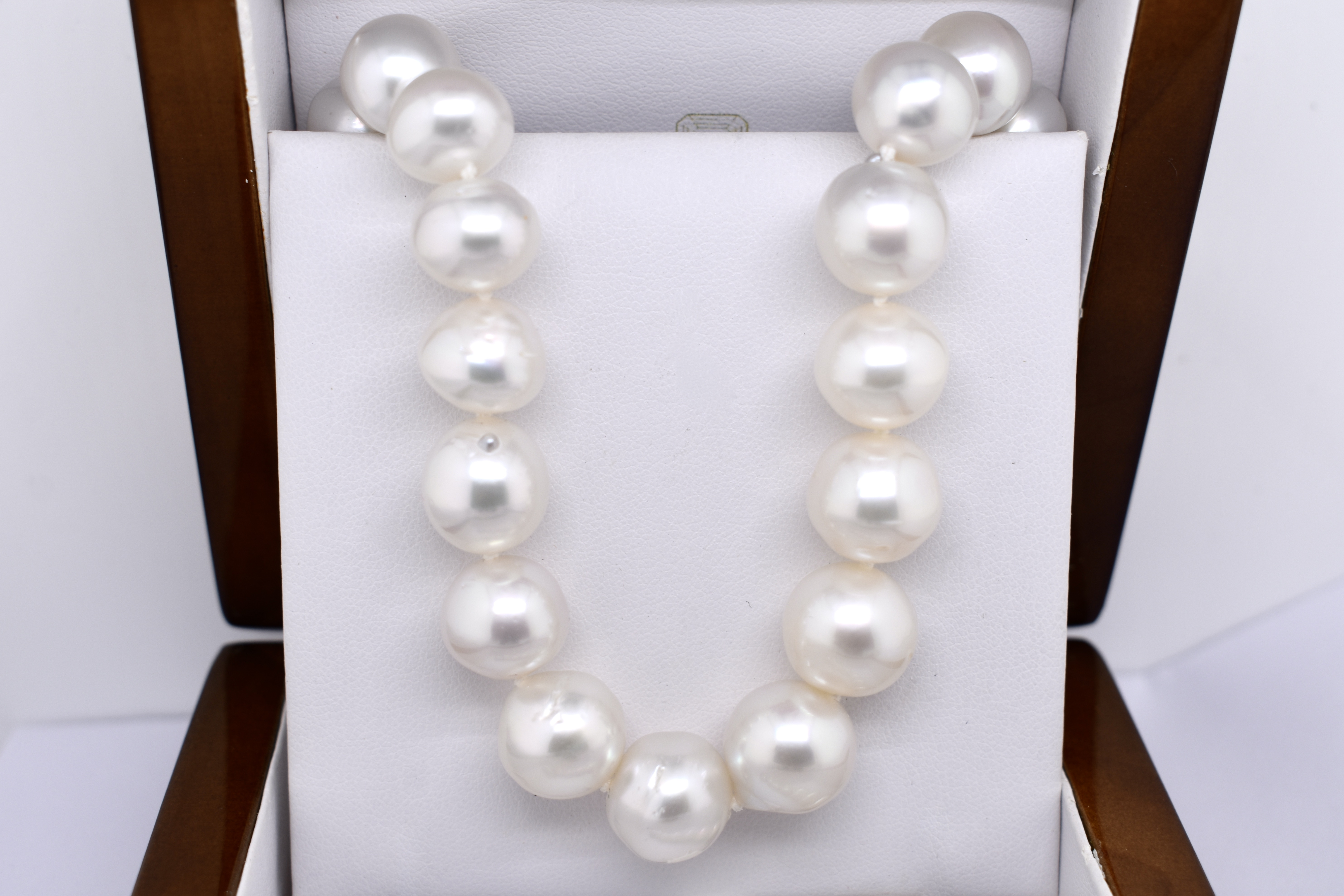 A pretty strand of white South Sea pearls, measuring 10.7-12.9mm semi round. These high lustre pearls have been hand strung on silk and individually knotted with a 9ct white gold ball clasp. Strand length 47cm.