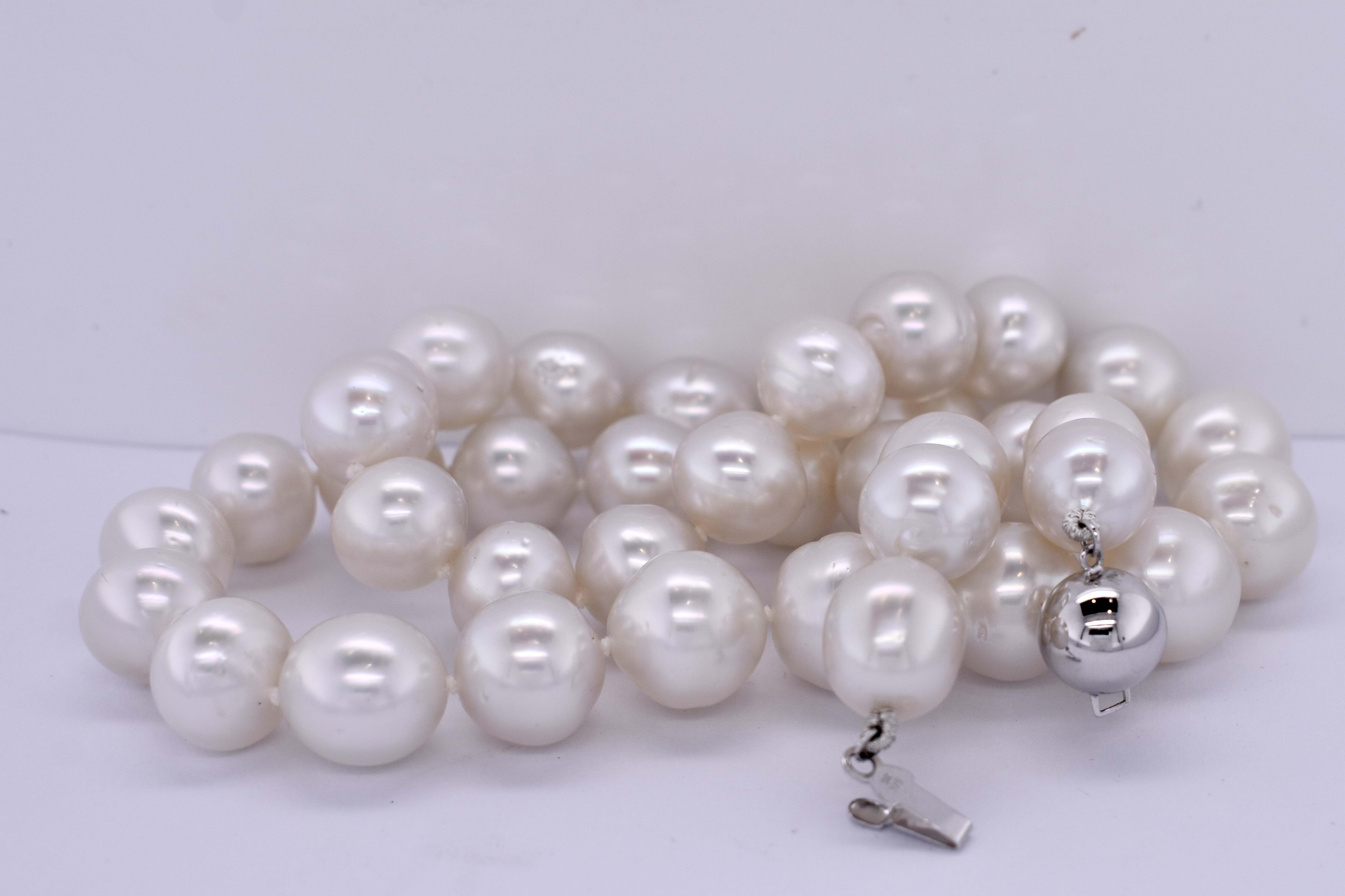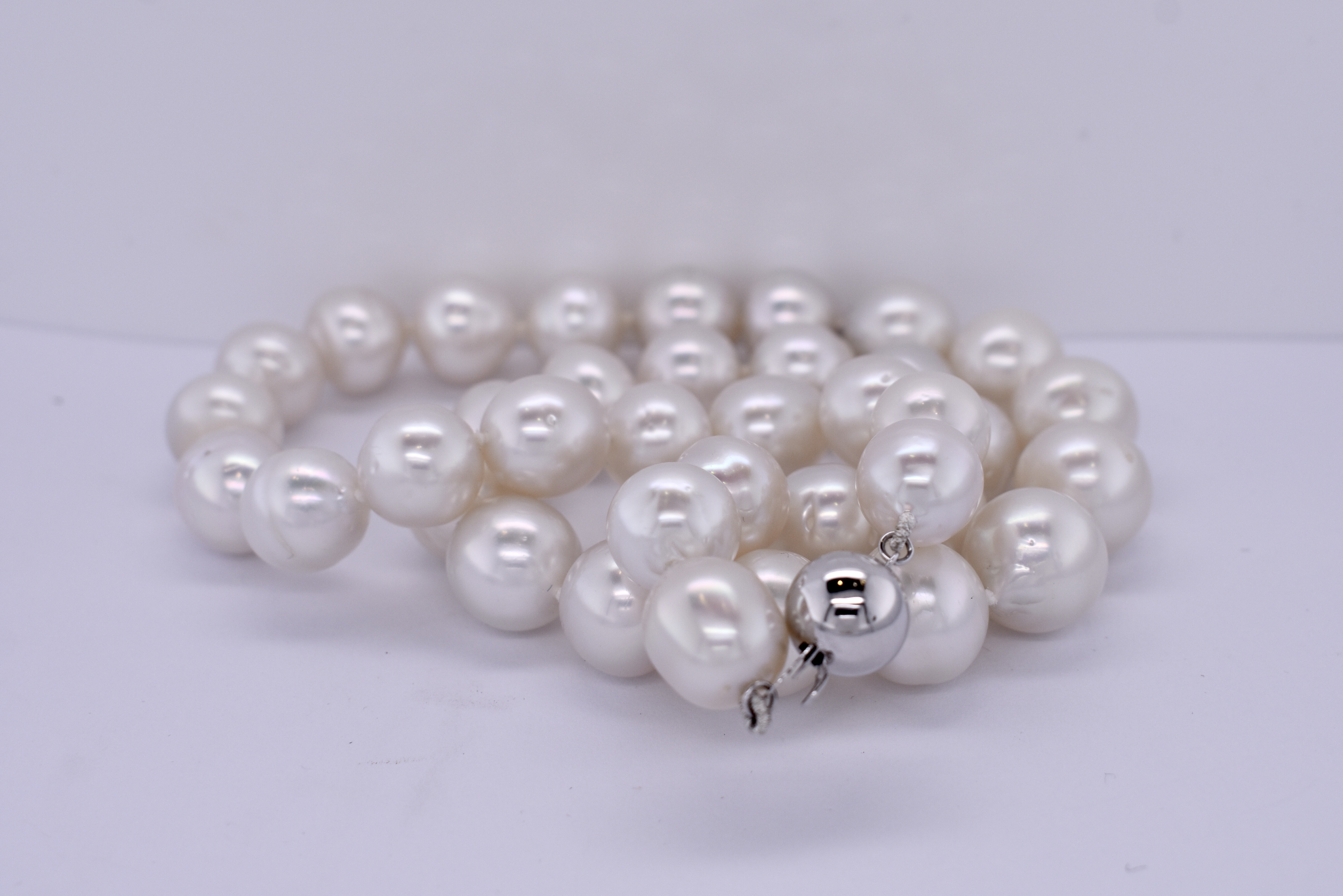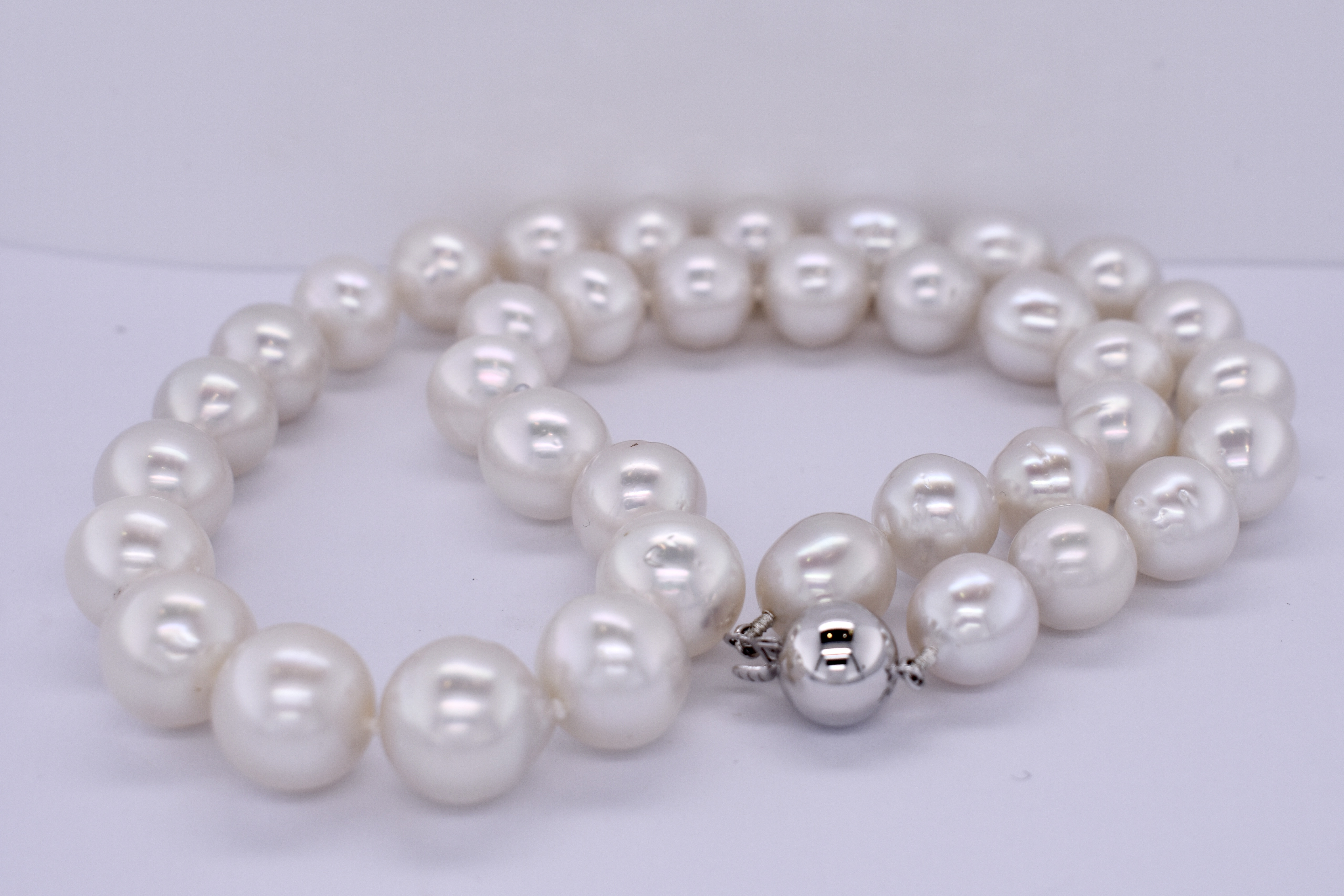 Stunning strand of 10.8-12.7mm south sea pearls measuring 46cm, with 9ct white gold loop ends and ball clasp.