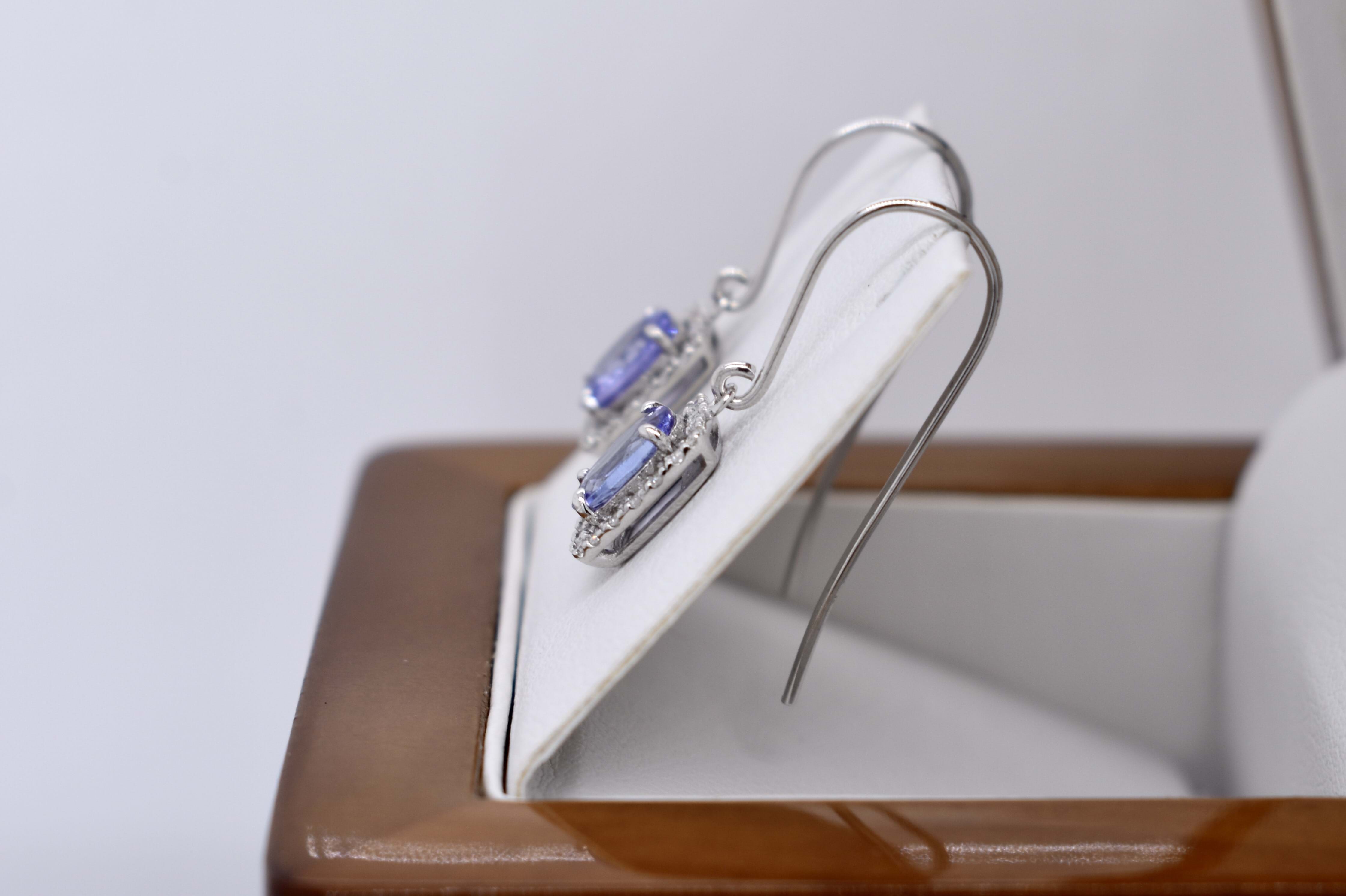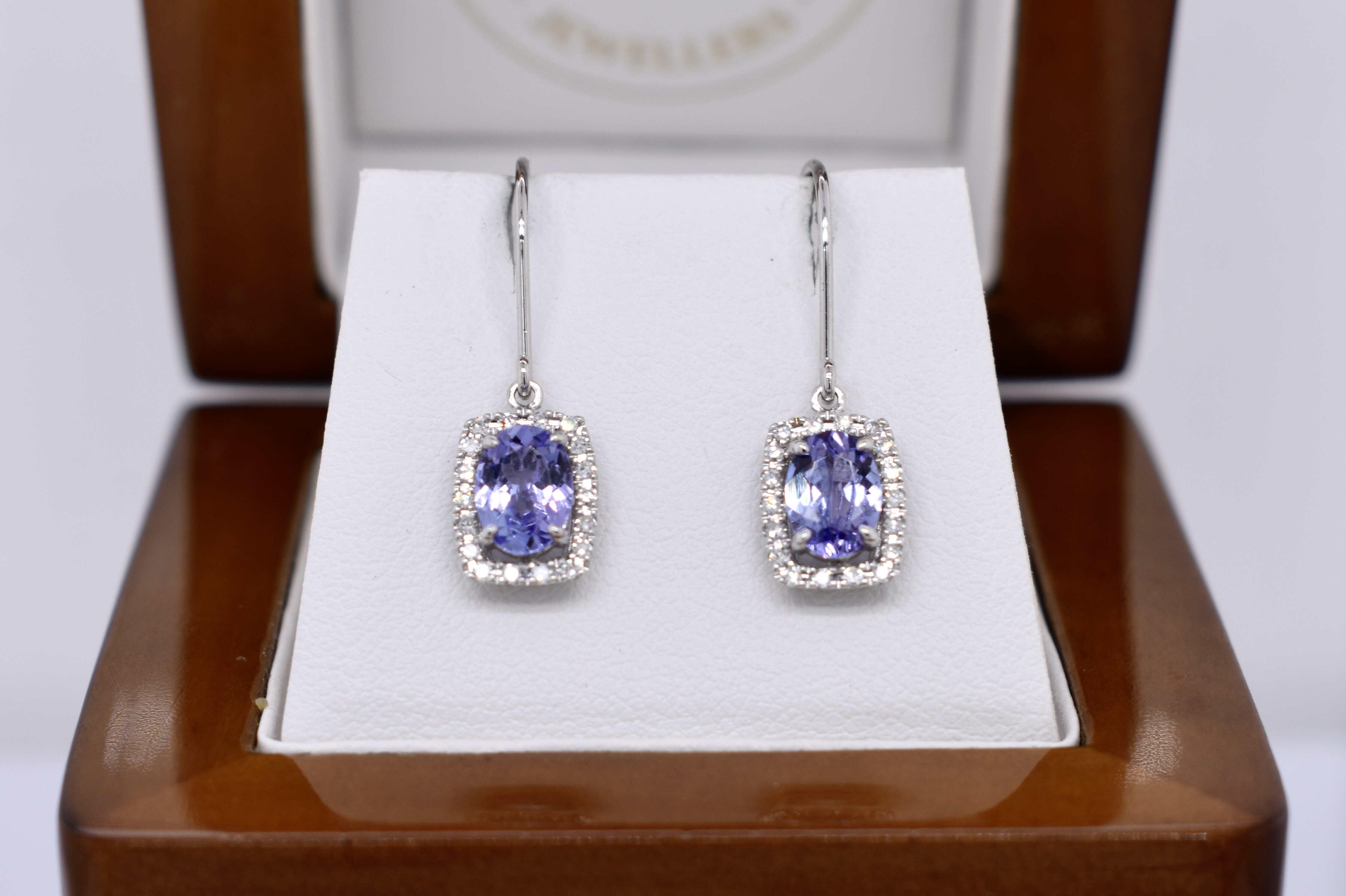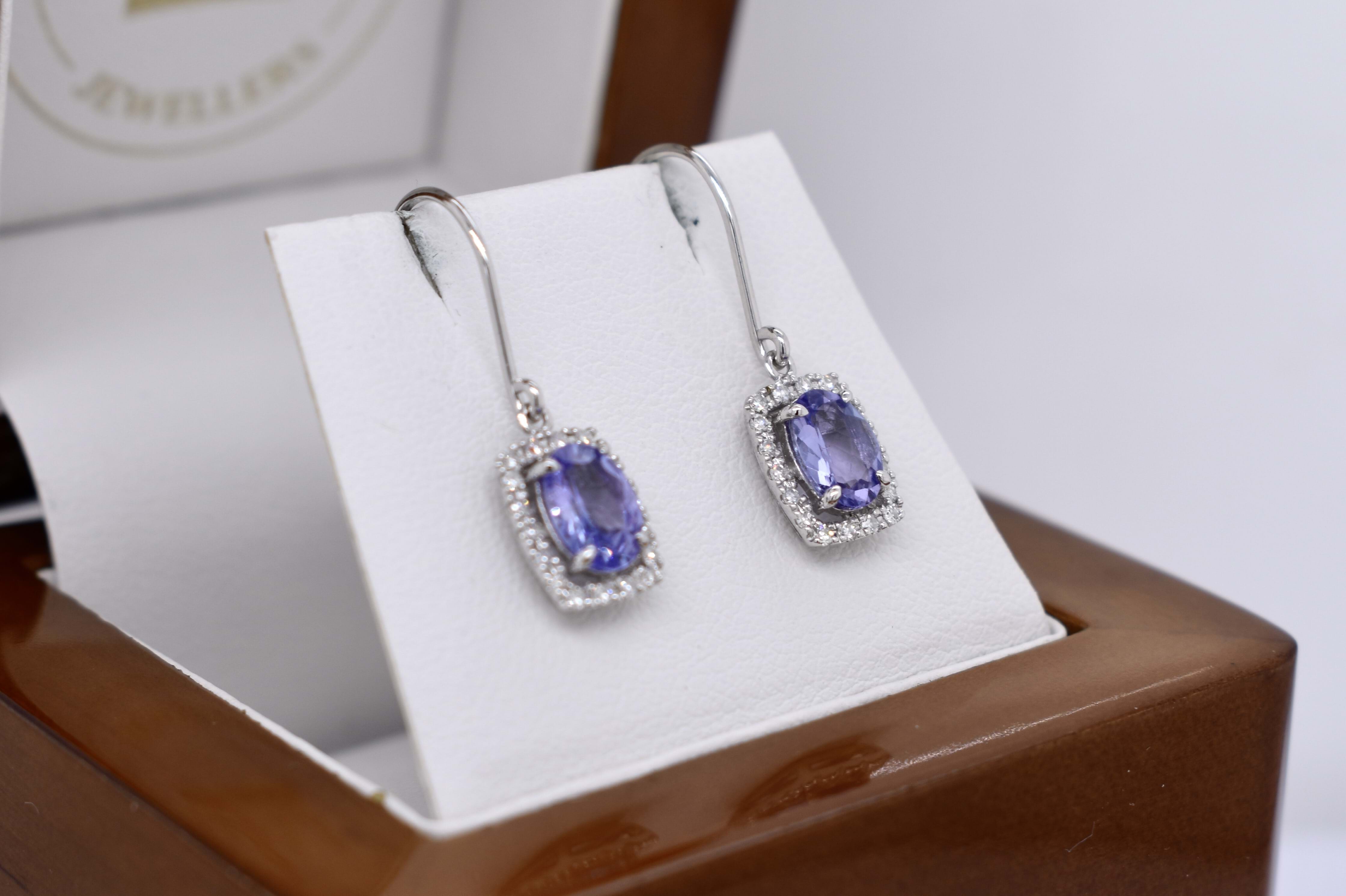 The prettiest oval 7x5mm tanzanite drops, four claw set in 9ct white gold with a cushion shaped halo of sparkling diamonds, totalling 0.20ct. Finished with shepherd hook fittings.