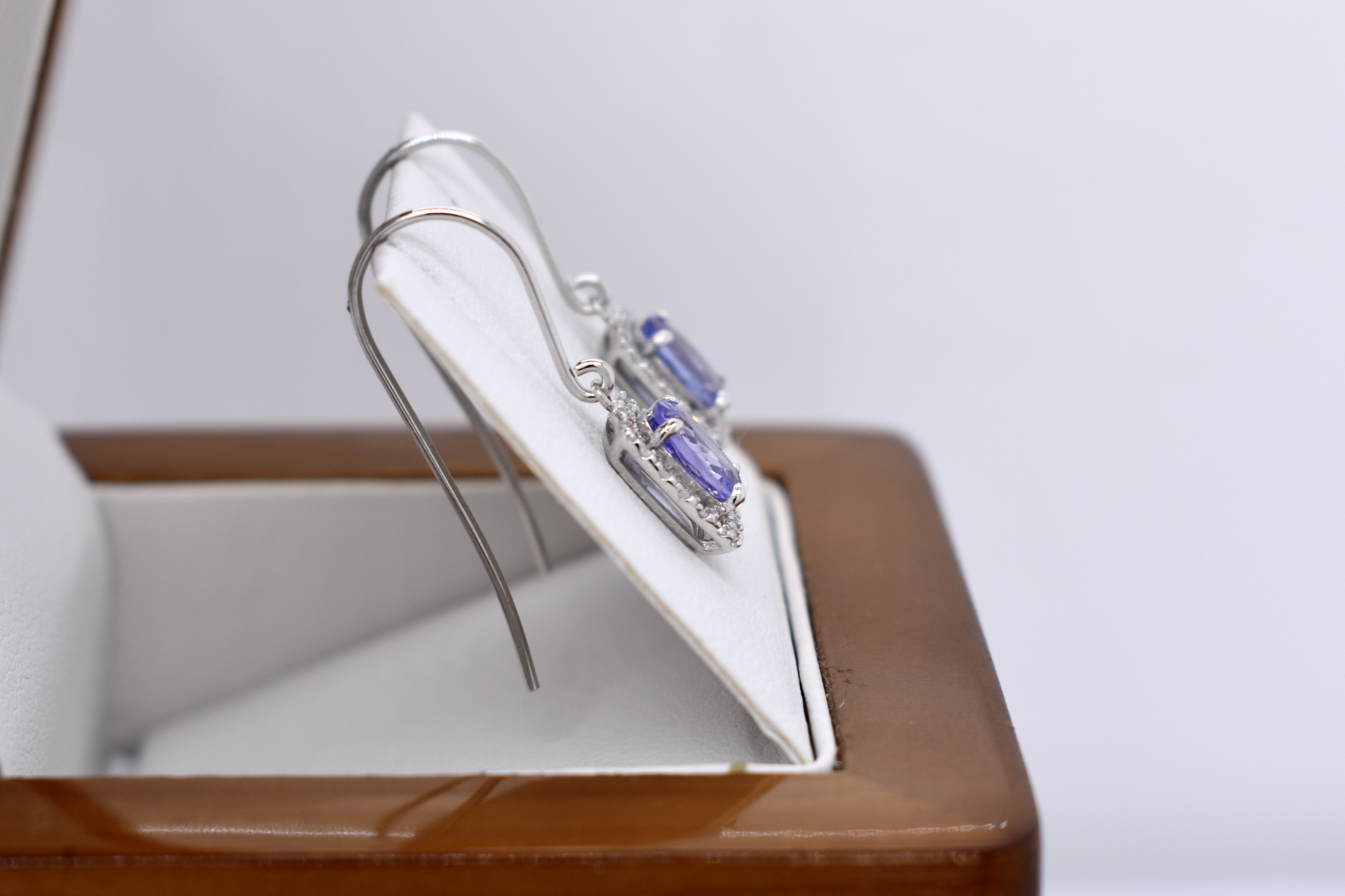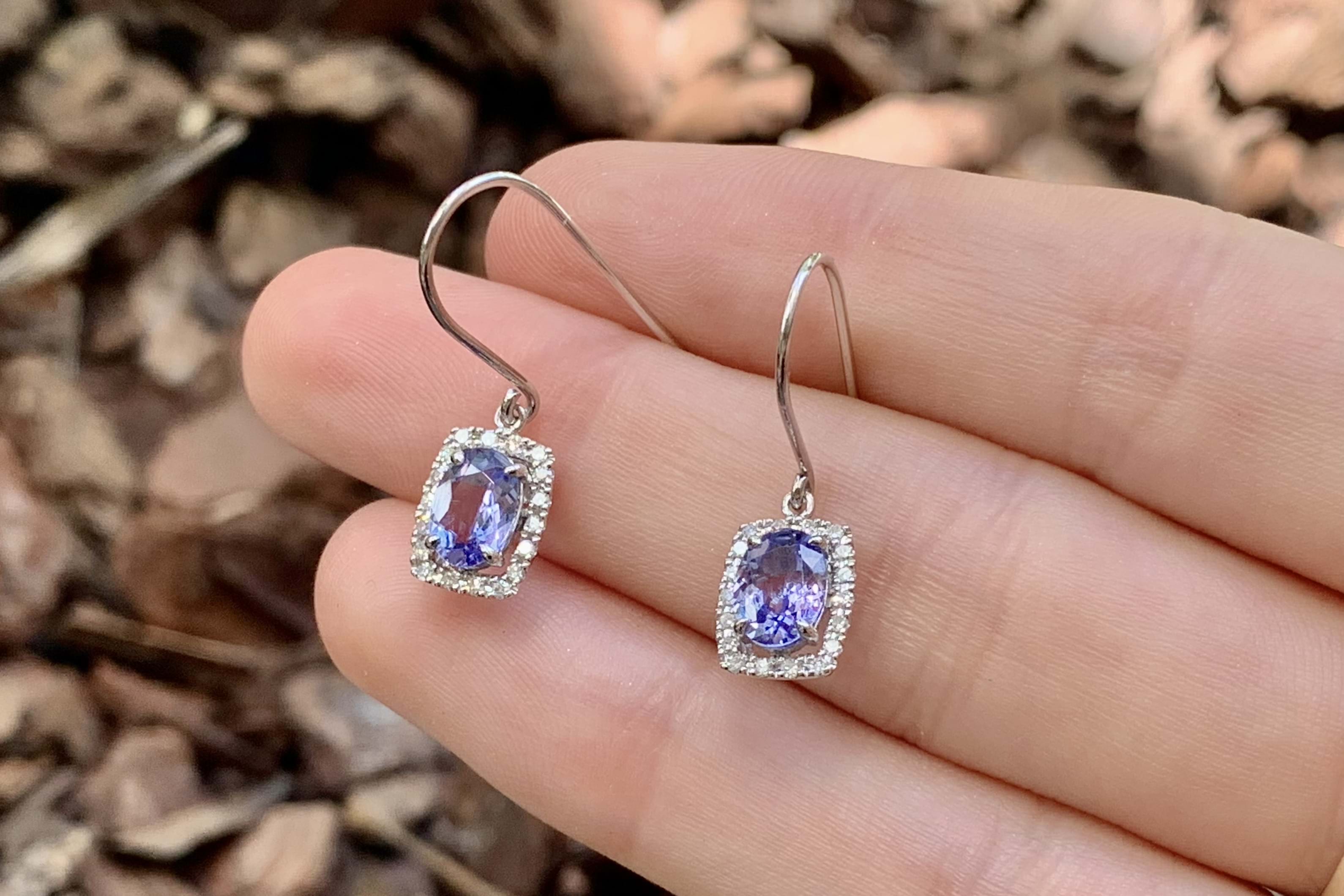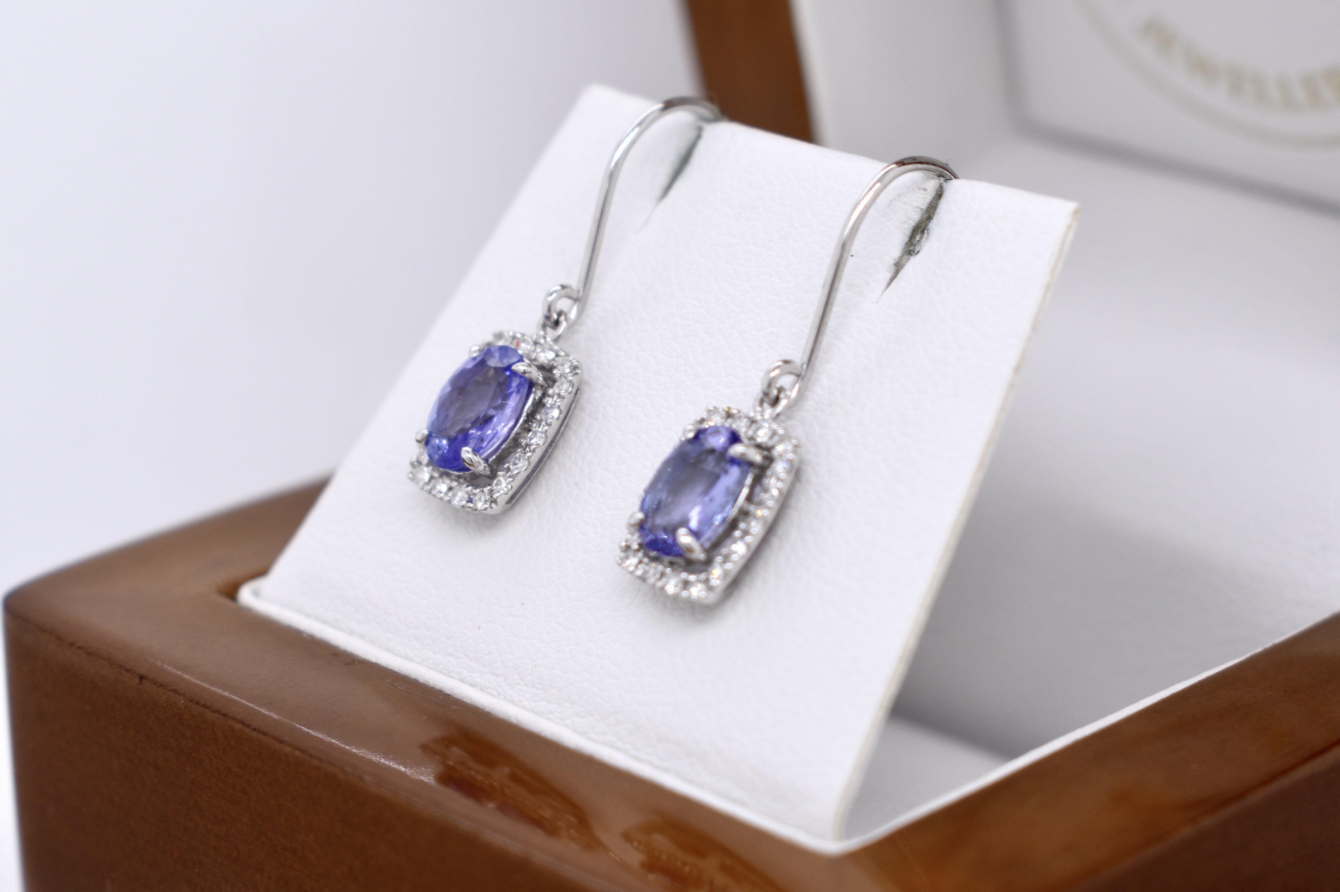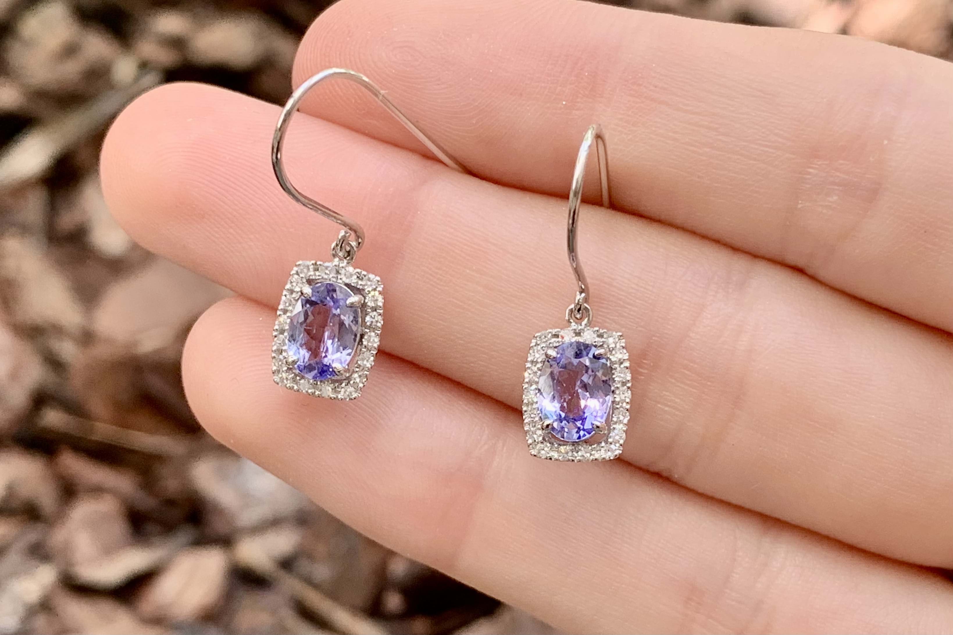 The prettiest oval 7x5mm tanzanite drops, four claw set in 9ct white gold with a cushion shaped halo of sparkling diamonds, totalling 0.20ct. Finished with shepherd hook fittings.