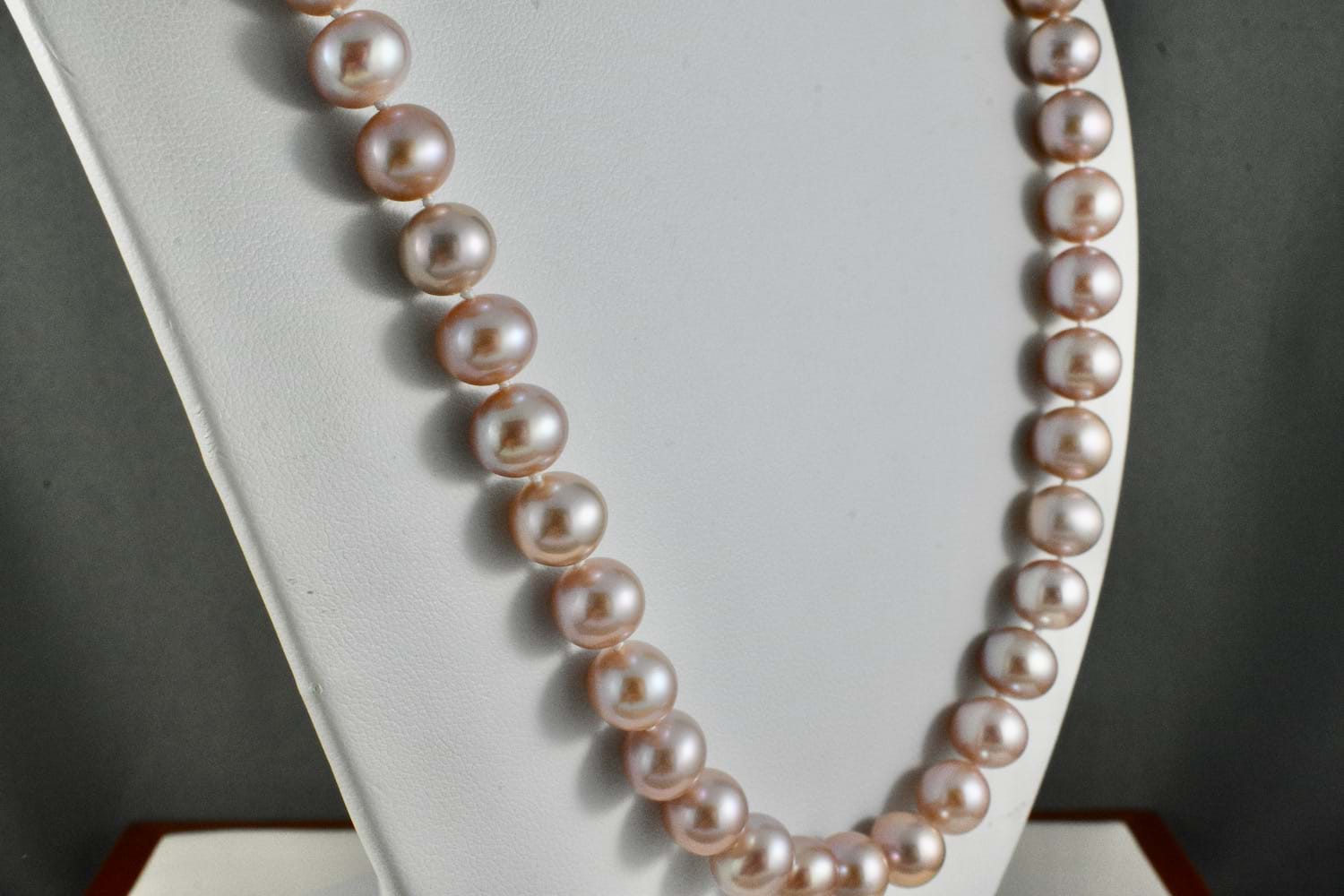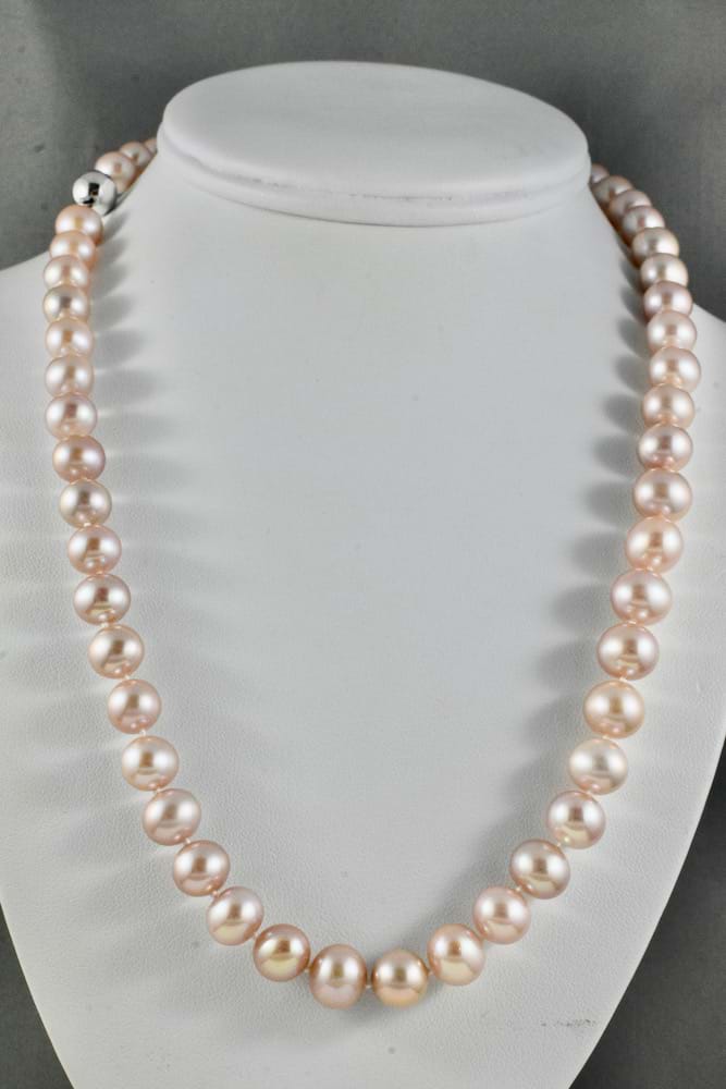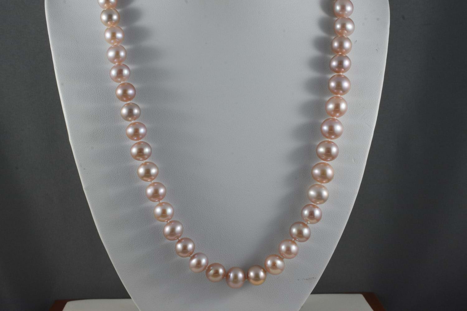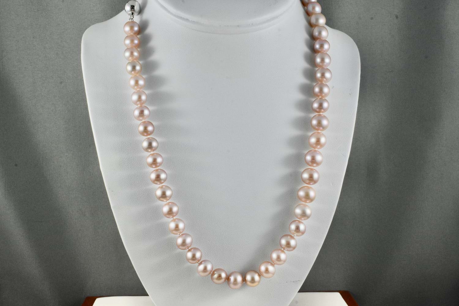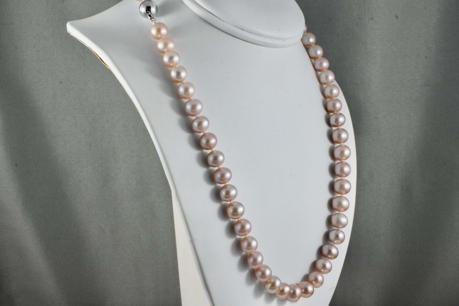 These lovely and pretty pink (dyed) freshwater pearls have a fantastic lustre and have absolute minimal blemishes in an off round shape. They have been hand strung on silk, individually knotted with a 9ct white gold ball clasp. Strand length 46cm