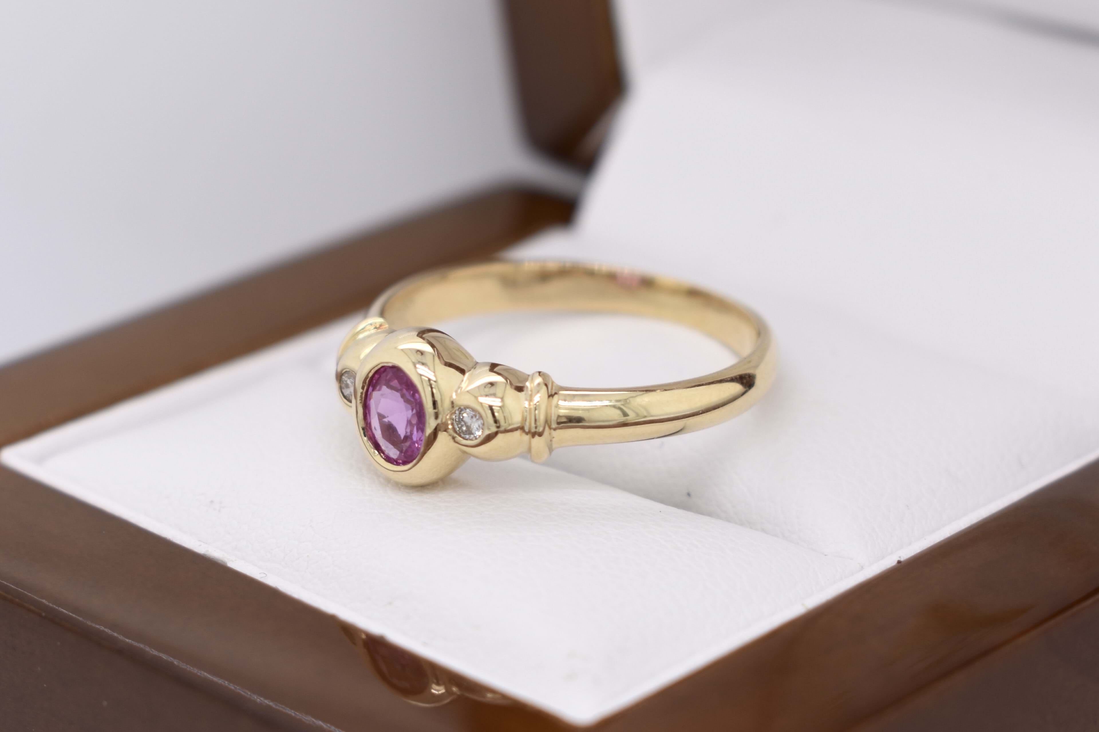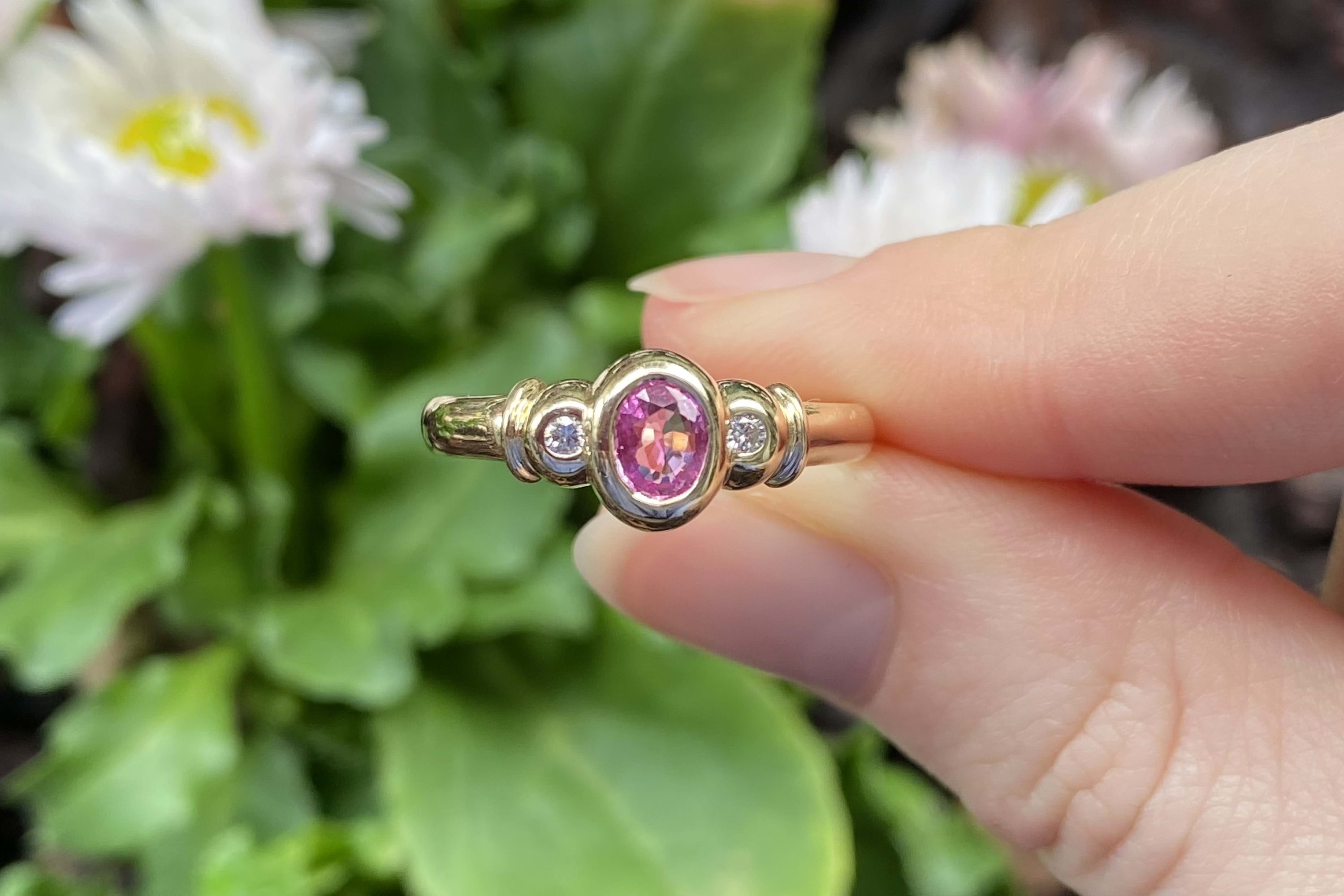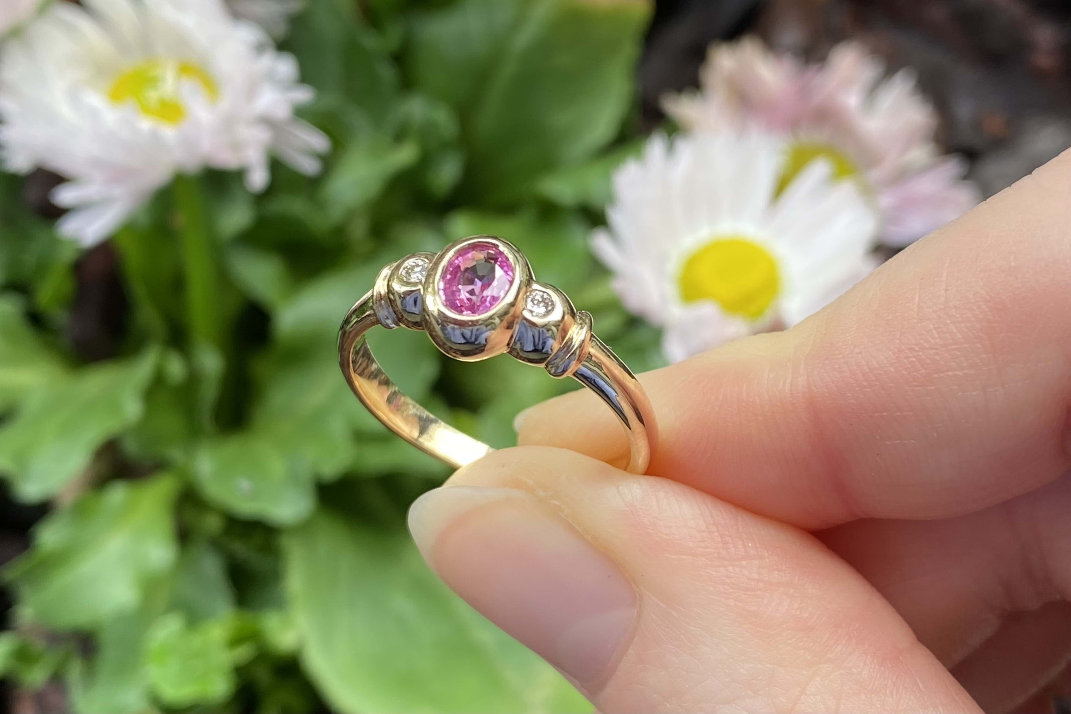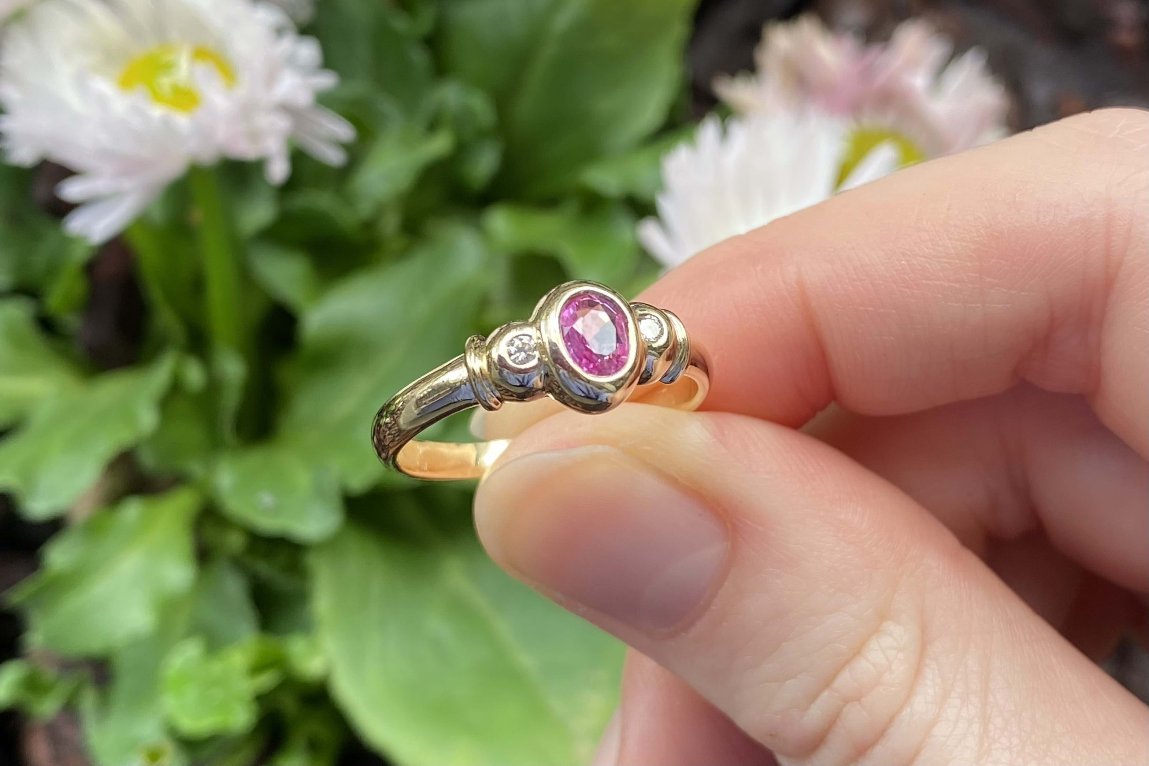 The sweetest vintage ring, featuring an oval 5.4x4.3x2.2mm pink sapphire of 0.44ct in the centre, bezel set with one 2.0mm round brilliant cut diamond each side, a total of two diamonds equalling 0.06ct H SI. The diamonds are stepped bezel set on a tapered high dome 3.1-2.4mm band. Finger size R. Independent Valuation Supplied.