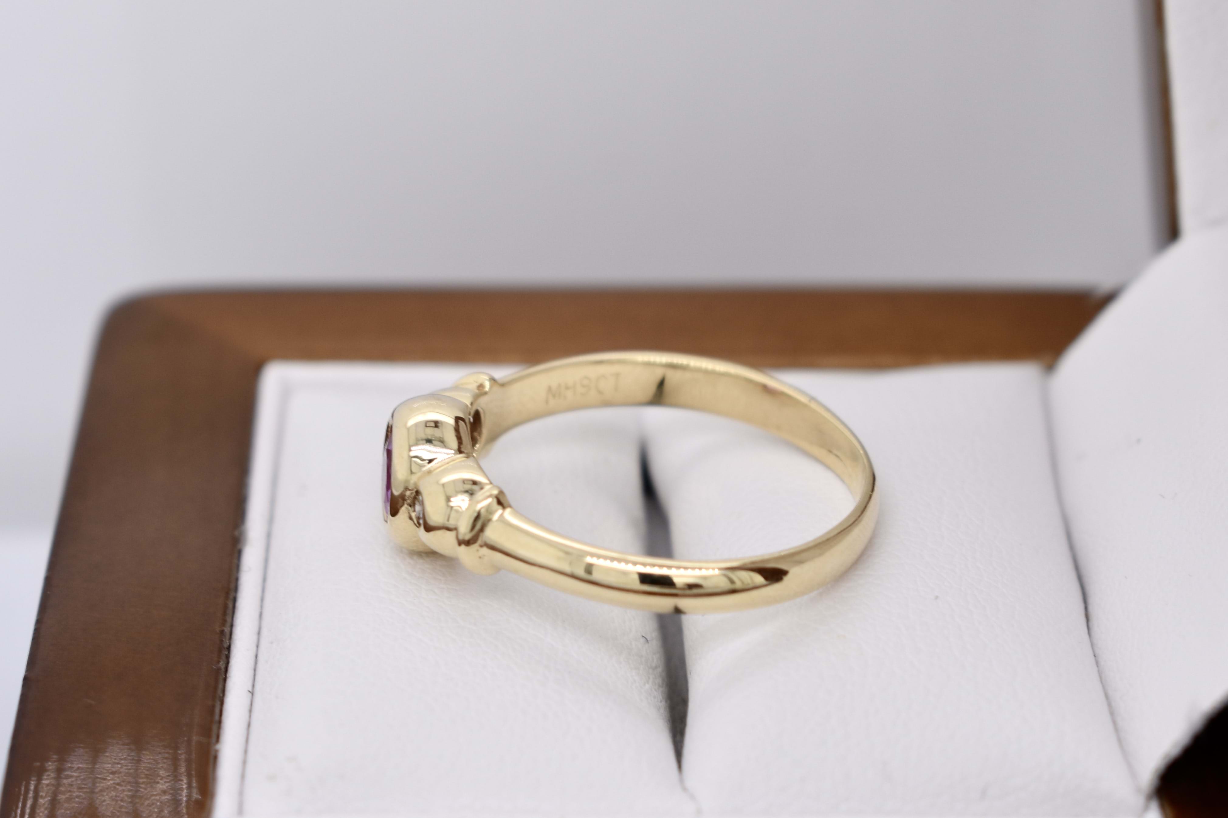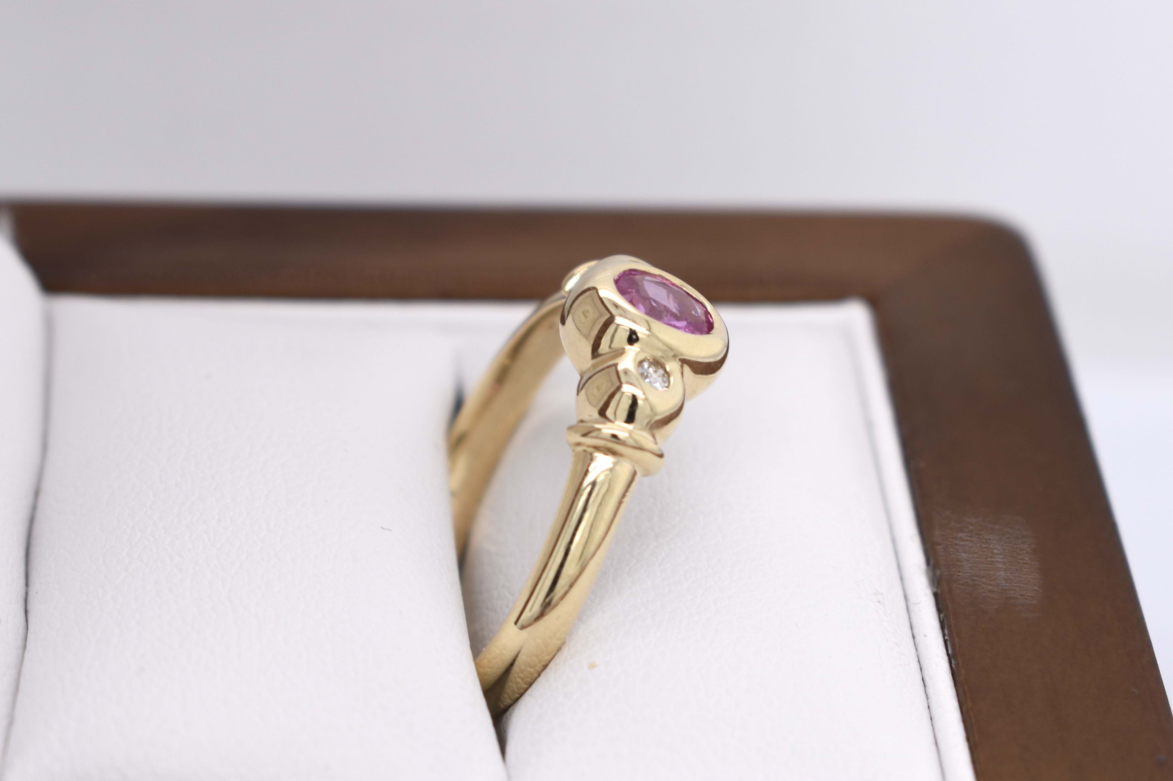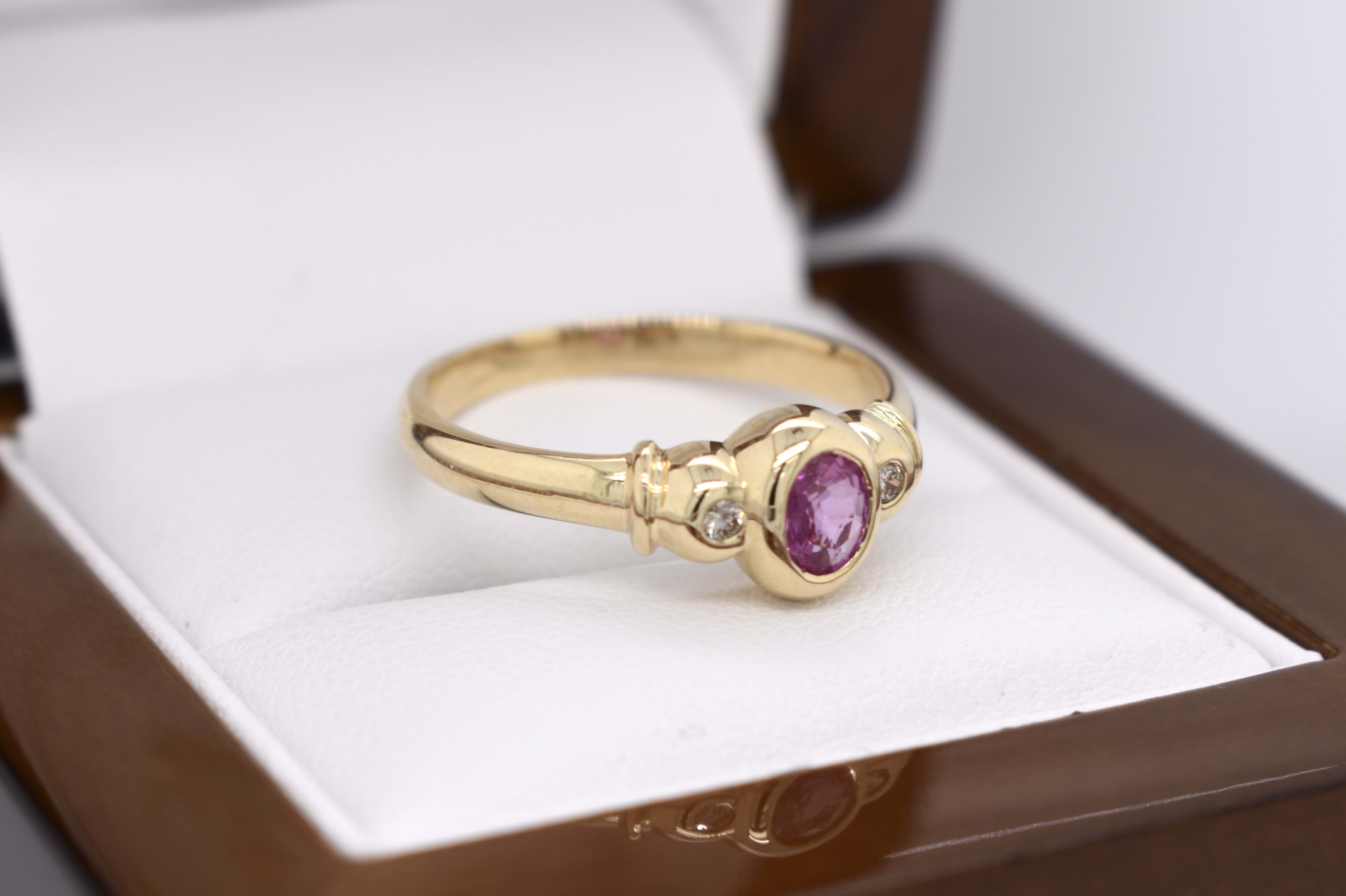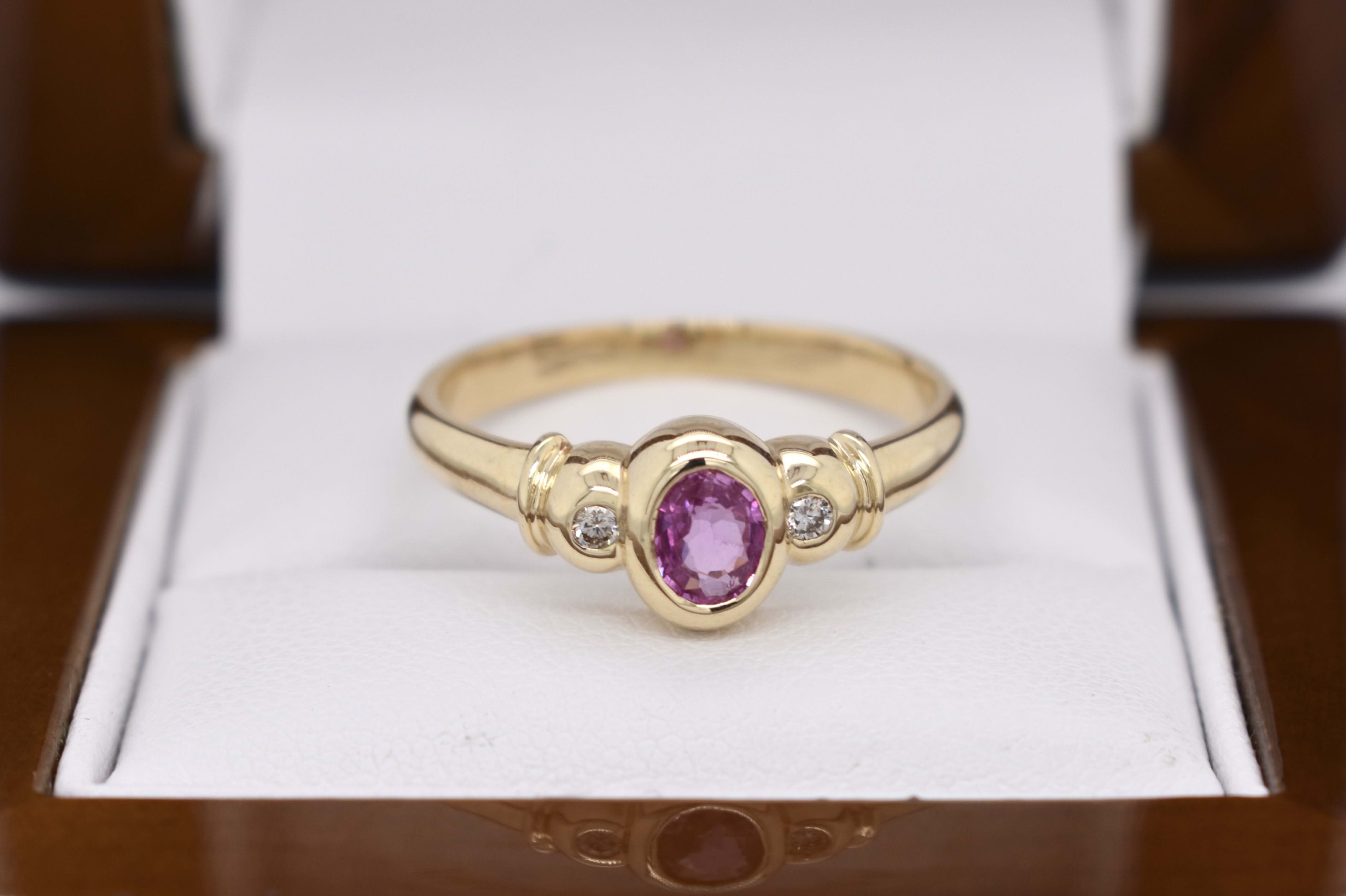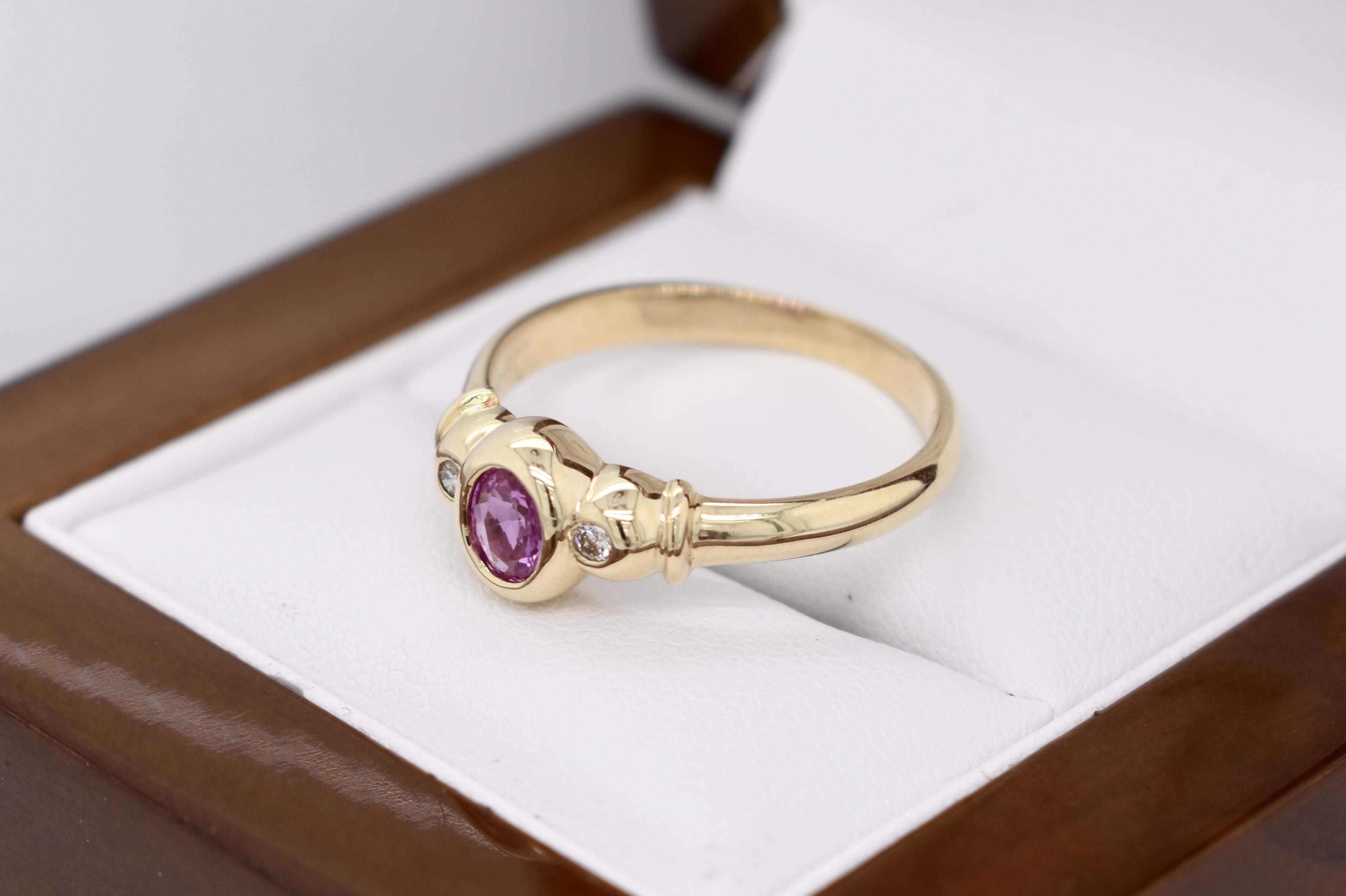 The sweetest vintage ring, featuring an oval 5.4x4.3x2.2mm pink sapphire of 0.44ct in the centre, bezel set with one 2.0mm round brilliant cut diamond each side, a total of two diamonds equalling 0.06ct H SI. The diamonds are stepped bezel set on a tapered high dome 3.1-2.4mm band. Finger size R. Independent Valuation Supplied.