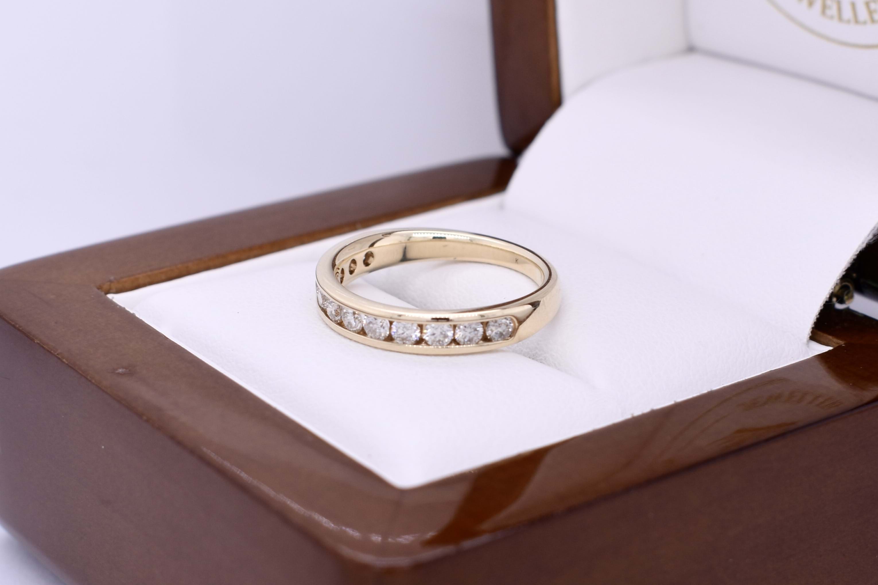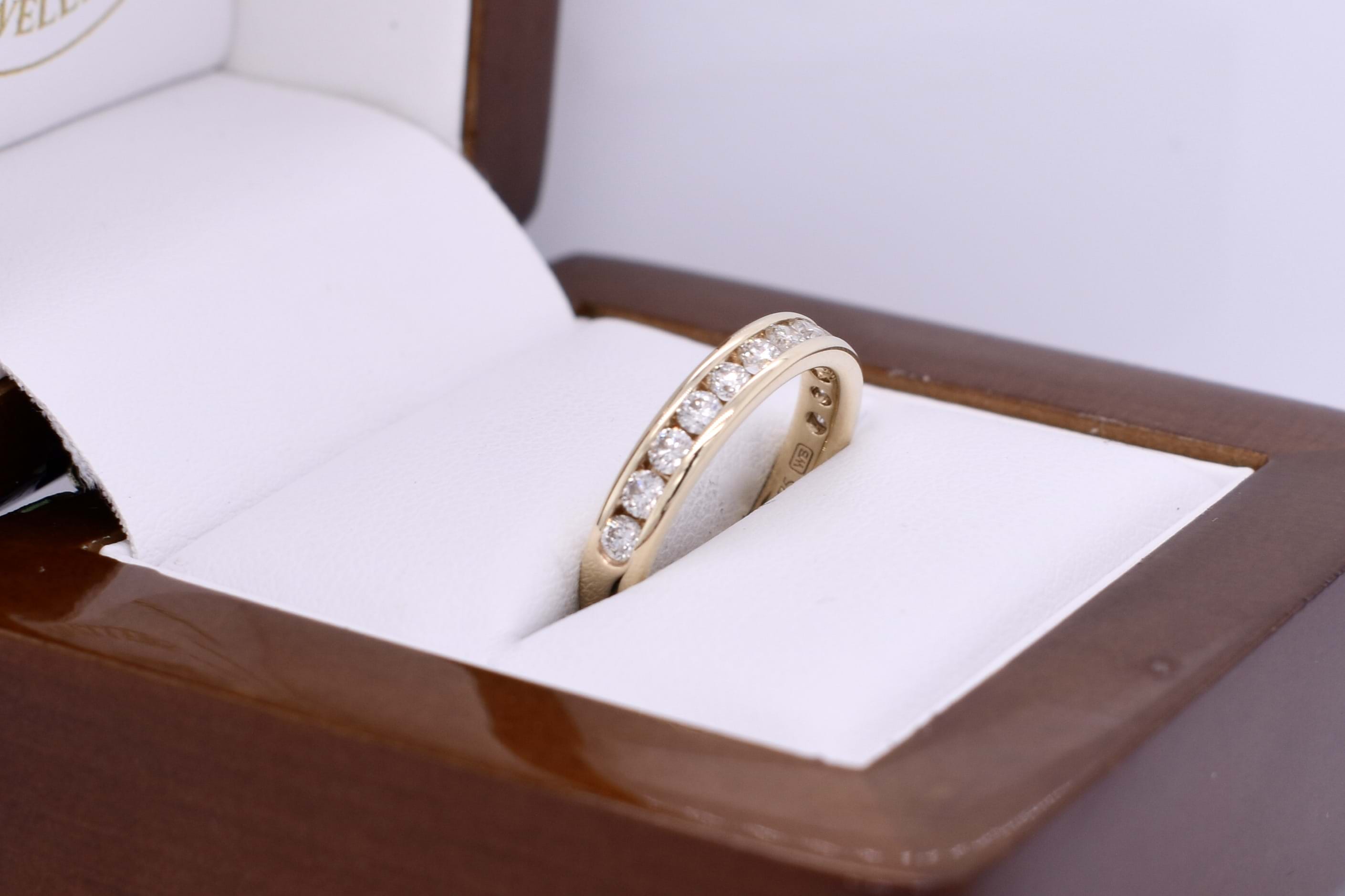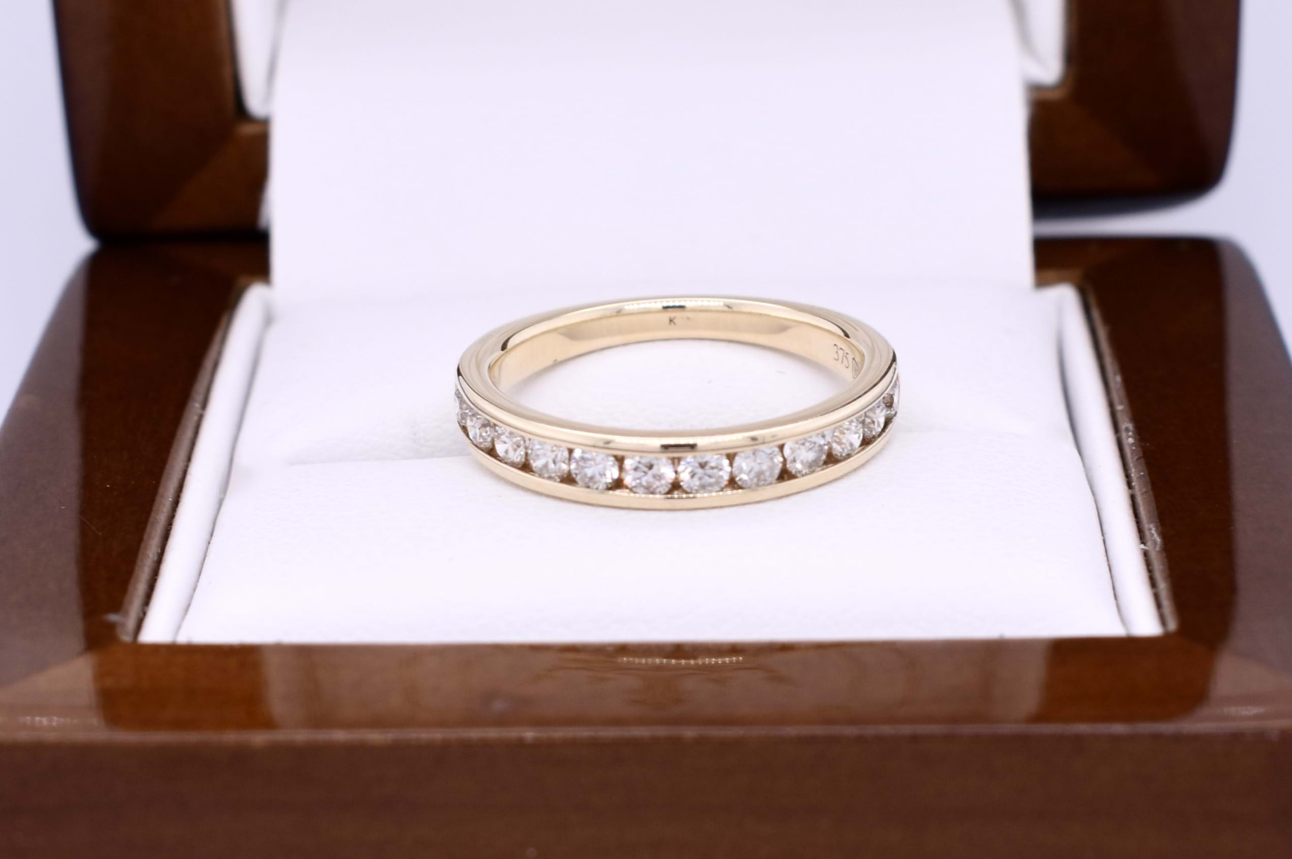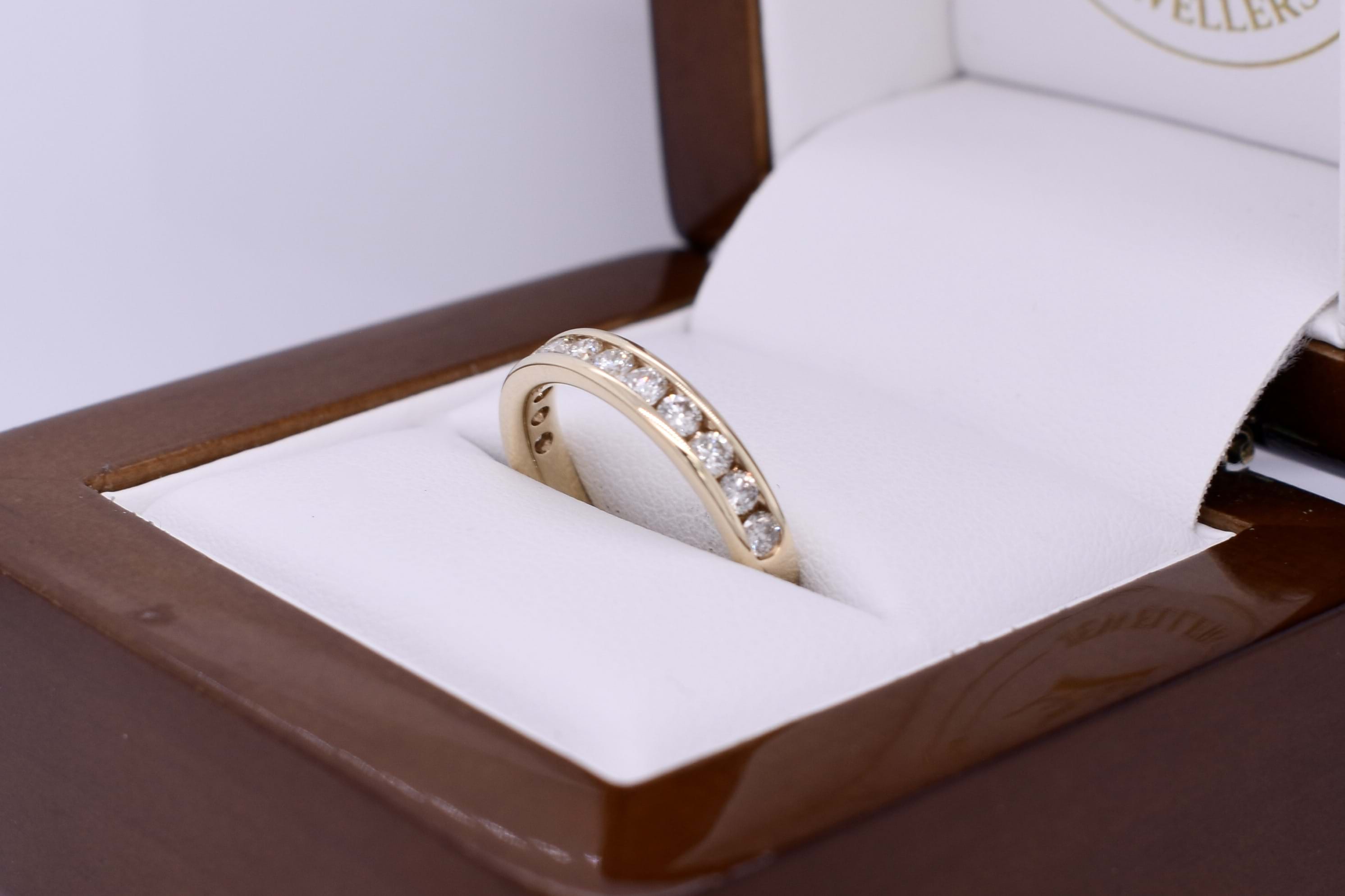 Crafted in 9ct yellow gold, this pretty diamond band features 12 round brilliant cut diamonds, measuring 2.3-2.1mm, channel set in a band. Total diamond weight 0.50ct K SI-P1. Band measures 3.43-2.20mm wide. Finger size K.