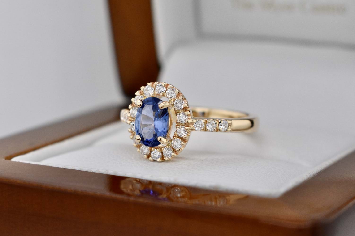 A bright mid blue 0.87ct Ceylon sapphire four claw set into this pretty 9ct yellow gold halo dress ring. Containing 20 shimmering round brilliant cut diamonds totalling 0.34cts (GVS) the yellow gold warms the sapphire while the white diamonds provide contrast. Finger size M+. Independent Valuation Supplied