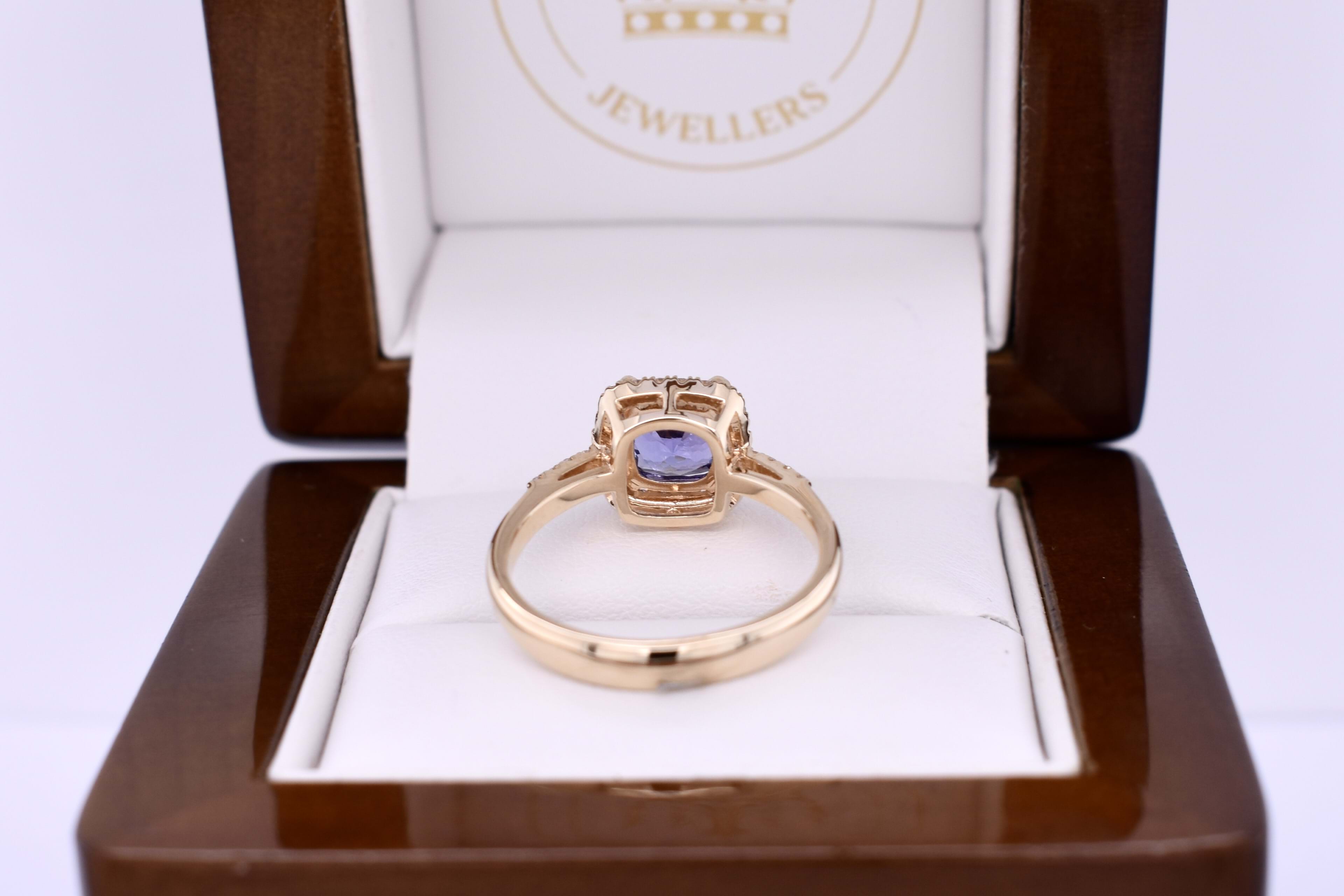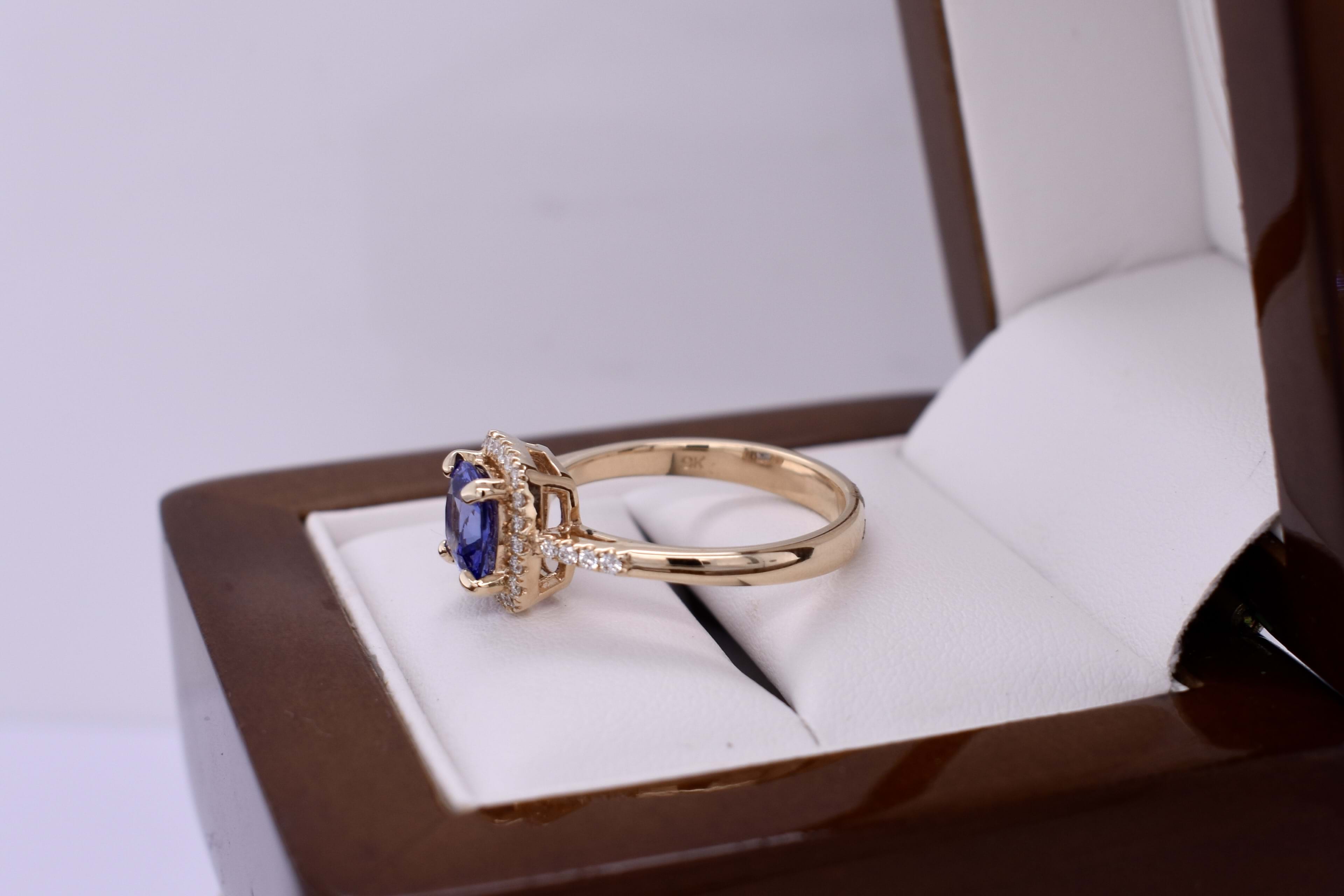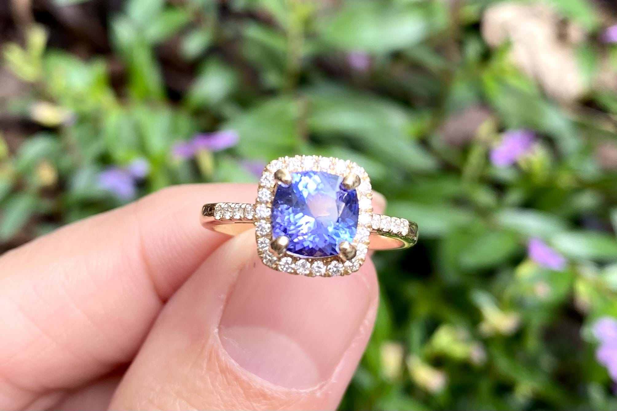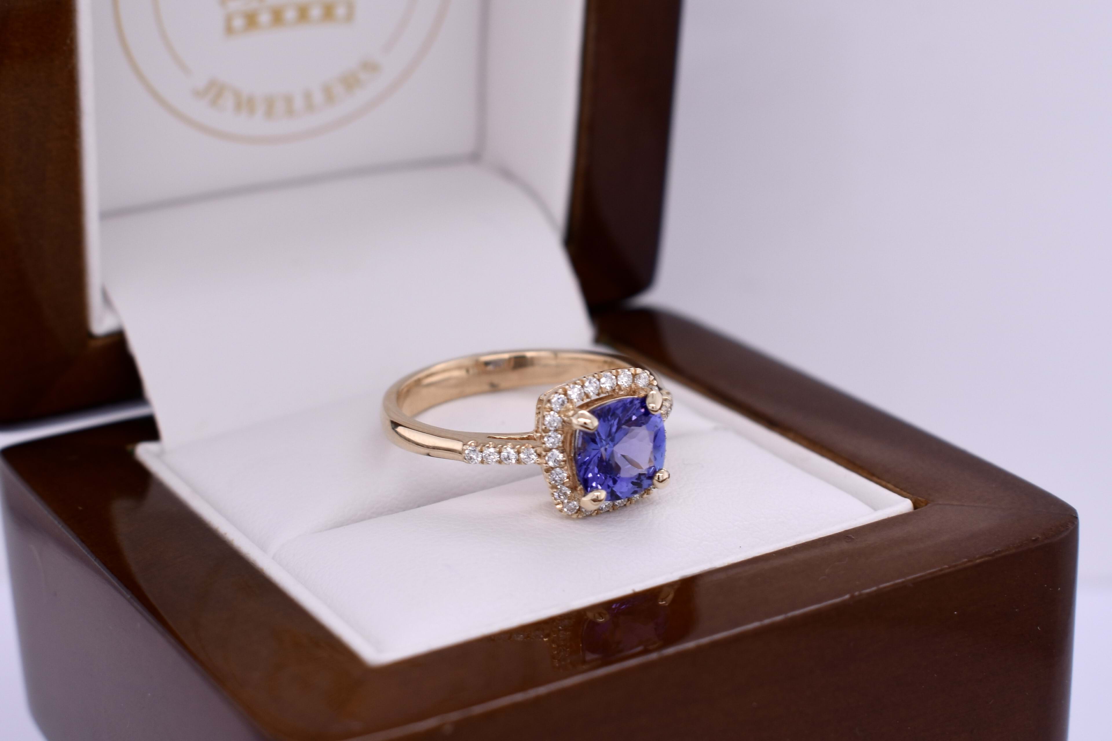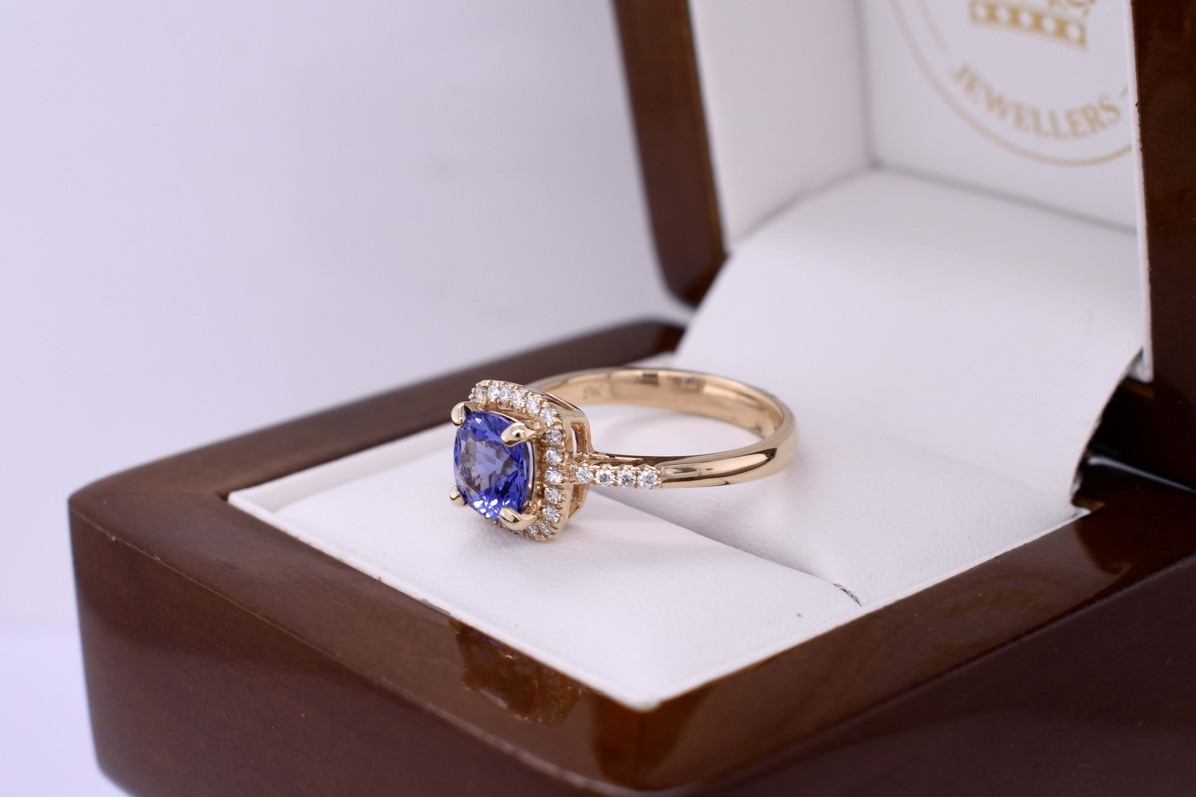 This eye-catching ring features a round 1.37ct mid purplish blue tanzanite, four claw set in 9ct yellow gold and framed by a cushion shaped diamond halo. The ring is finished on a 3mm band, with 4 cut down claw set diamonds either side. Finger size N+. Total diamond weight 30 round brilliant cuts equalling 0.30ct G VS-SI. Independent valuation supplied.