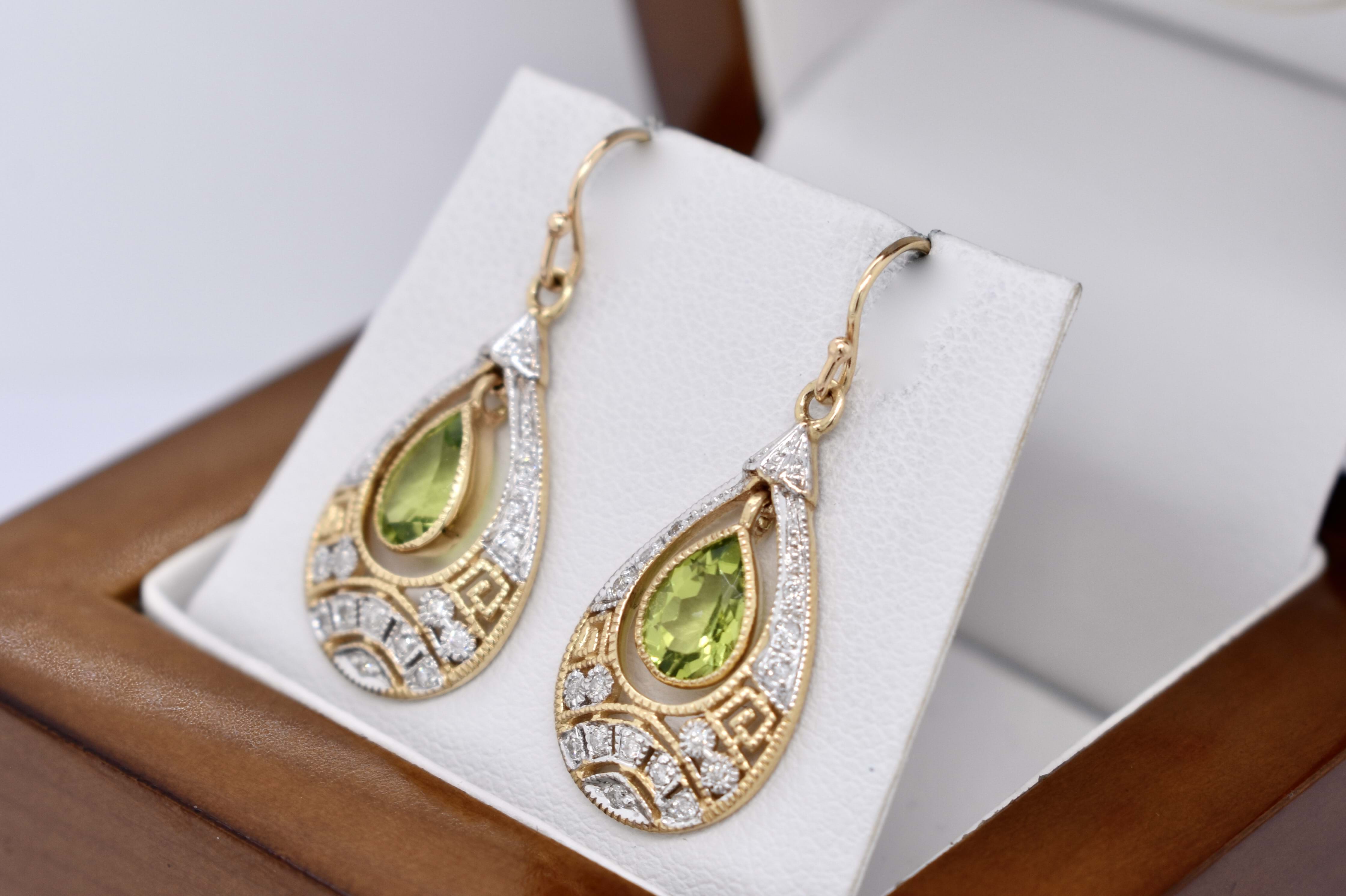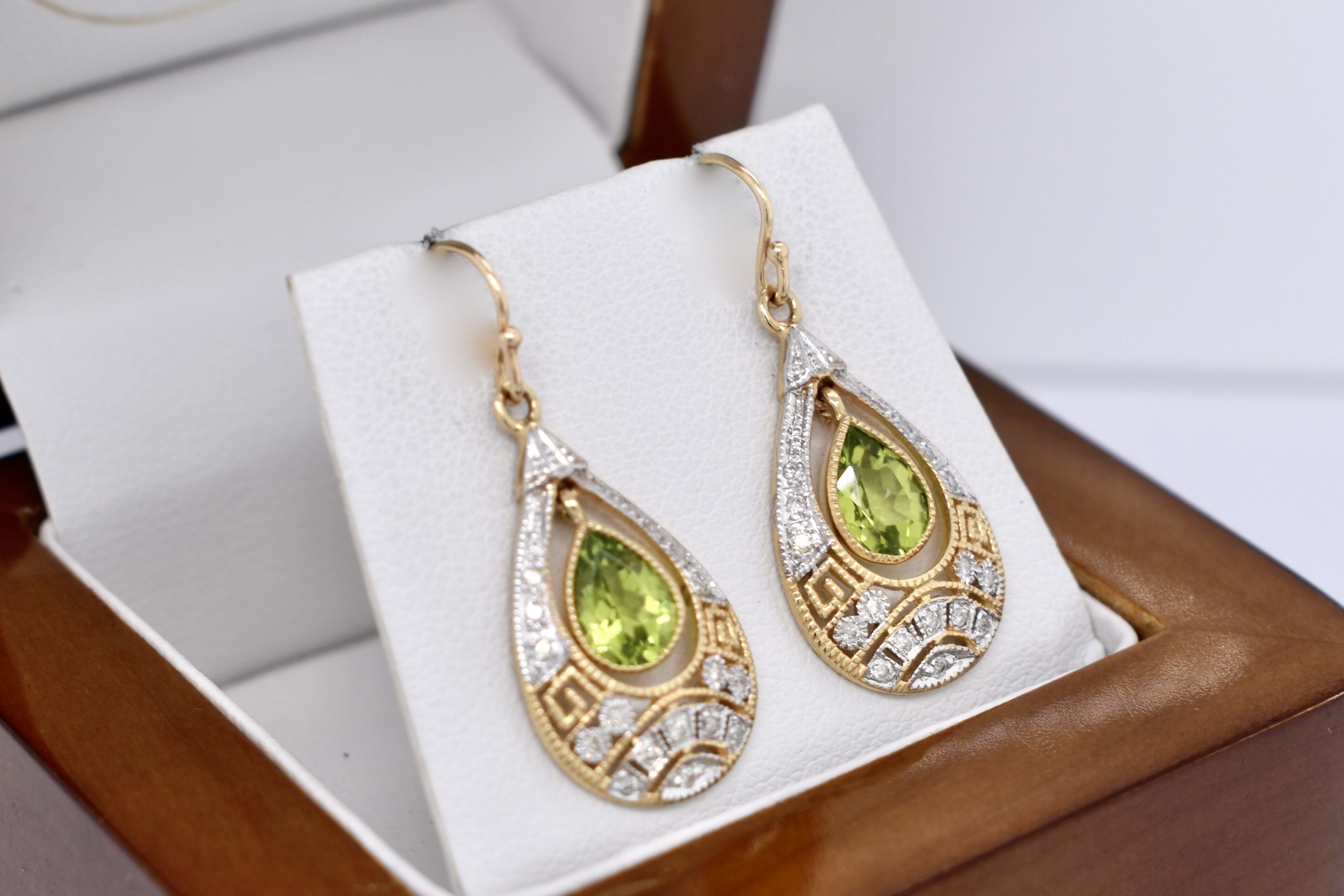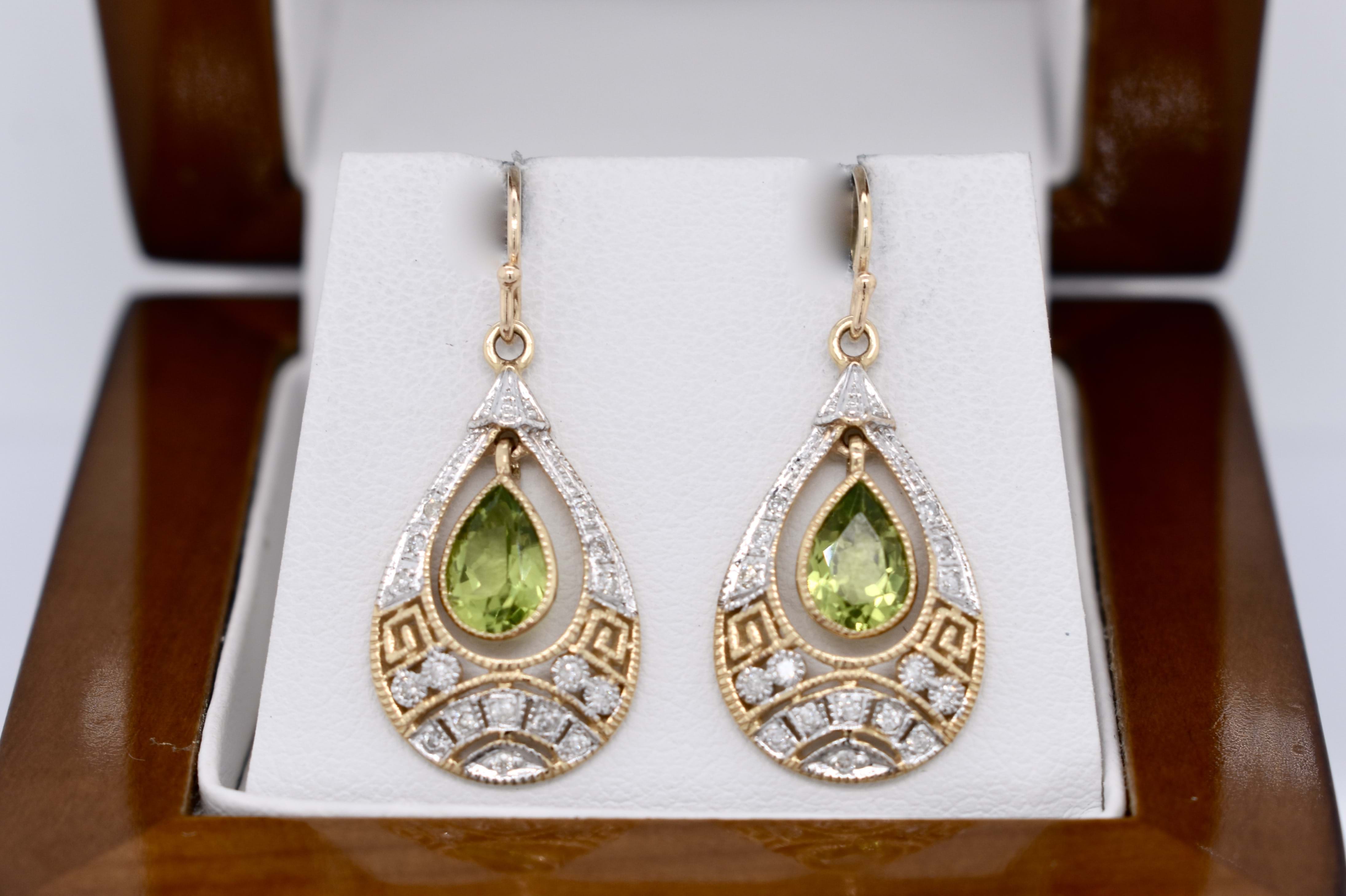 Stunning drops crafted in 9ct yellow gold, with two pear shaped peridot stones in the centre, measuring 6.80x5.10x3.15mm, totalling 1.40ct. Framed with a beautiful antique styled geometric cut out border containing 16 round brilliant cut 1.10mm diamonds in each drop, with a total of 32 diamonds totalling 0.19ct H/K P2. Completed with shepherd hook fittings. Independent Valuation Supplied.