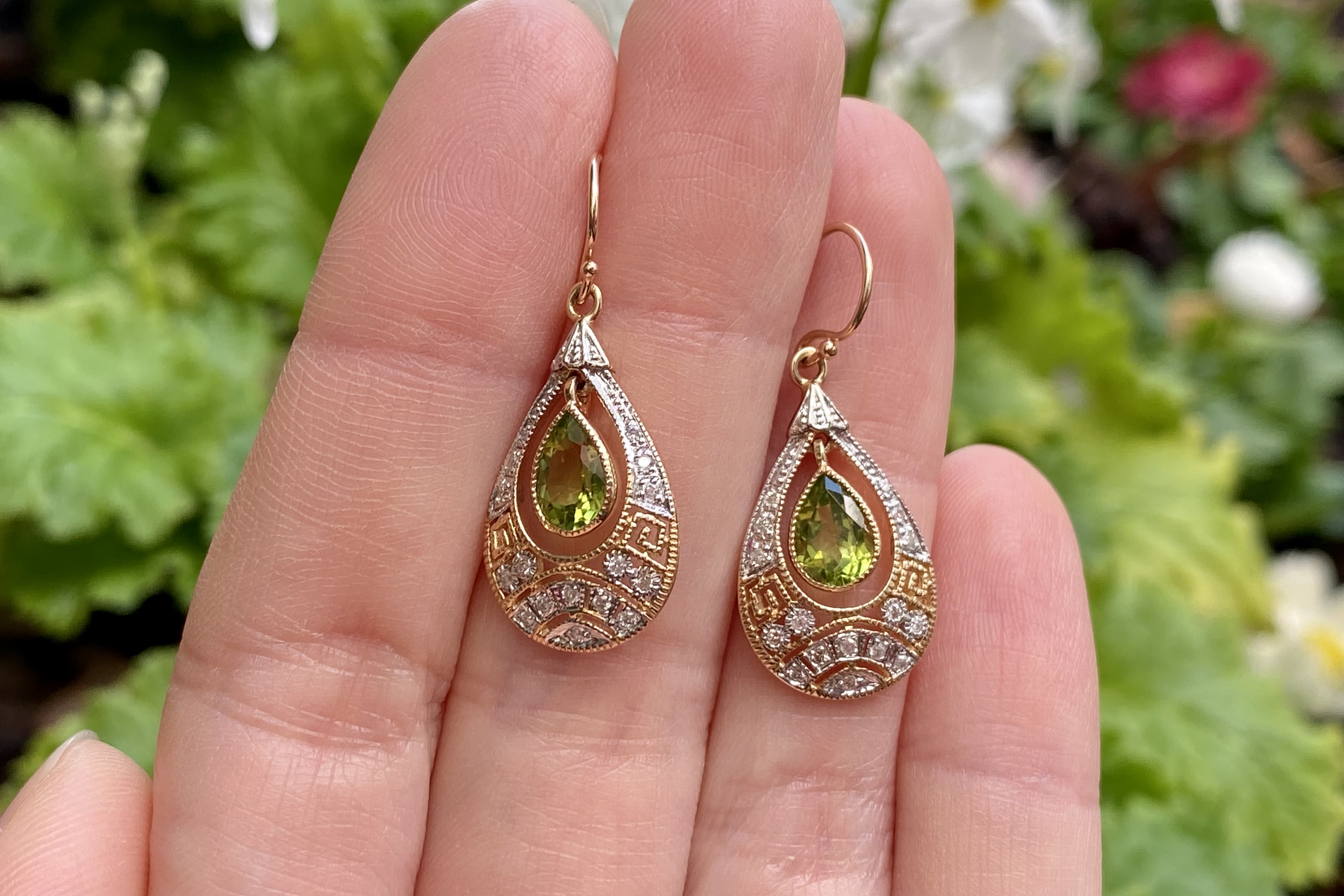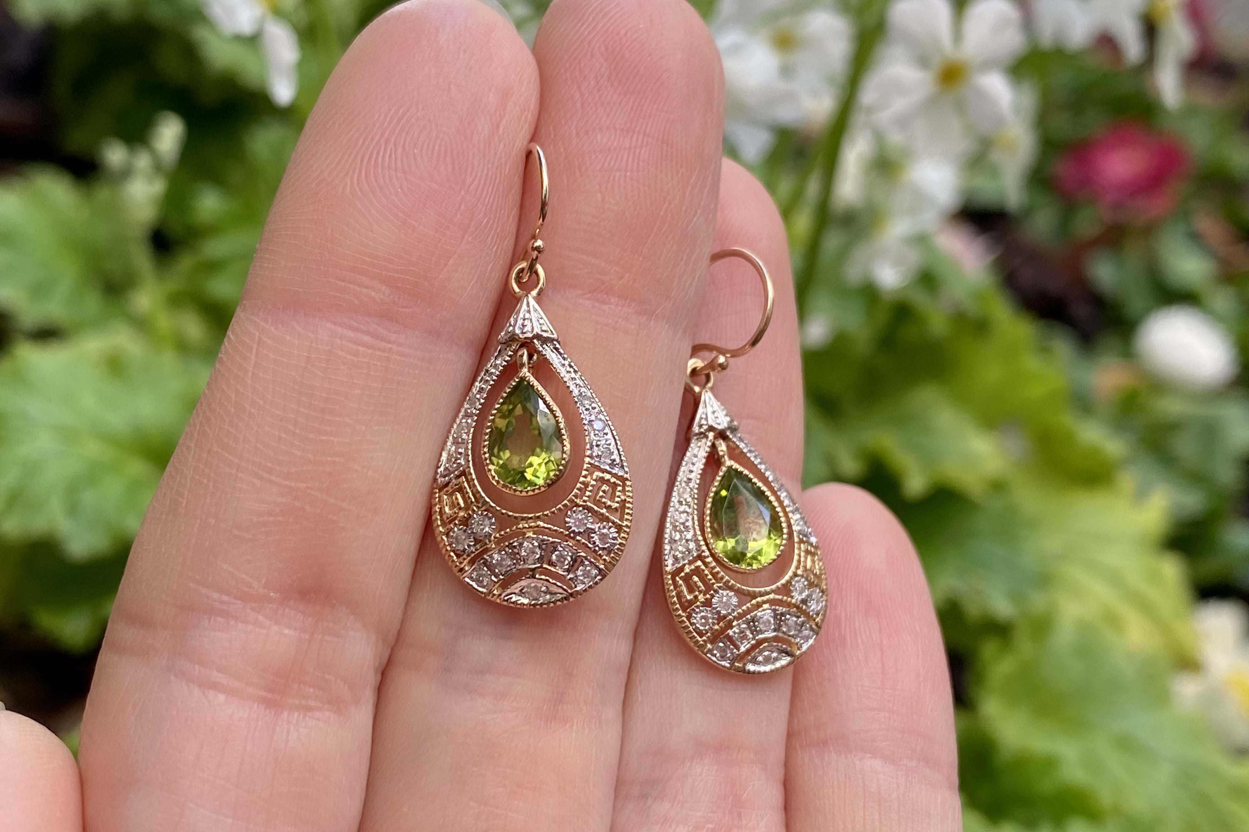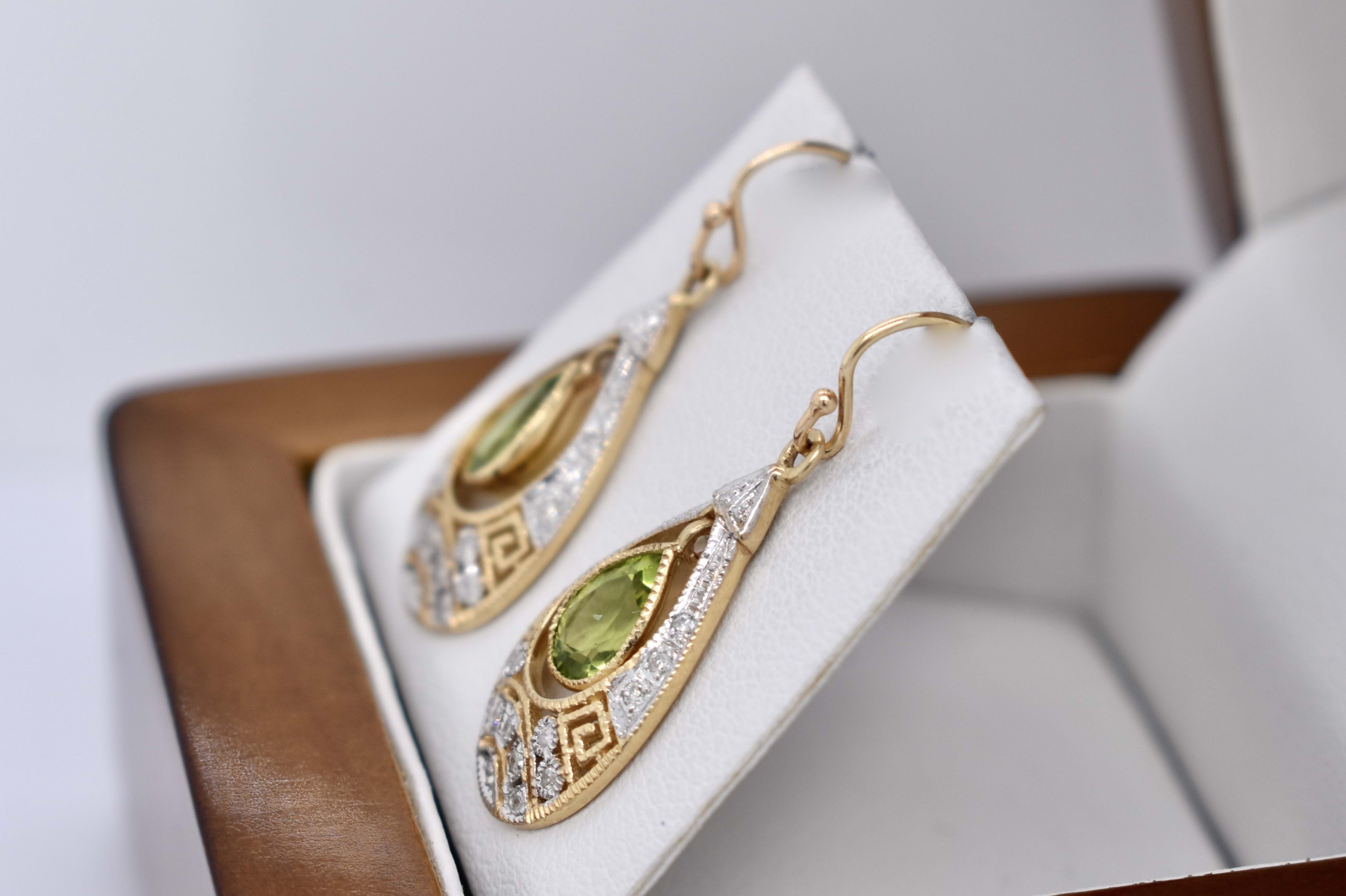 Stunning drops crafted in 9ct yellow gold, with two pear shaped peridot stones in the centre, measuring 6.80x5.10x3.15mm, totalling 1.40ct. Framed with a beautiful antique styled geometric cut out border containing 16 round brilliant cut 1.10mm diamonds in each drop, with a total of 32 diamonds totalling 0.19ct H/K P2. Completed with shepherd hook fittings. Independent Valuation Supplied.