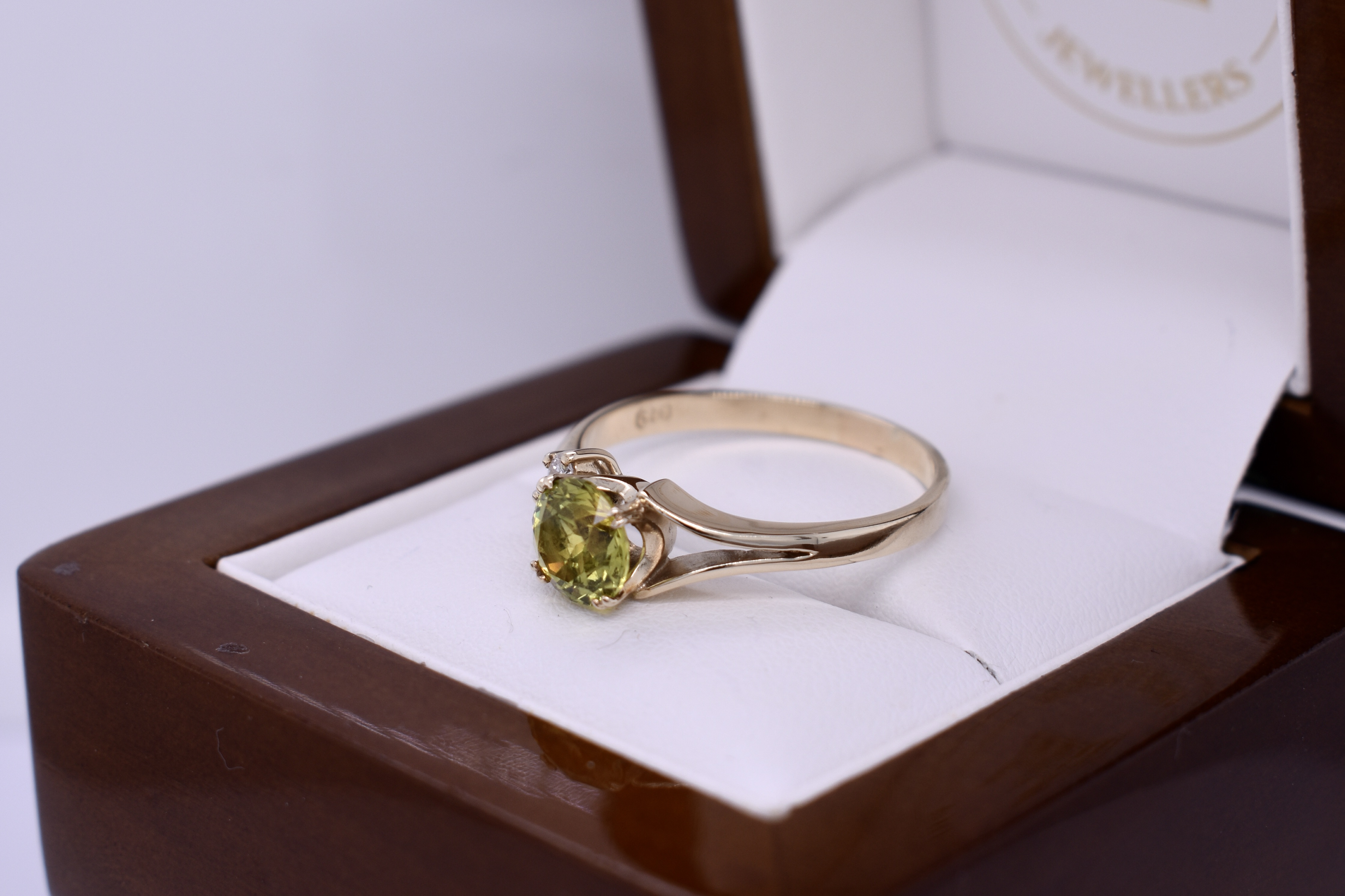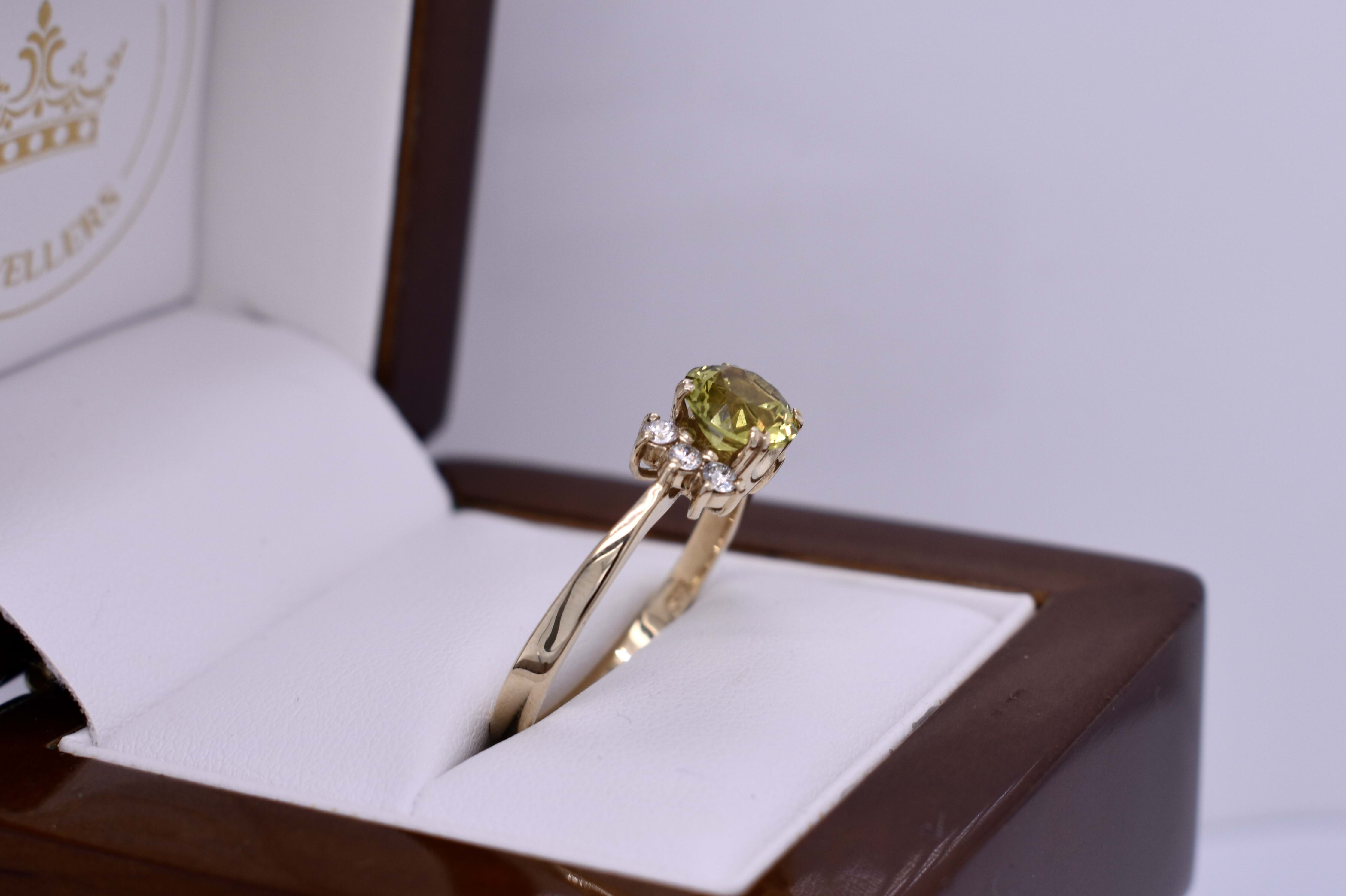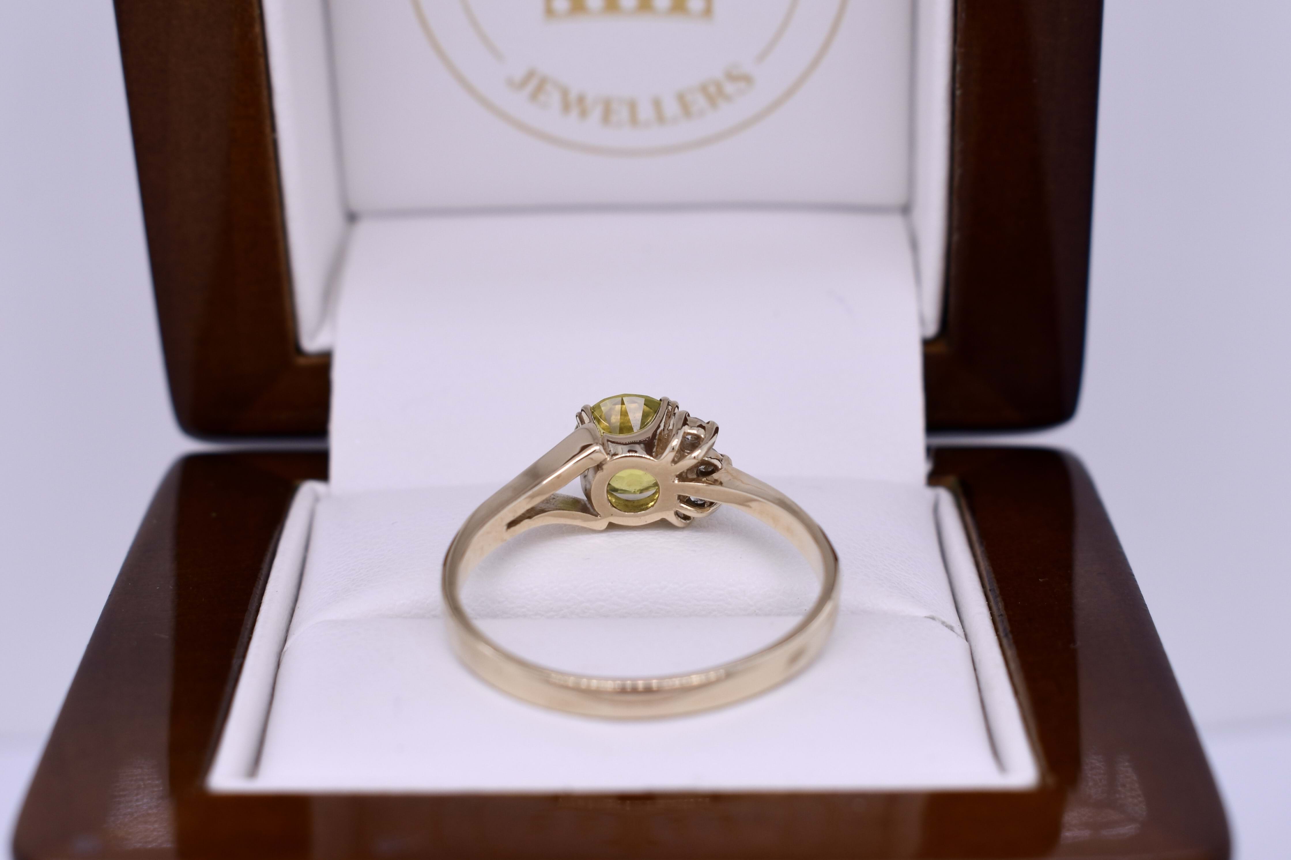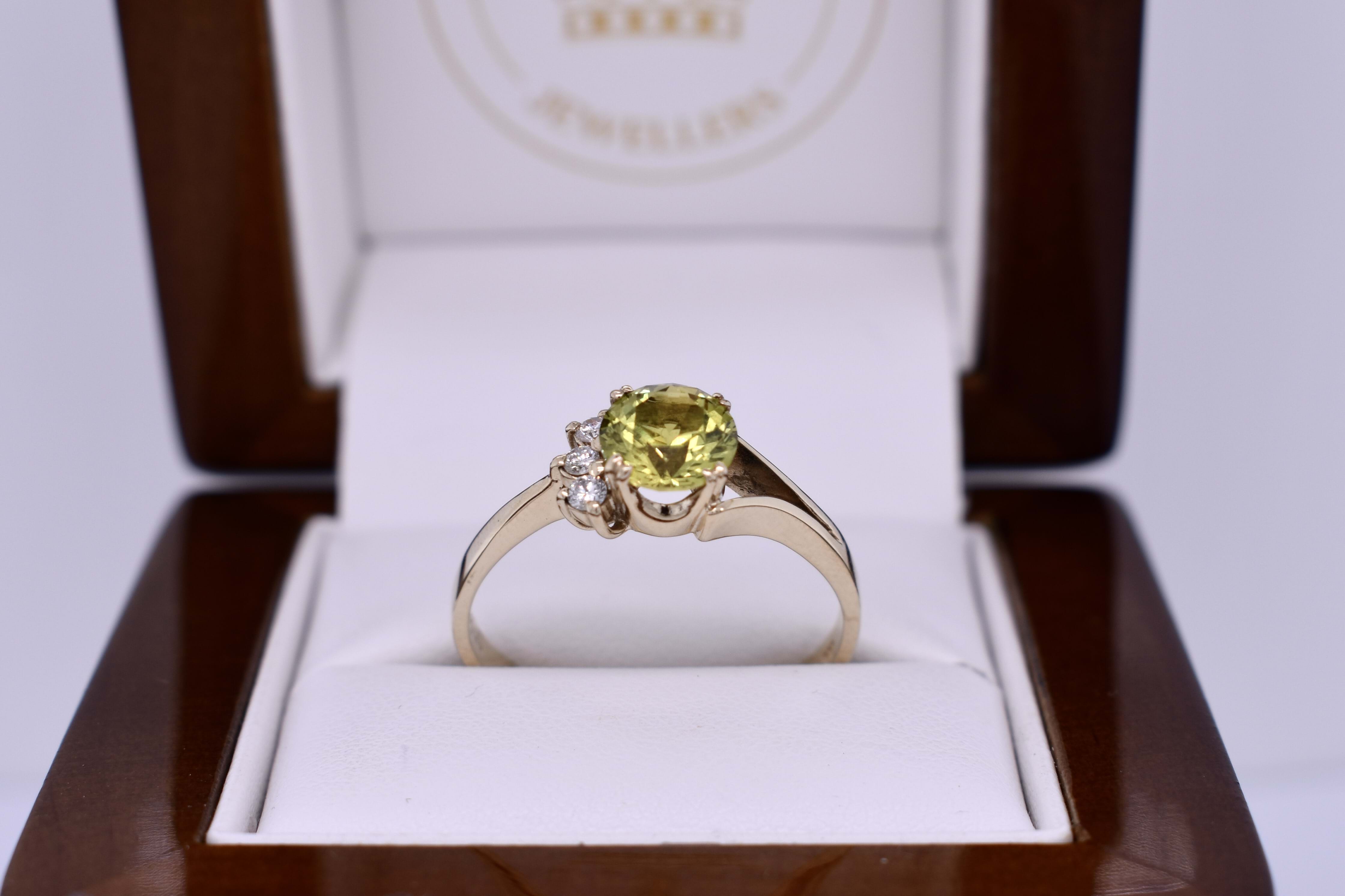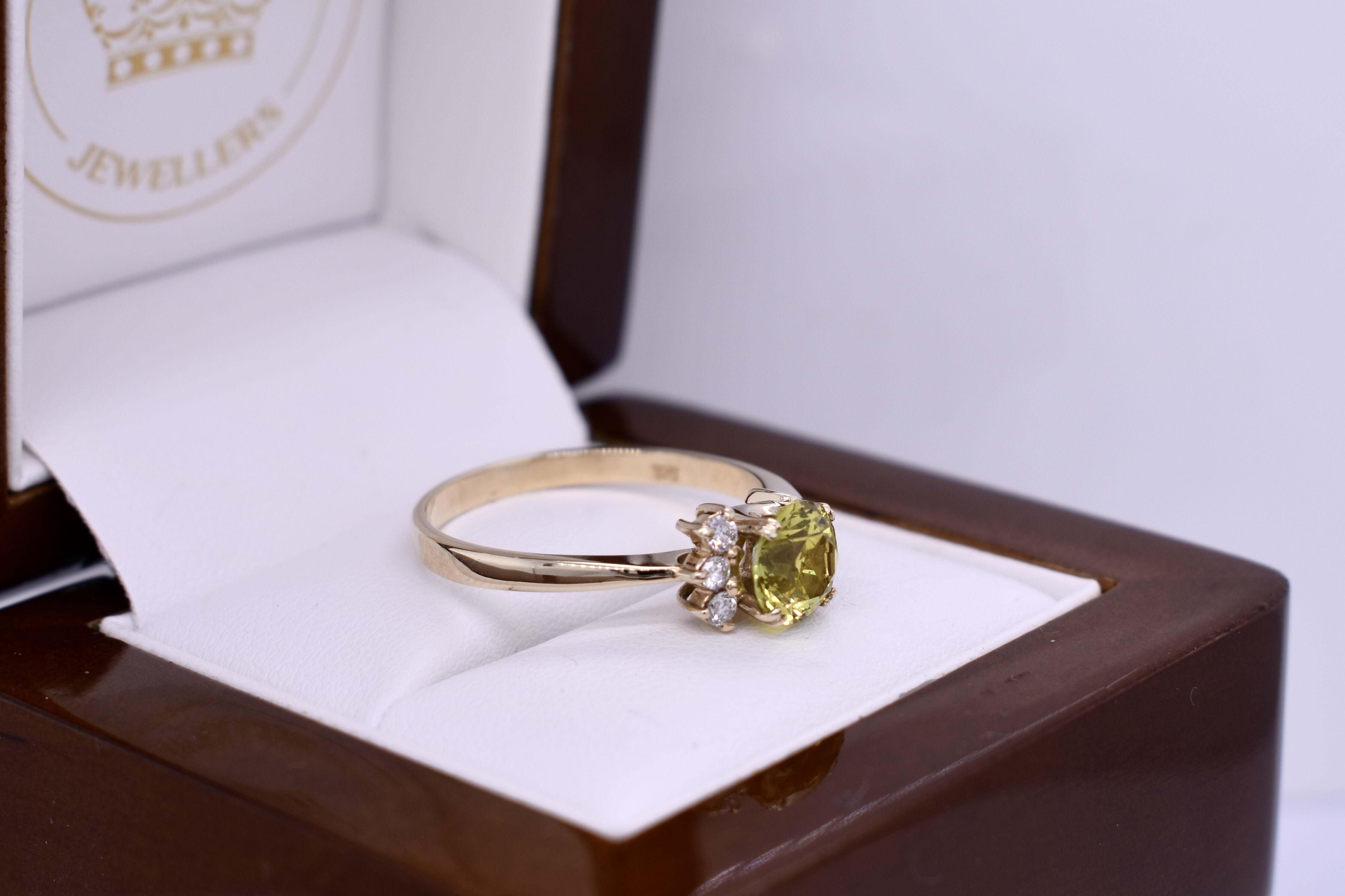 This eye catching ring features a bright, greenish yellow Australian sapphire weighing 1.55ct, four claw set into 9ct yellow gold. The ring is complimented by 3 offset diamonds to one side and is finished on a flat band with one tapering shoulder and one split shoulder. Total diamond weight 0.09ct GHSI-P1. Finger size U. Independent valuation supplied.