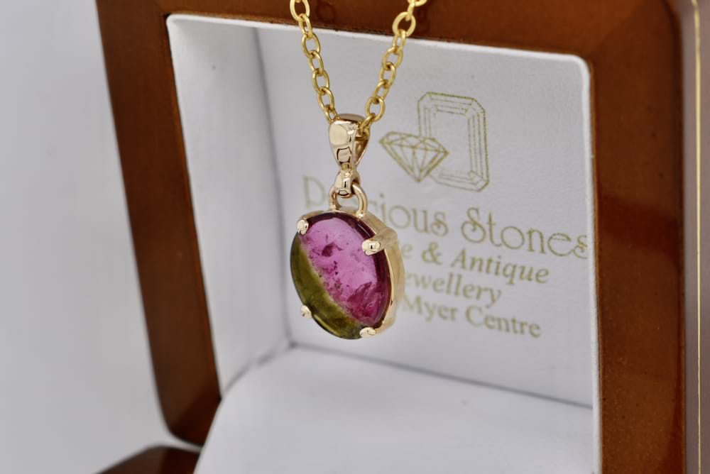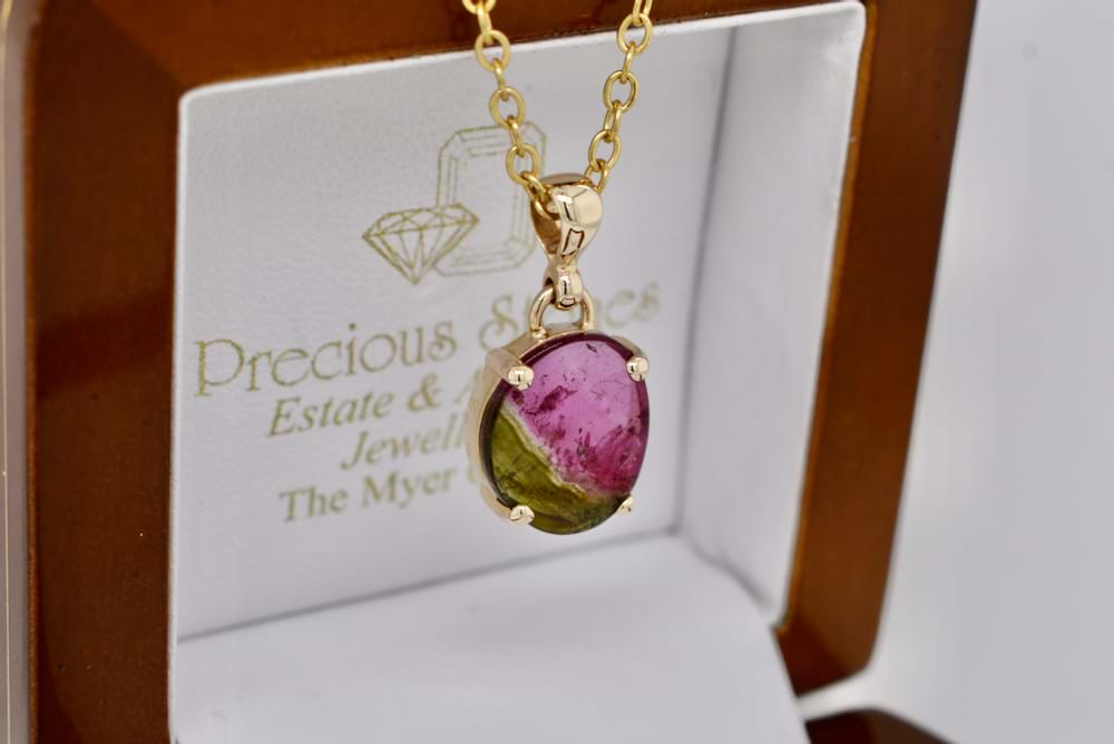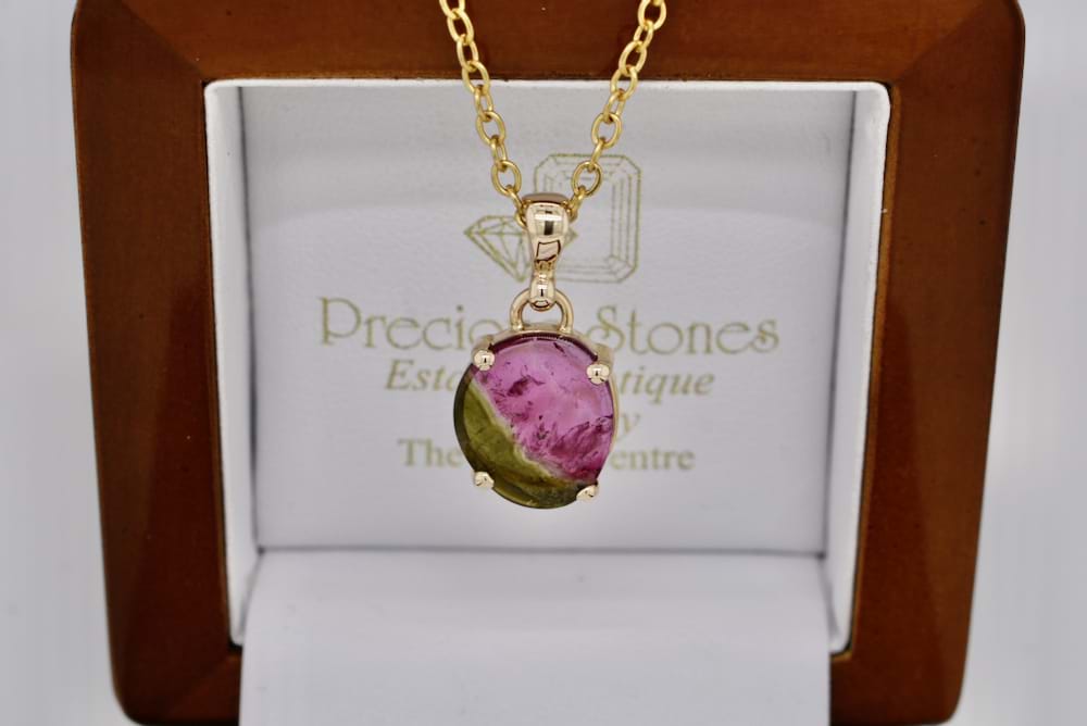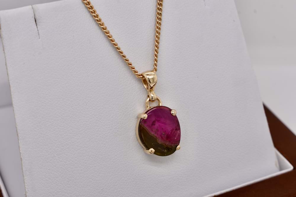 9ct yellow gold handmade claw set pendant featuring a slice of 13x11mm watermelon tourmaline.