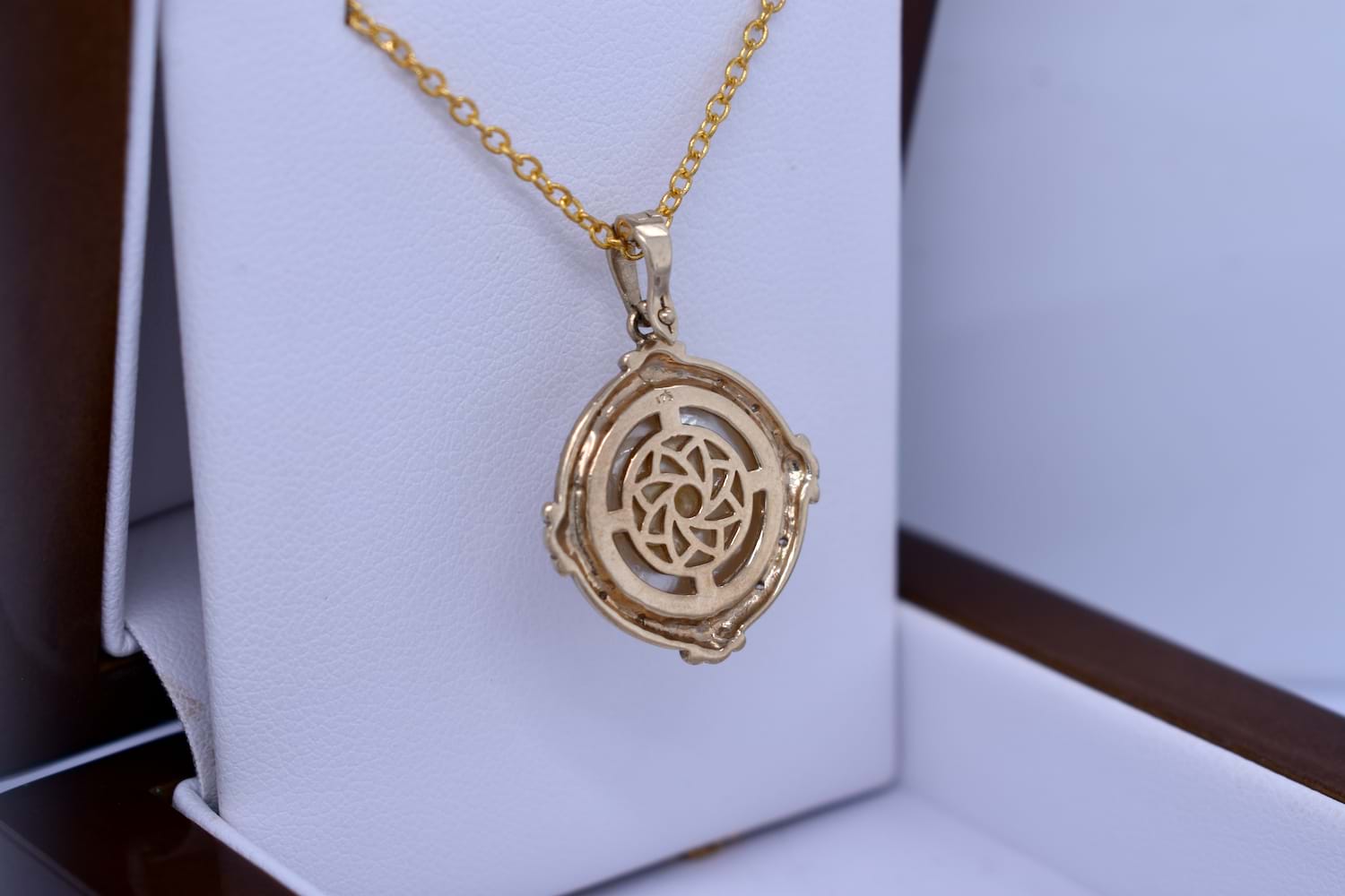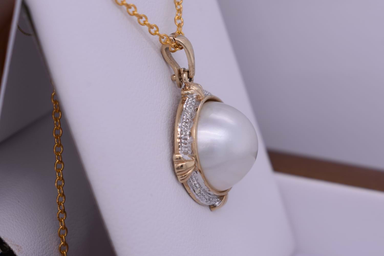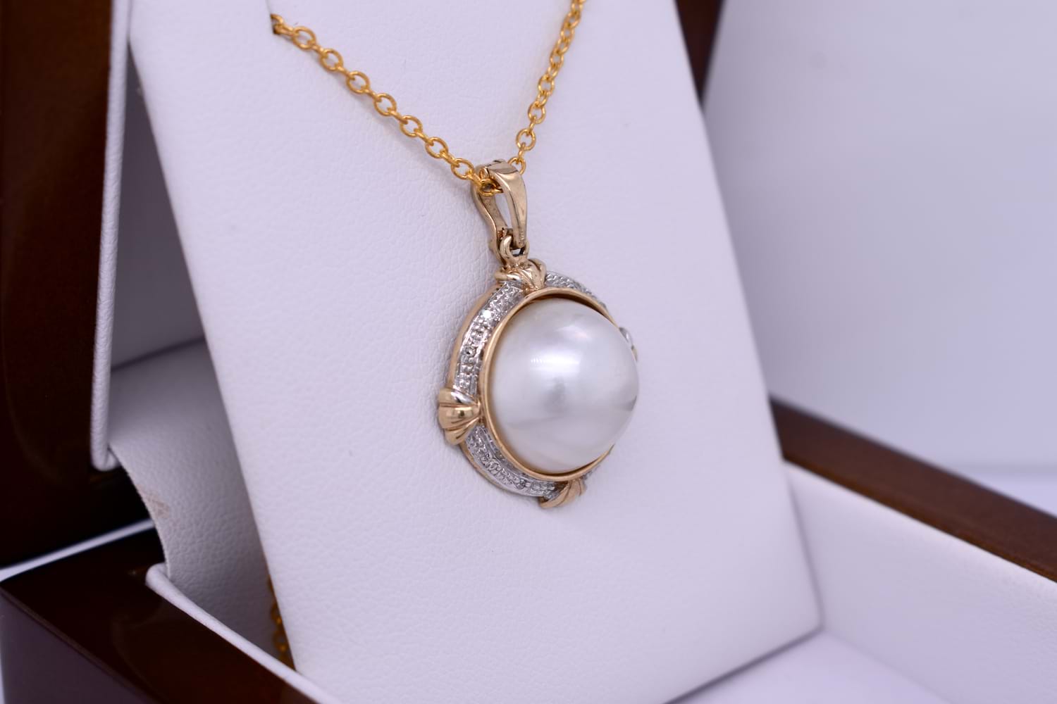 This lovely enhancer pendant is made in 9ct yellow gold and features a 14mm round white mabe pearl with medium lustre and a creamy pinkish hue, bezel set in the centre with a scalloped gold and rhodium plated diamond set border. Finished with a hinged enhancer bale. Total weight 4.14 grams. Total diamond weight 8 single cuts equalling 0.04ct, L-M colour SI clarity. Chains are available for separate purchase. Independent valuation supplied.