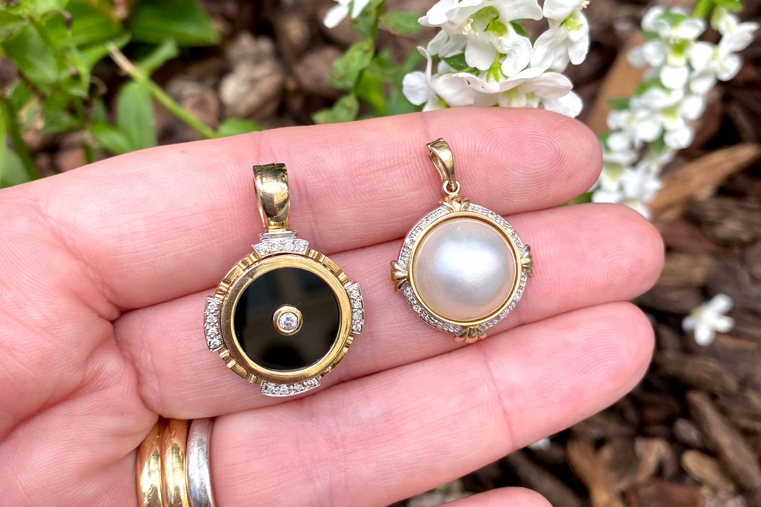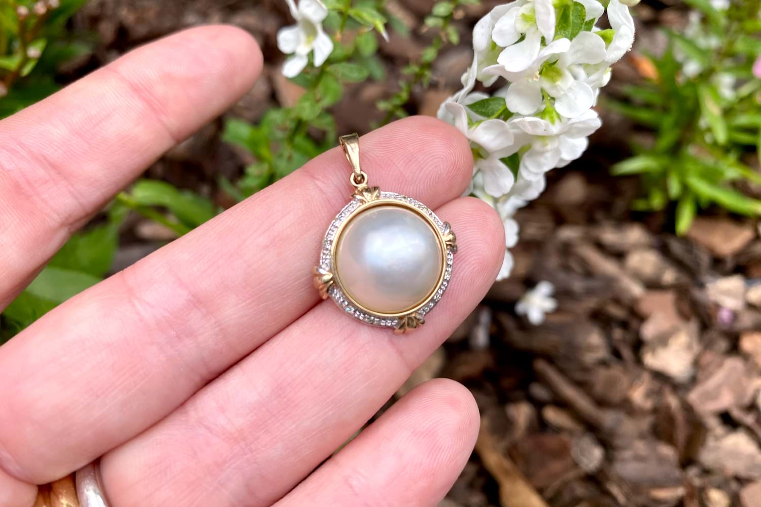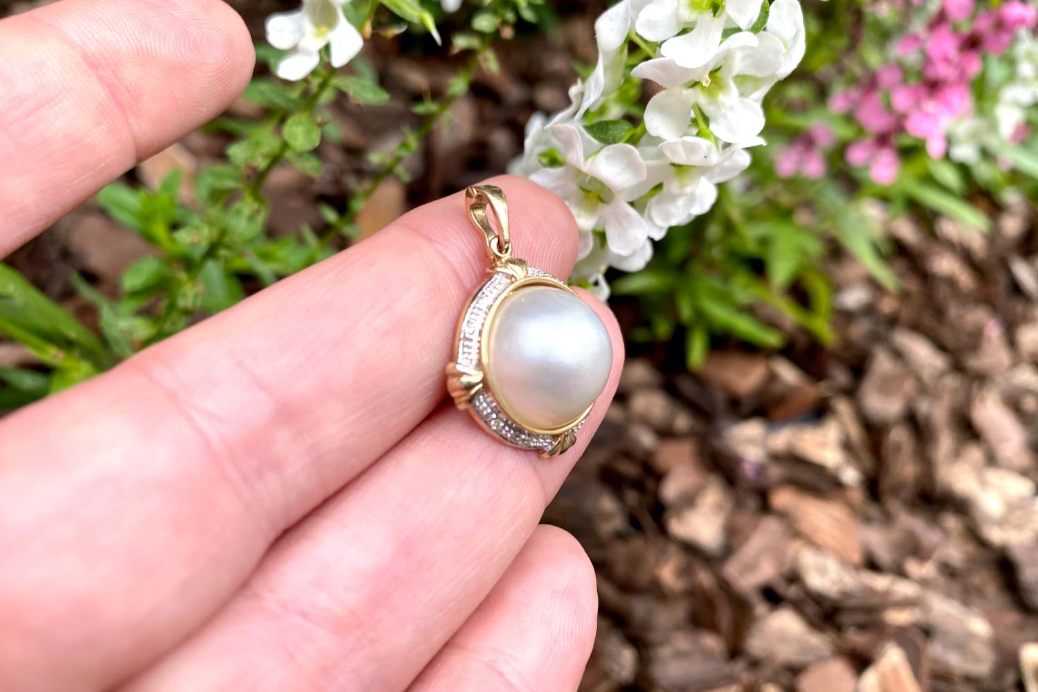 This lovely enhancer pendant is made in 9ct yellow gold and features a 14mm round white mabe pearl with medium lustre and a creamy pinkish hue, bezel set in the centre with a scalloped gold and rhodium plated diamond set border. Finished with a hinged enhancer bale. Total weight 4.14 grams. Total diamond weight 8 single cuts equalling 0.04ct, L-M colour SI clarity. Chains are available for separate purchase. Independent valuation supplied.