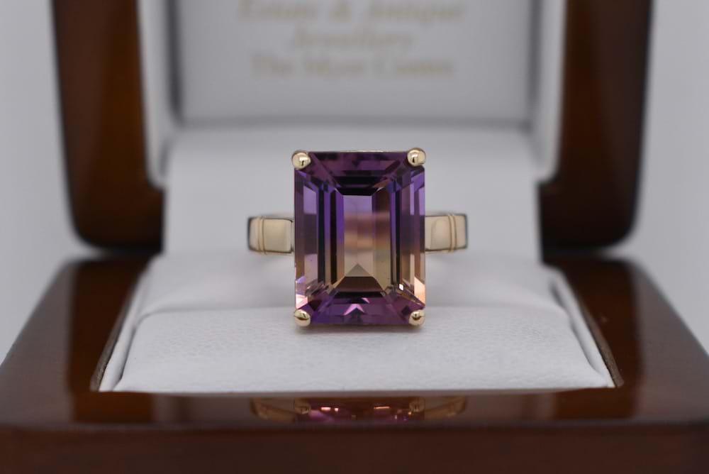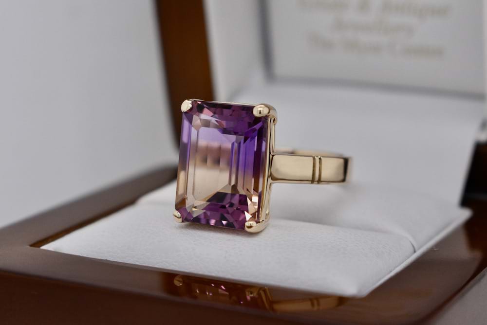 Striking and unusual this emerald cut ametrine measures an impressive 14x11mm and has been set into a handmade four claw 9ct yellow gold setting with plain band. Finger size Q+