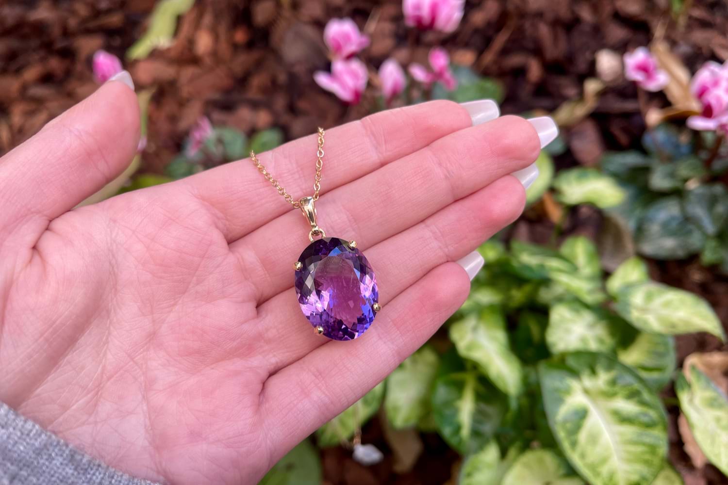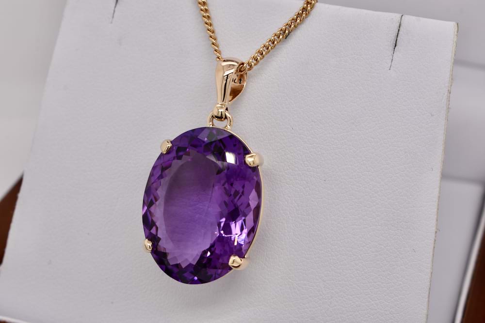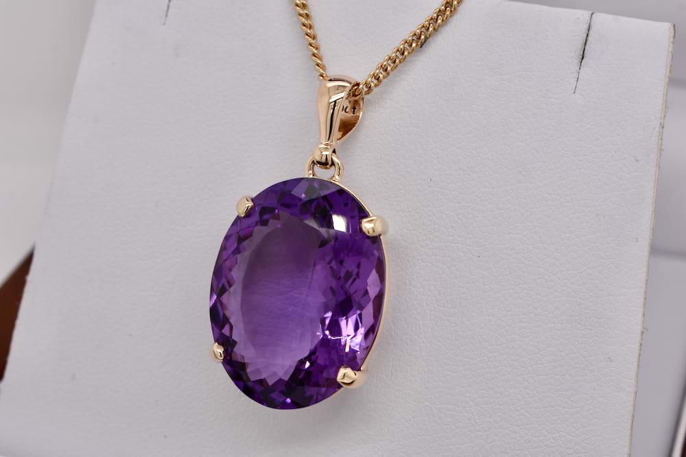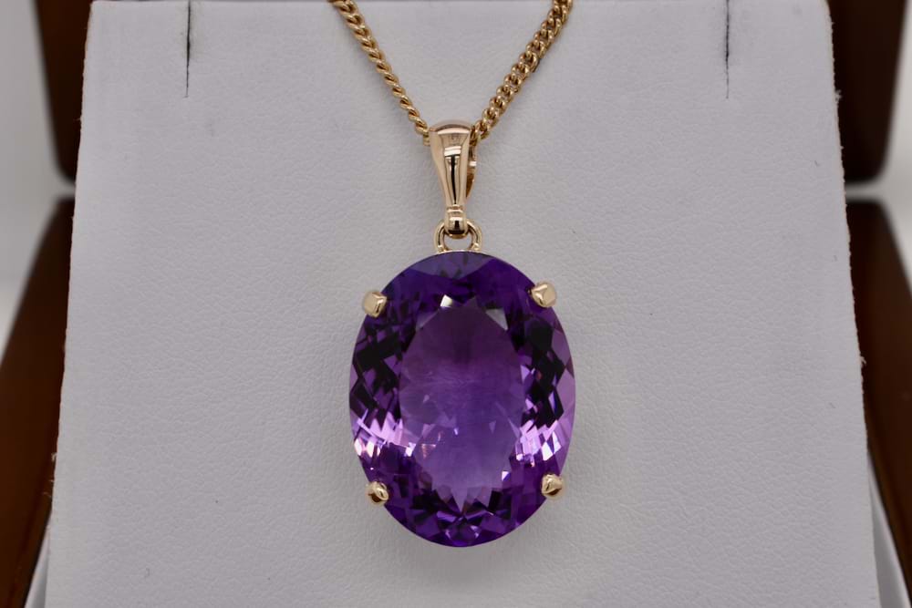 Spectacular oval faceted amethyst measuring an impressive 23x18mm set into a handmade 9ct yellow gold four claw setting with a plain bale. Chains are available for separate purchase