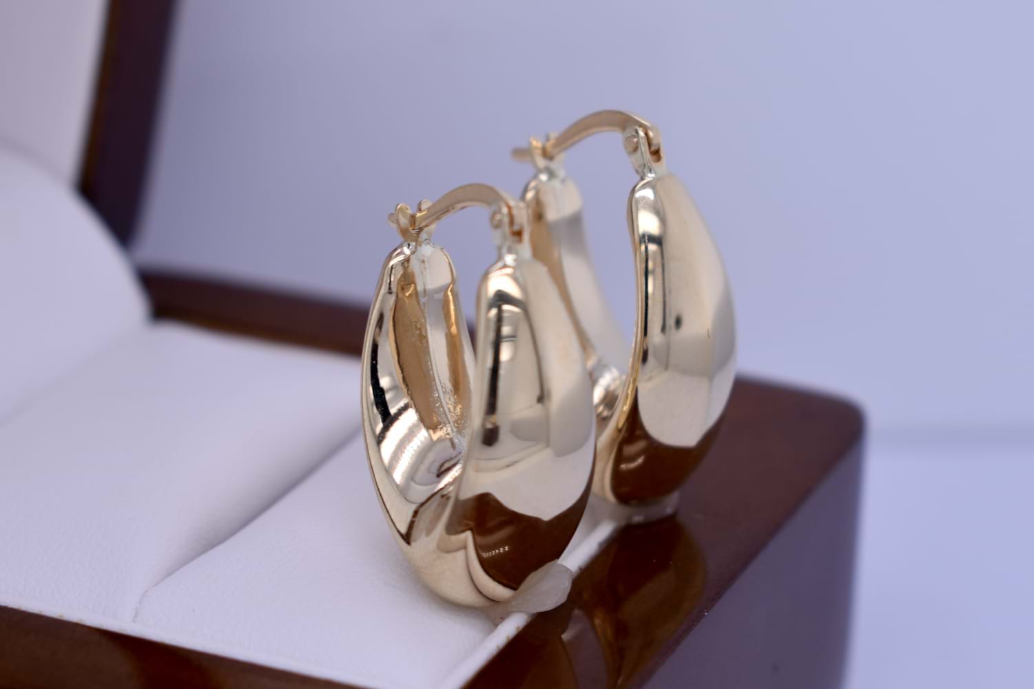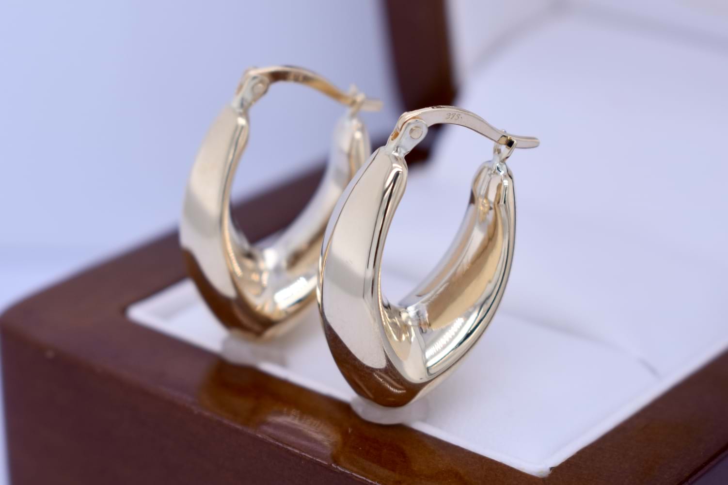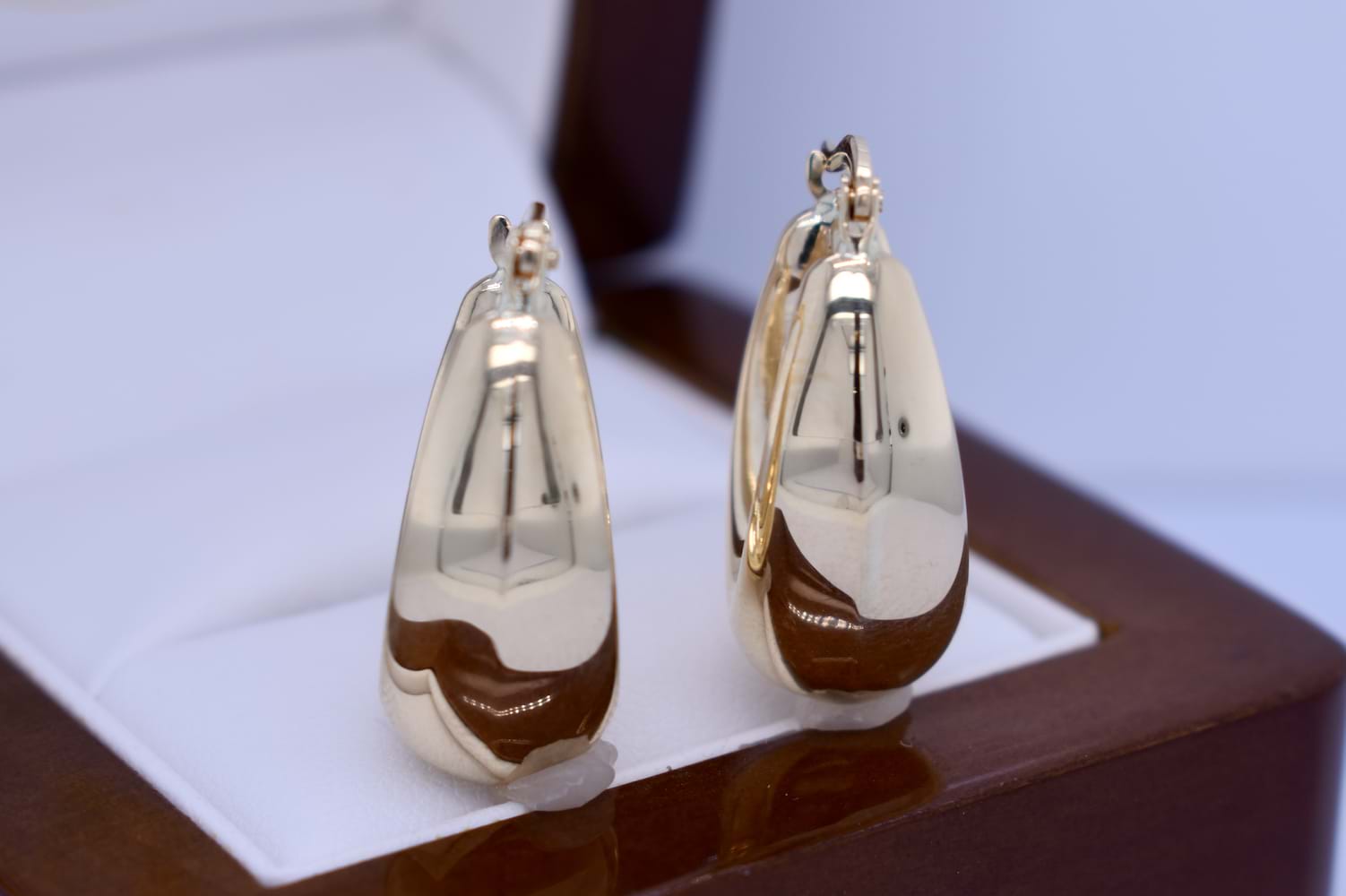 These hollow V-shaped puff hoops are made in 9ct yellow gold and measure 24x15mm and 10mm wide. Completed with clipped post fittings. Weighs 2.4 grams.