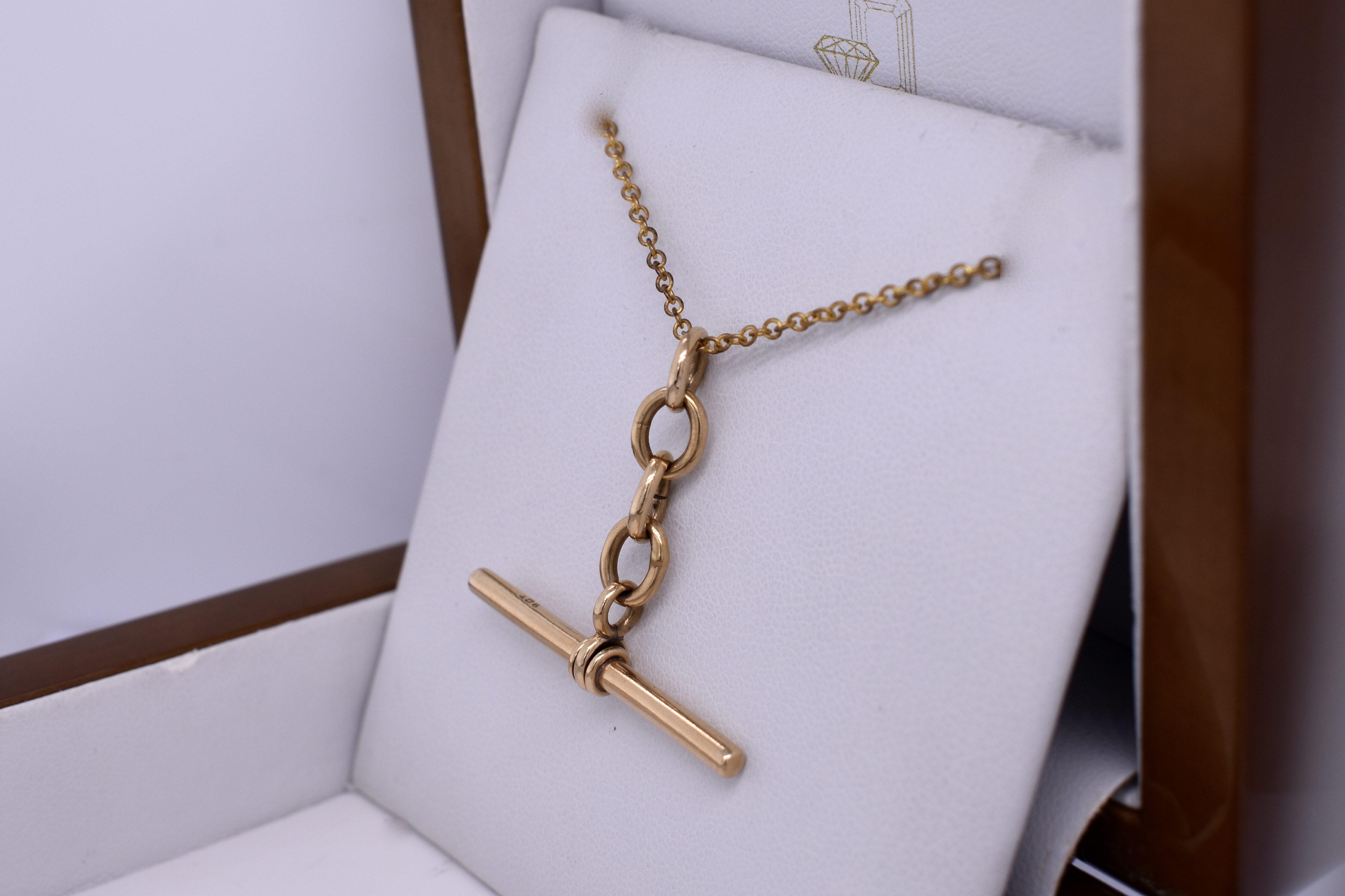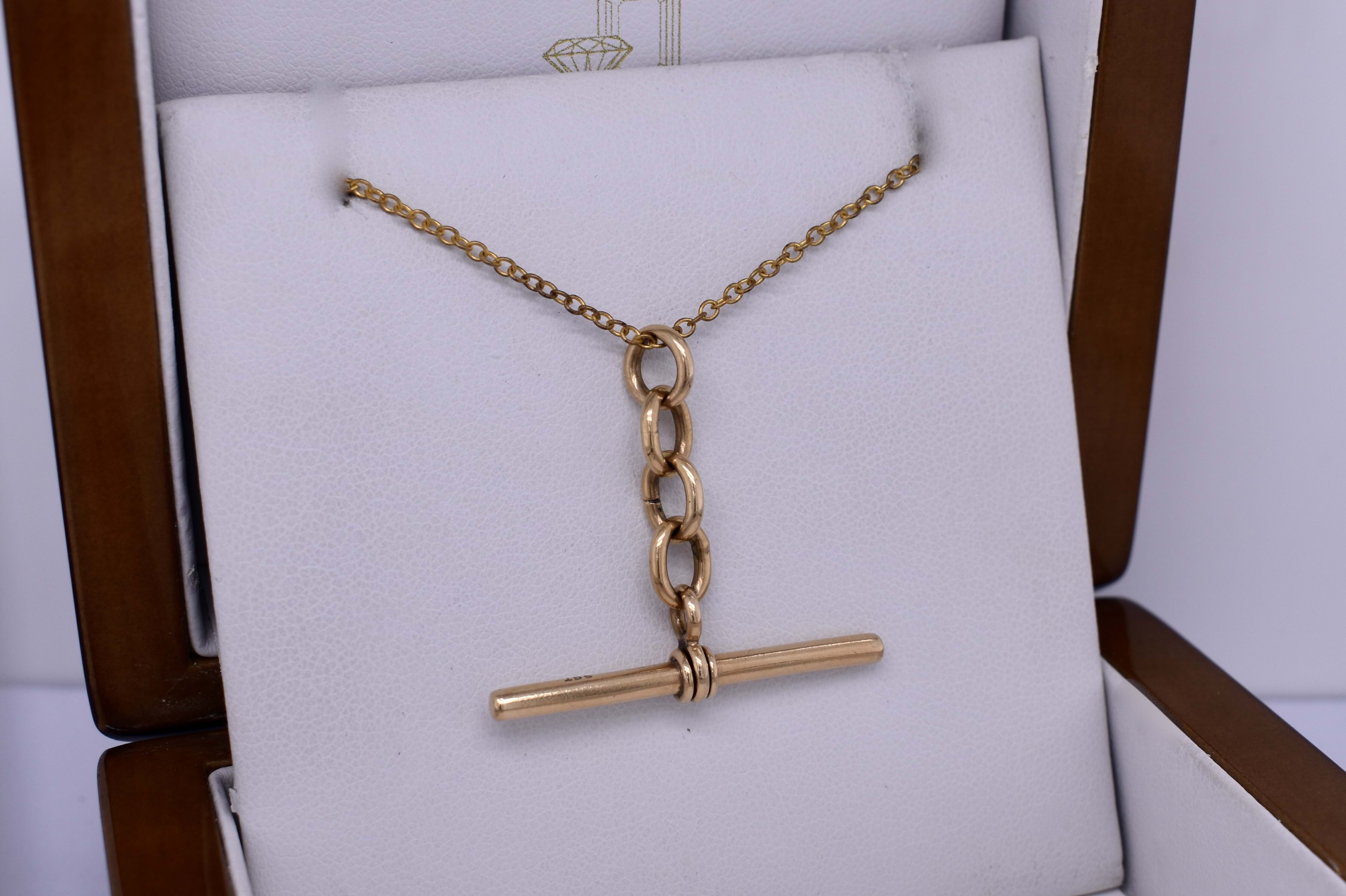 This timeless T-Bar measures 35mm long and hangs from three oval and one round link. Total weight 3.38grams.