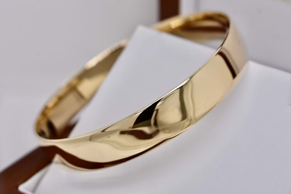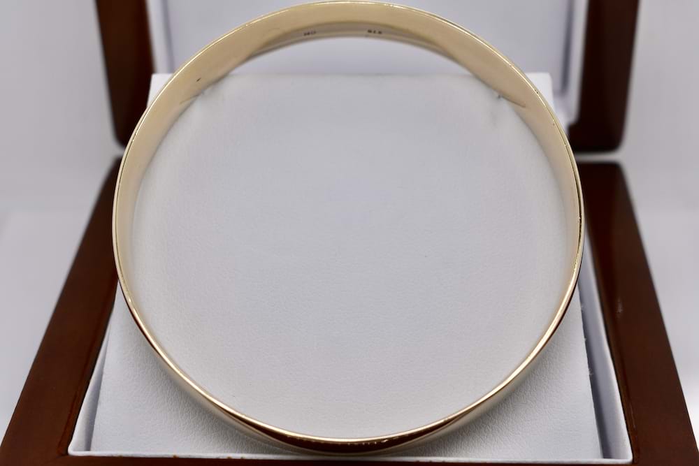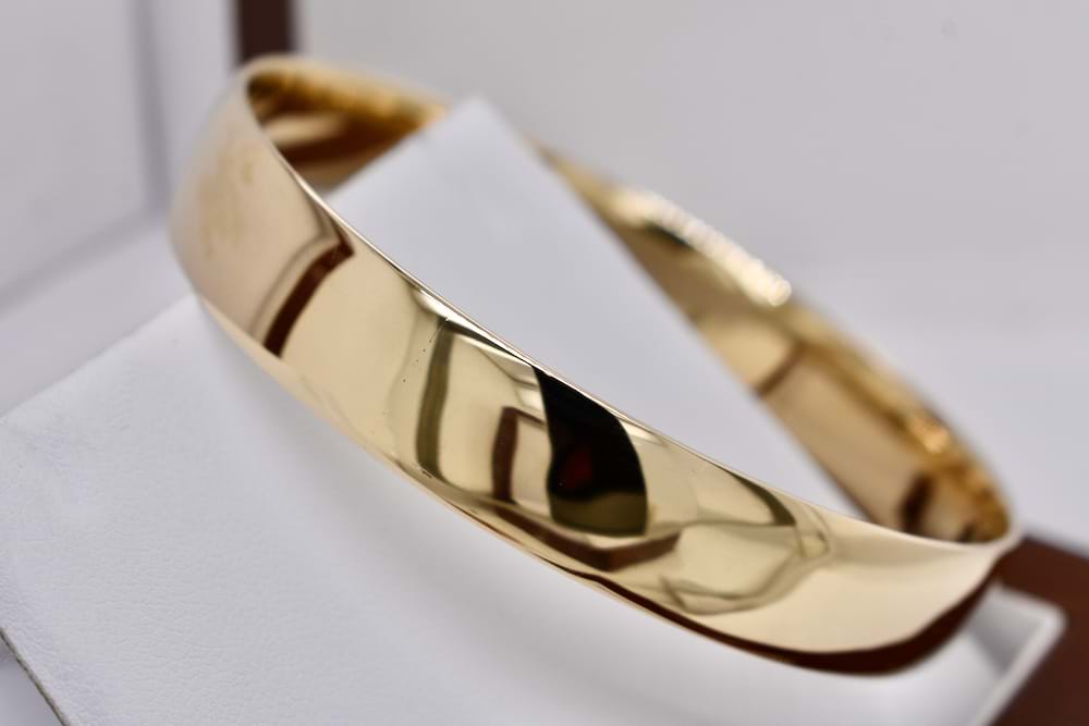 This solid 9ct yellow gold bangle has a flat half round profile and measures 62mm round internal fit x 11mm wide with a weight of 38.9 grams